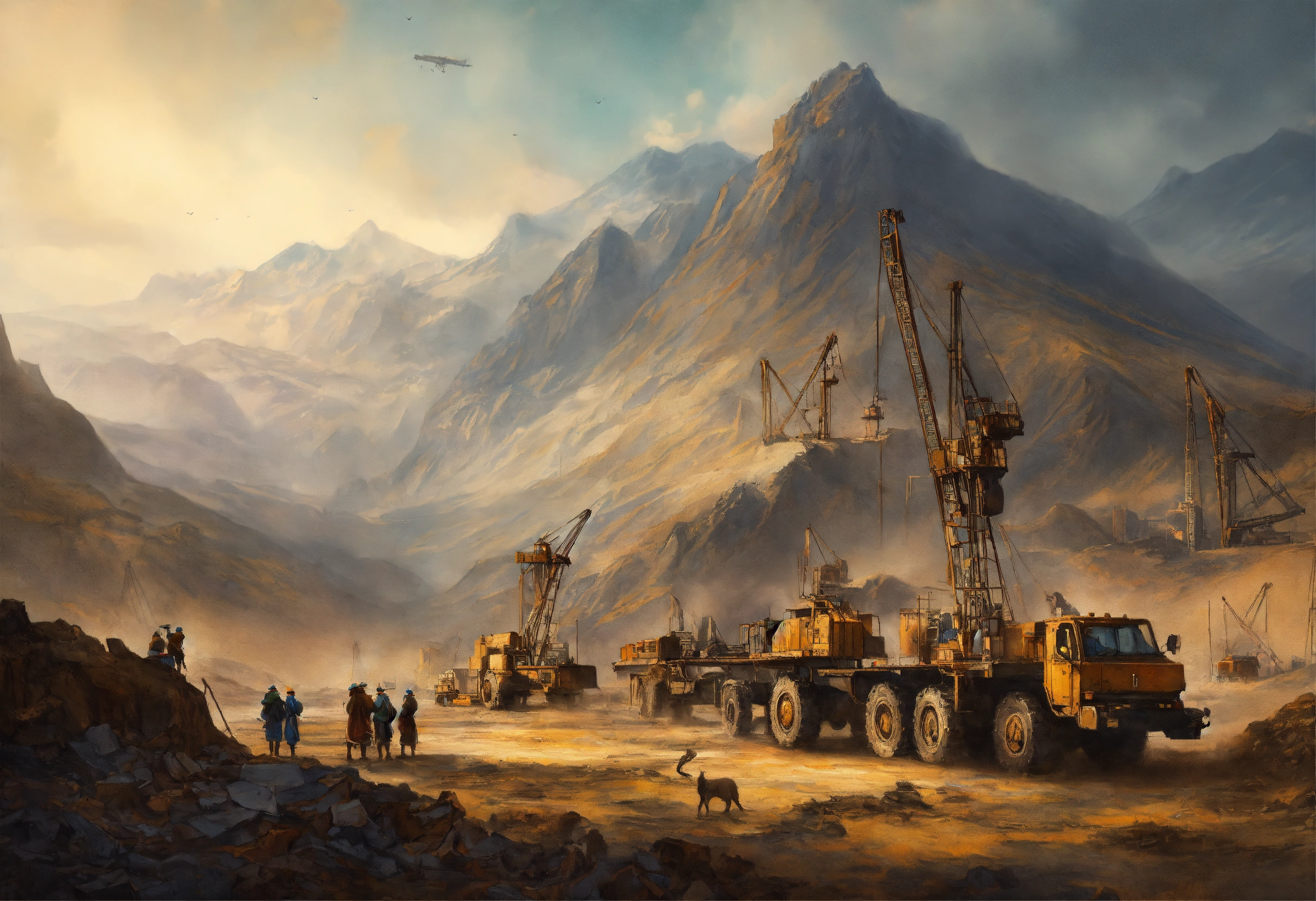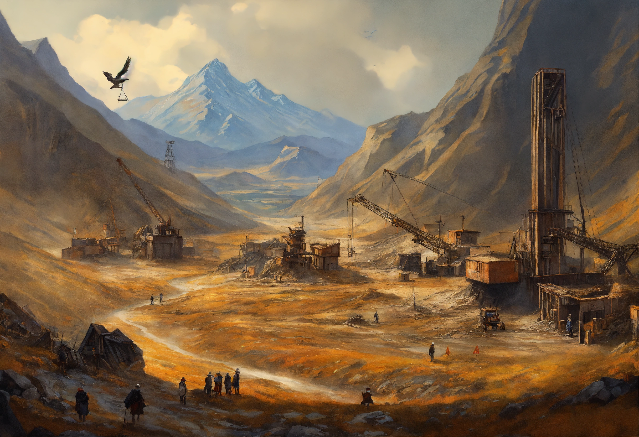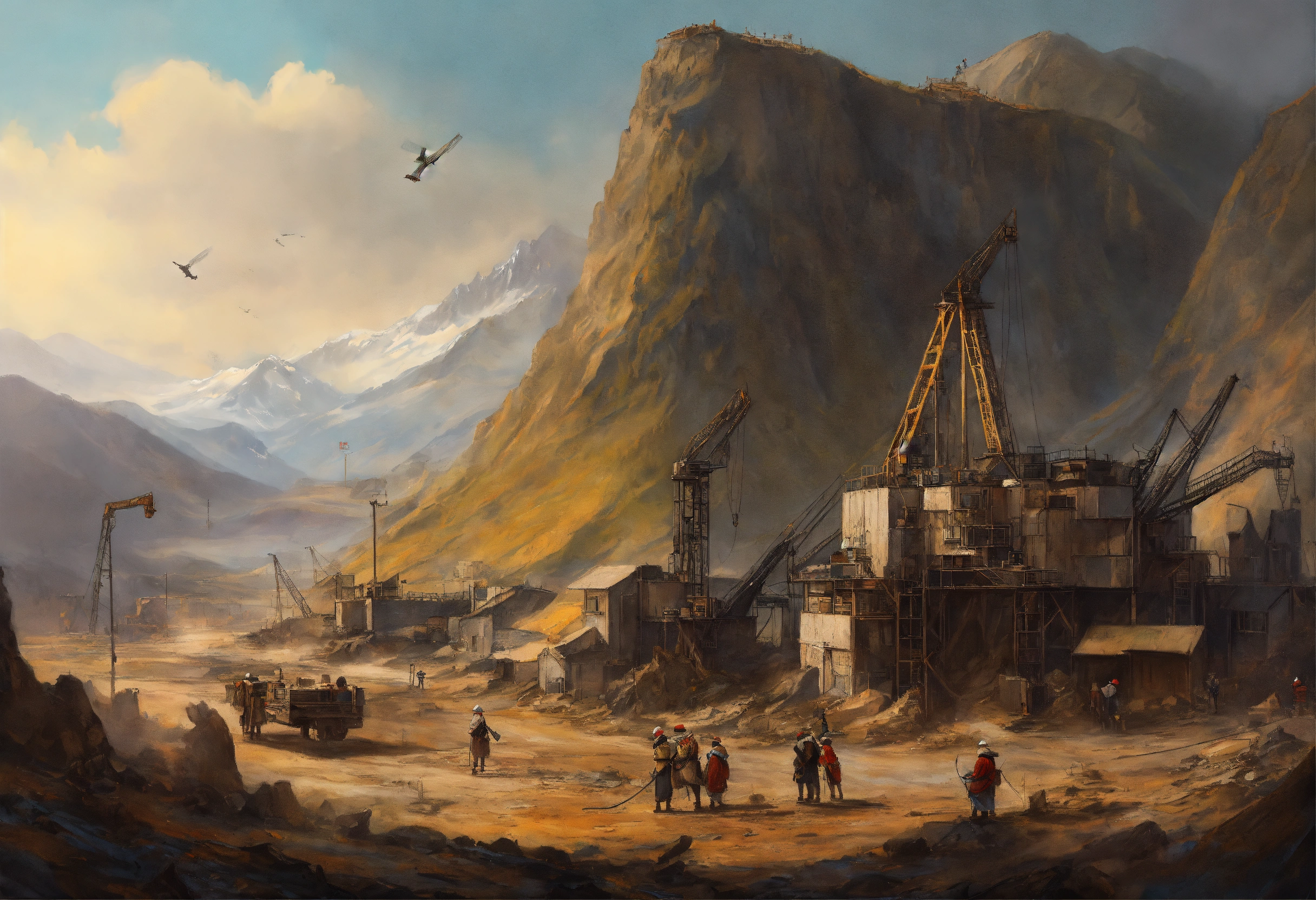 Dirty fantasy painting, incredible deep mine in a wasteland, a mountain in the background, medieval cranes, working people in cloth