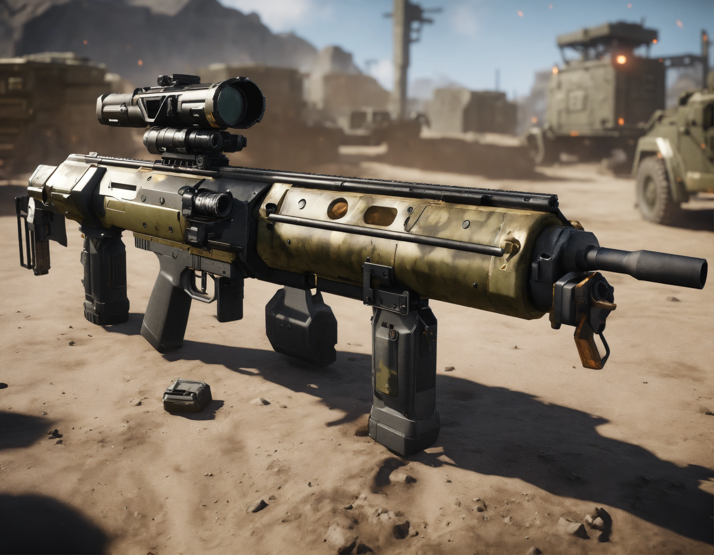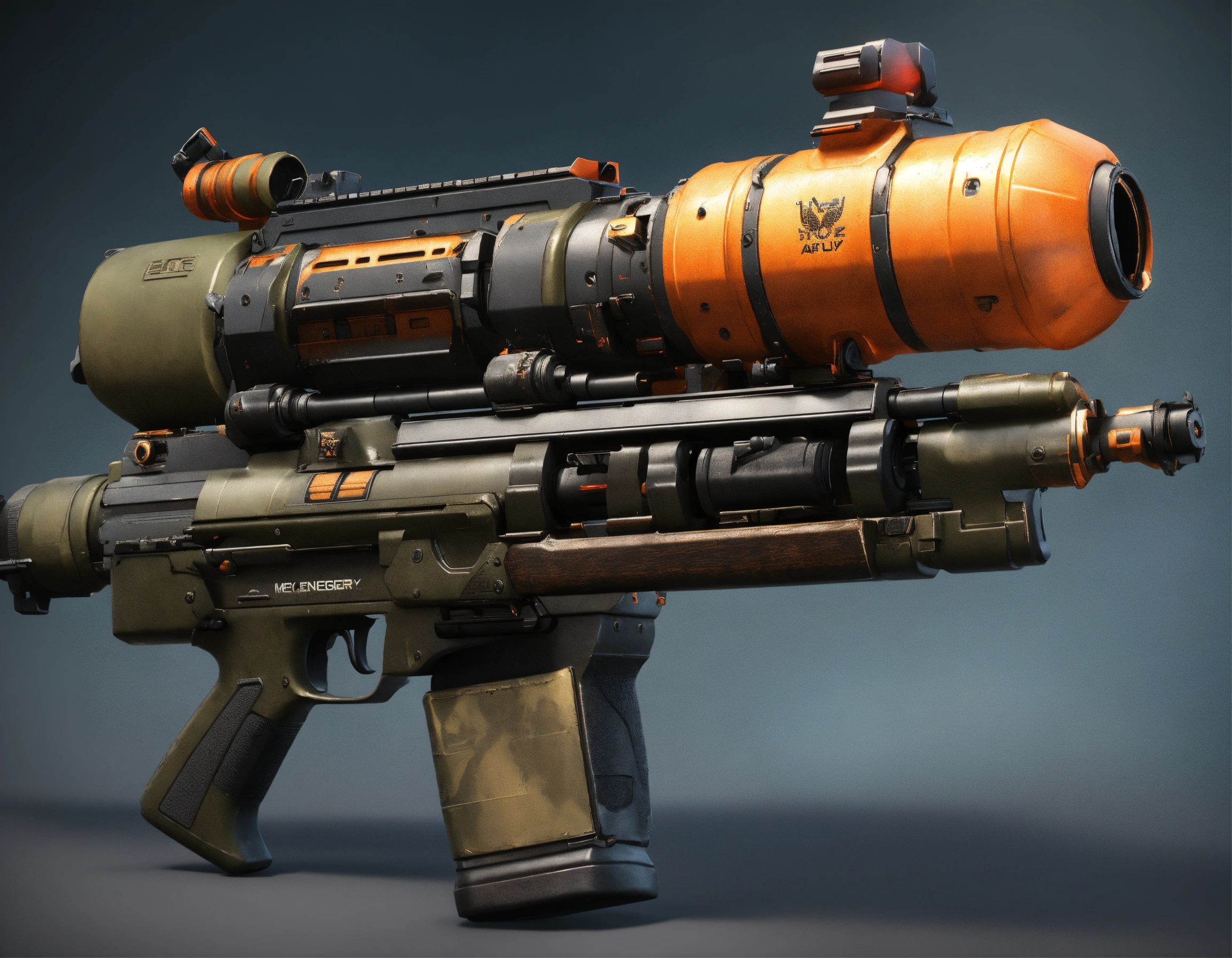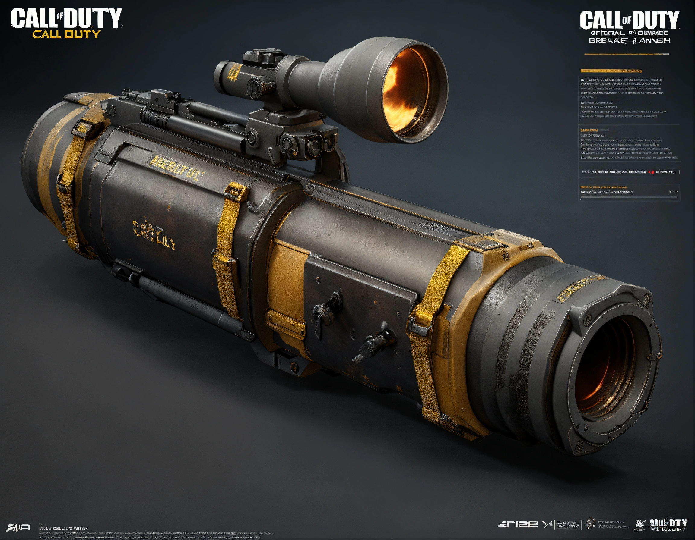 Call of duty mythical grenade launcher, realistic and hyper-detailed approach, with color layout, unreal engine, 200k
