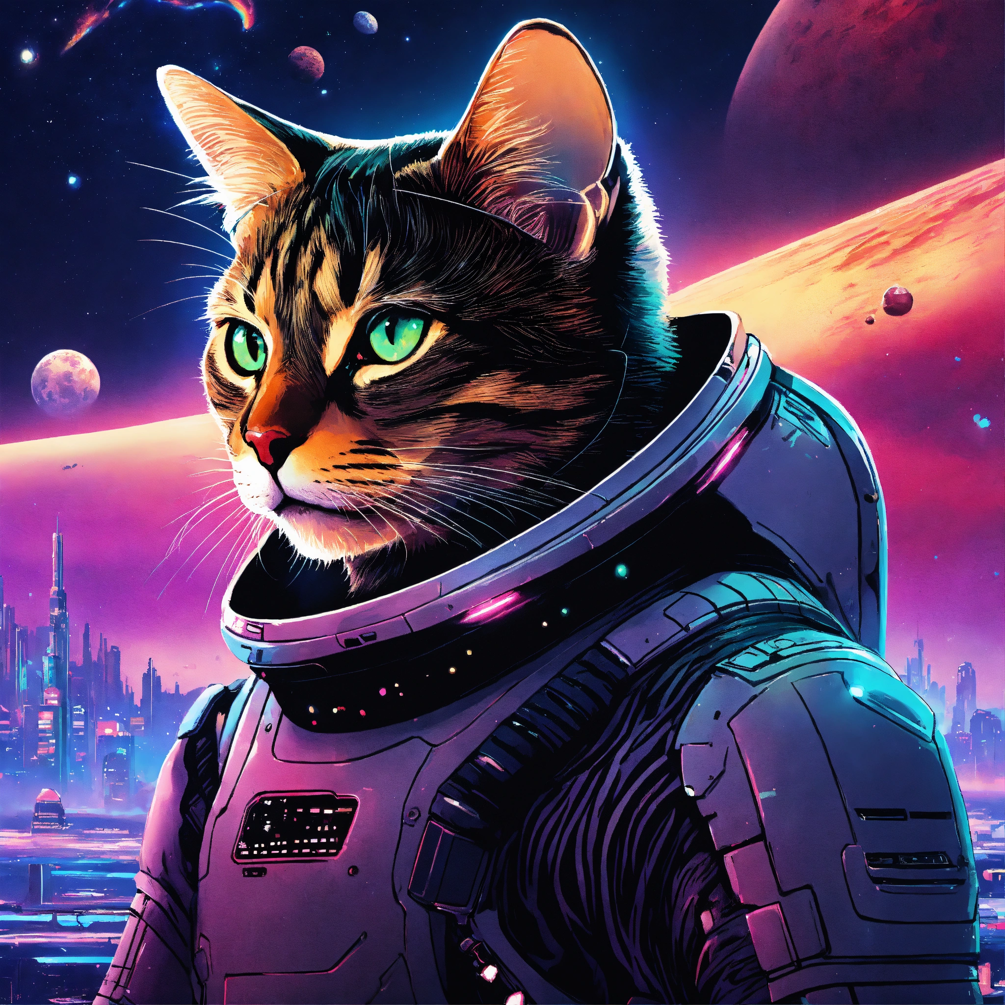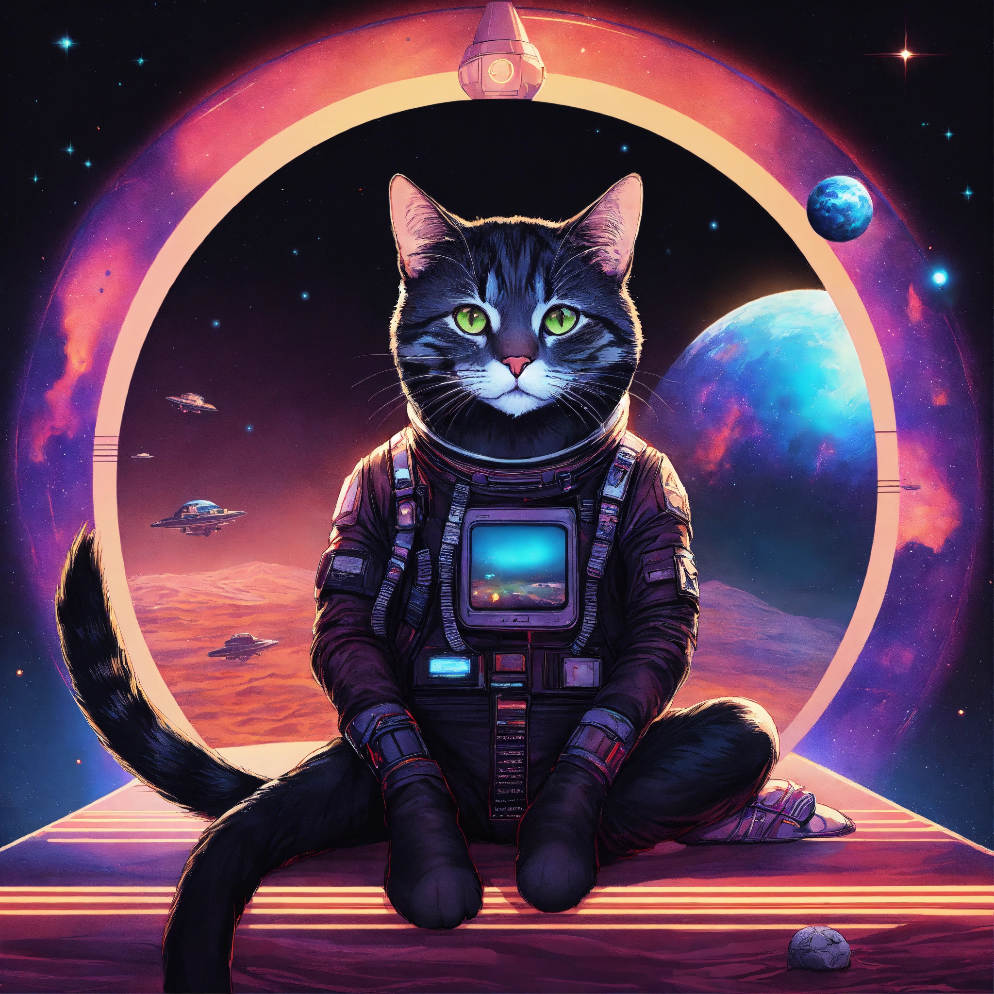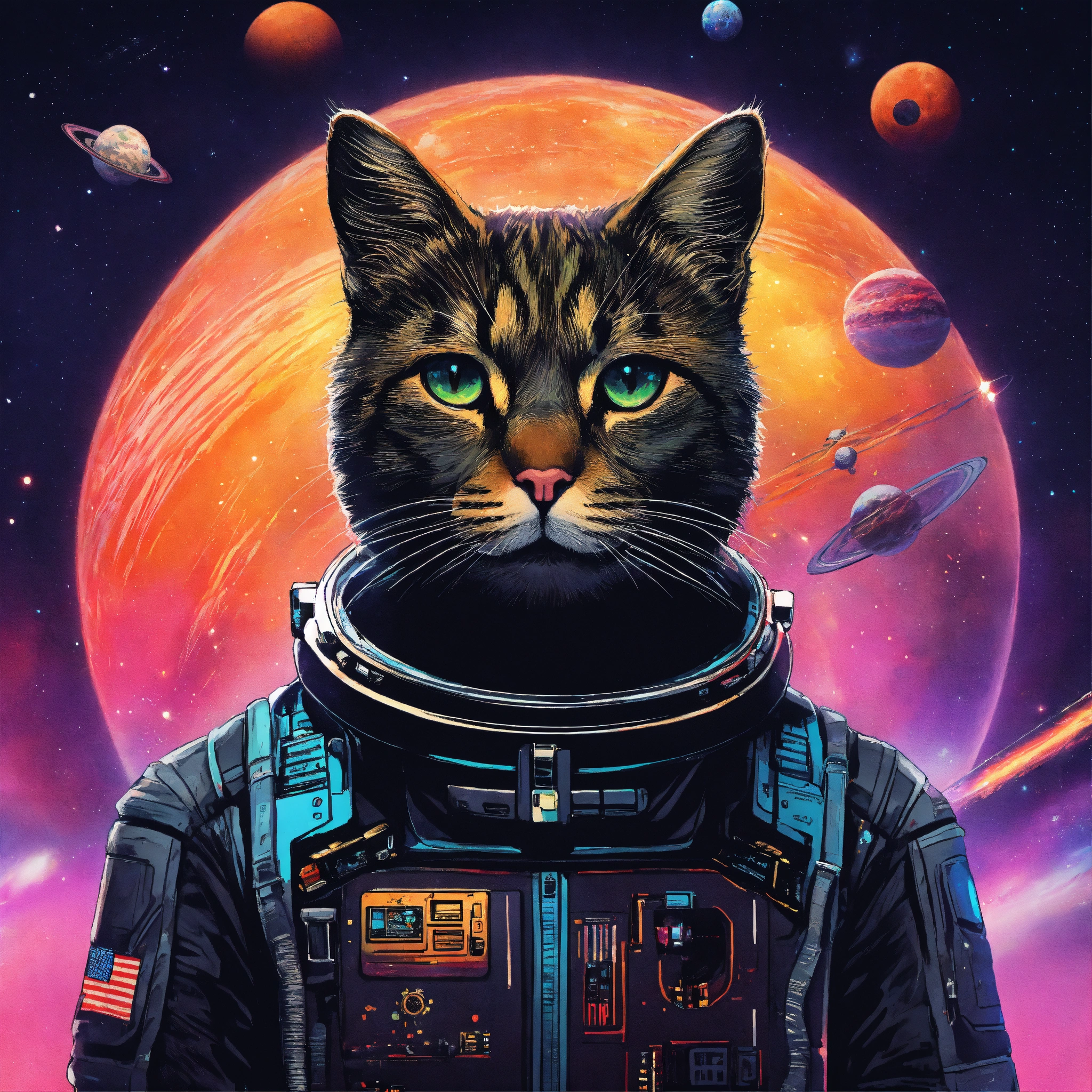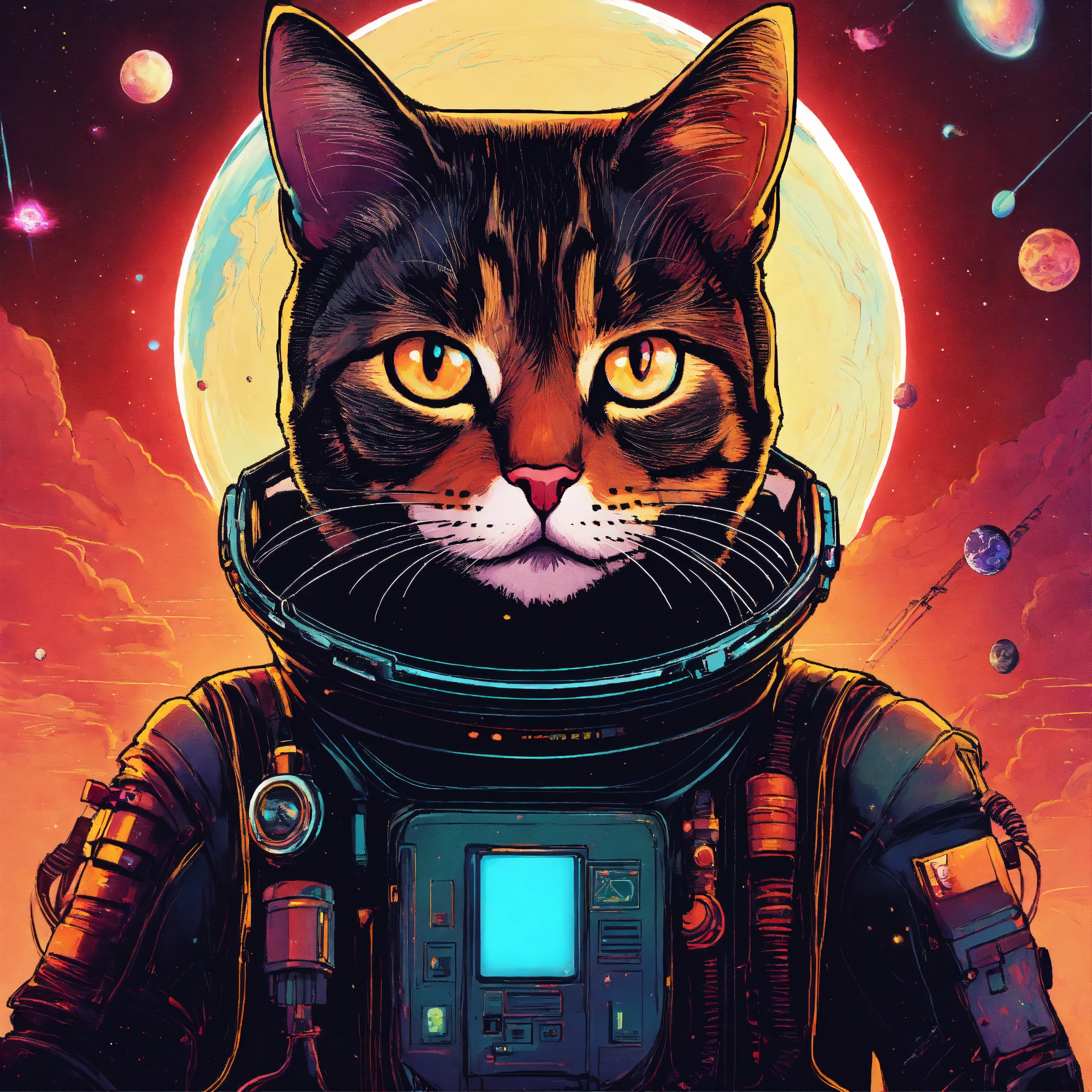 Ilustração de um gato, elon musk, frente de uma galaxia, planeta dos gatos, style cyberpunk, background space, color black