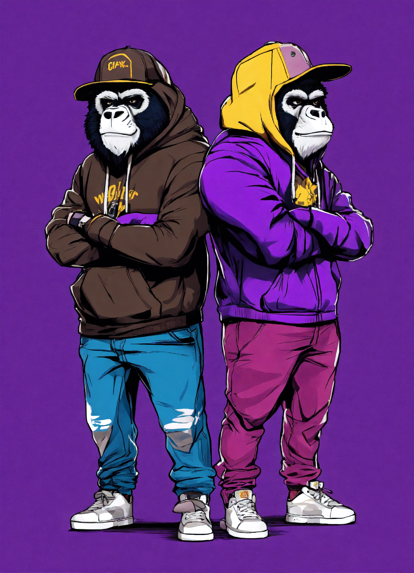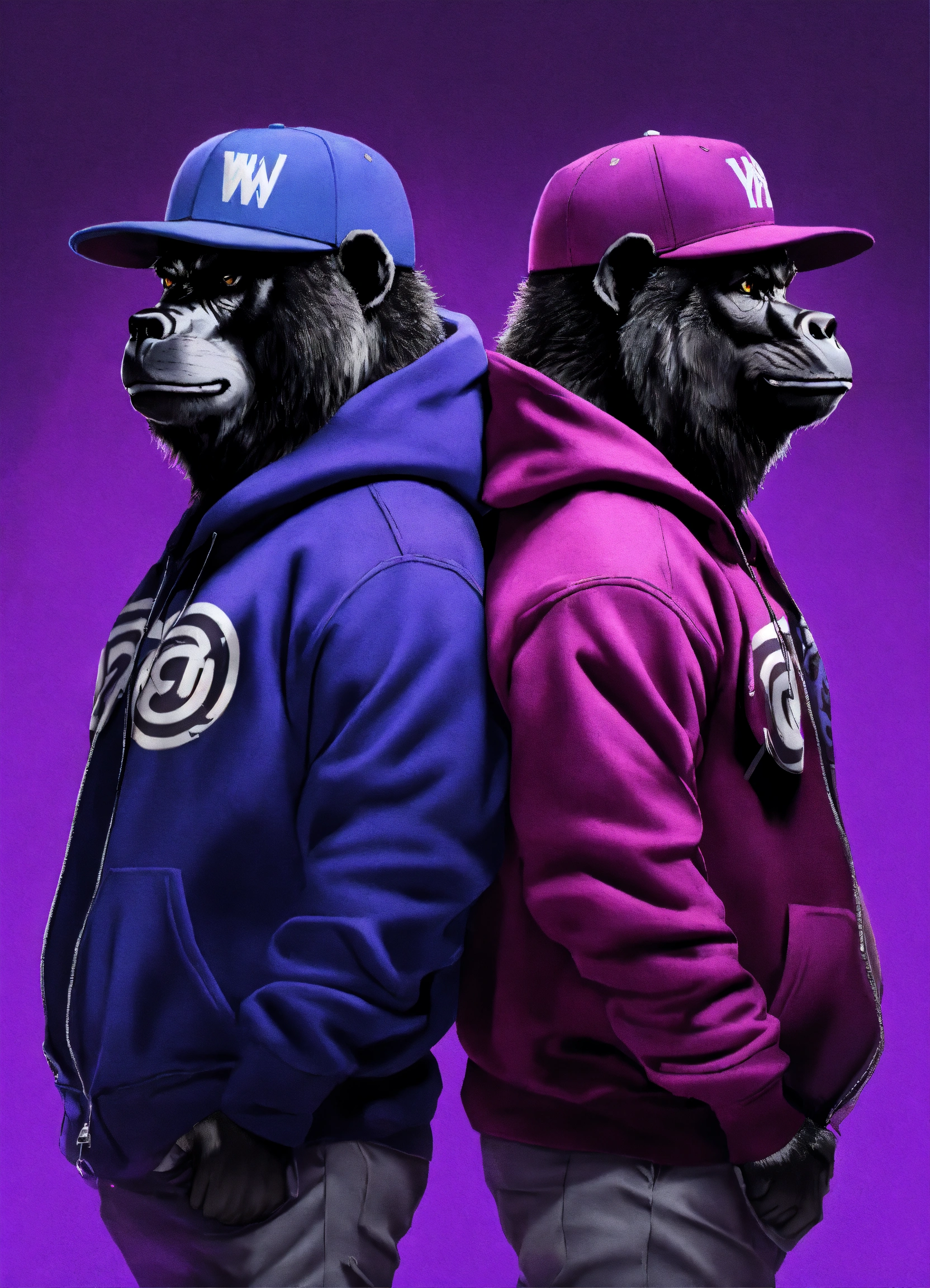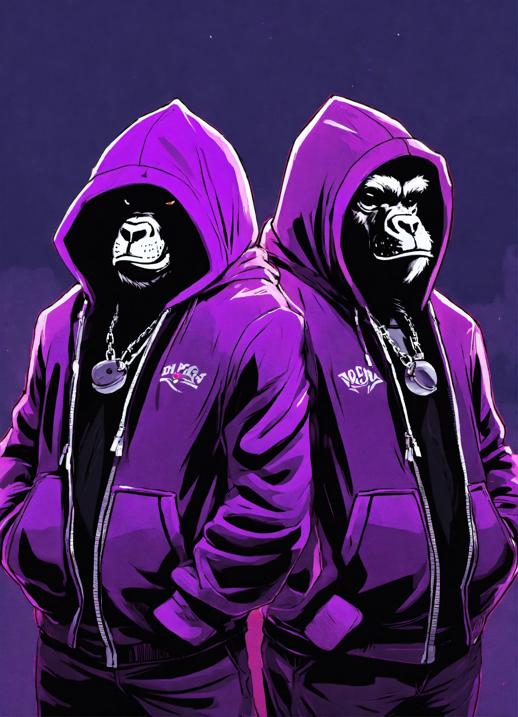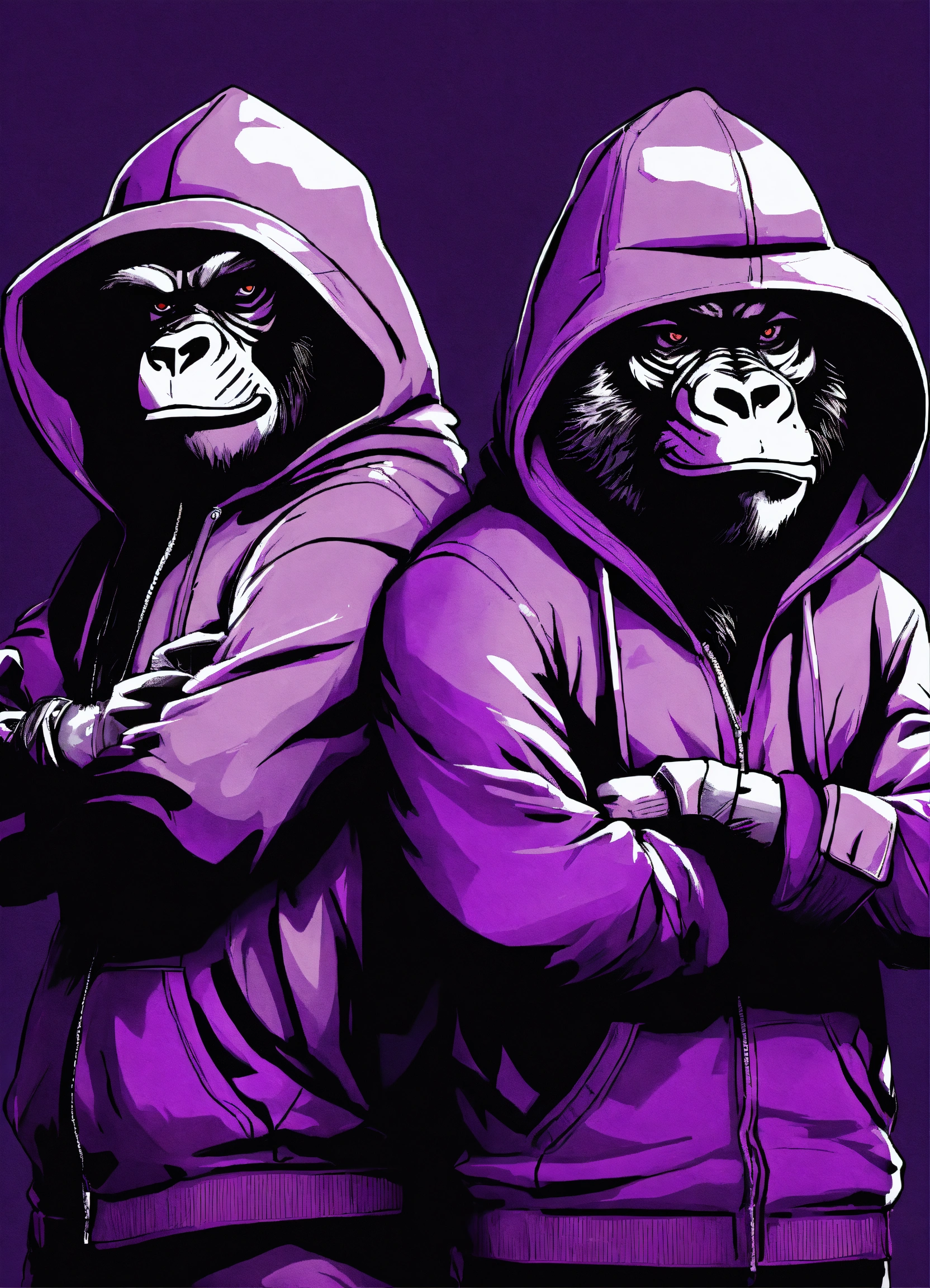 Gangster wolf and gangster gorilla wearing hoodies and baseball cap purple standing back to back
