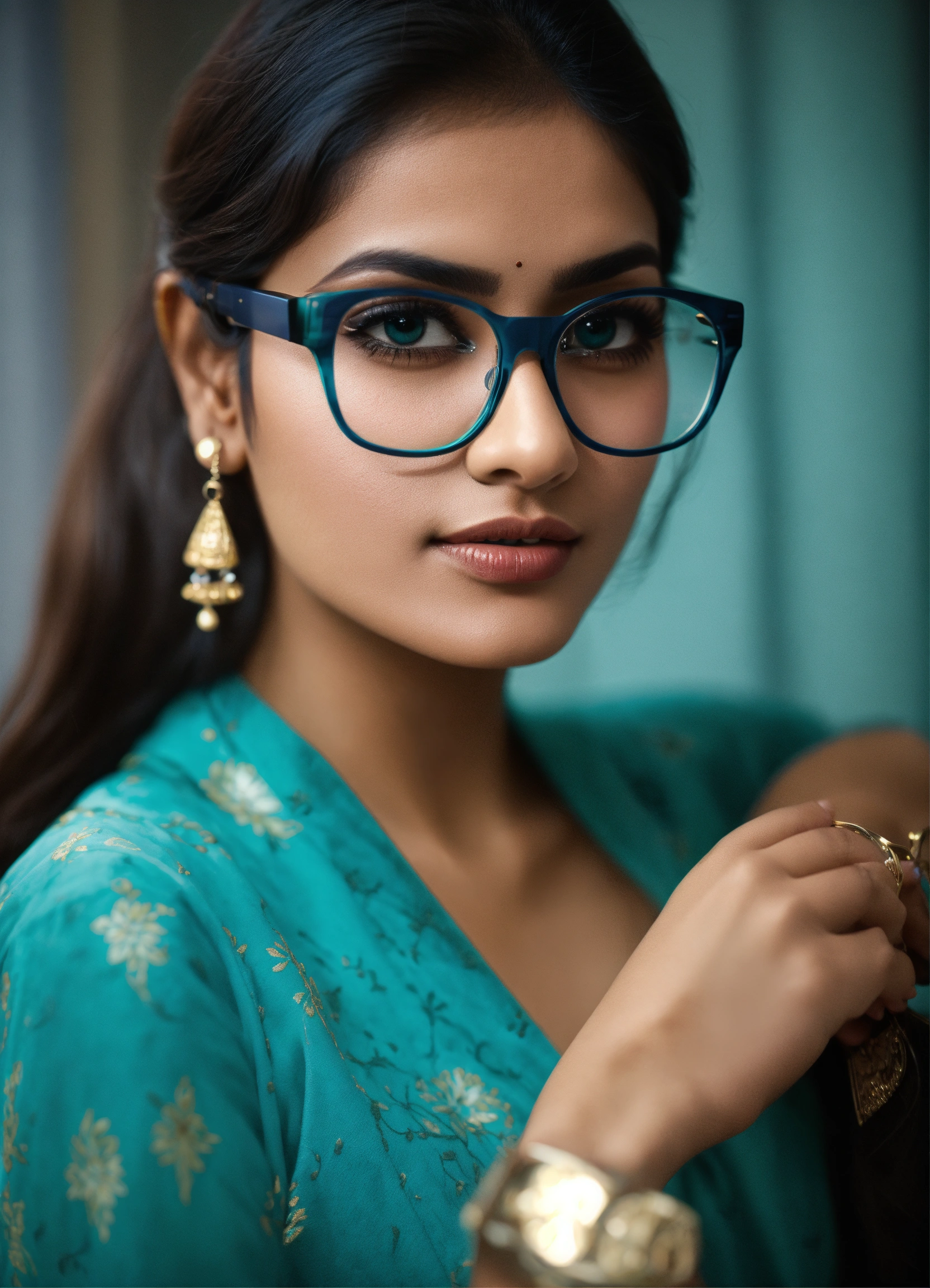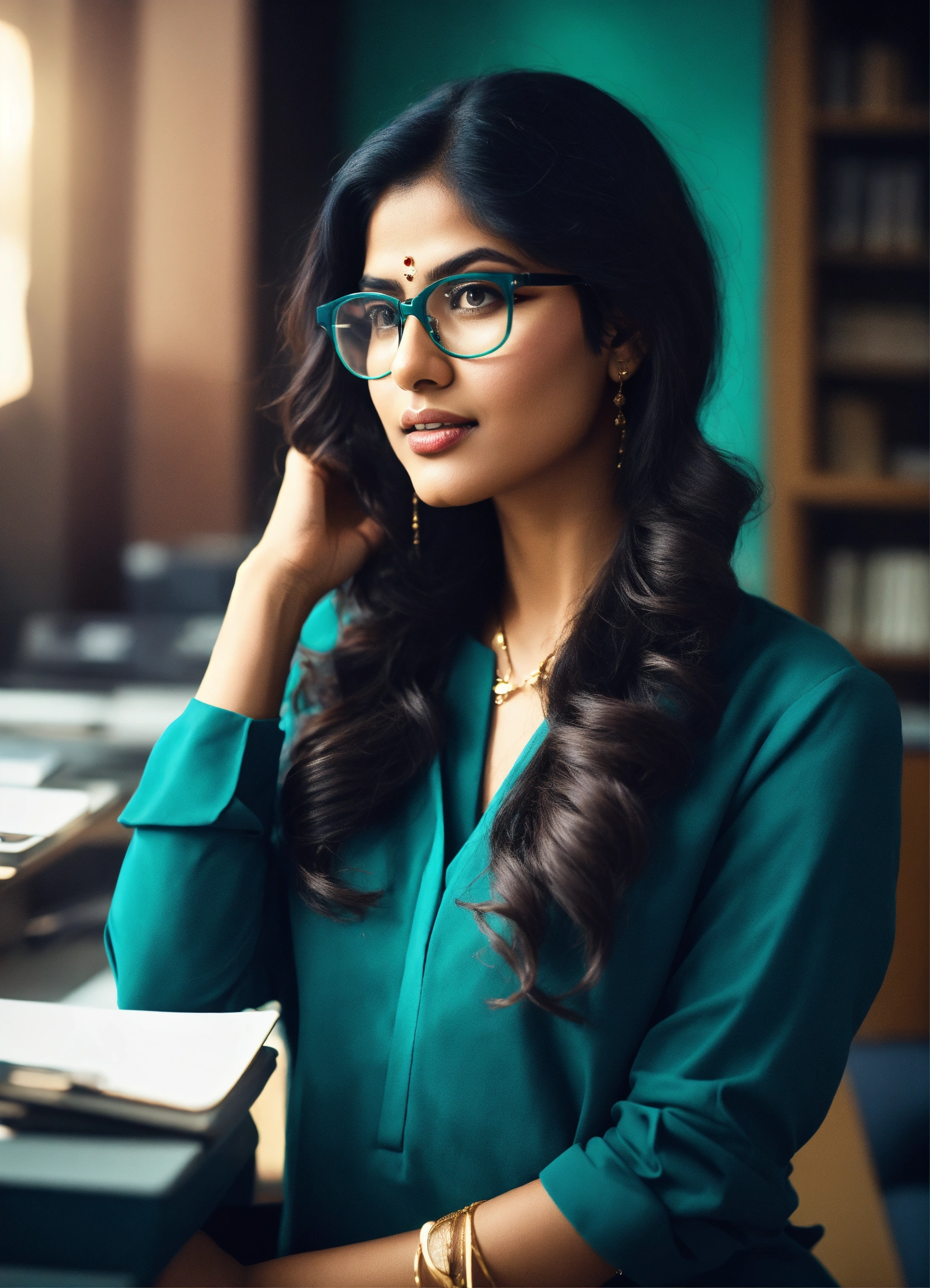 Beautiful indian women, fashion portrait modeling designer eyeglasses in an office environment with natural lighting in teal and navy blue colours.