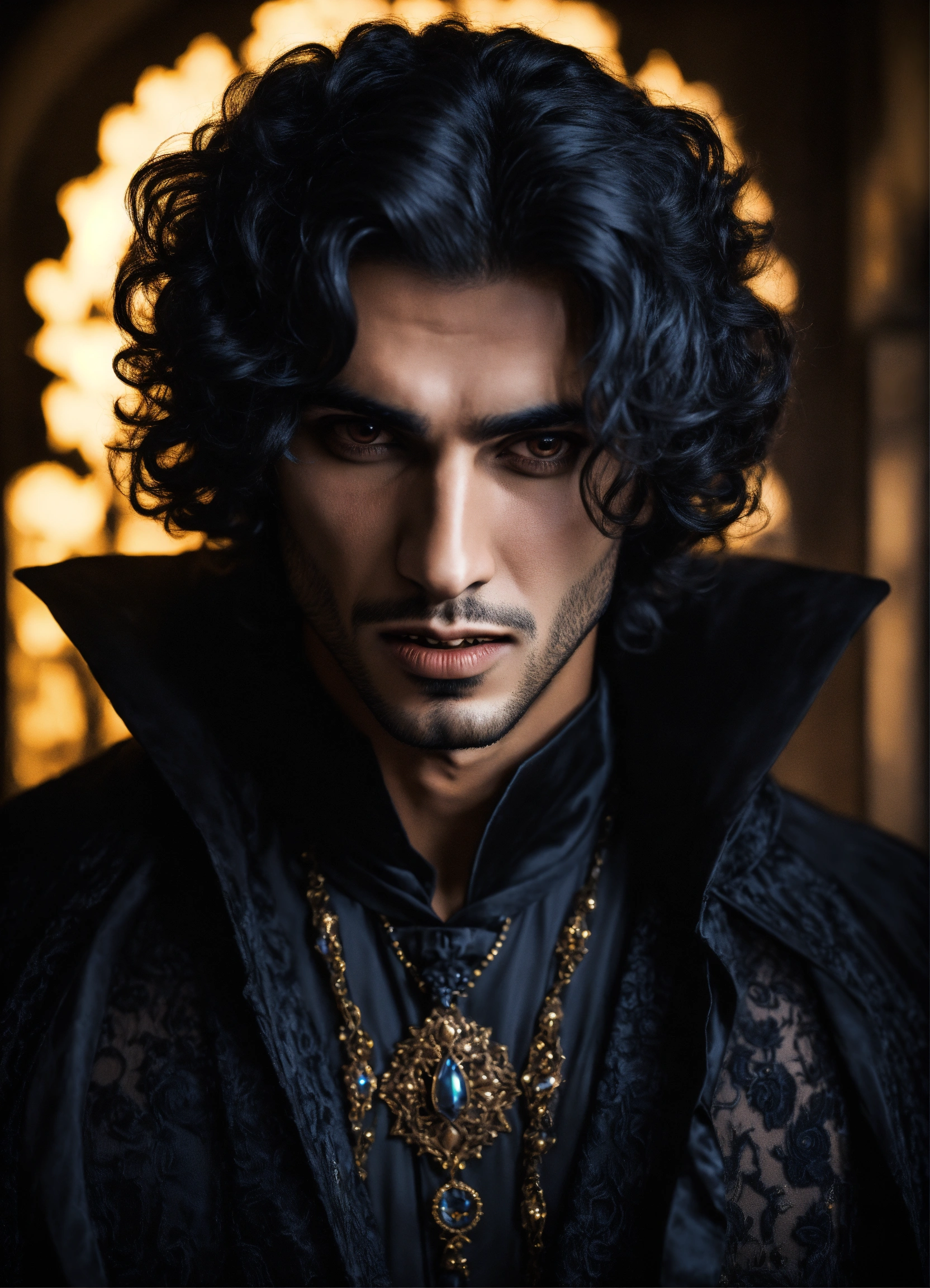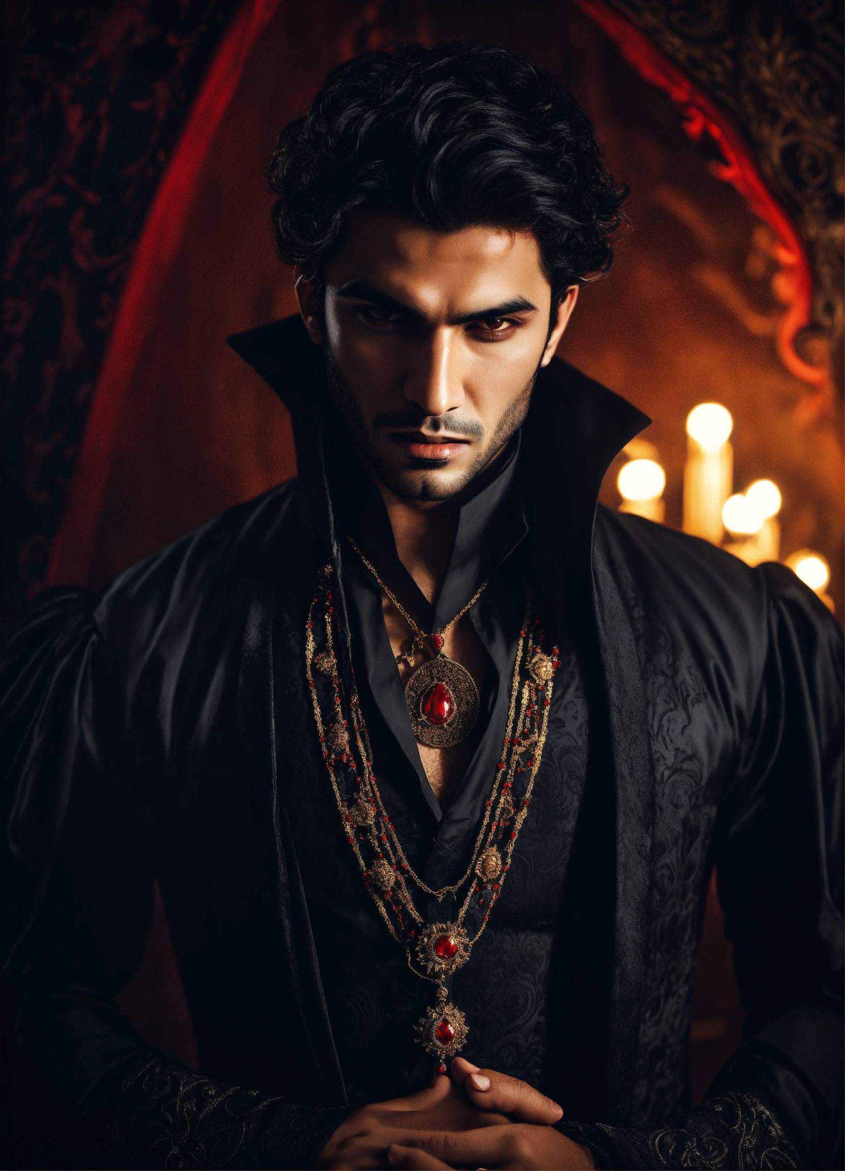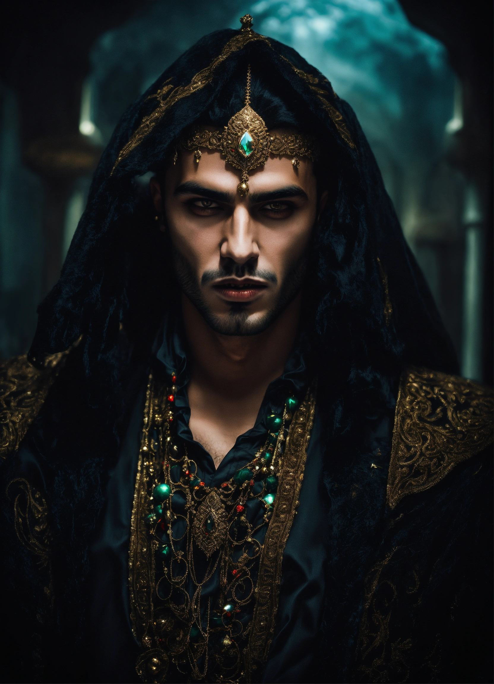 Young handsome malevolent arabic male vampire, dark, lavish clothes, fantasy, mystical, portrait, hypnotising
