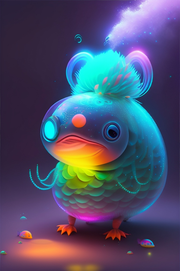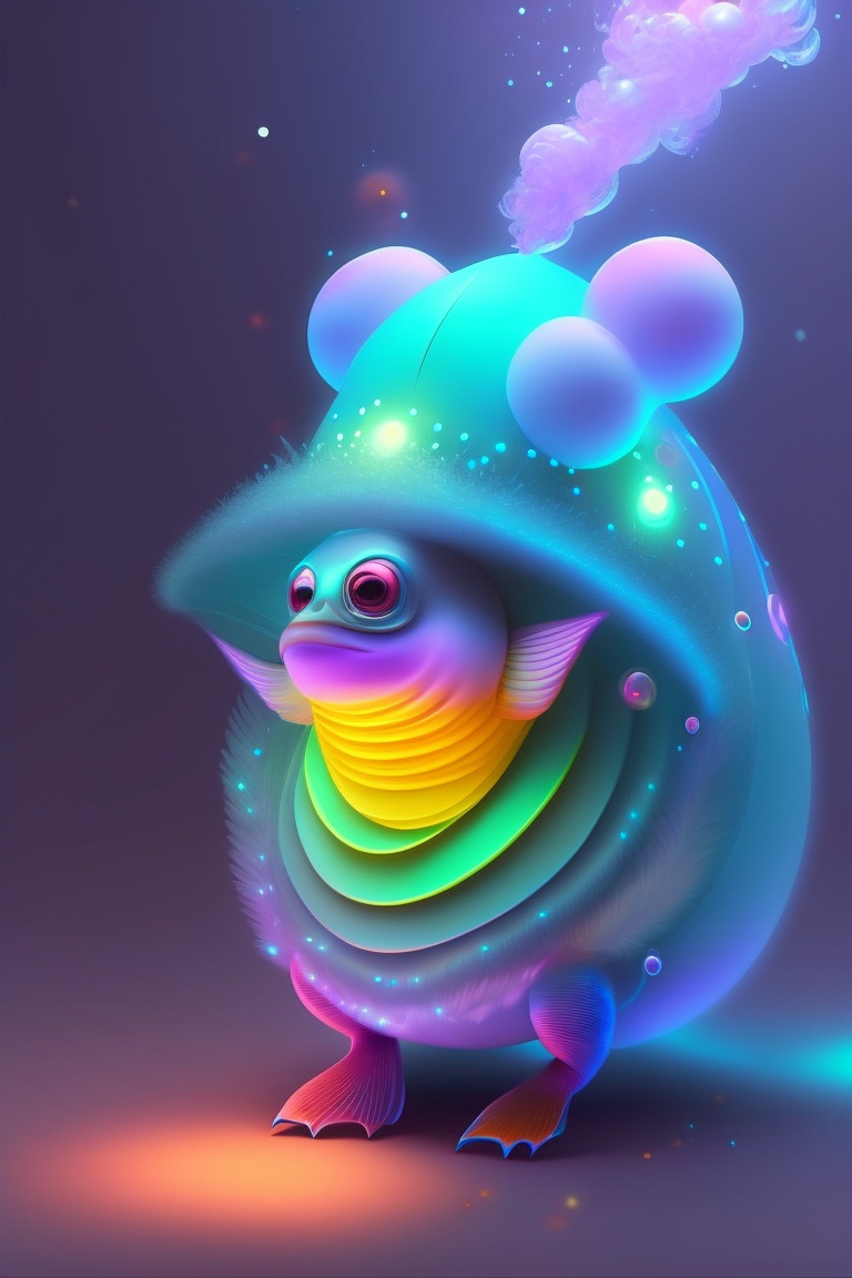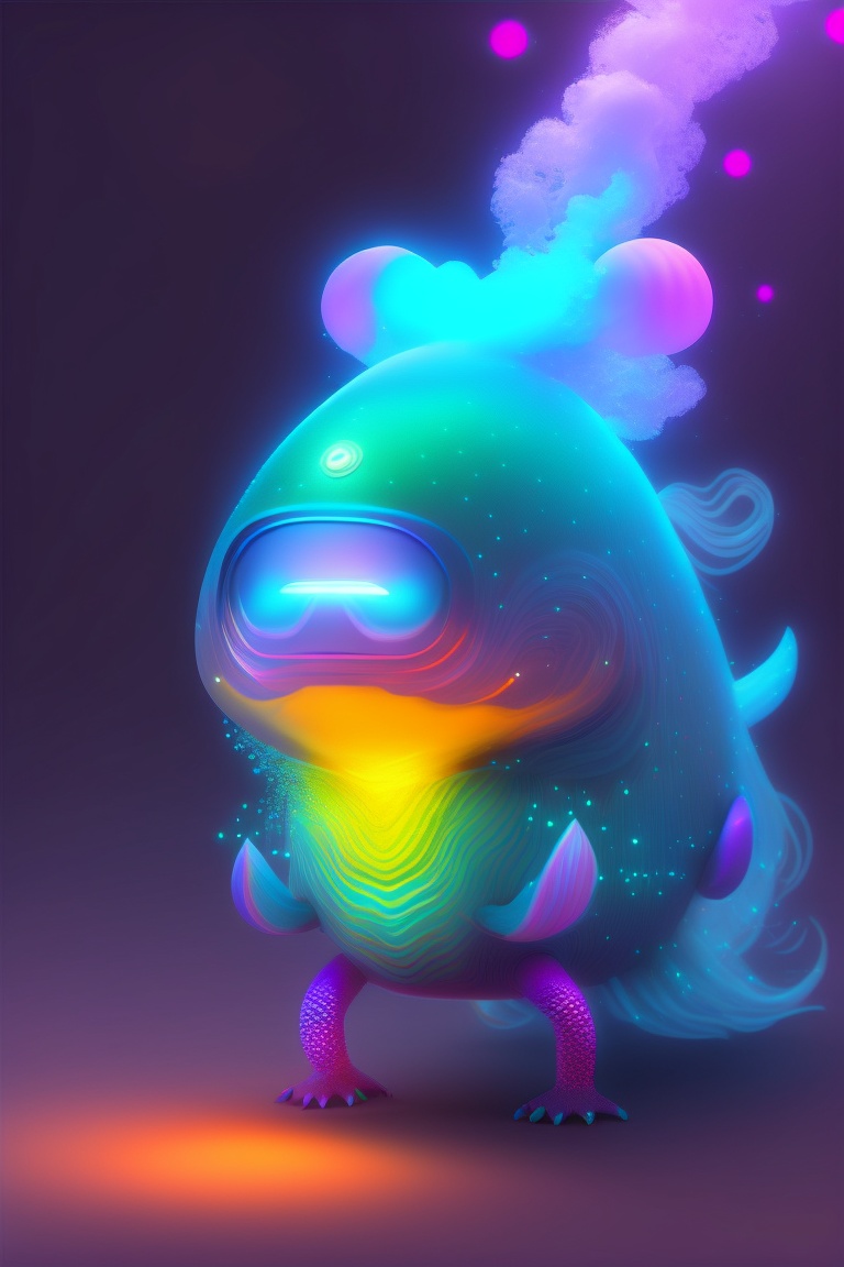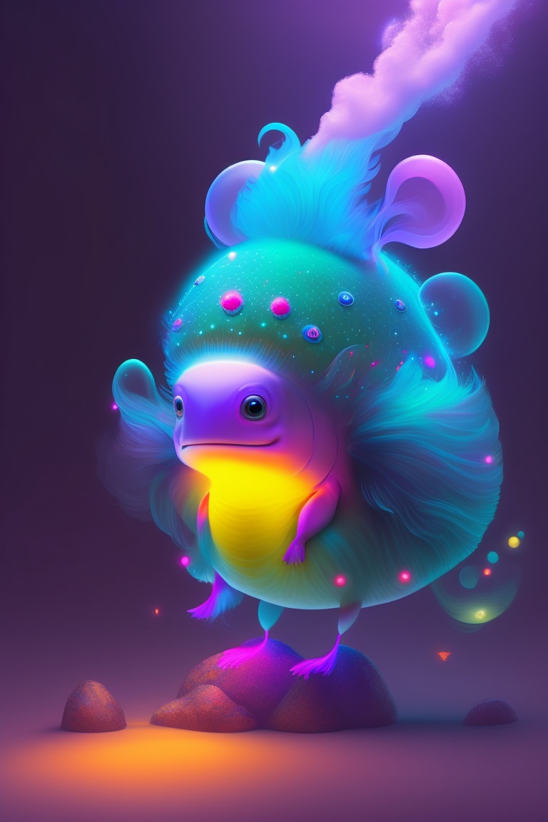A character of an adorable underwater creature, pixar style, with lights inside, psychedelic colors, fantastic