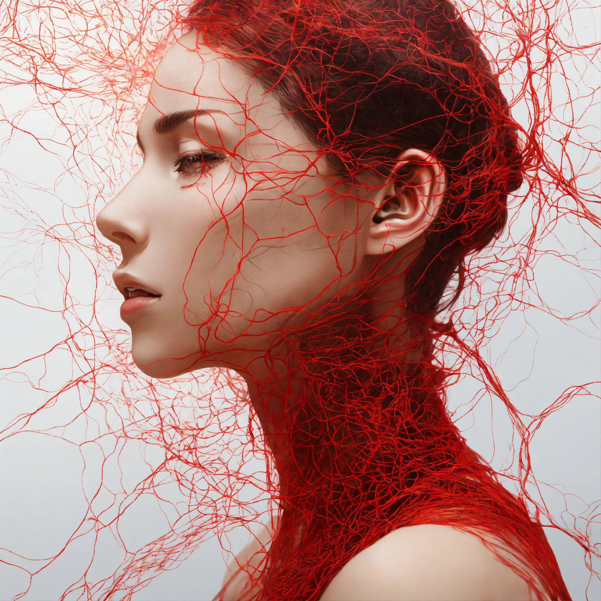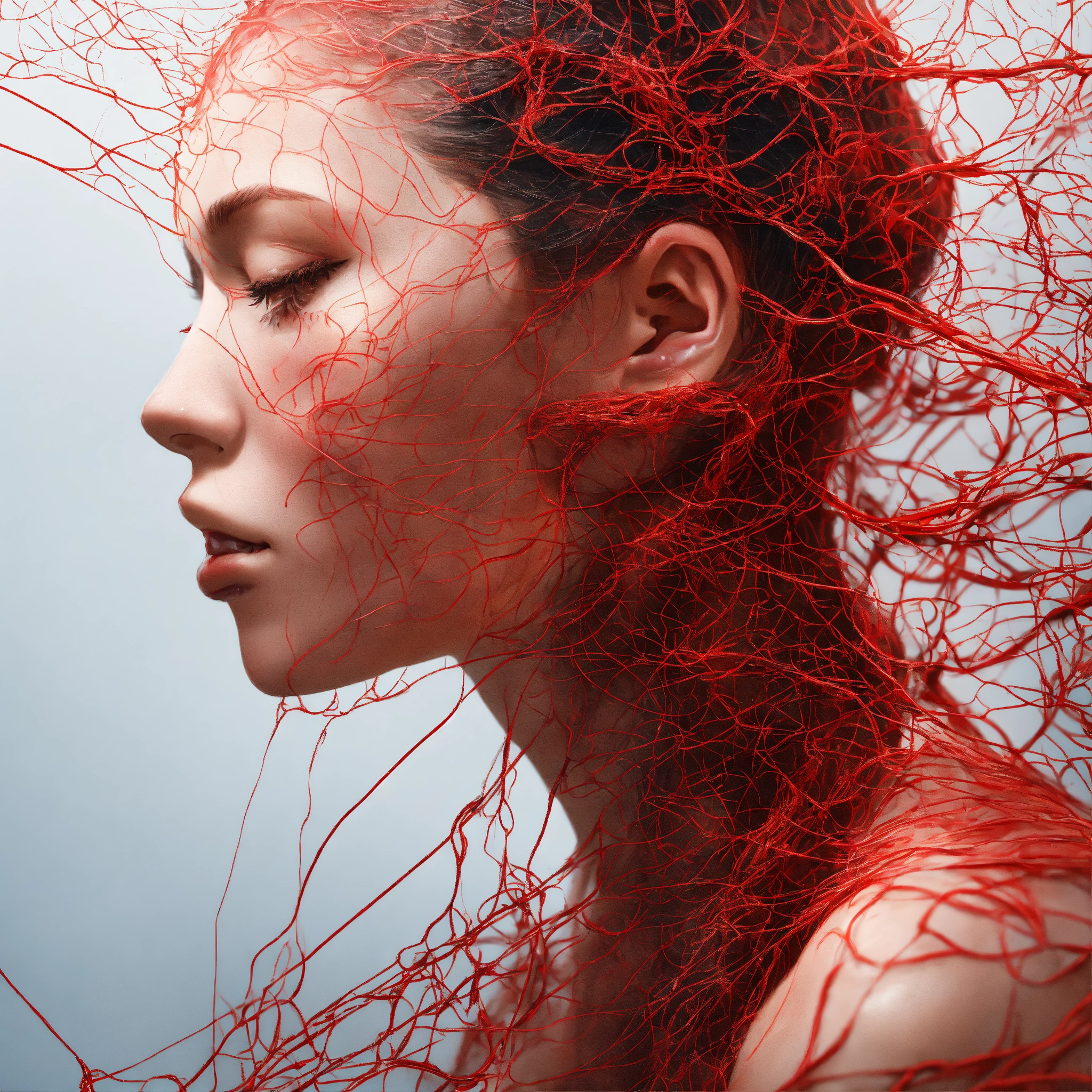 Photo 16k, ultra realist, variant logo "pixelshoot" compelling double exposure image of a woman juxtaposed with a red line drawing of a complex white water network of veins and arteries on a white background, intricate details