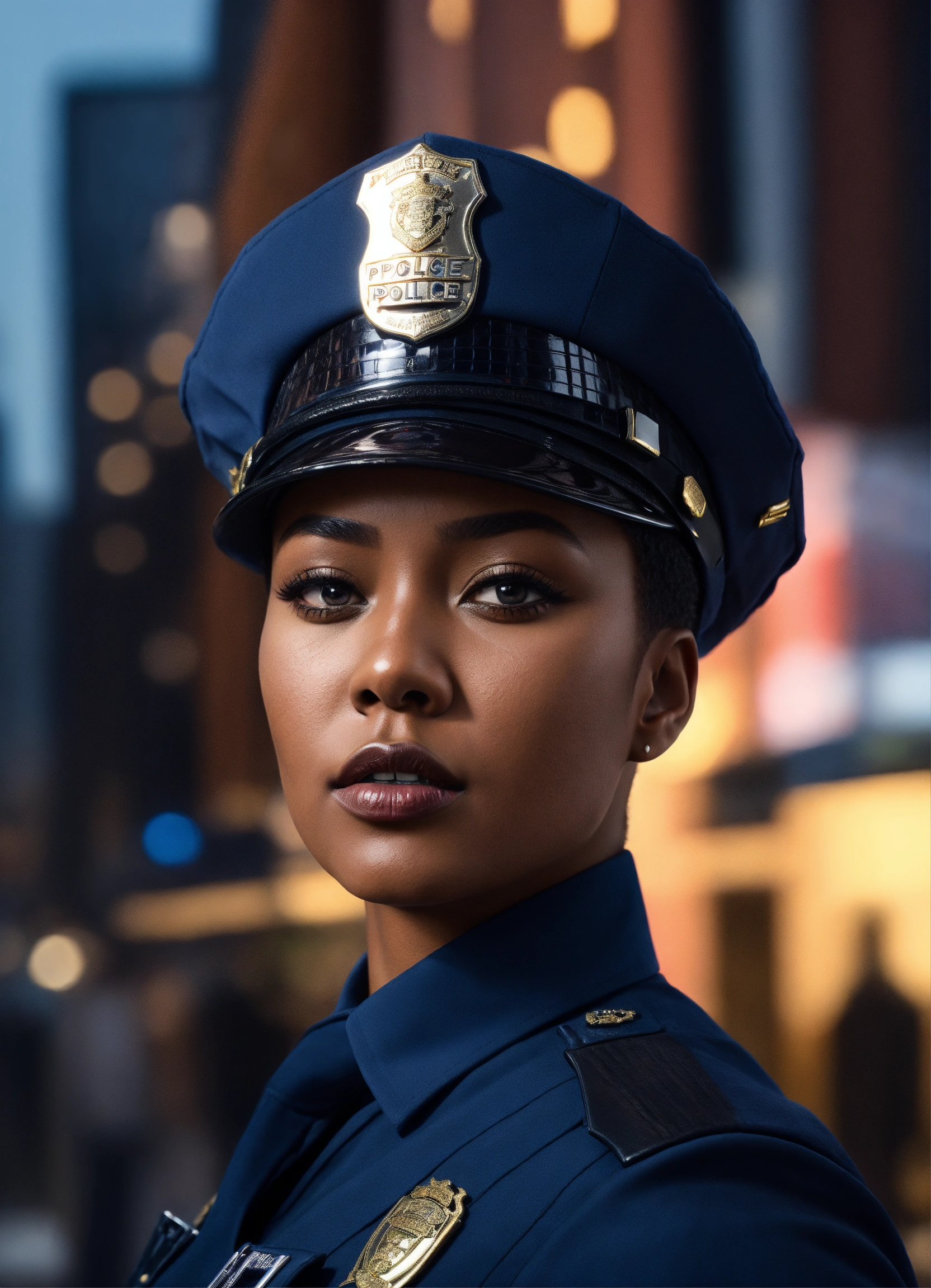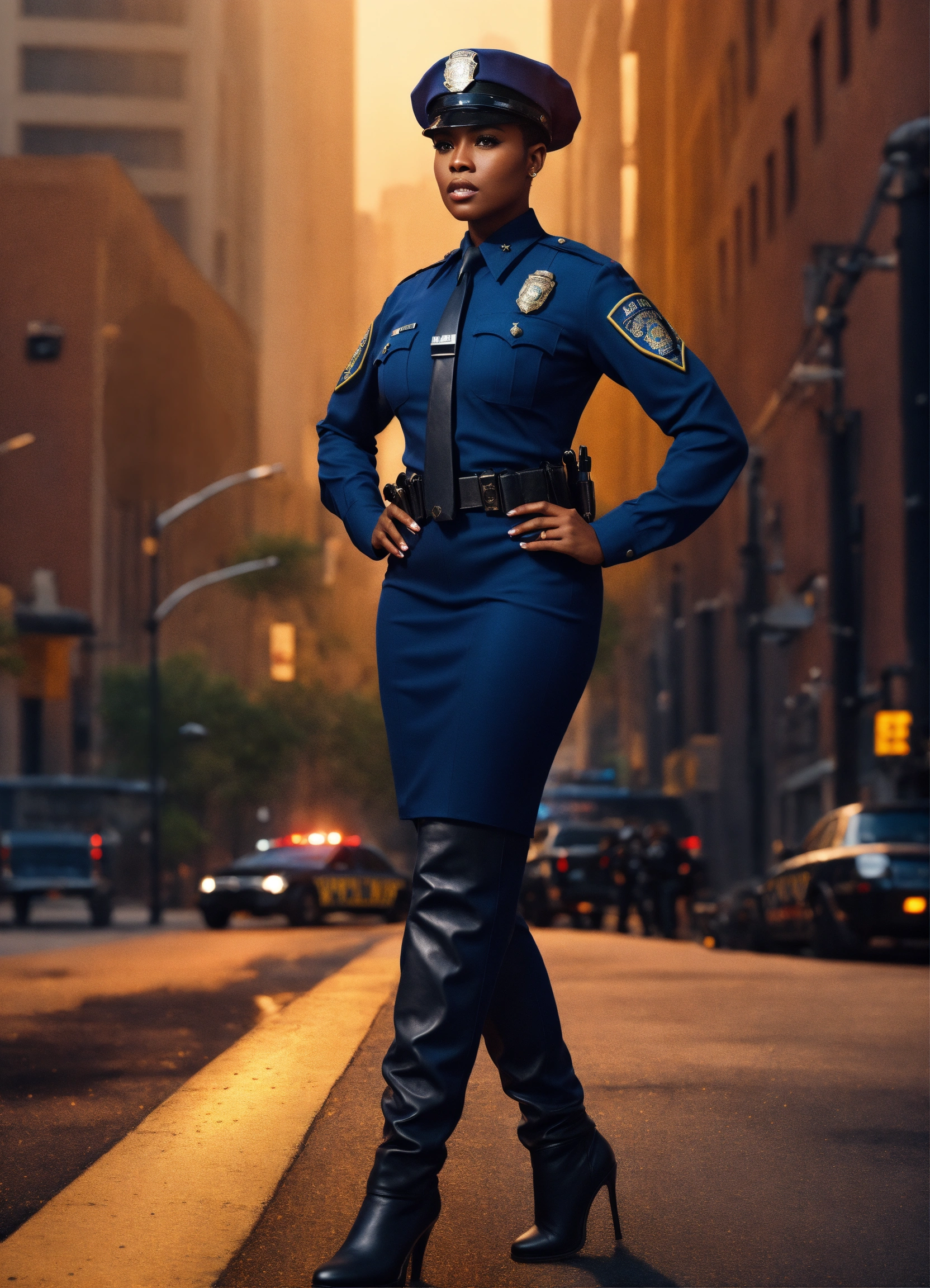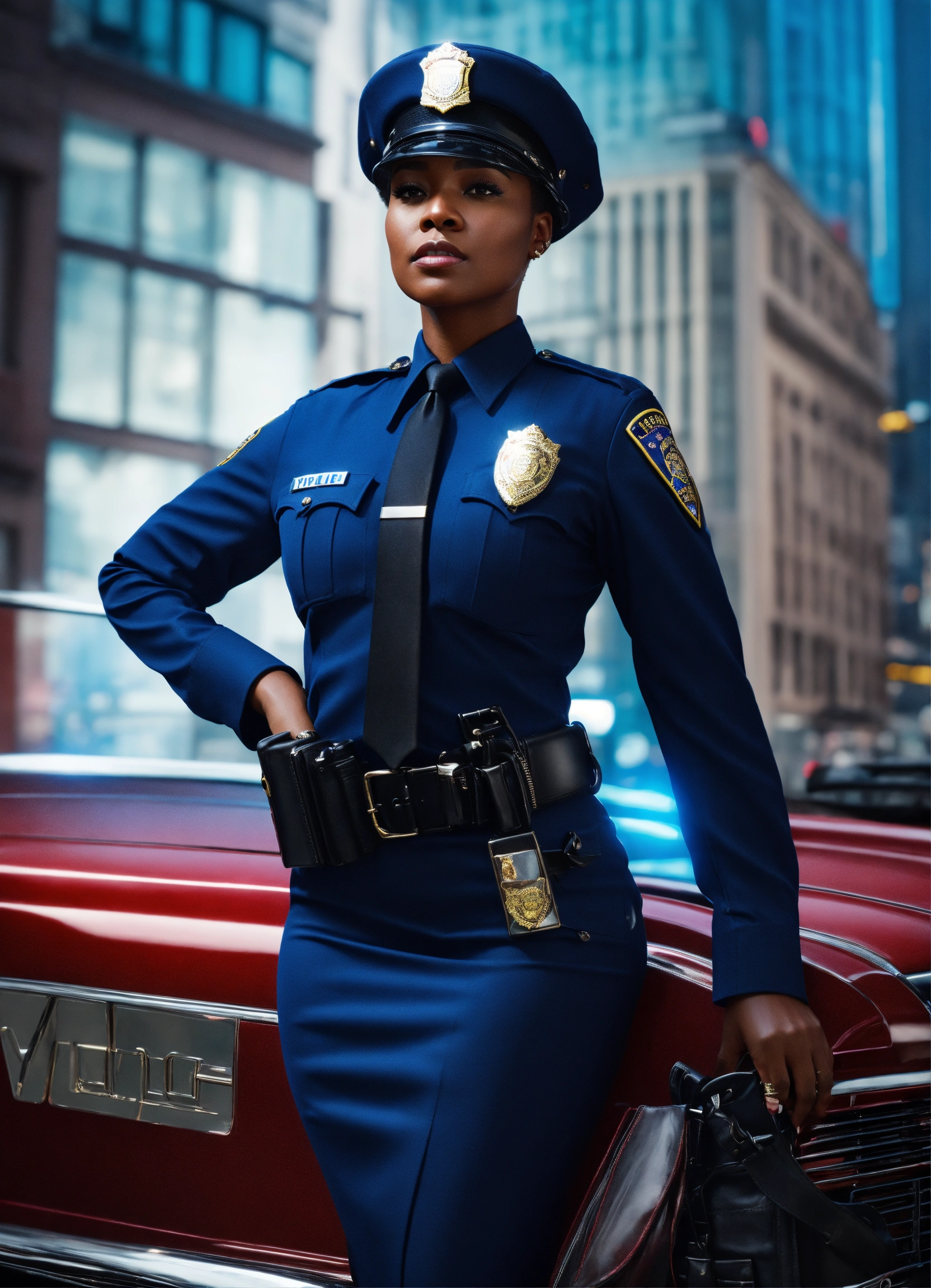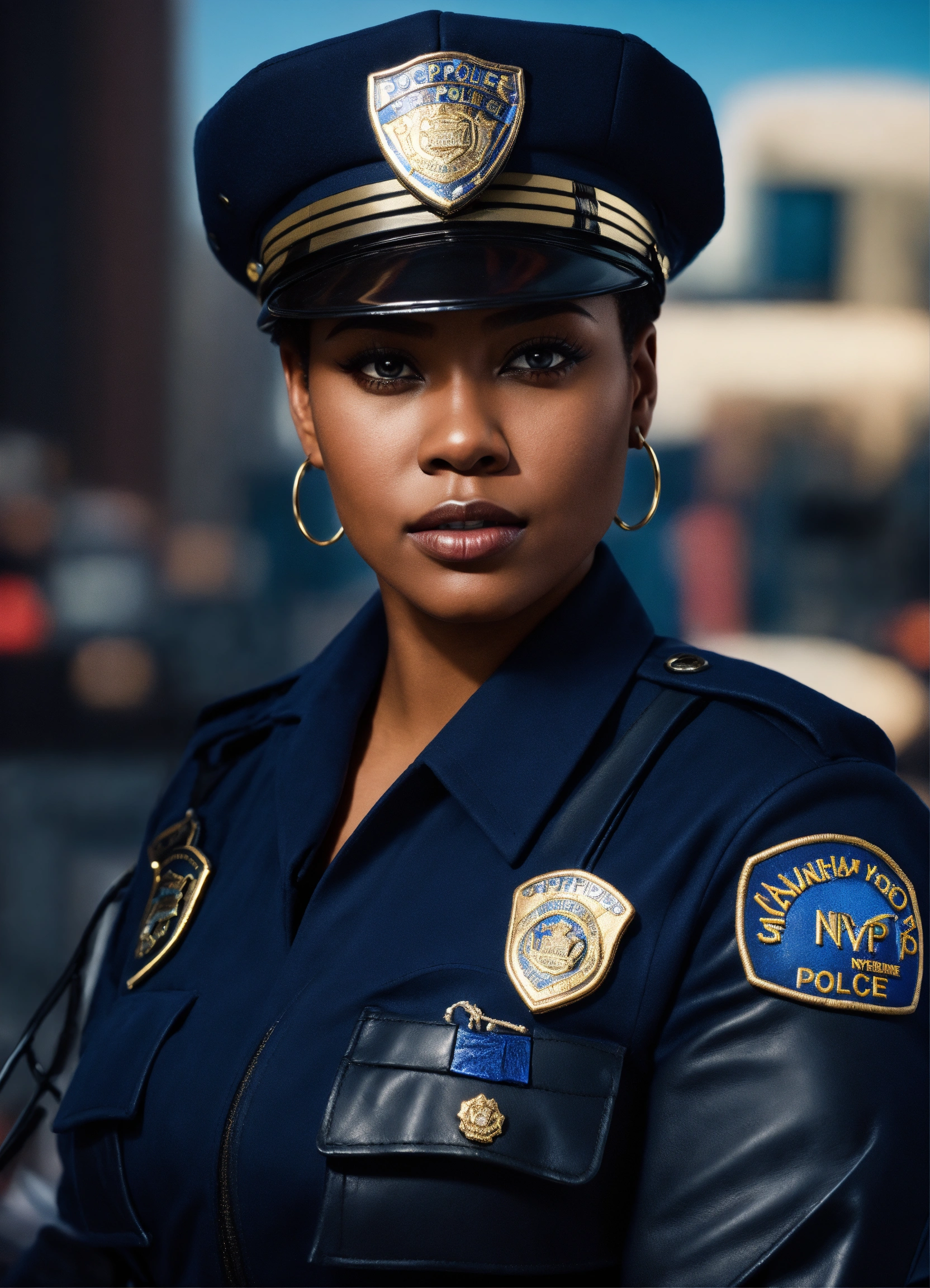Vogue photo shoot of glamorous african american police officer, pixie cut, wearing a nypd dress police uniform, wearing a hat, leather fantasy uniform, hyperrealistic, highly detailed, octane render, 8k