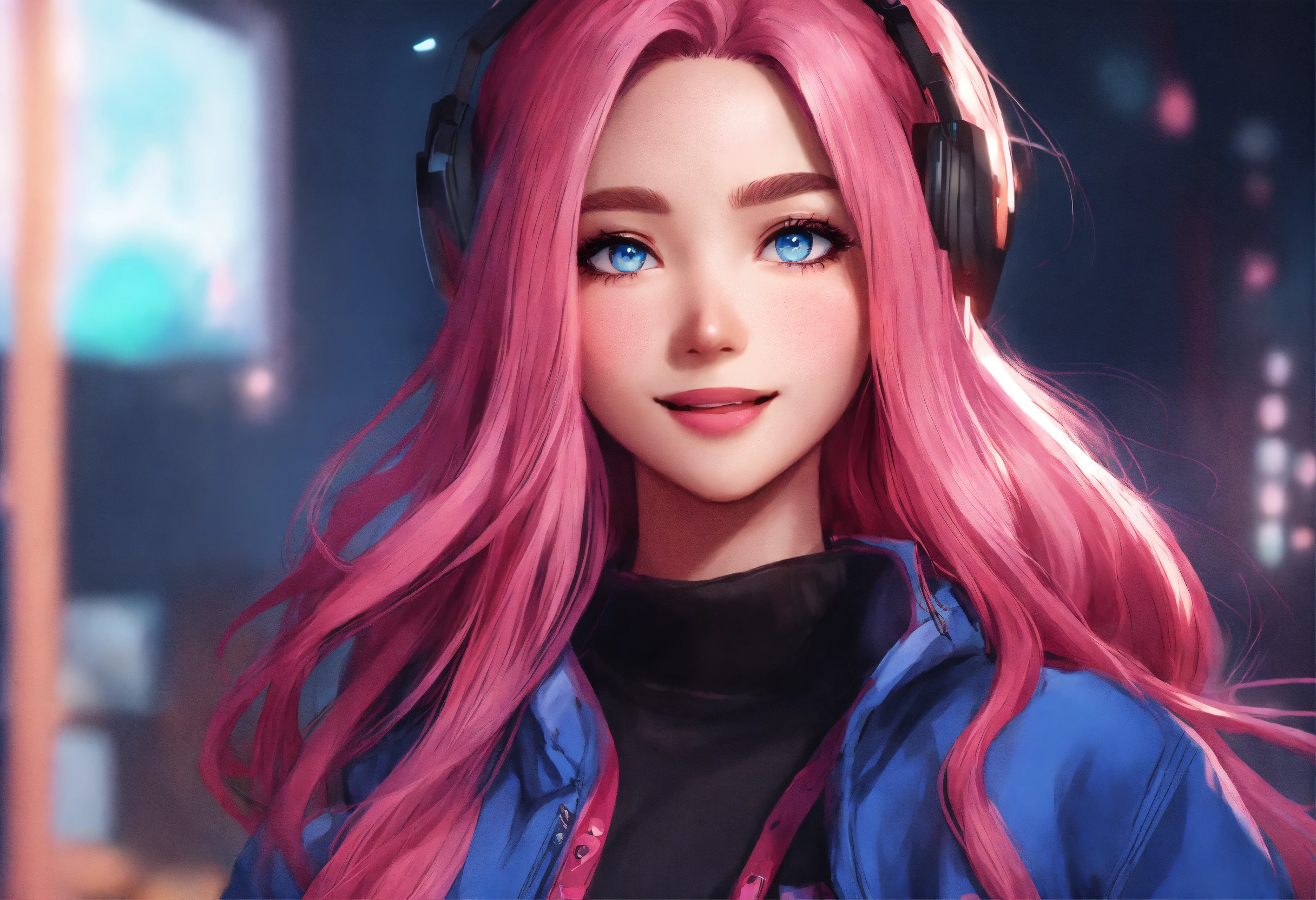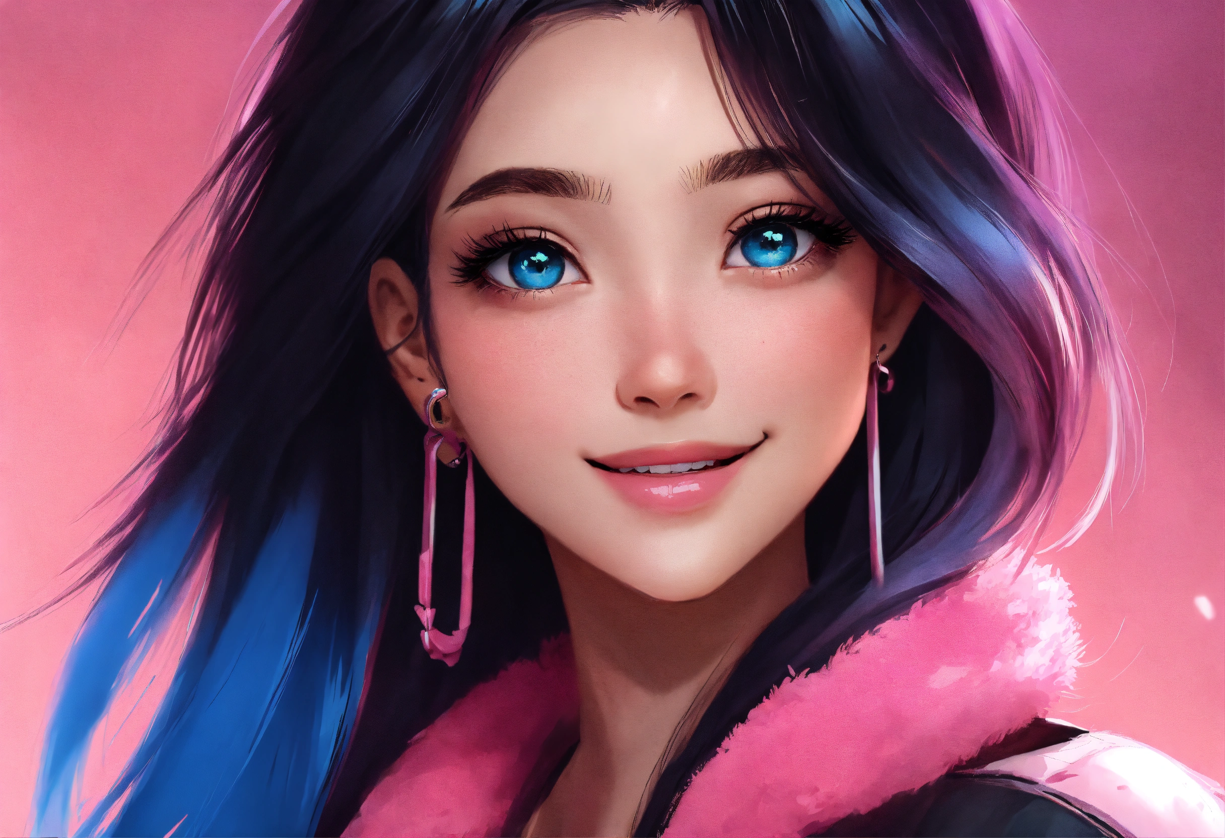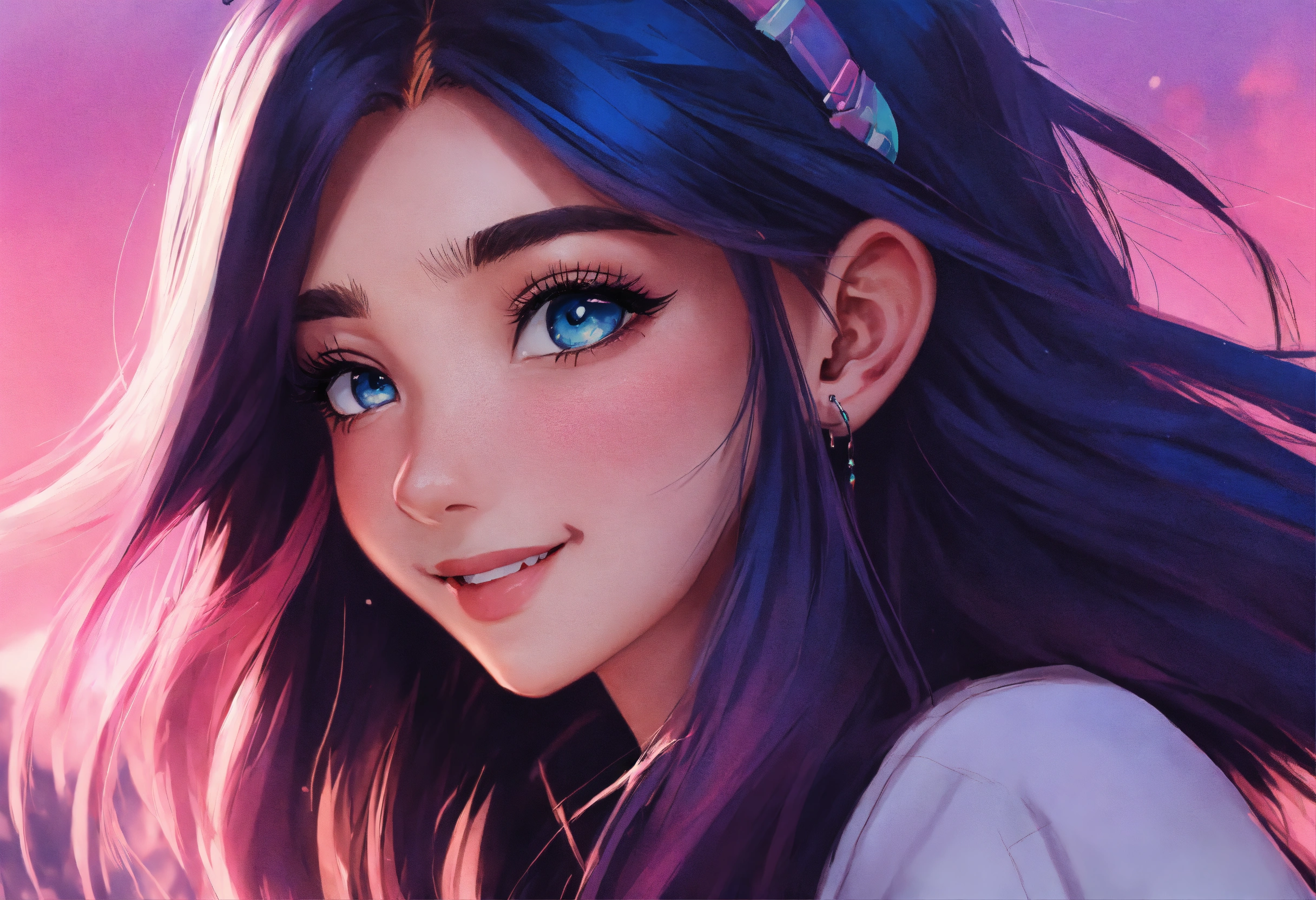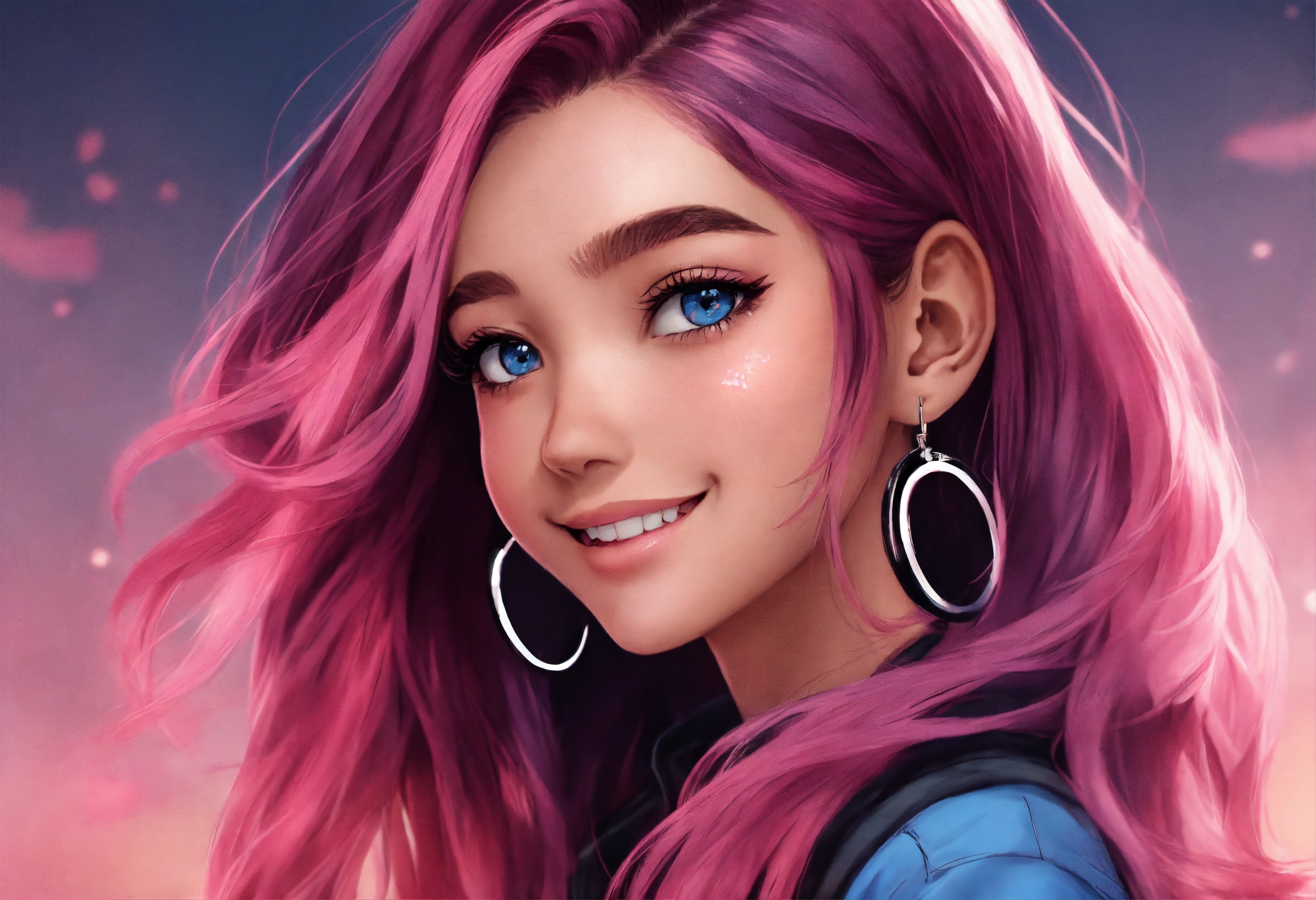 Cartoon character, black pink ombre hair long, smiling, animation style sketched, white skin, blue eyes