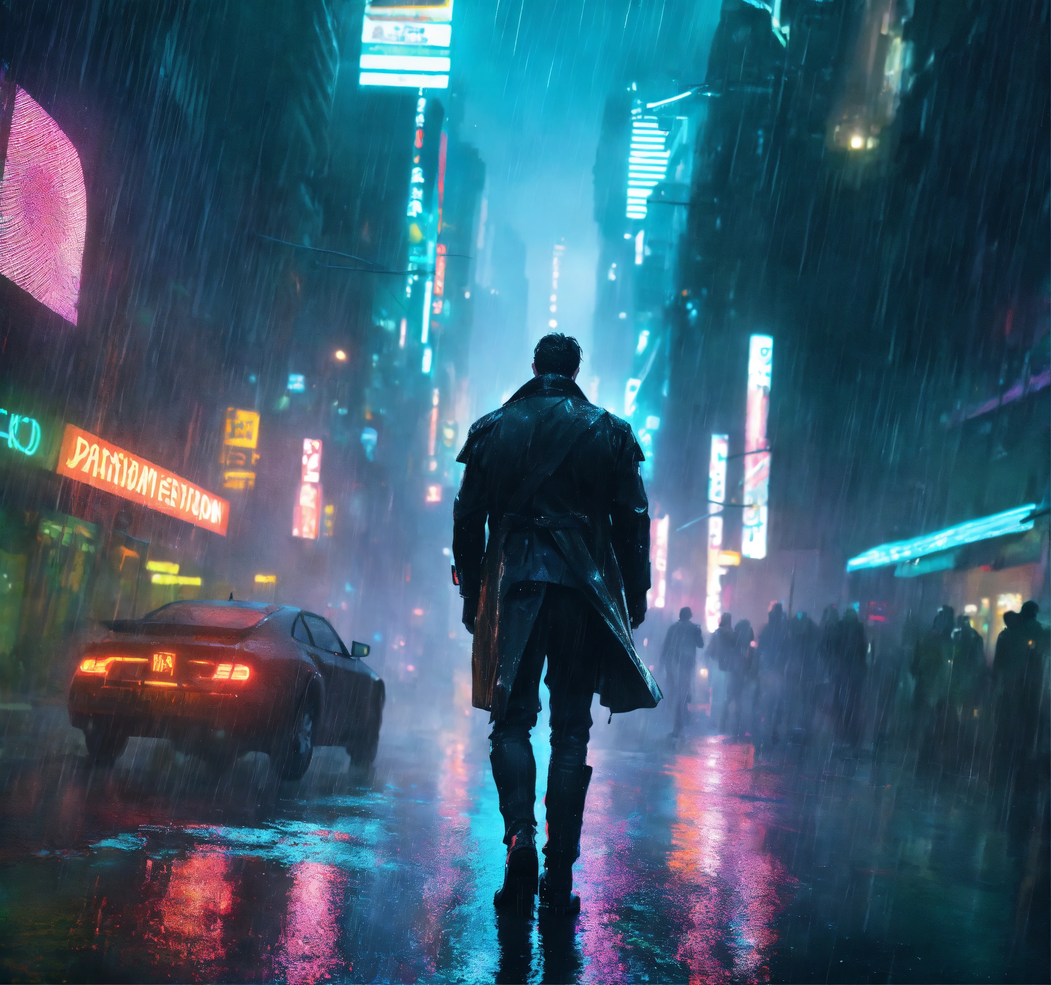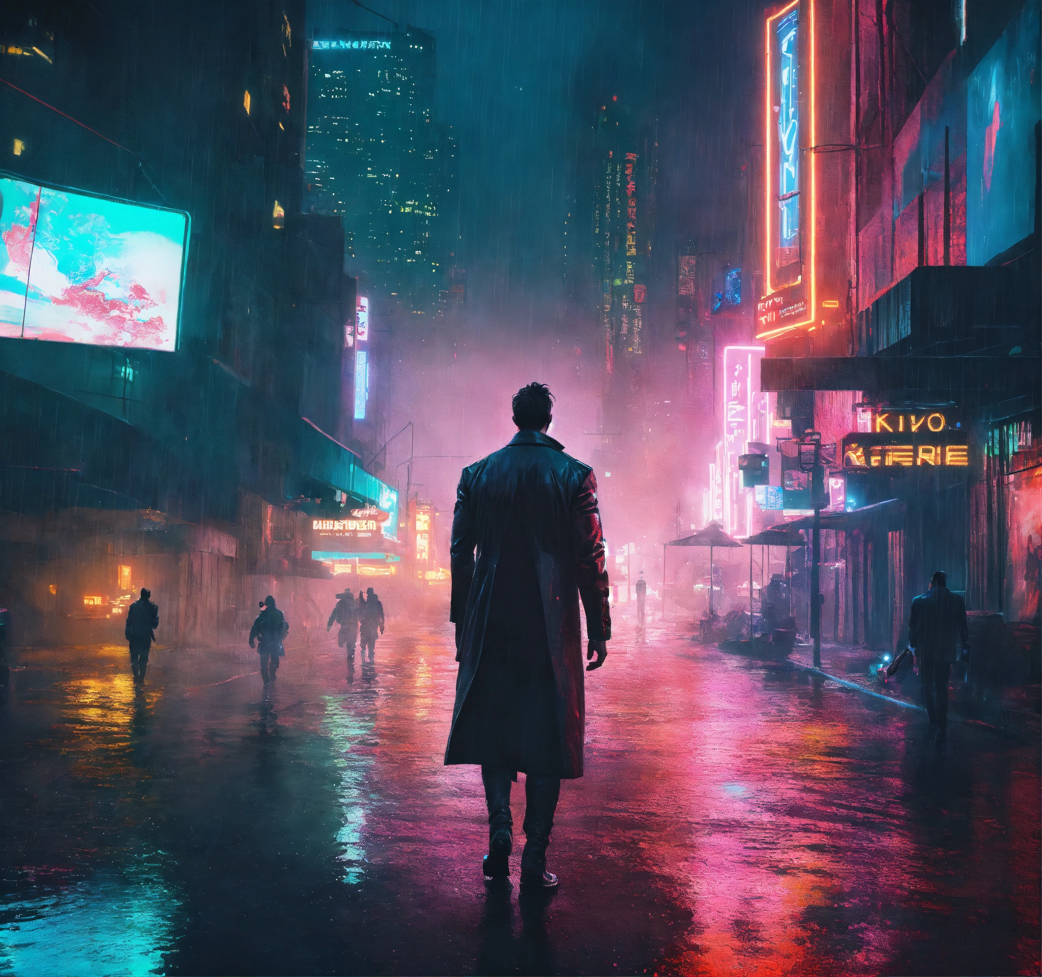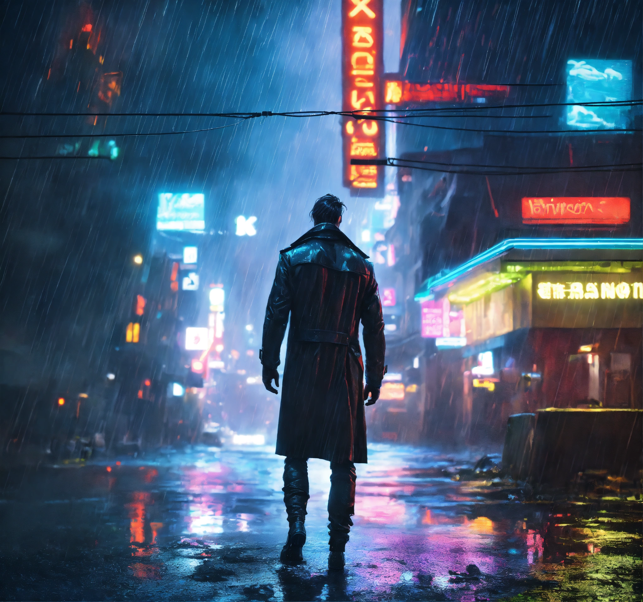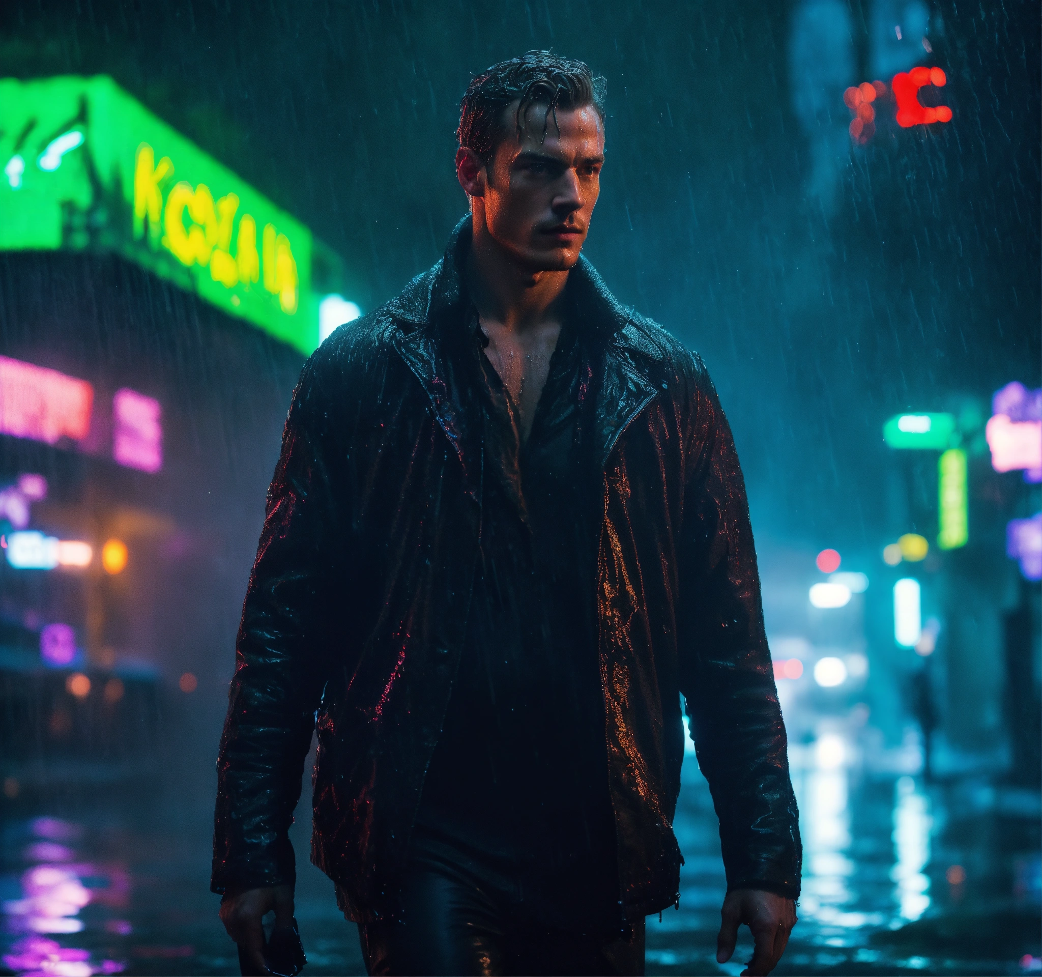 Beautiful tall man, kinnaman, altered carbon style, war, apocalypse, dark, walk, city, white, light, neon, cinematic, epic, detailed, rain, wet, water, realistic man
