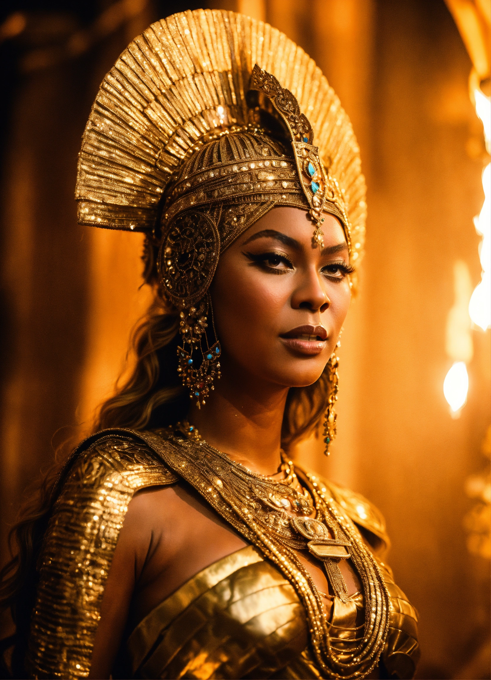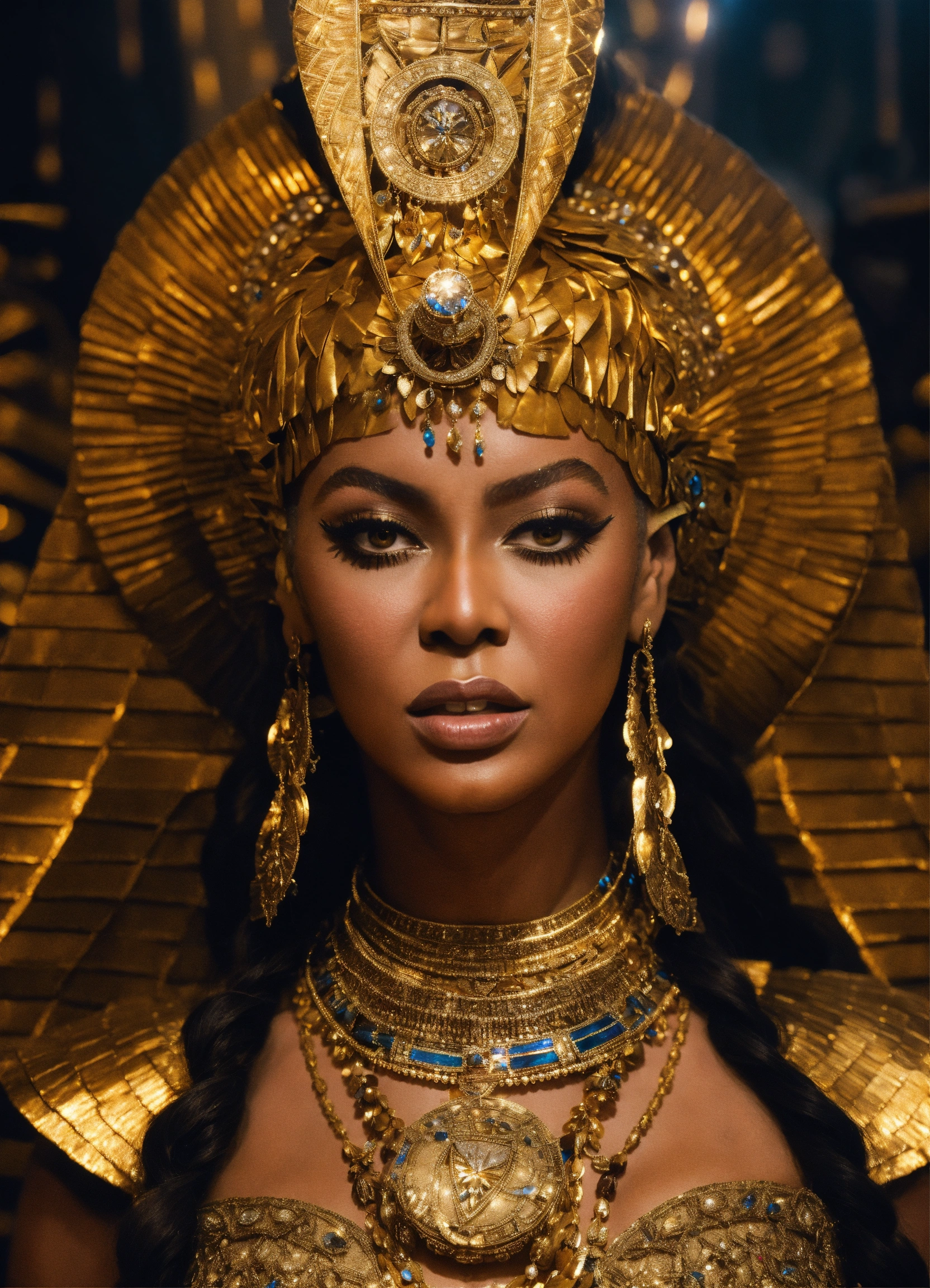 Beyoncé dressed as the sumerian goddess ishtar, with, elaborate, cinematic lighting, photorealistic, full royal regalia the decent of ishatar