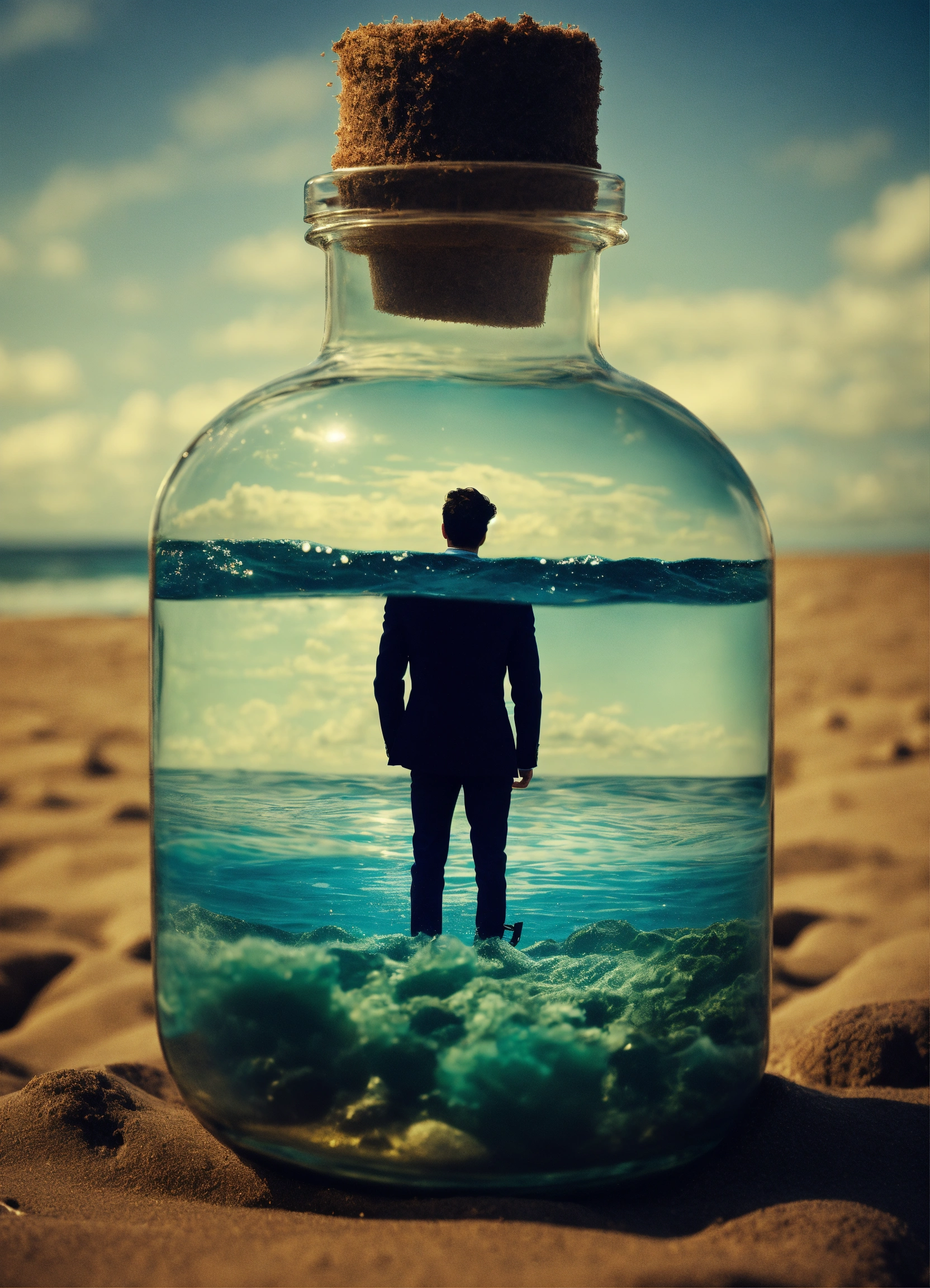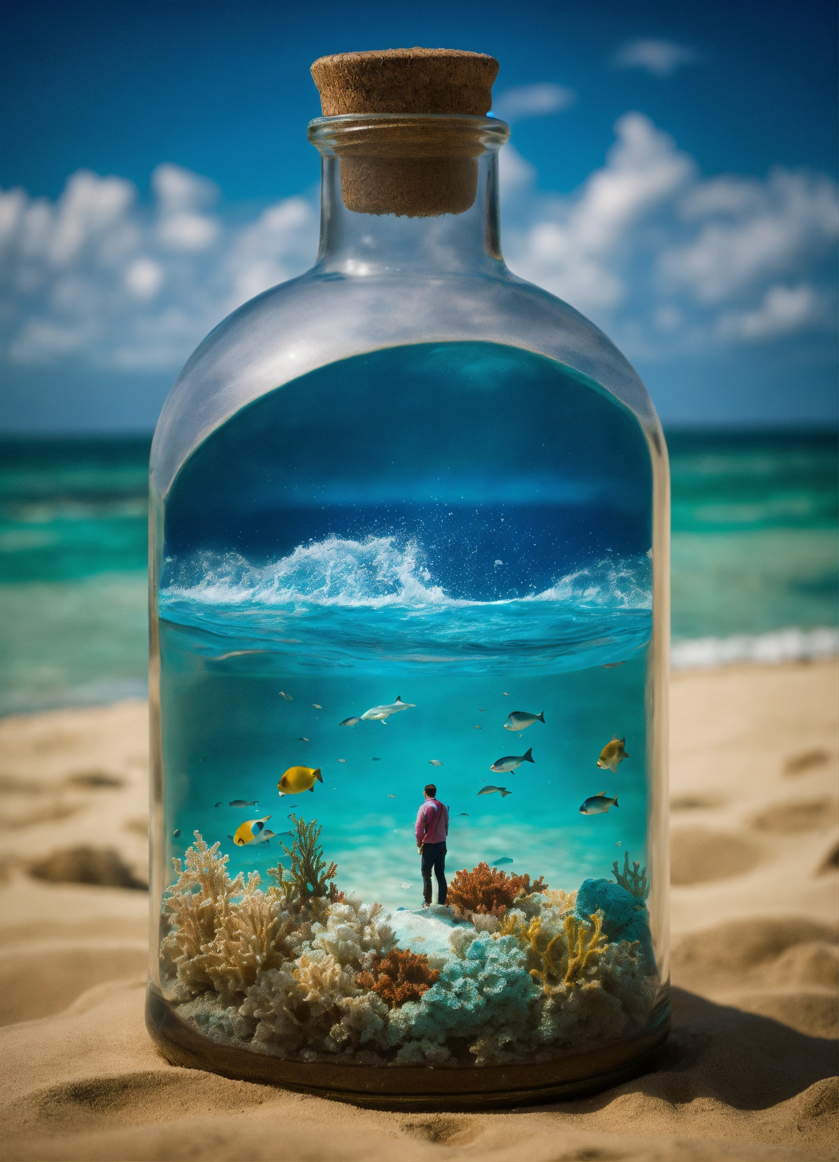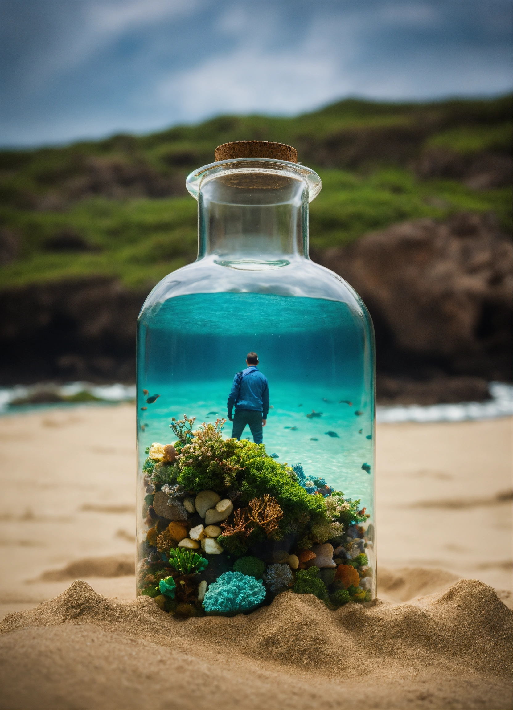 An ocean inside a bottle held by a man