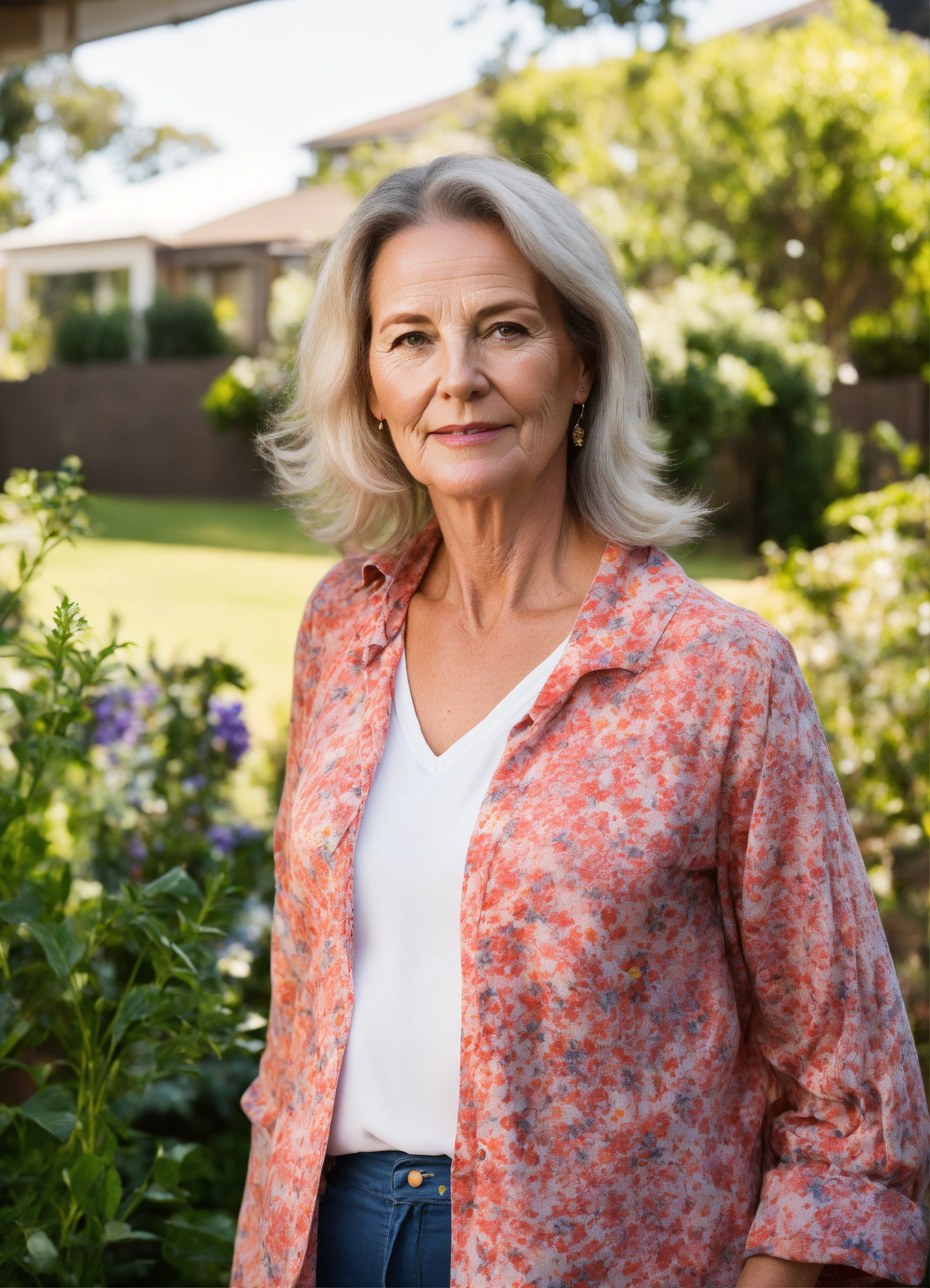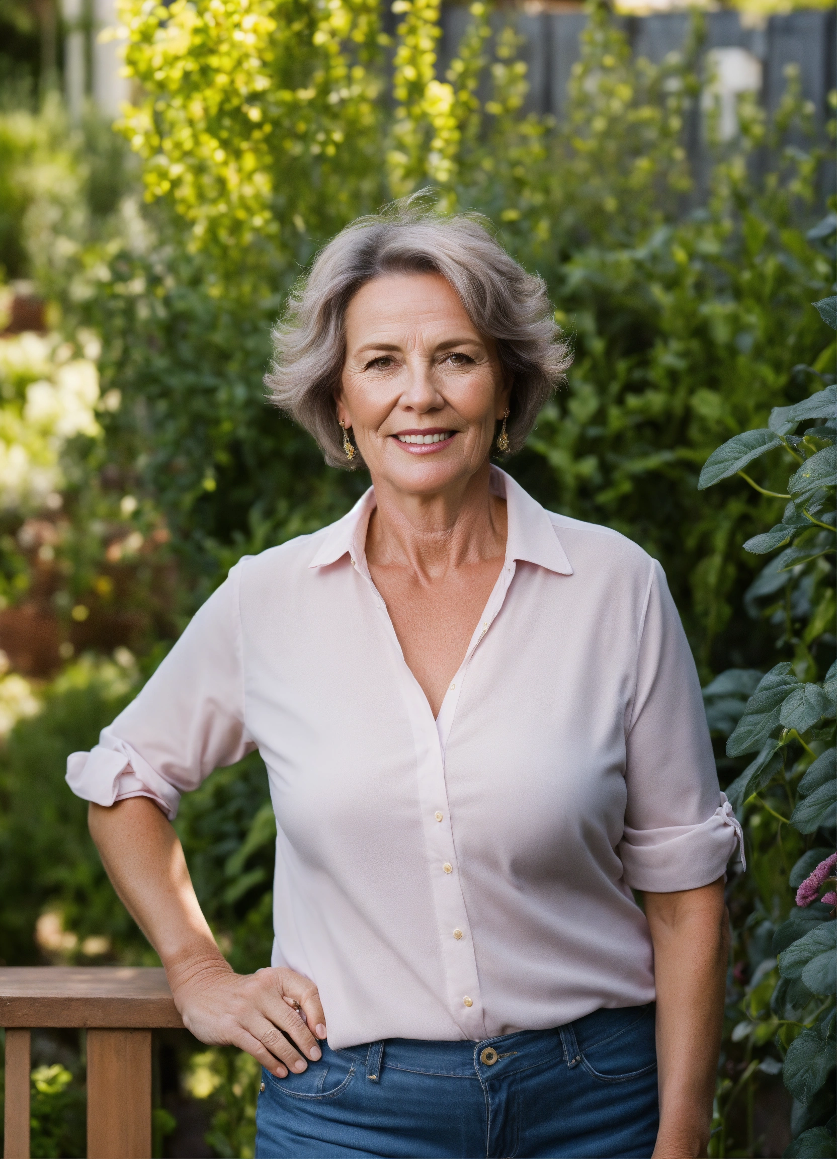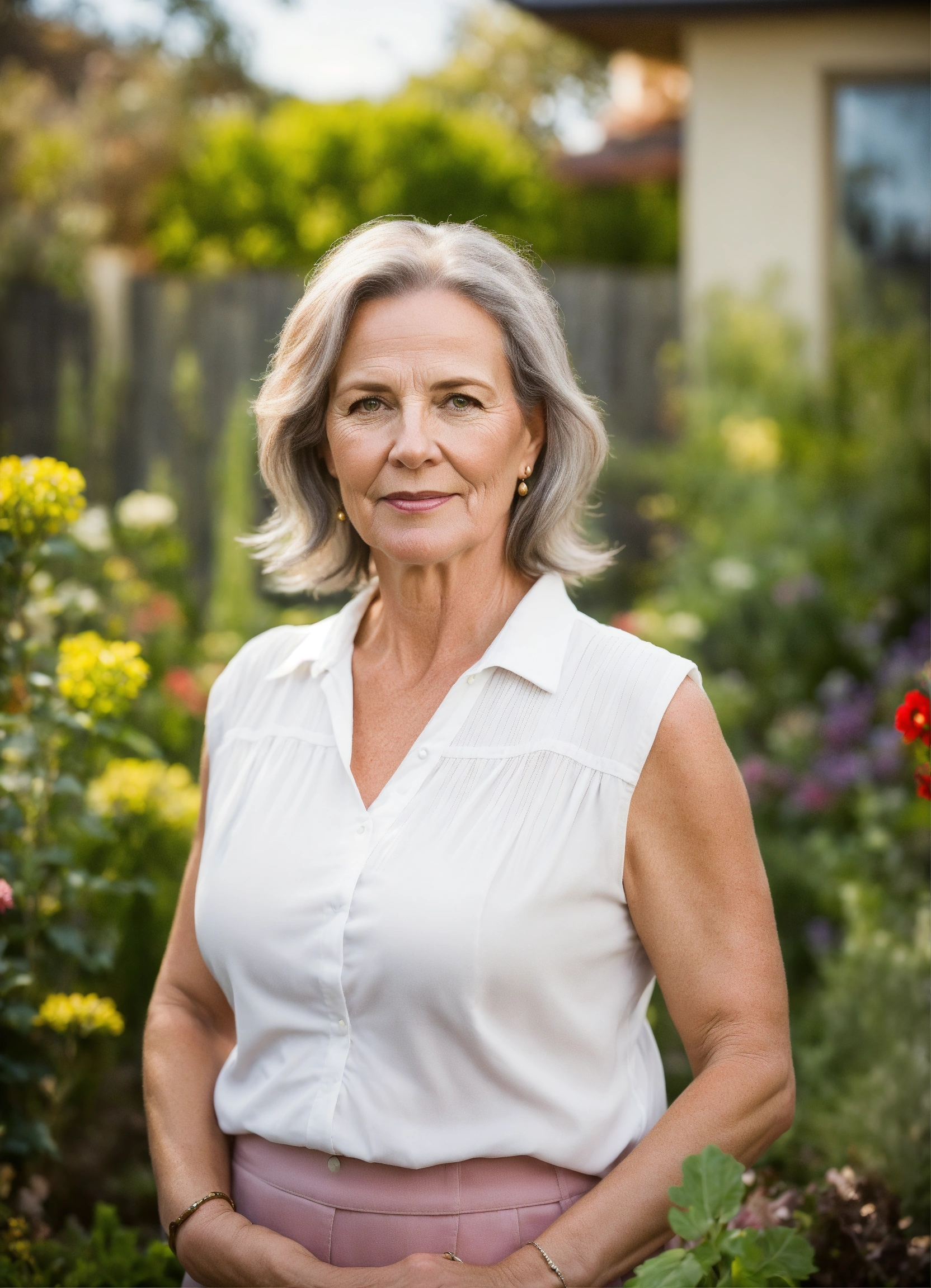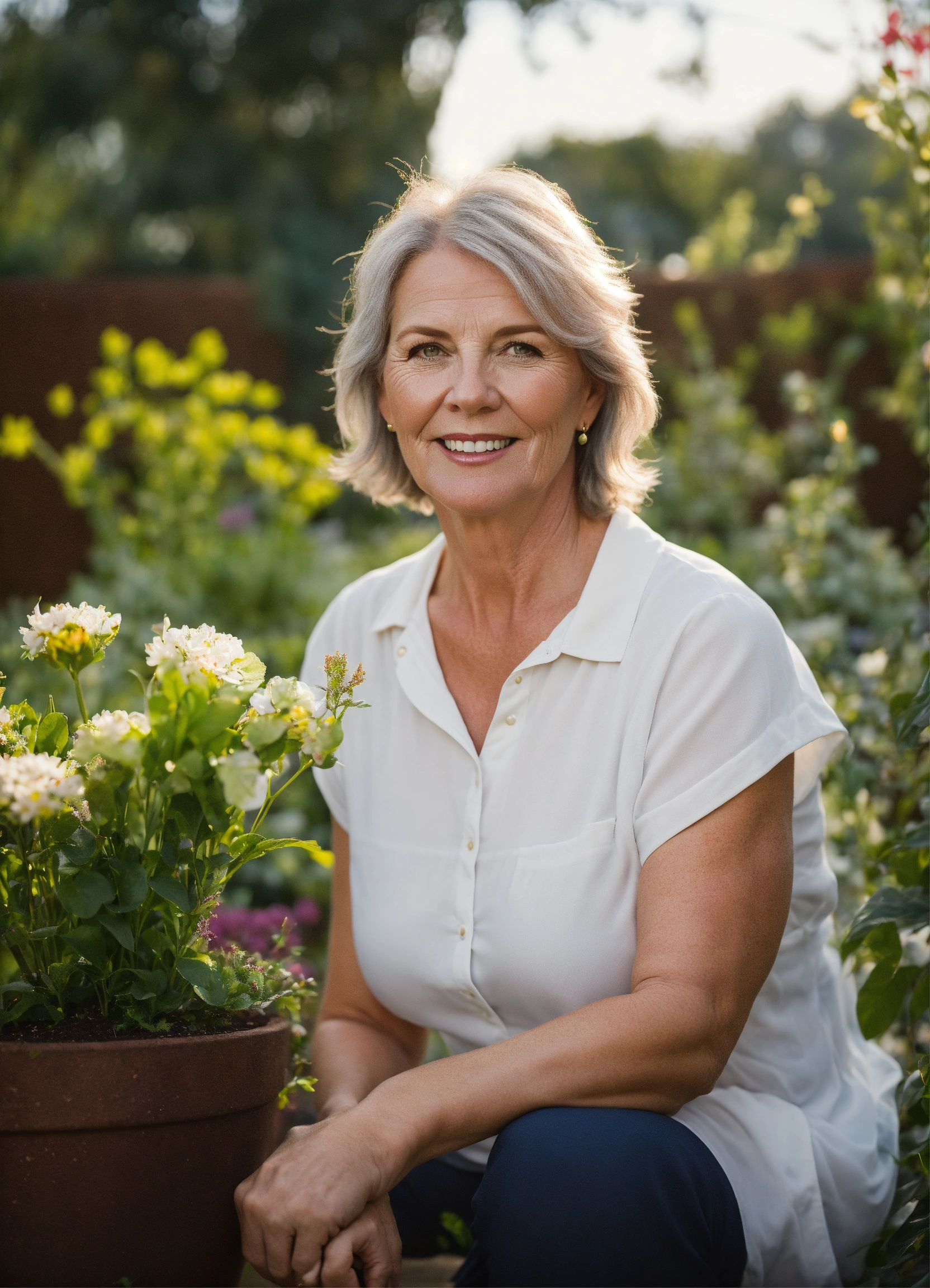 Outdoor photo portrait of a 50-year-old white the average australian successful woman with an above average income next to garden