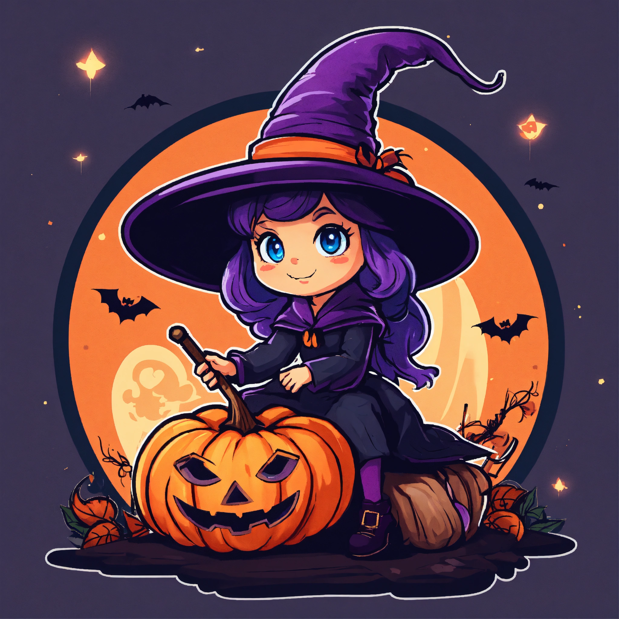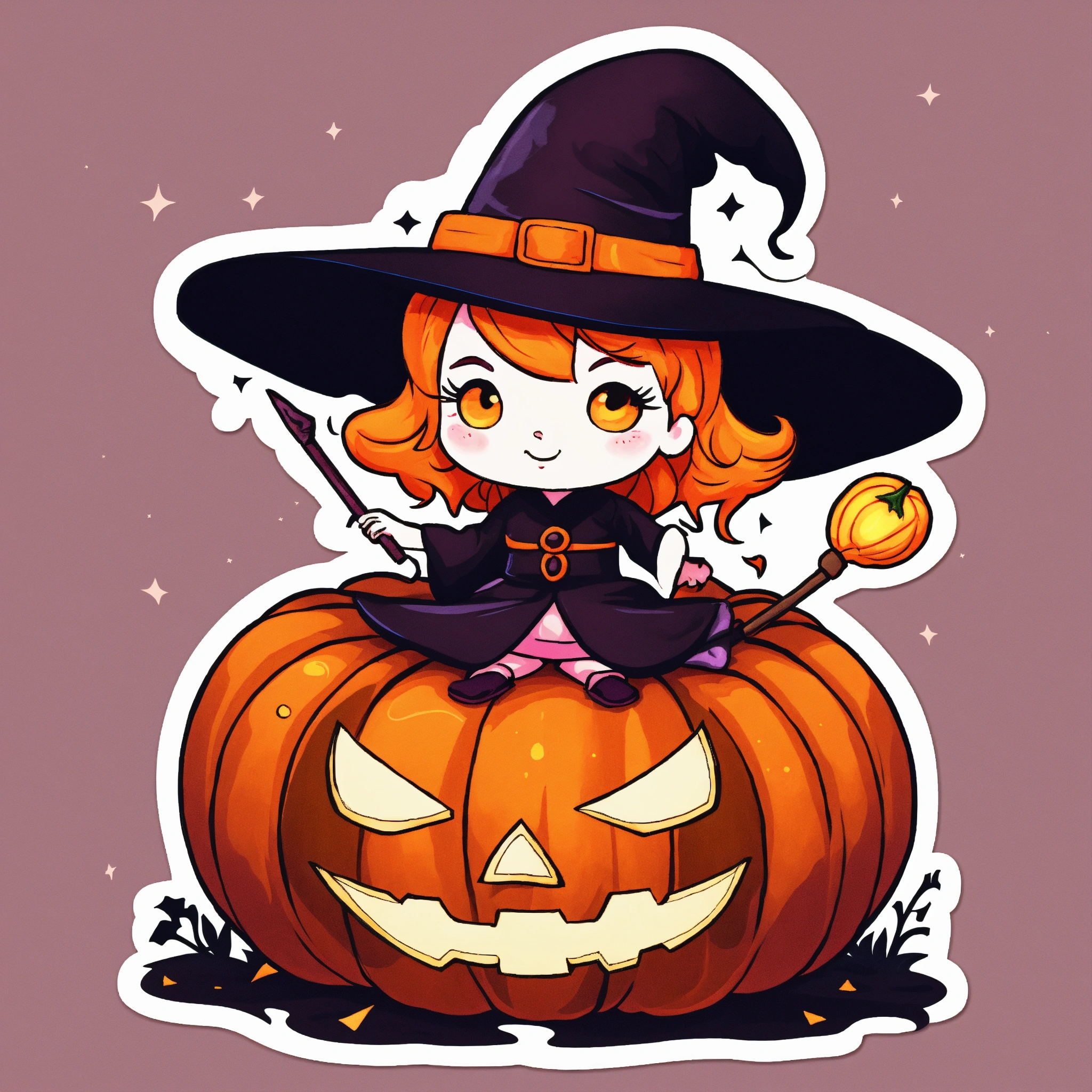 Cute little witch in a hat, holding a magic wand, sits on a scary halloween pumpkin, sticker, 2d illustration style