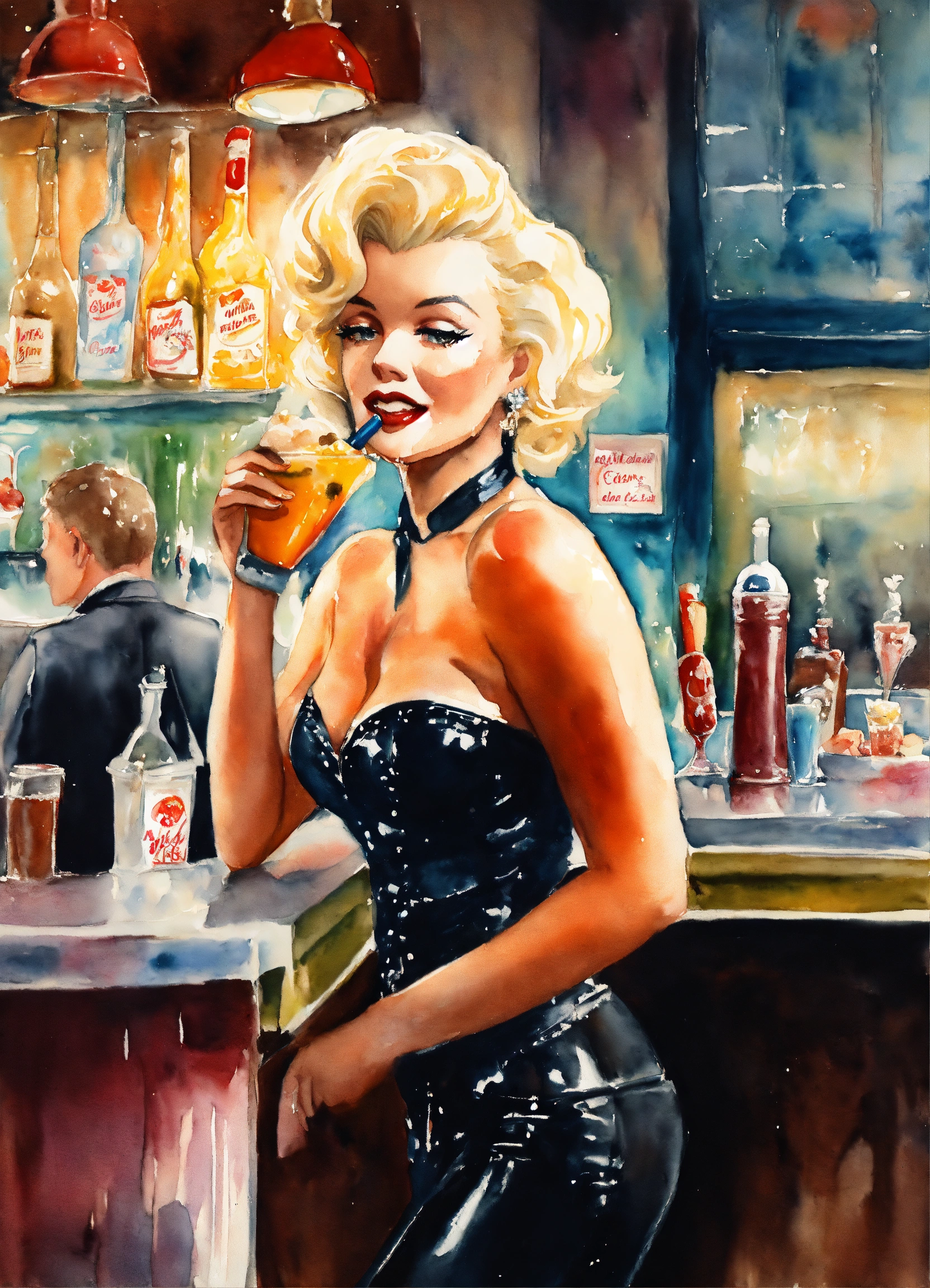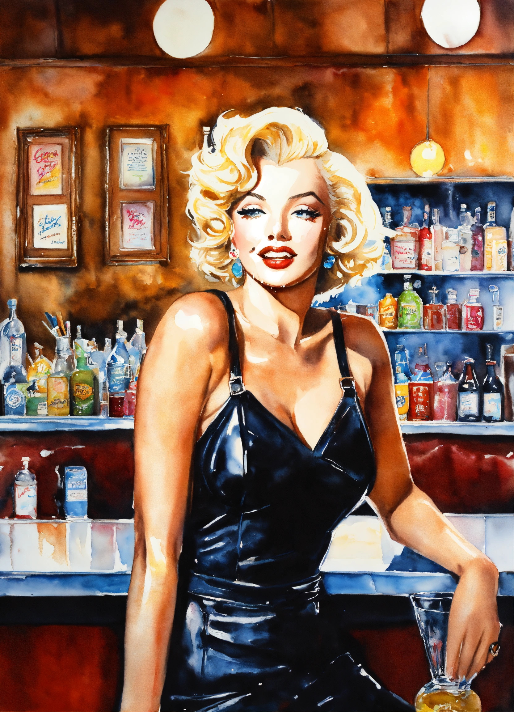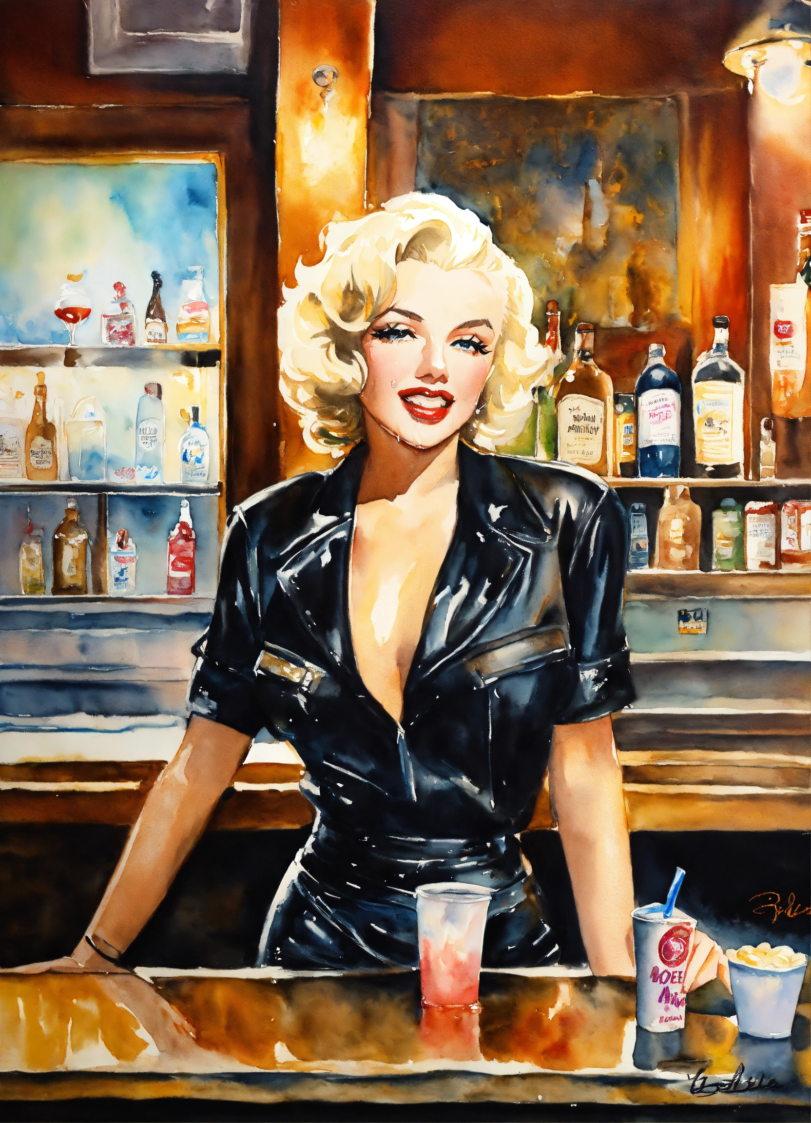 "a fantasy painting, wet on wet, wild watercolor painting of an attractive marilyn monroe female siren bartender, wearing a riveted black leather uniform, at beelzebubba's ice cream parlor"