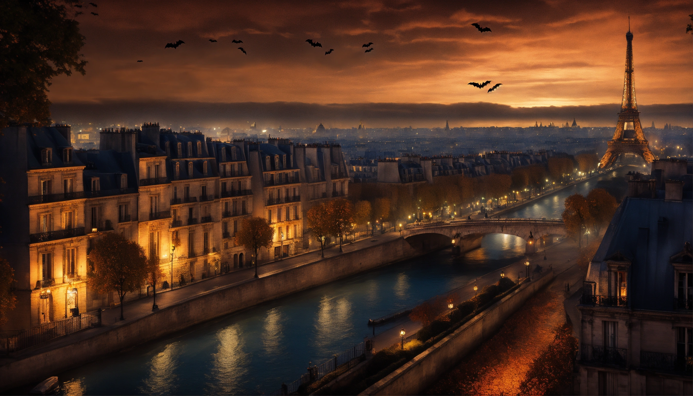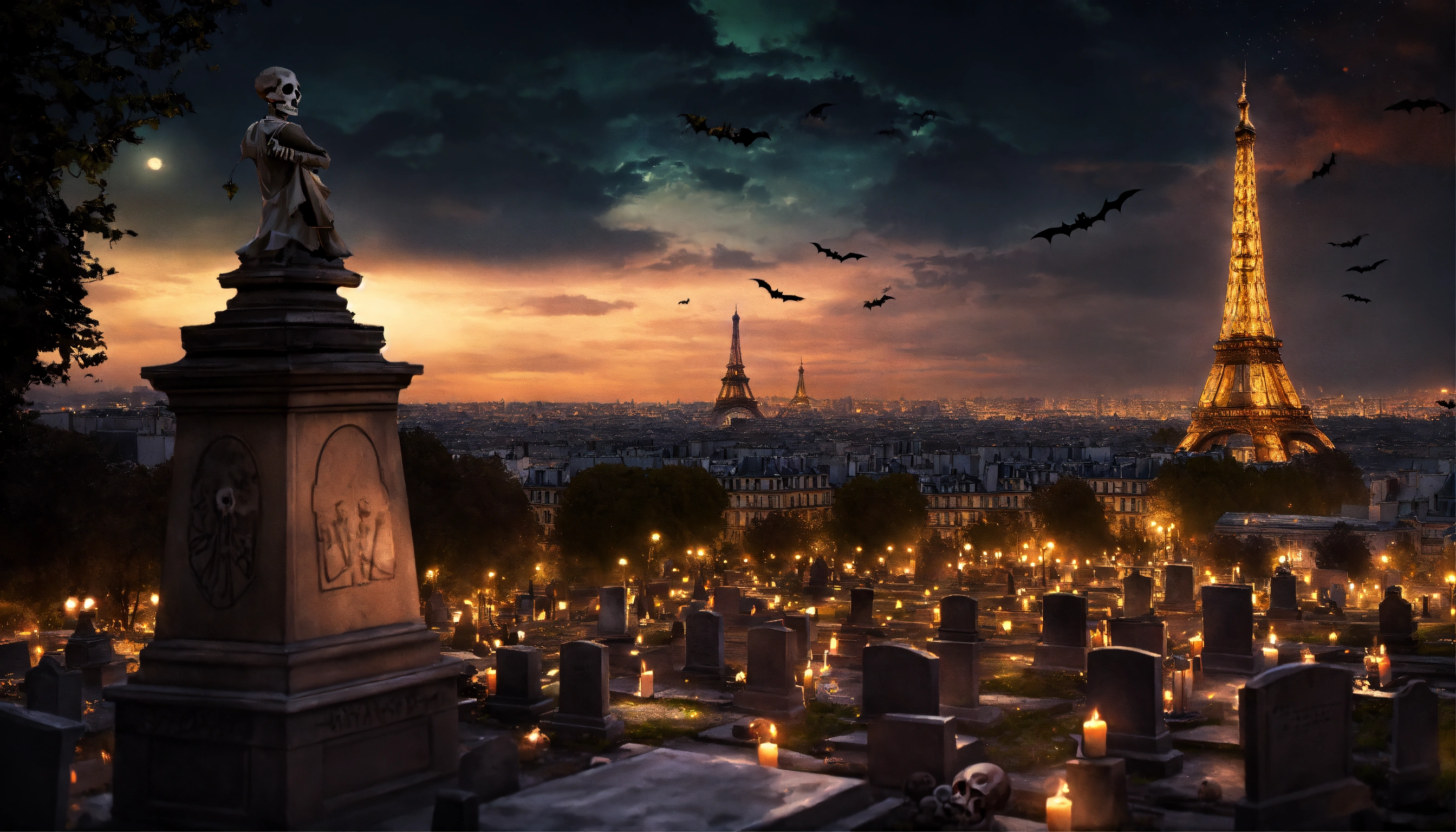 A stunning quality, realistic looking but spooky image of paris at night time with skulls, the eiffel tower, gravestones but in a halloween style