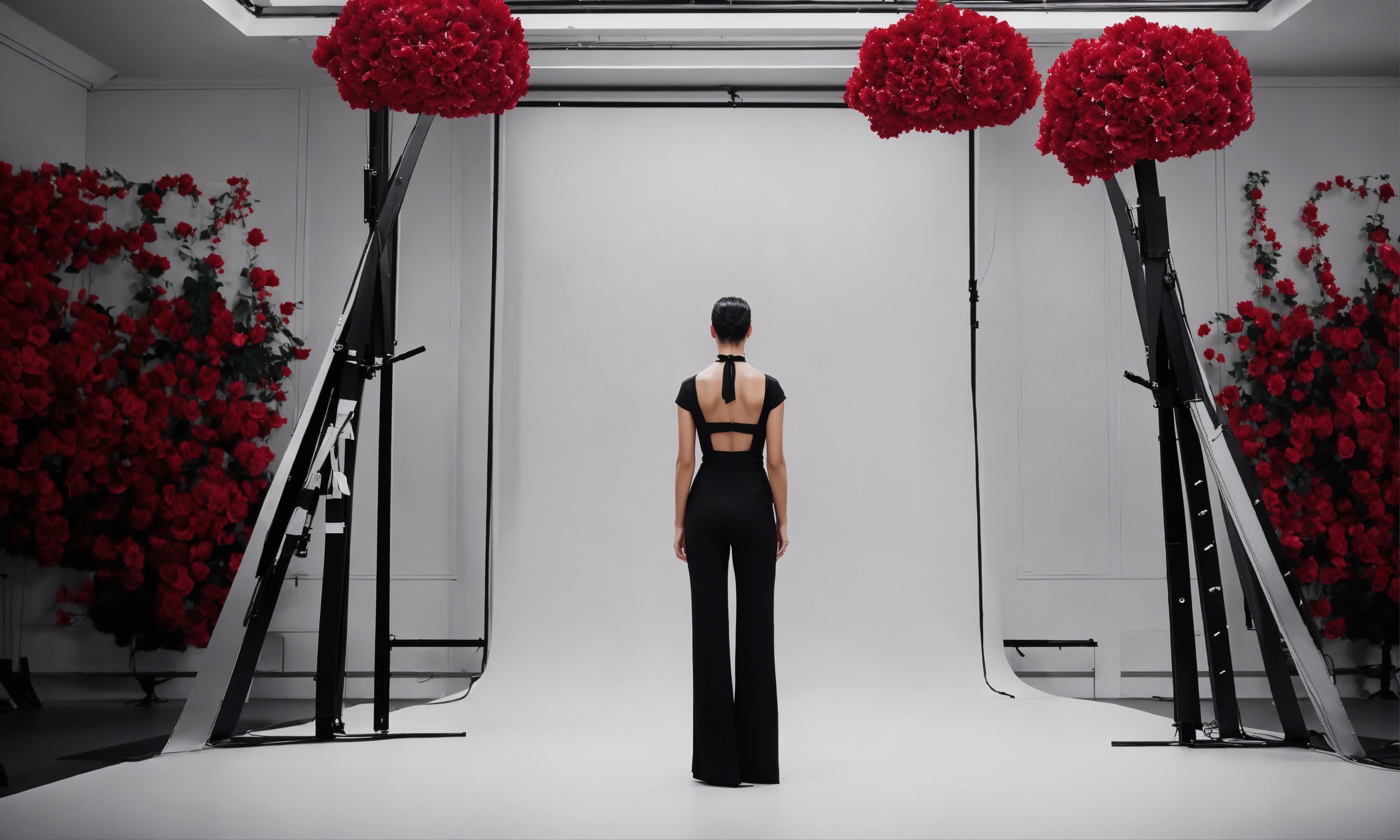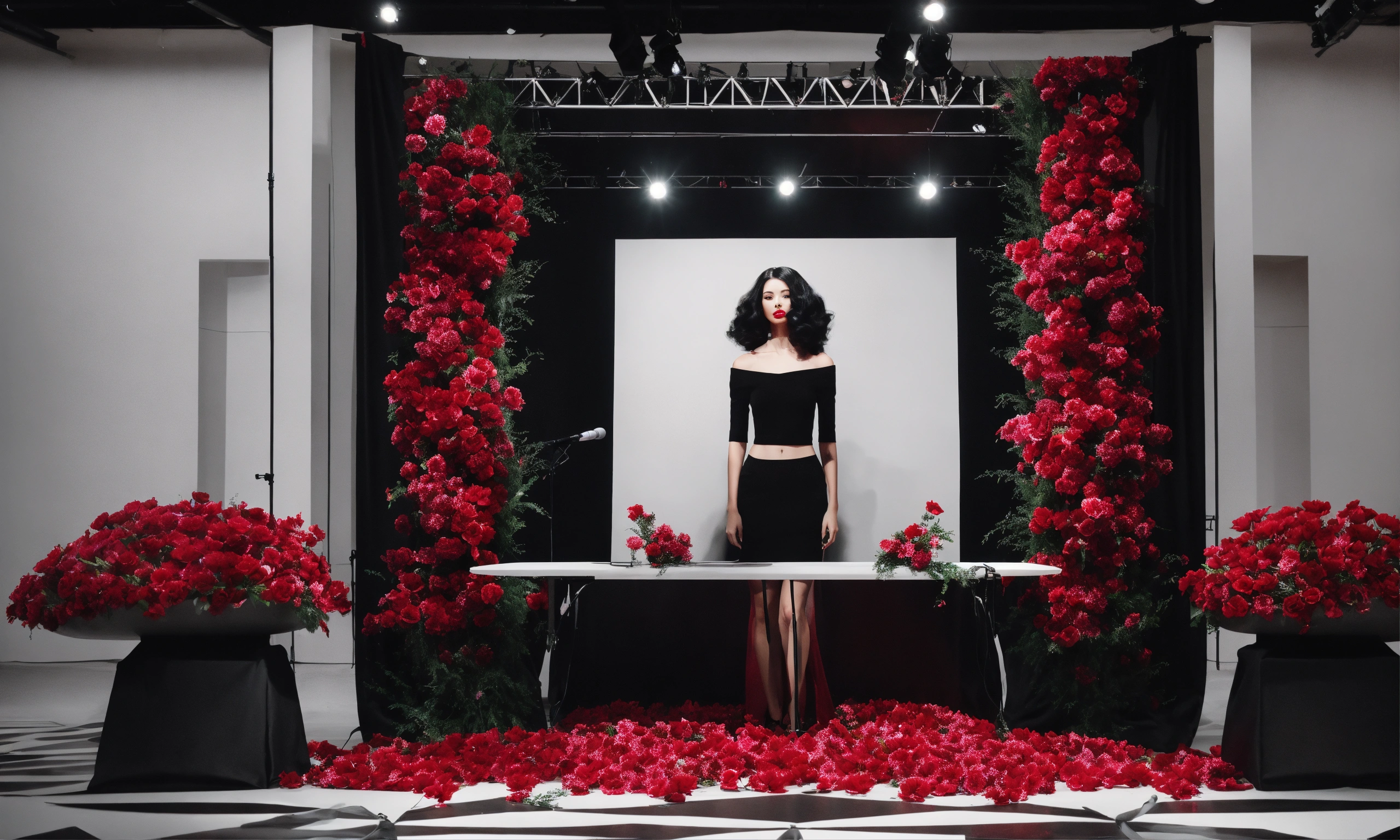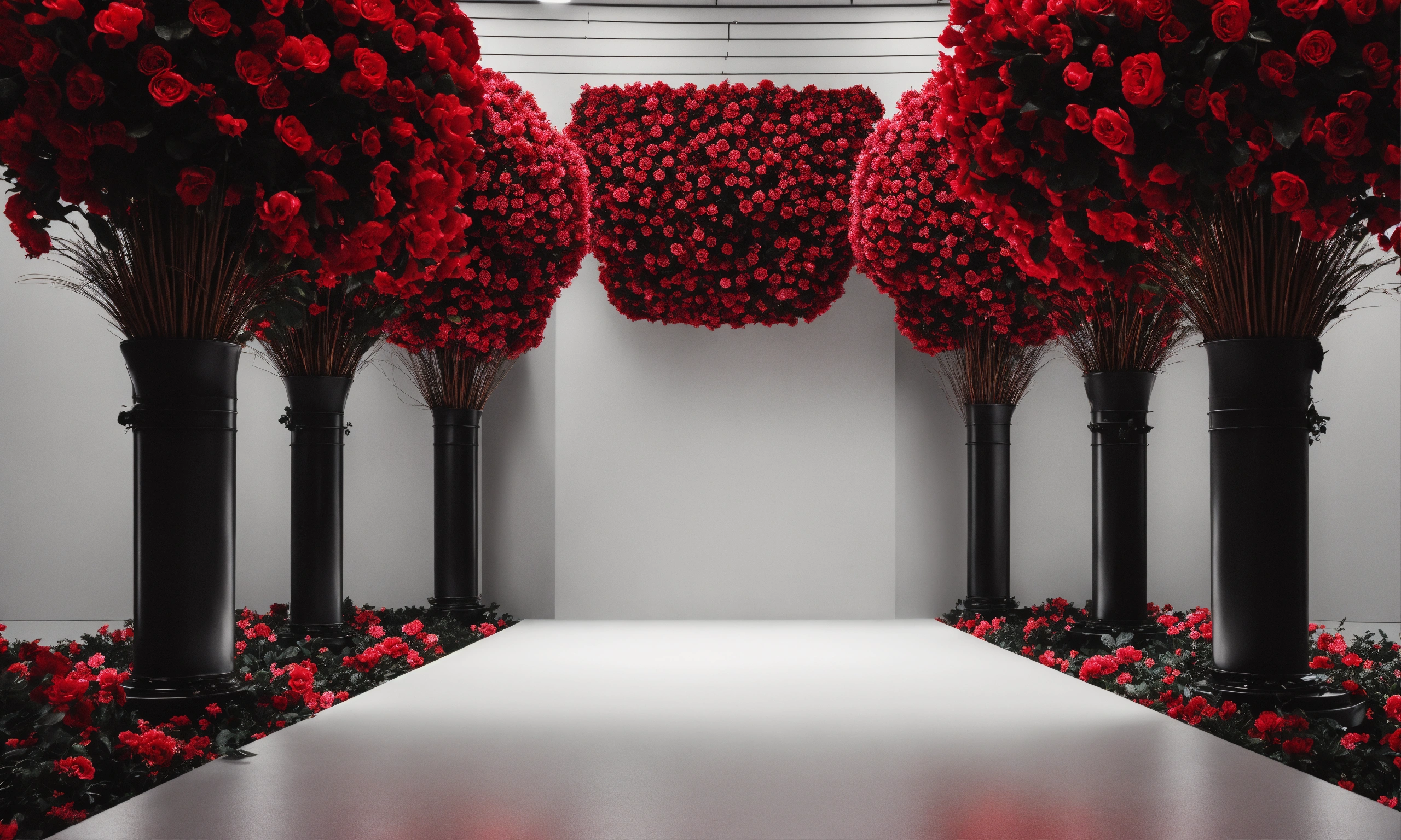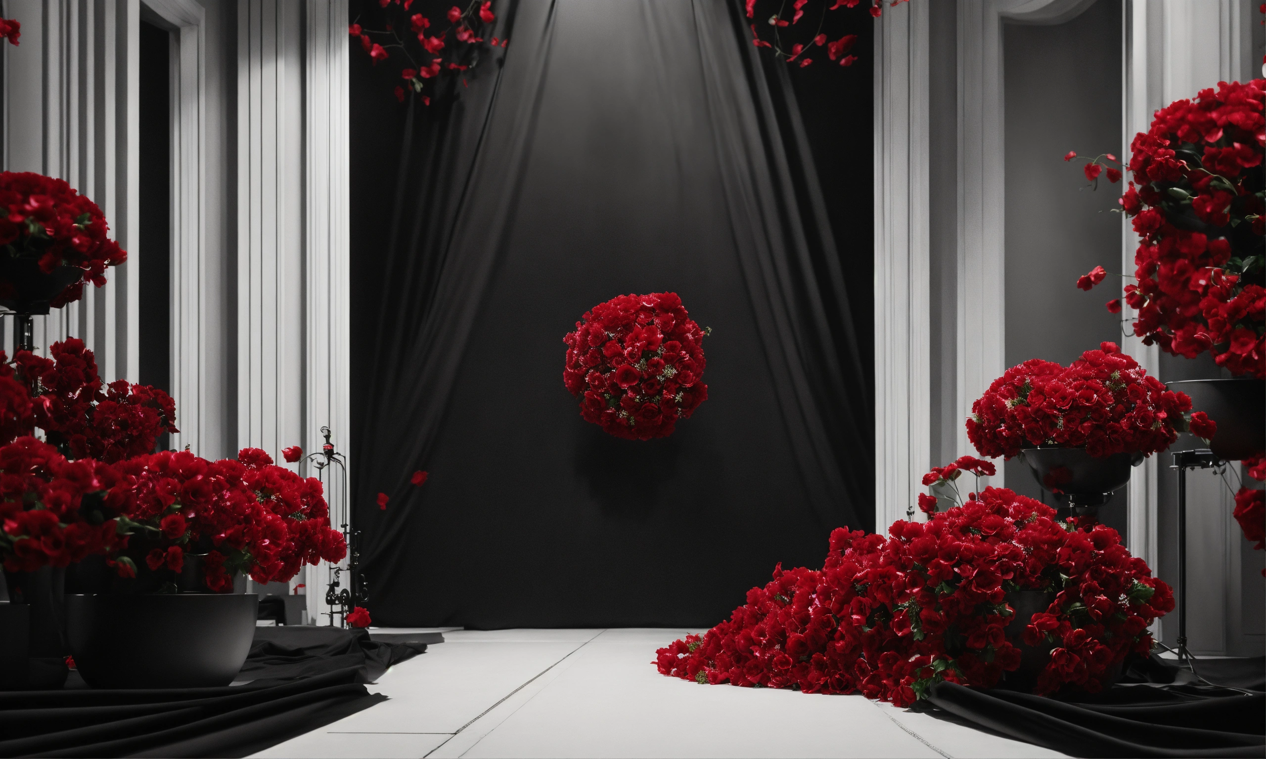 Italian artistic surreal elegance black white minimalism video backdrop with red flowers for hairshow