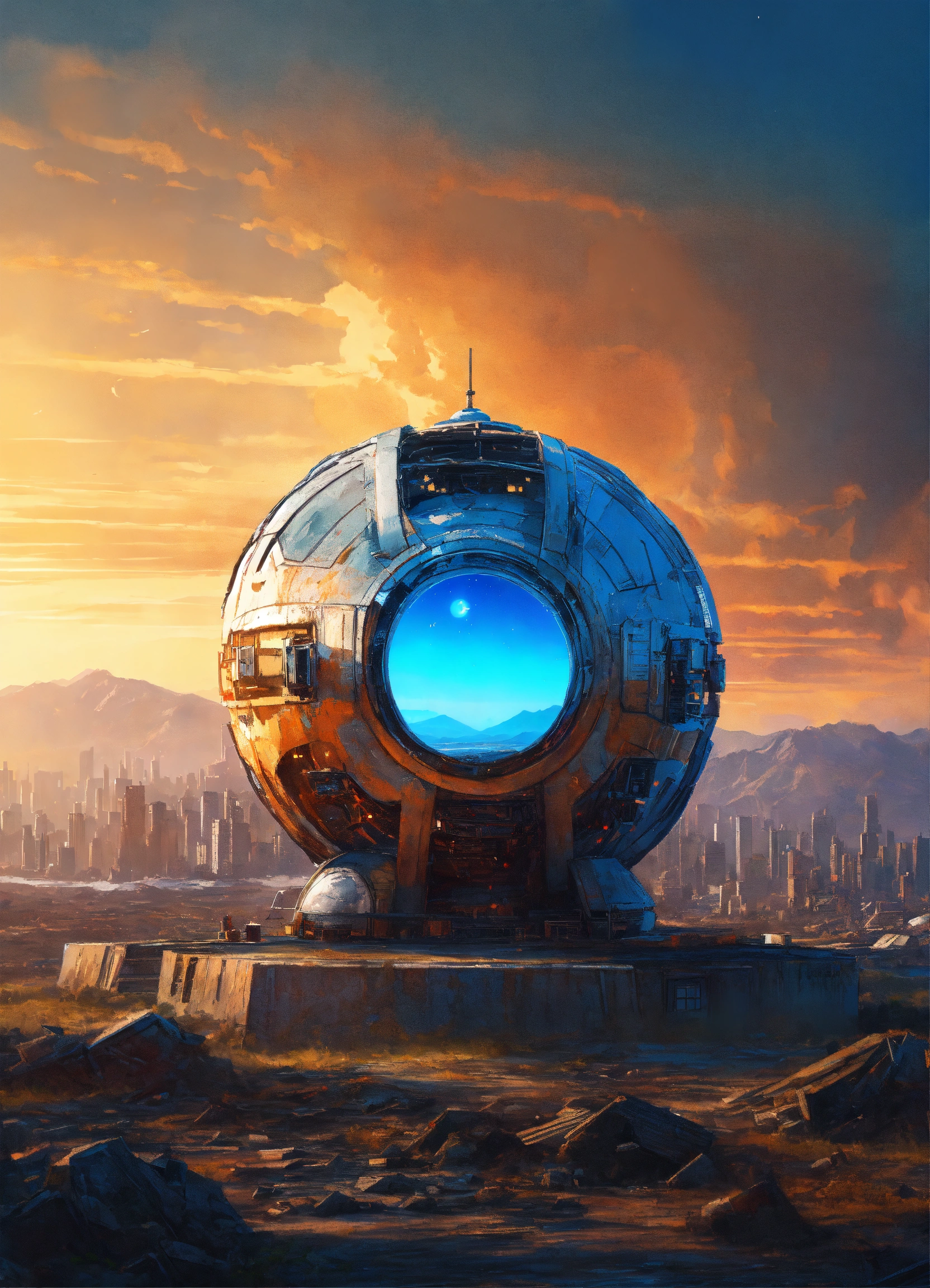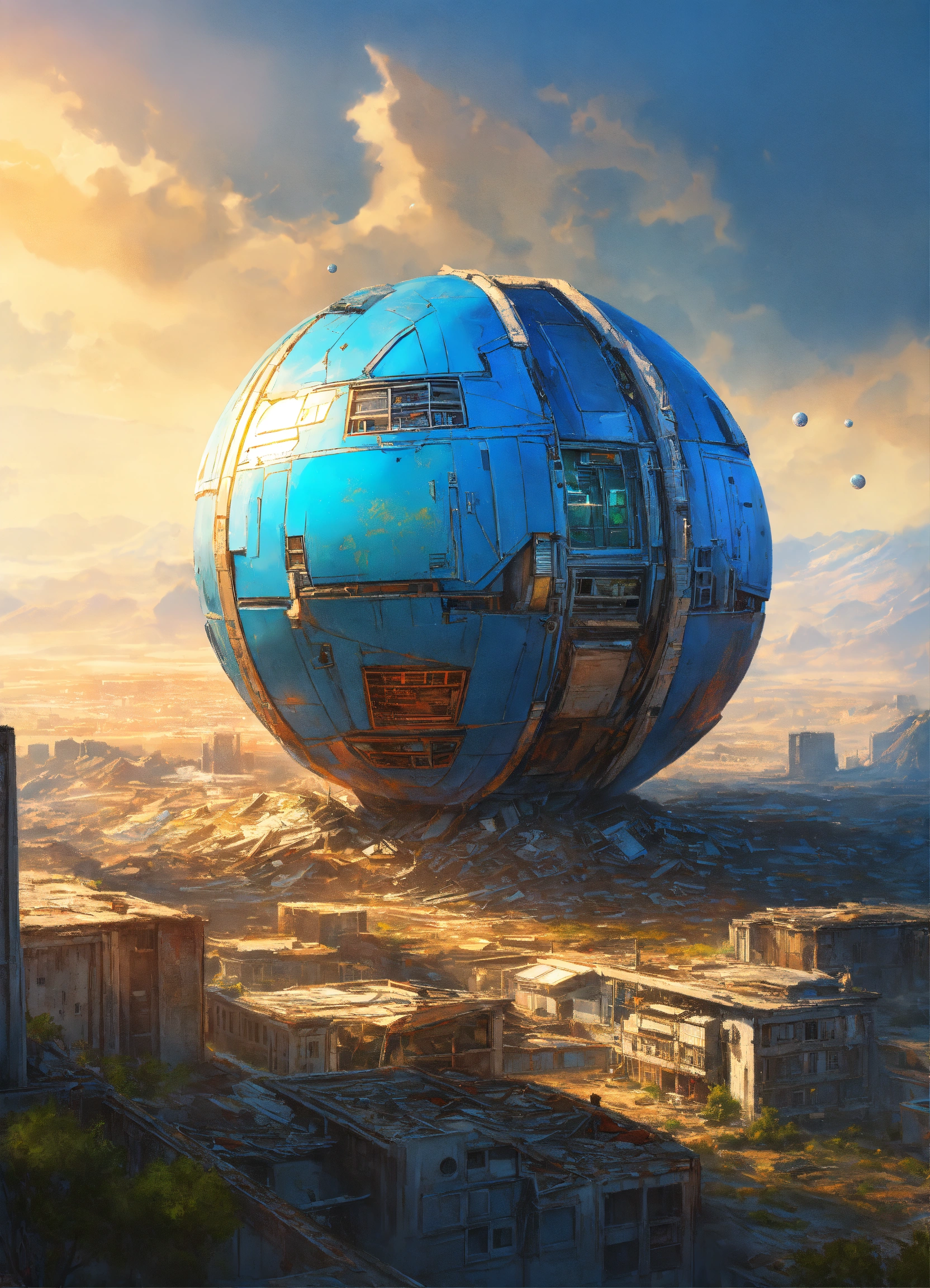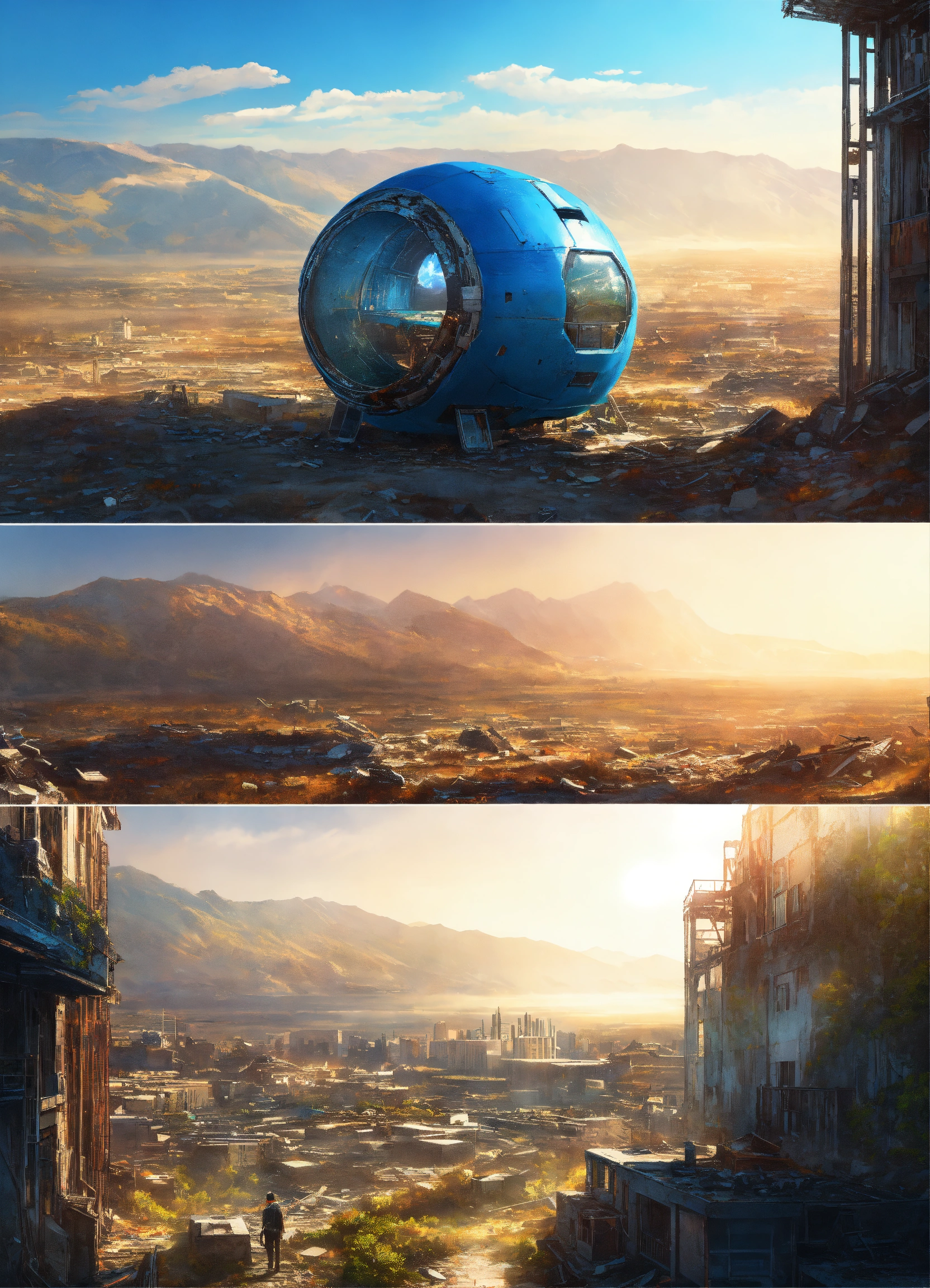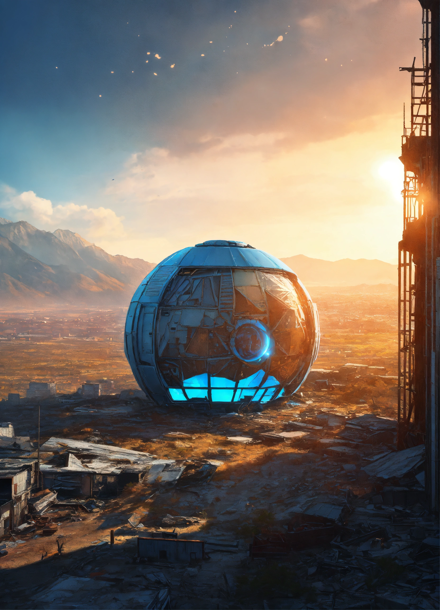 Bright blue sun high above, below point of view the crushed long space escape pod, among abandoned buildings and mountains, the city in the background far far away, high detail, digital painting, high resolution 8k, realistic style