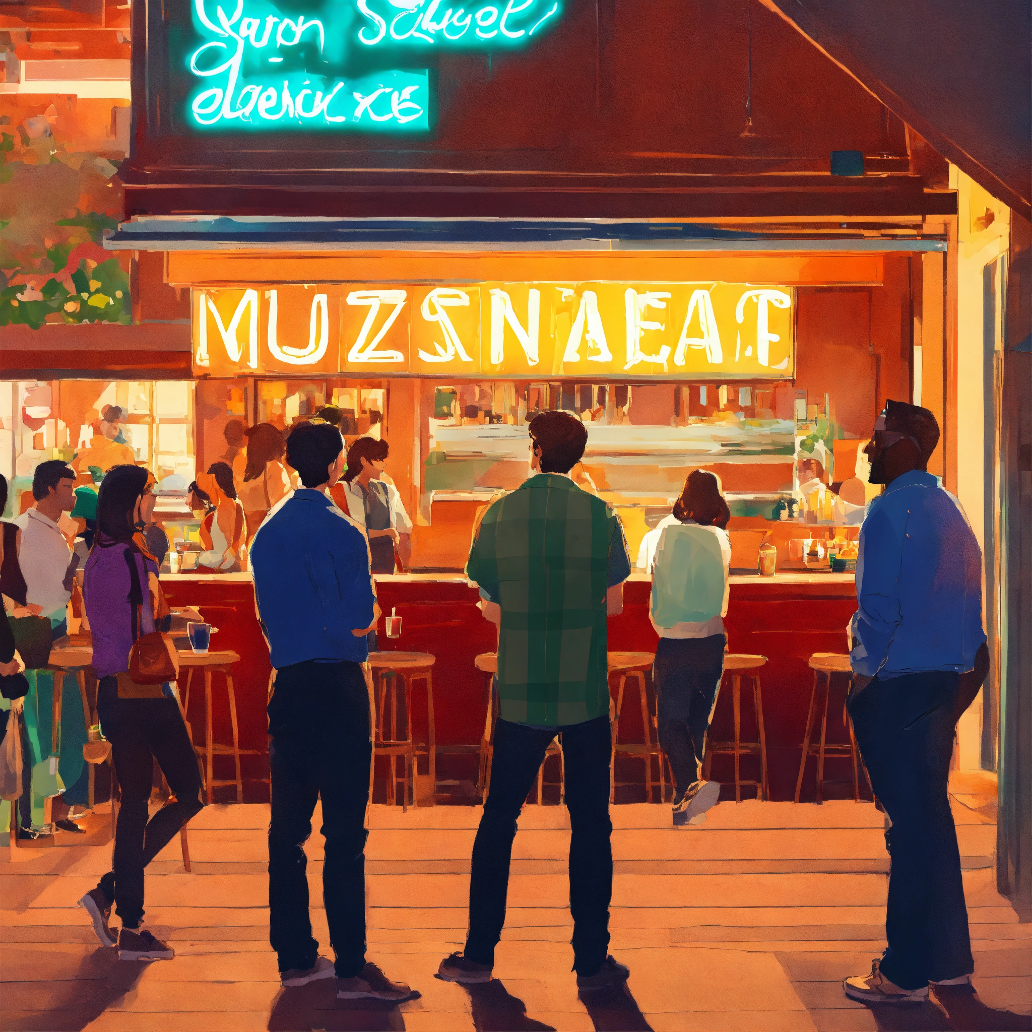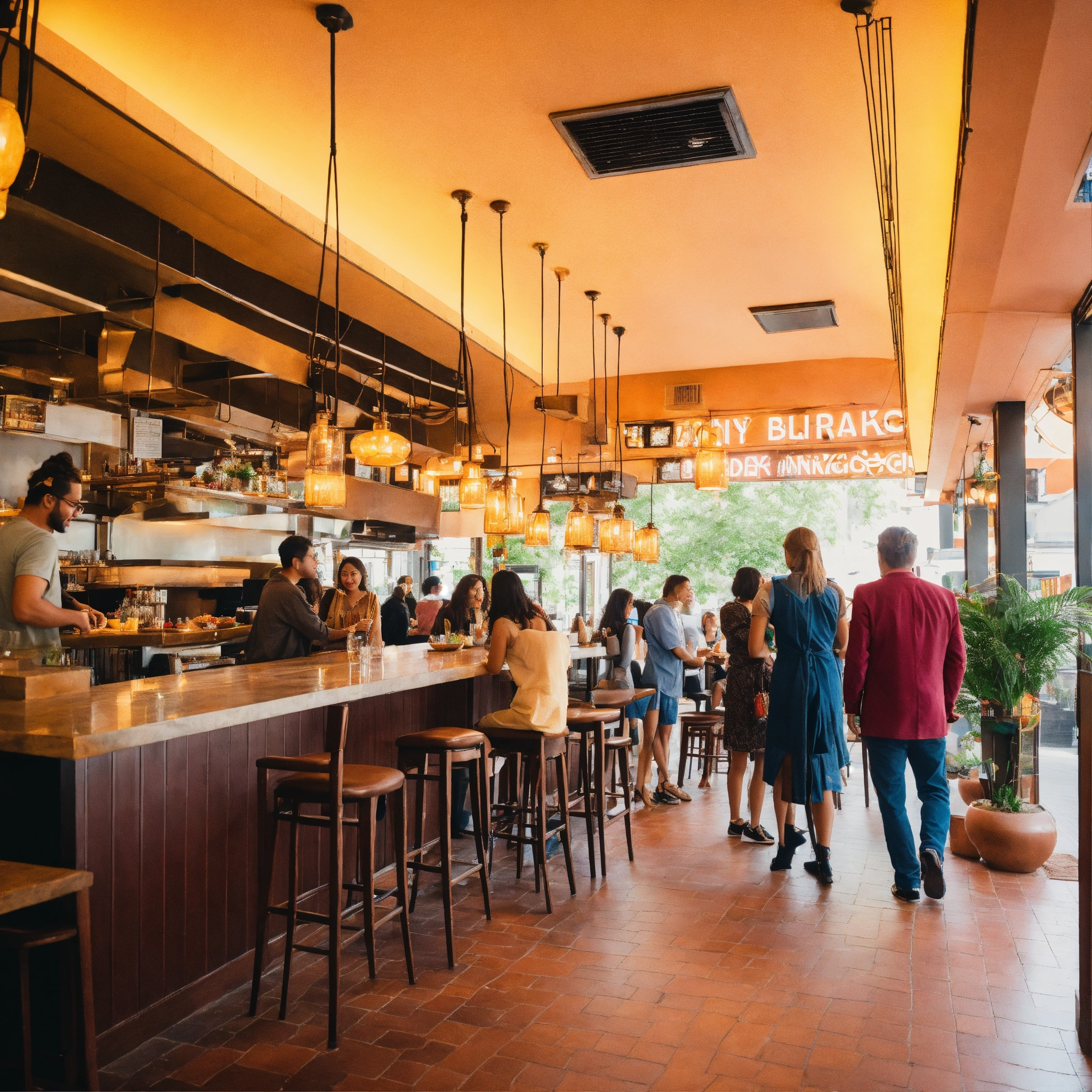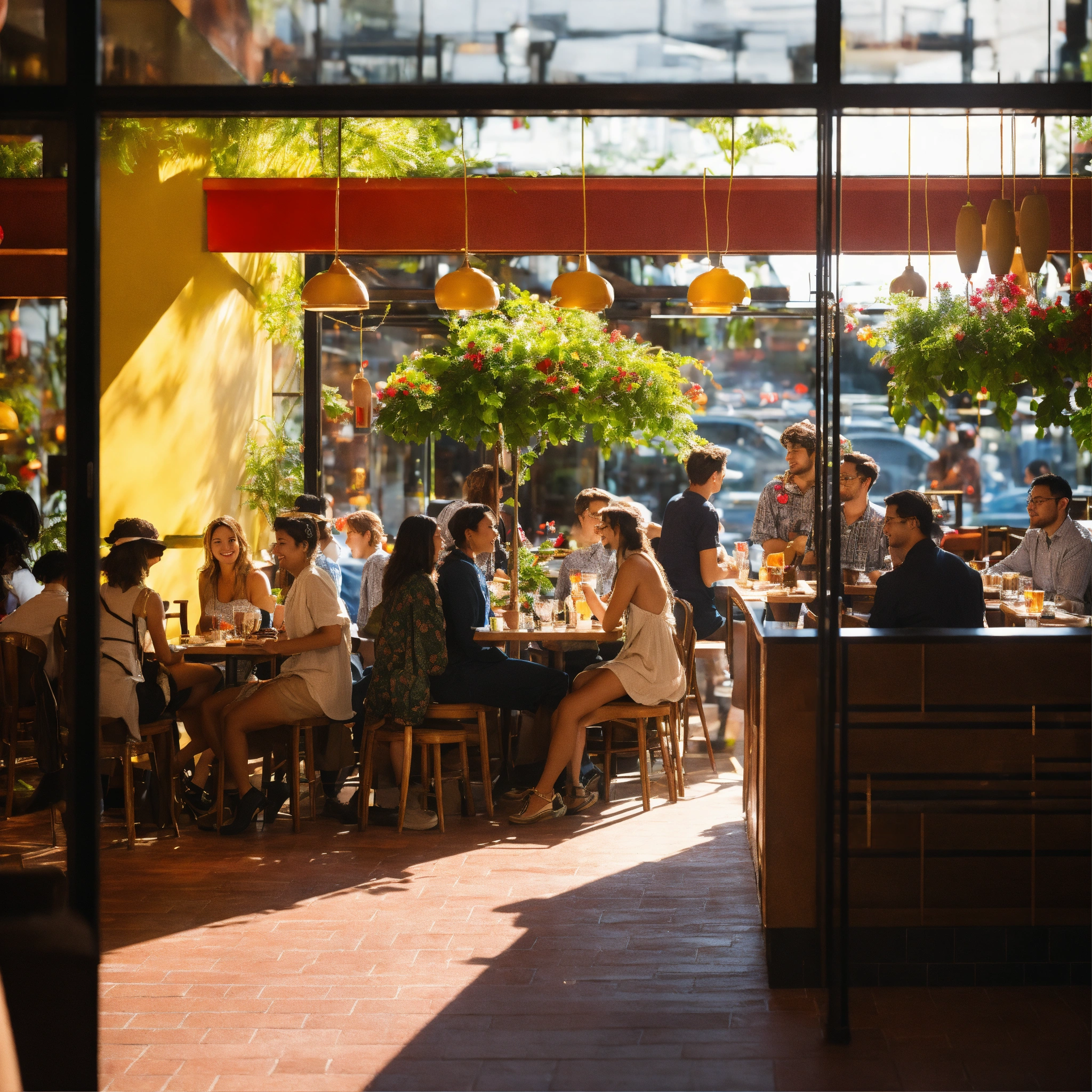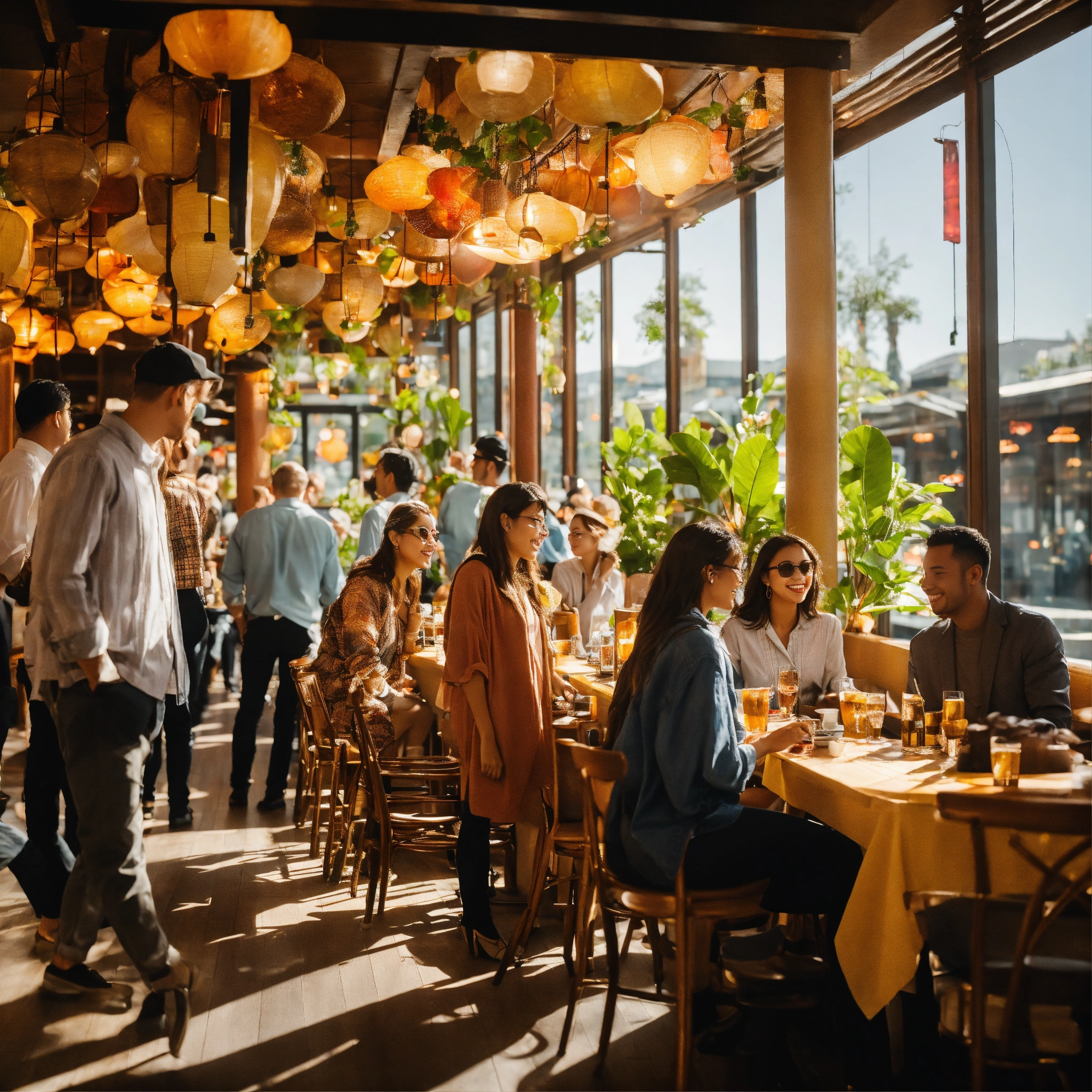 A group of casually dressed people standing mingling at a brightly lit restaurant