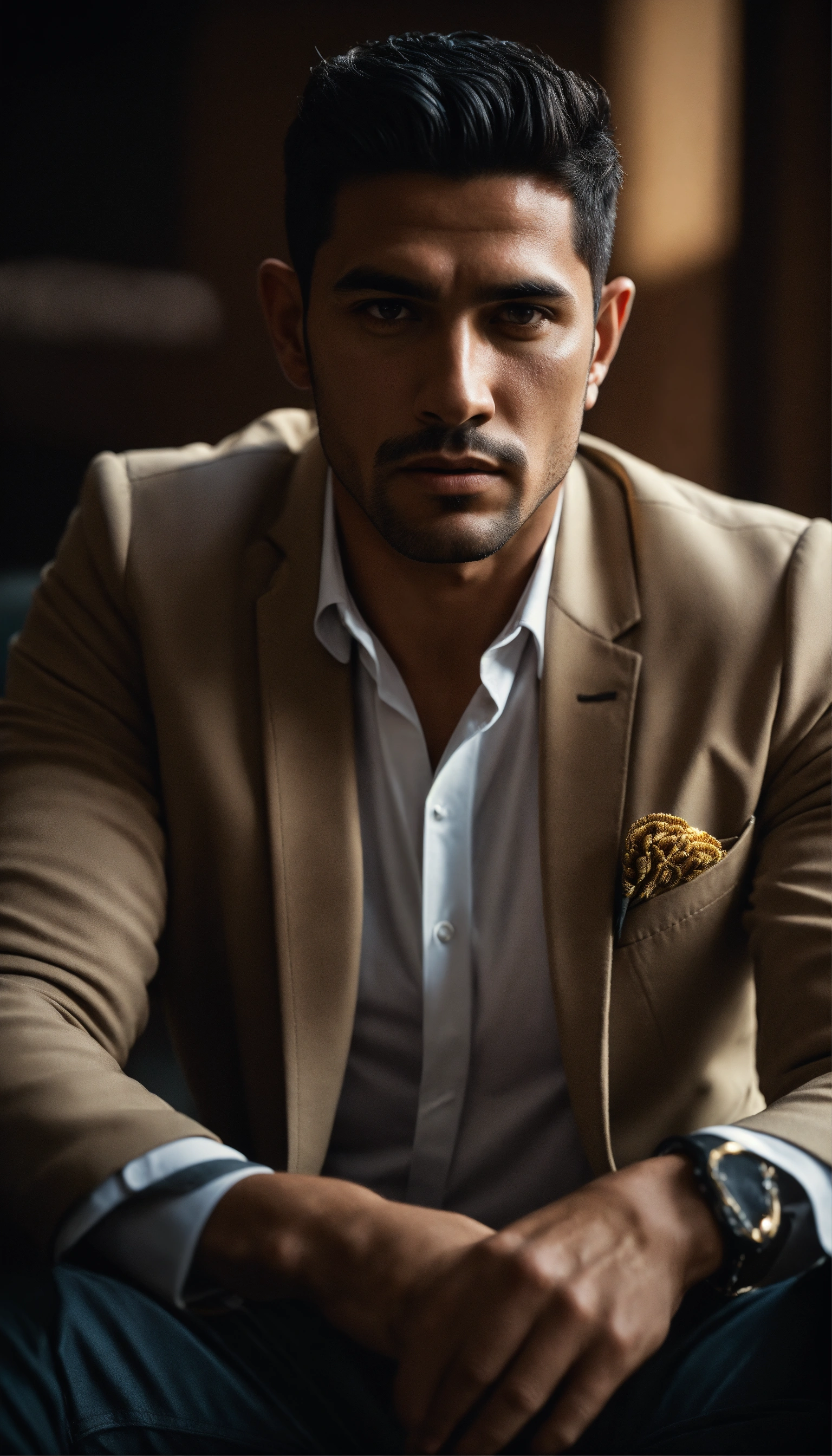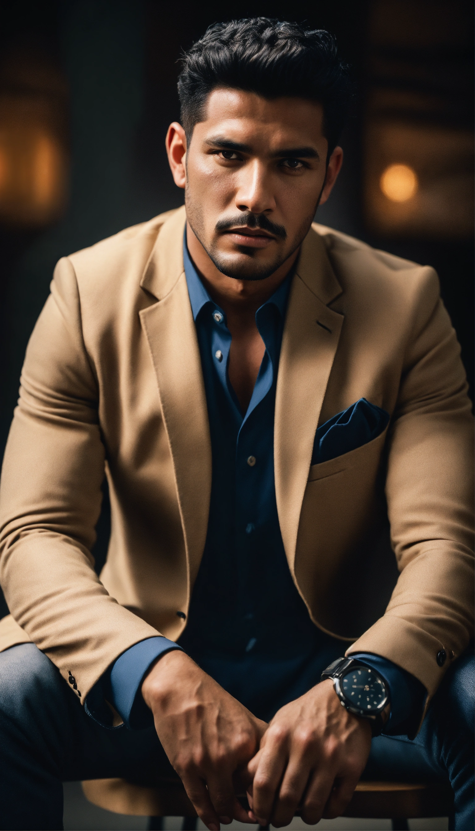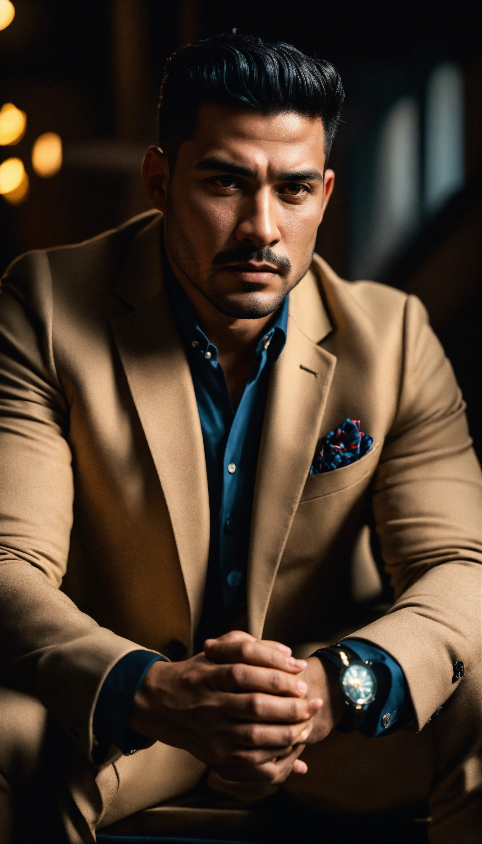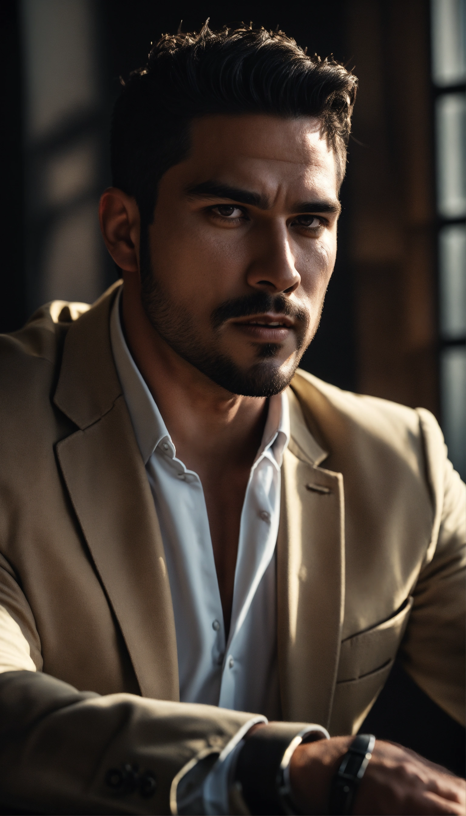 A detailed photograph of a confident looking latino, sitting, hands relaxed, square jaws, masculine shaved face, wrinkles, buff looking, wearing a light colored blazer, realistic skin texture, black background, sharp focus, front view, waist up shot, high contrast, natural sunlight, action film dark color lut, cinematic luts, 8k