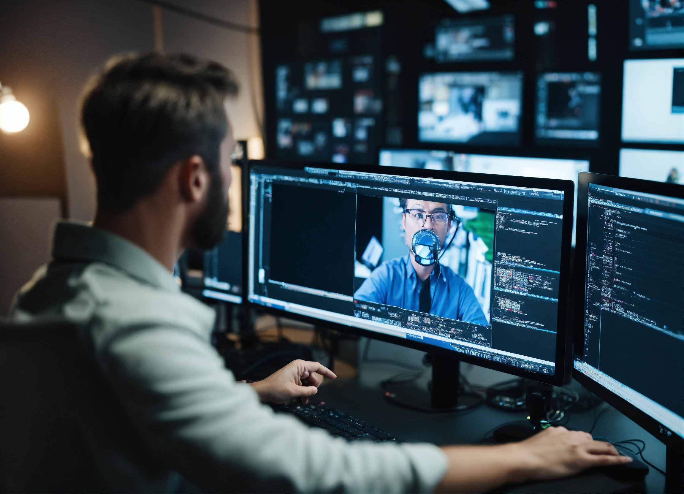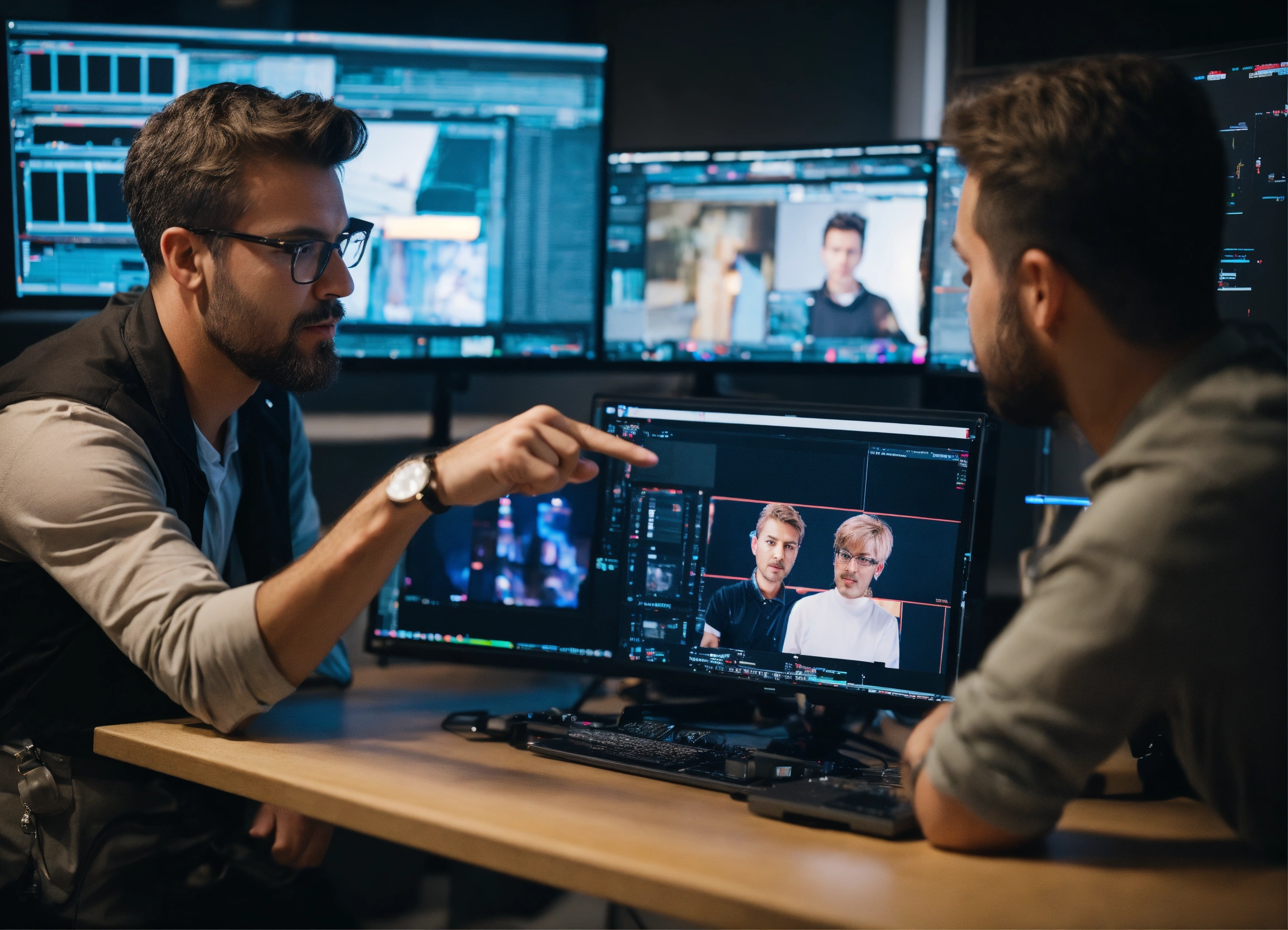 Photo director in the studio - the director is standing next to the editor, pointing his fingers at the computer screen and saying something. the screen shows that the video is being edited. realistic. soft focus. clear beautiful facial features. 3d. full frame.