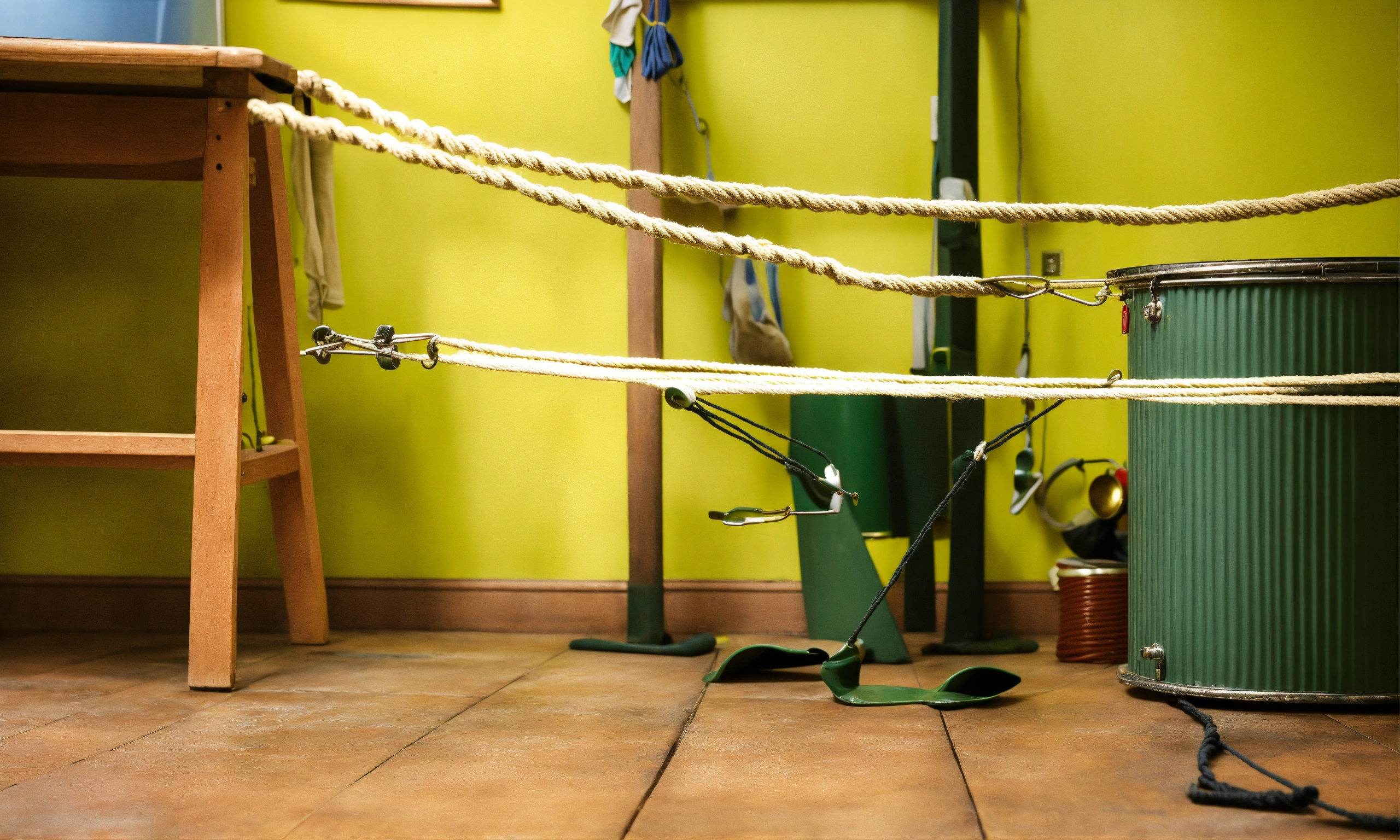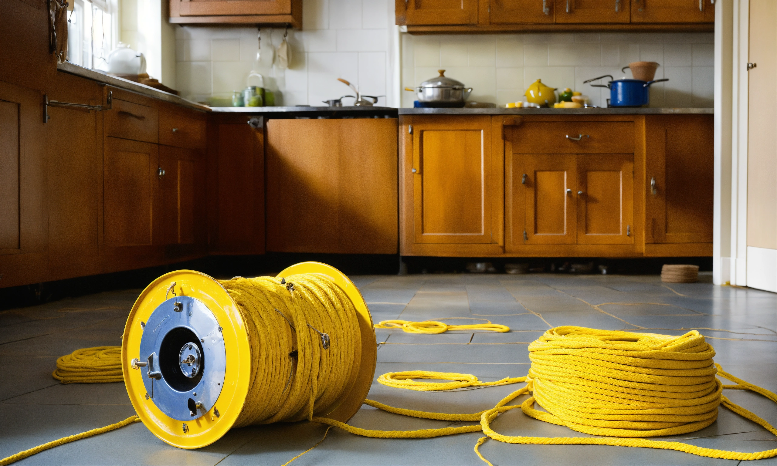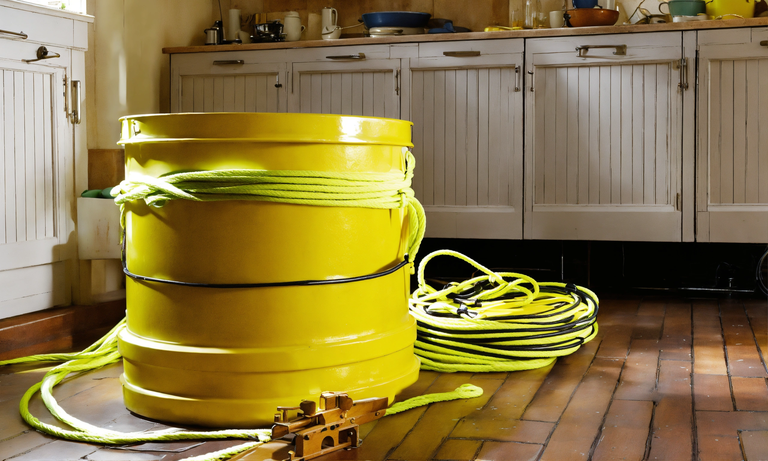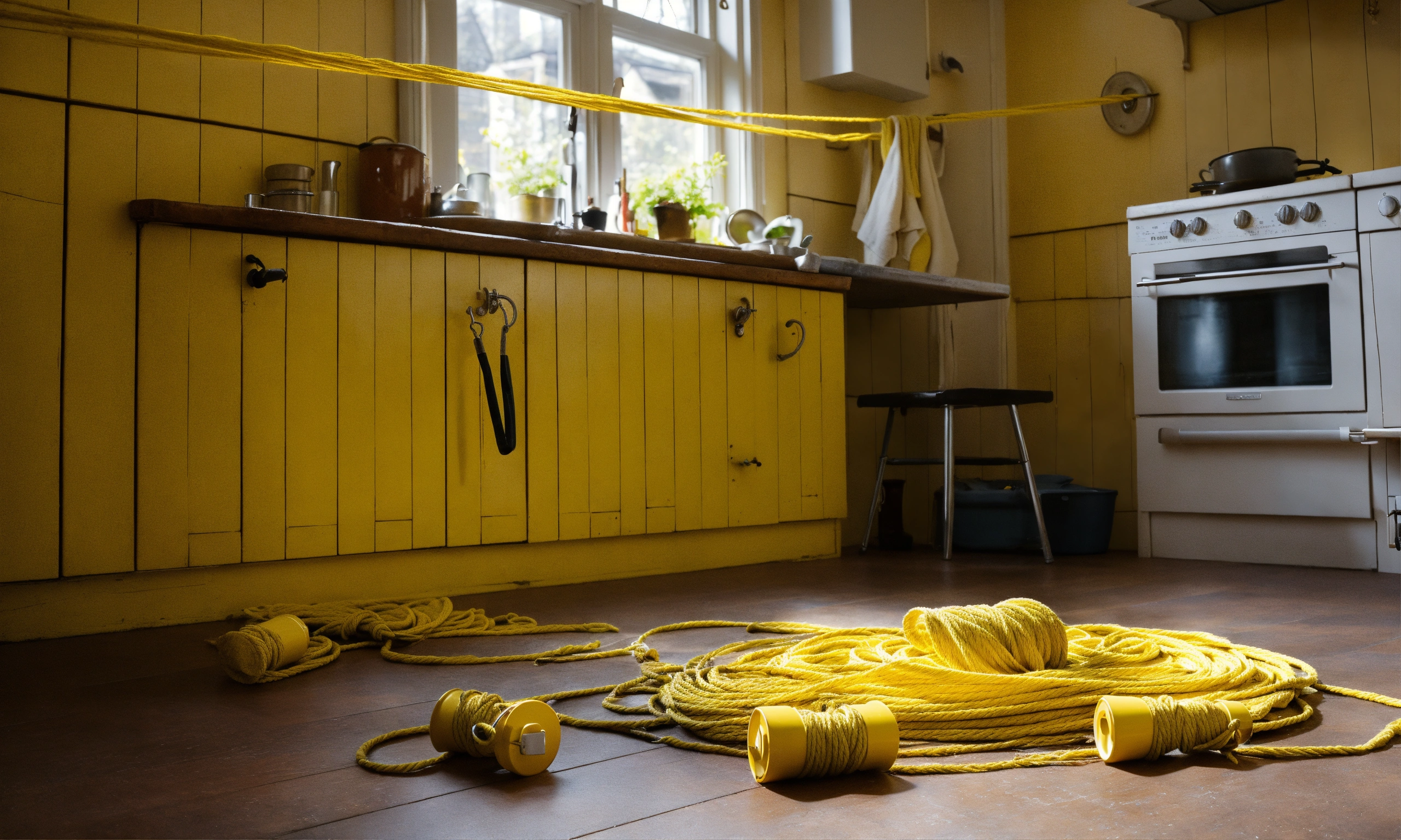 Parts of a yellow drum kit lying on the floor. loose clothesline ropes in the kitchen of a typical old british middle-class home, show the lines of the hanging clothesline ropes, floor of a typical middle-class british kitchen in manchester.