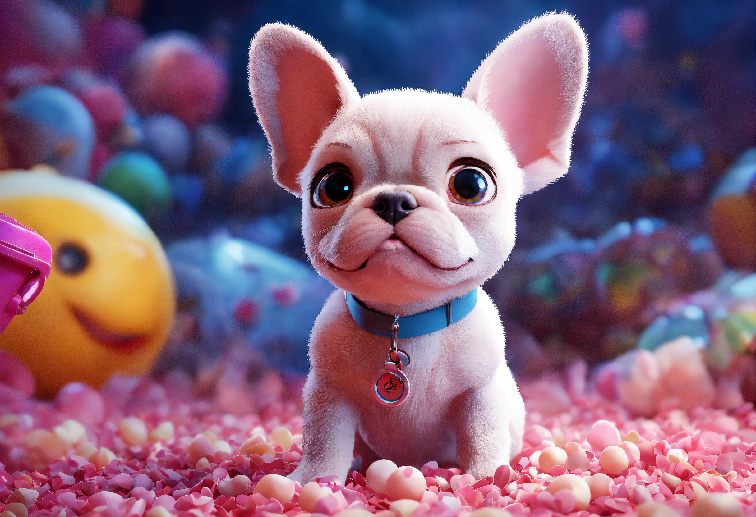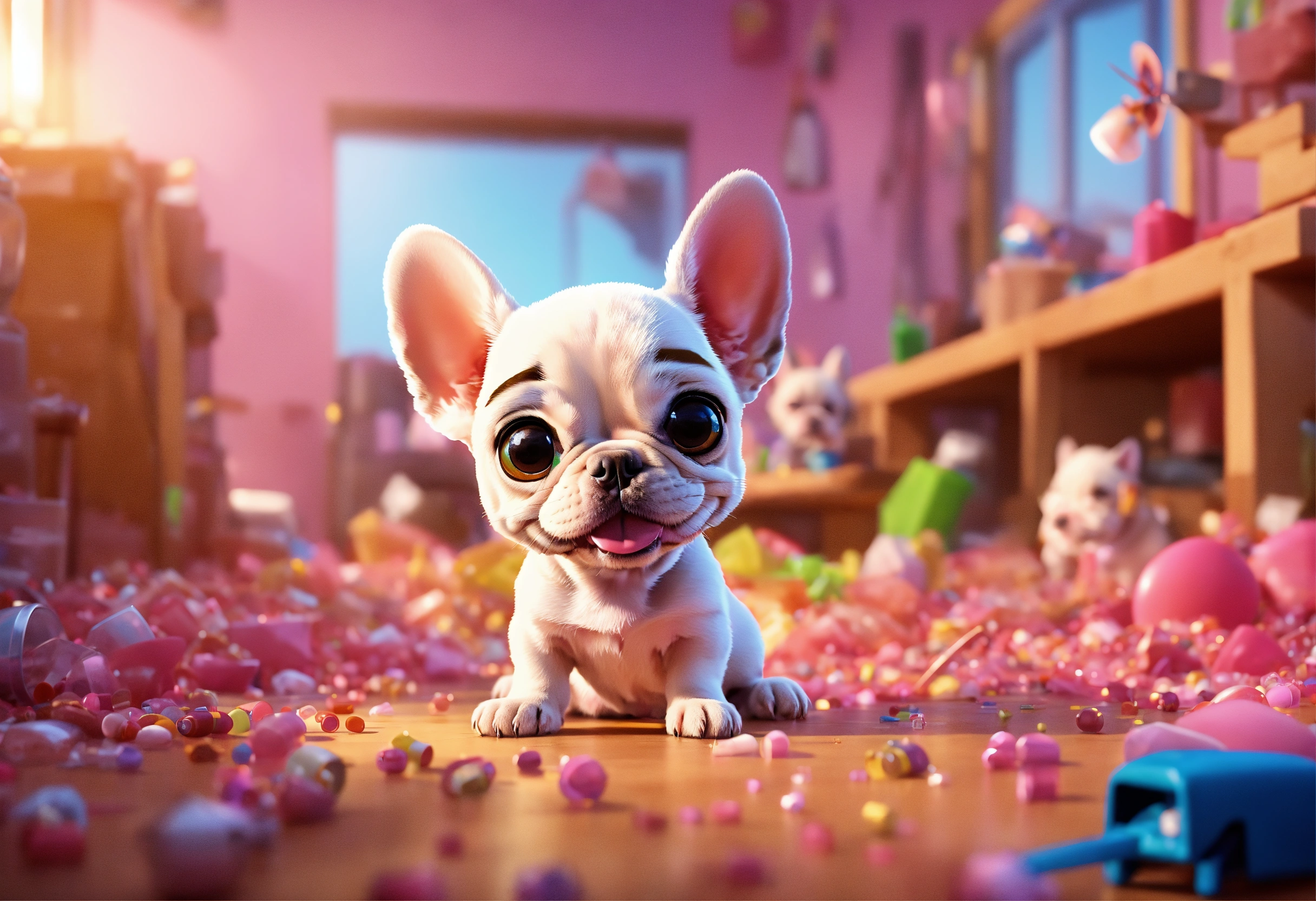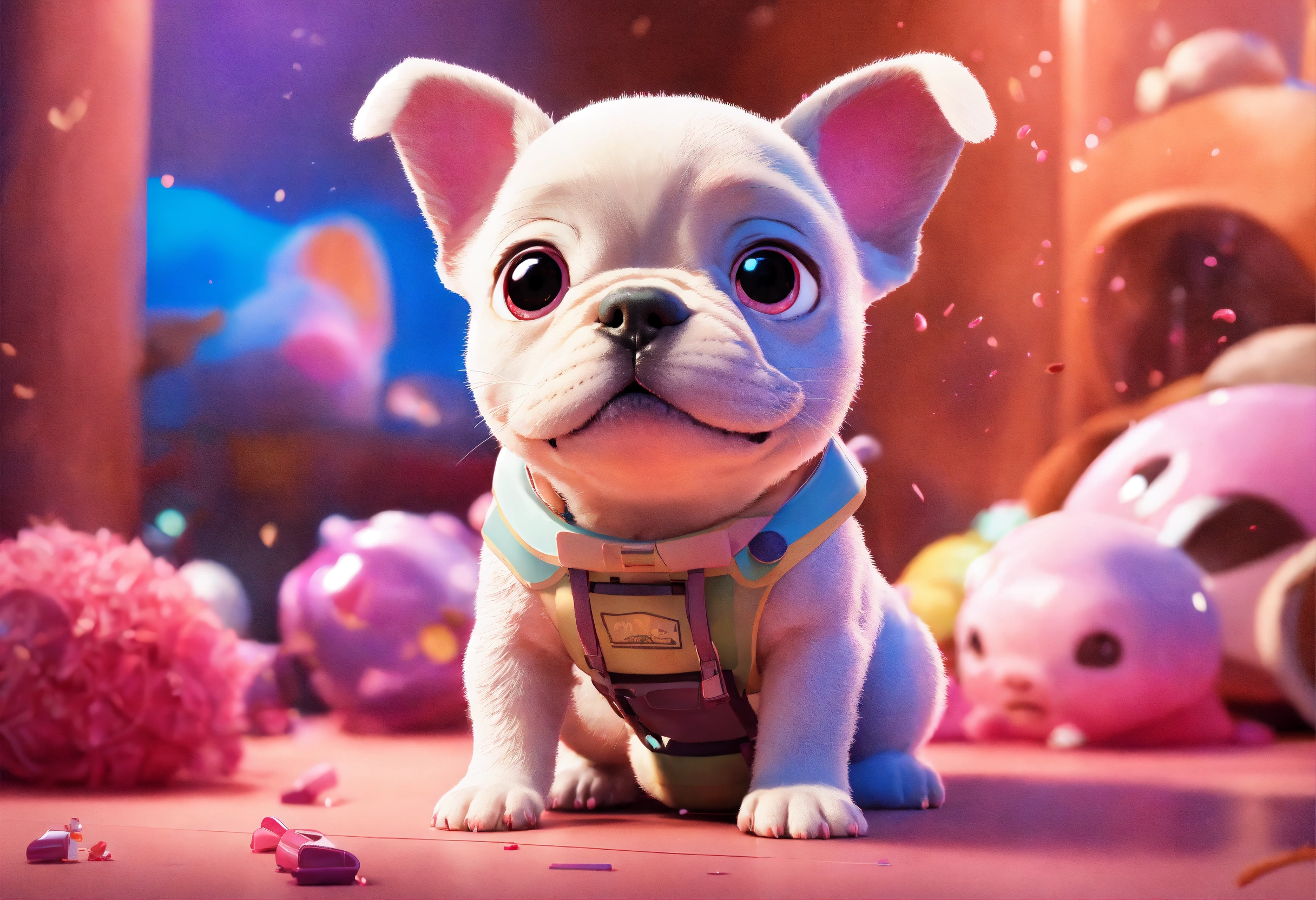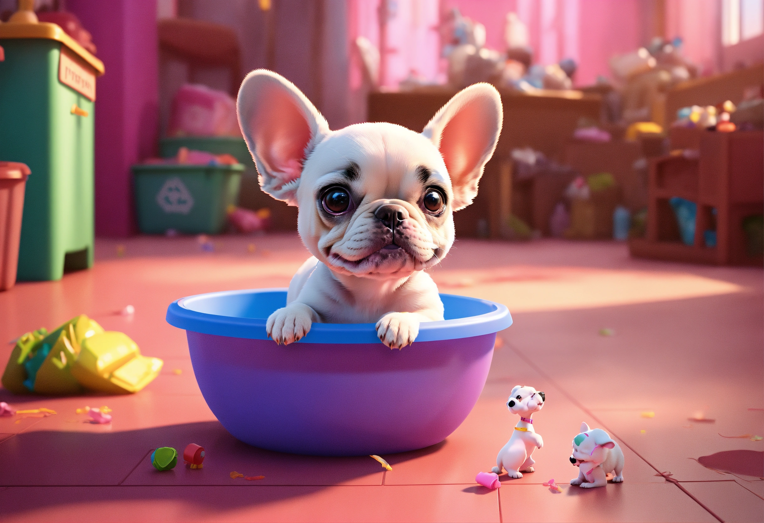 A disney pixar inspired movie poster 3d render, cinematic with a baby white french bulldog puppy with brown eyes, recycling plastic waste. with pink hues. the scene should be in pixar's digital art style, emphasizing the characters expressions, bright colours, and detailed characteristics of their animations. no text.