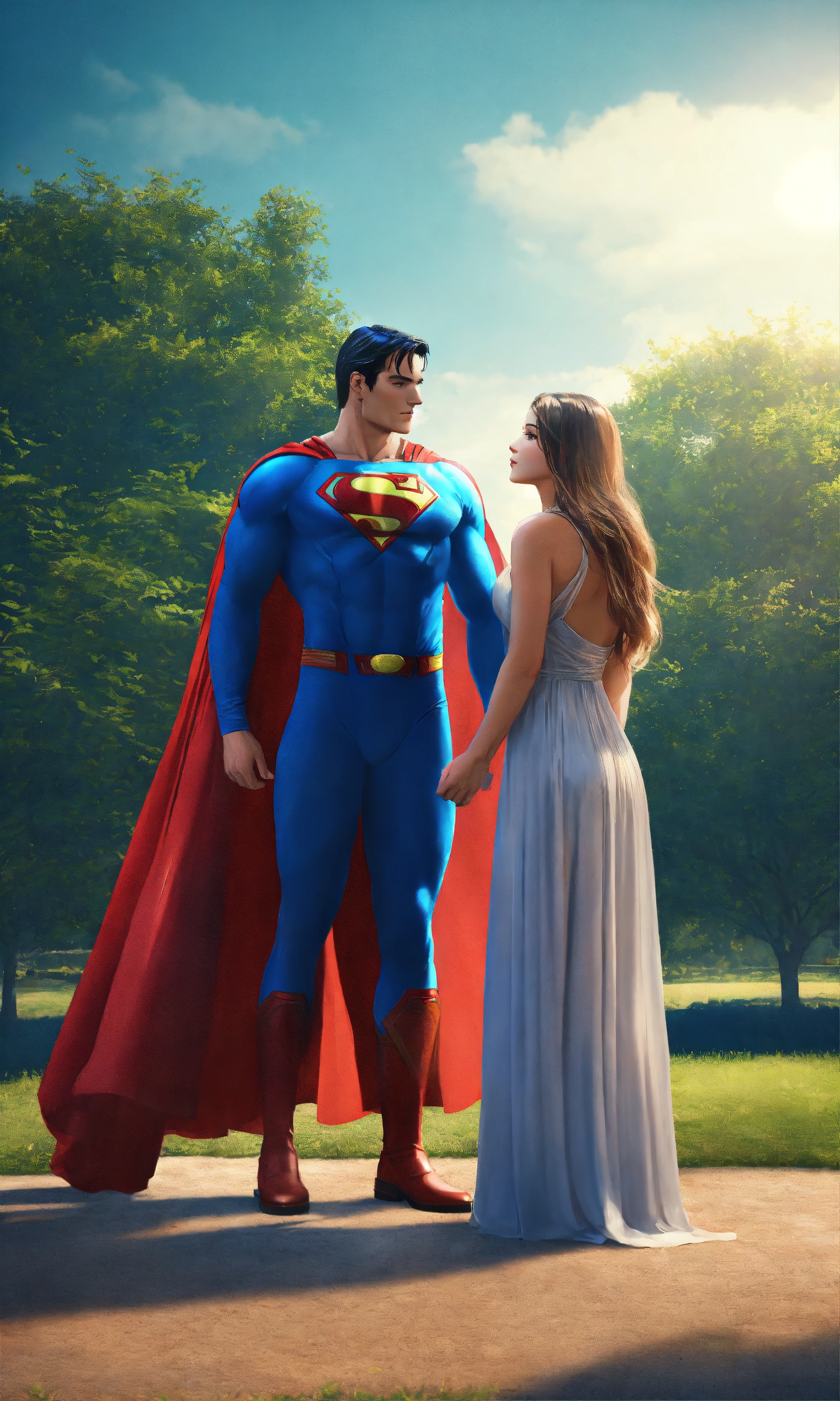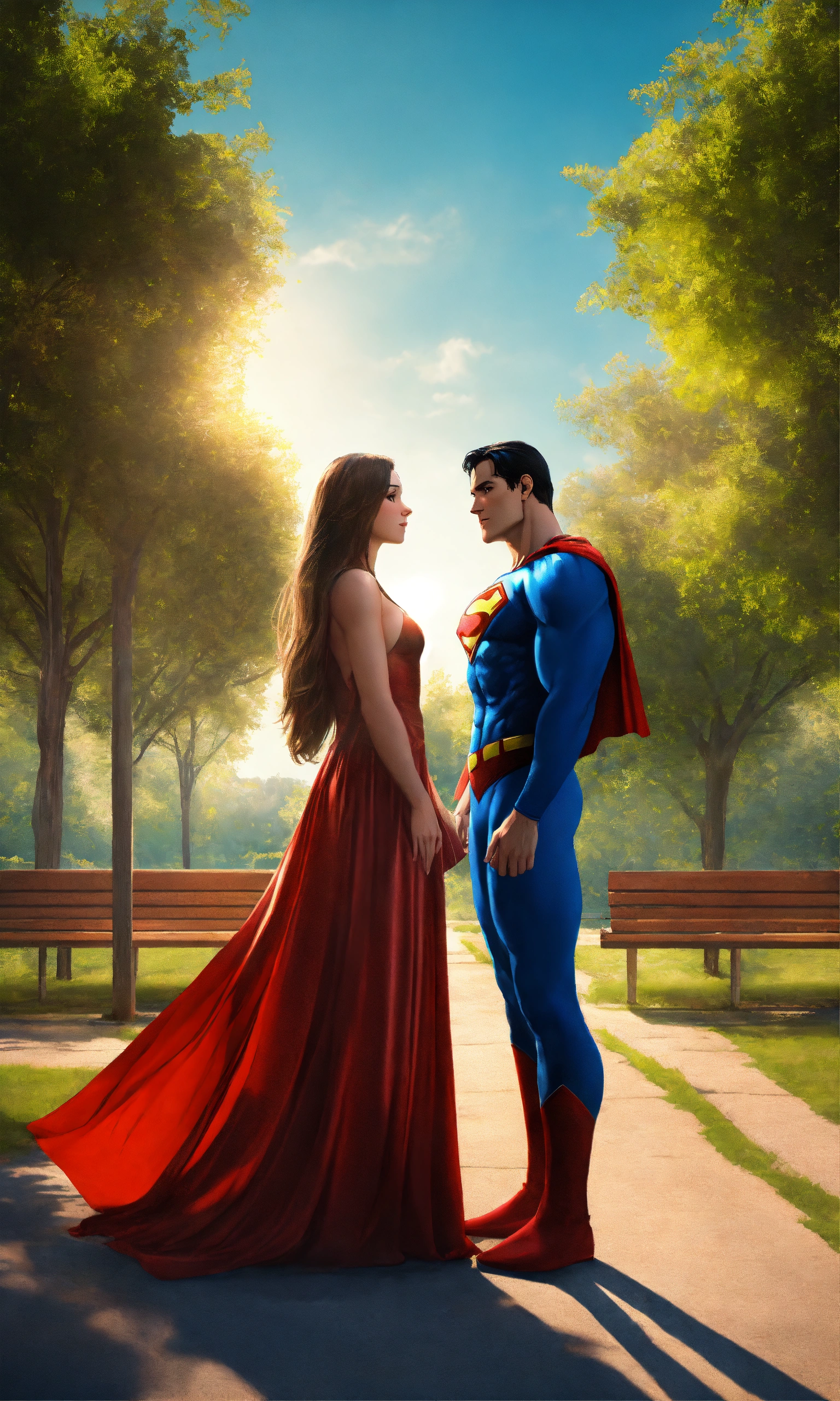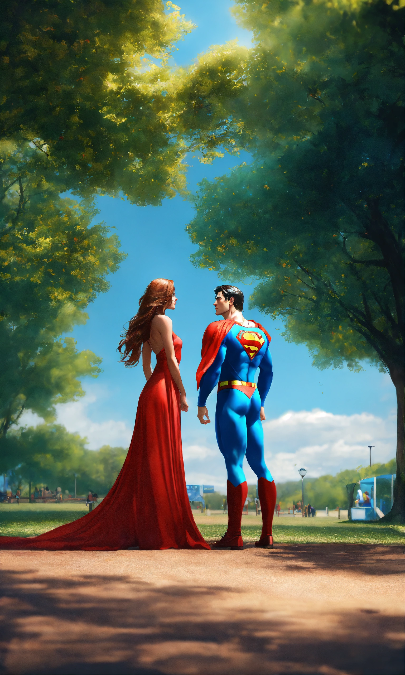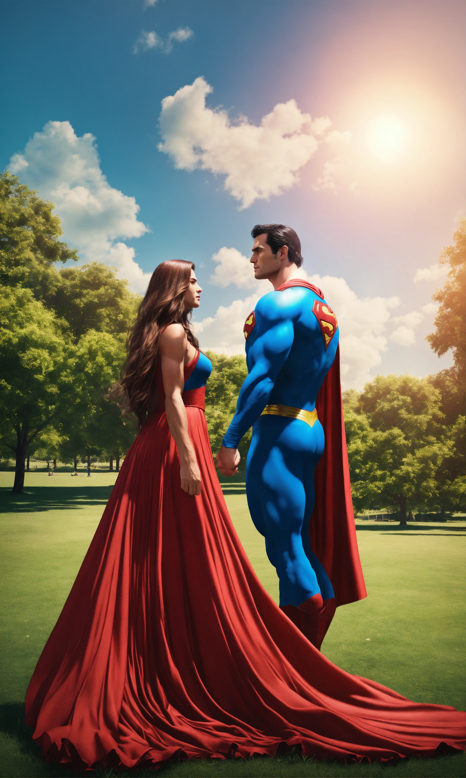 Superman with his hot girlfriend with long hair wearing long drees at the park, nature background and blue sky, 2d render, realistic, looking at each other