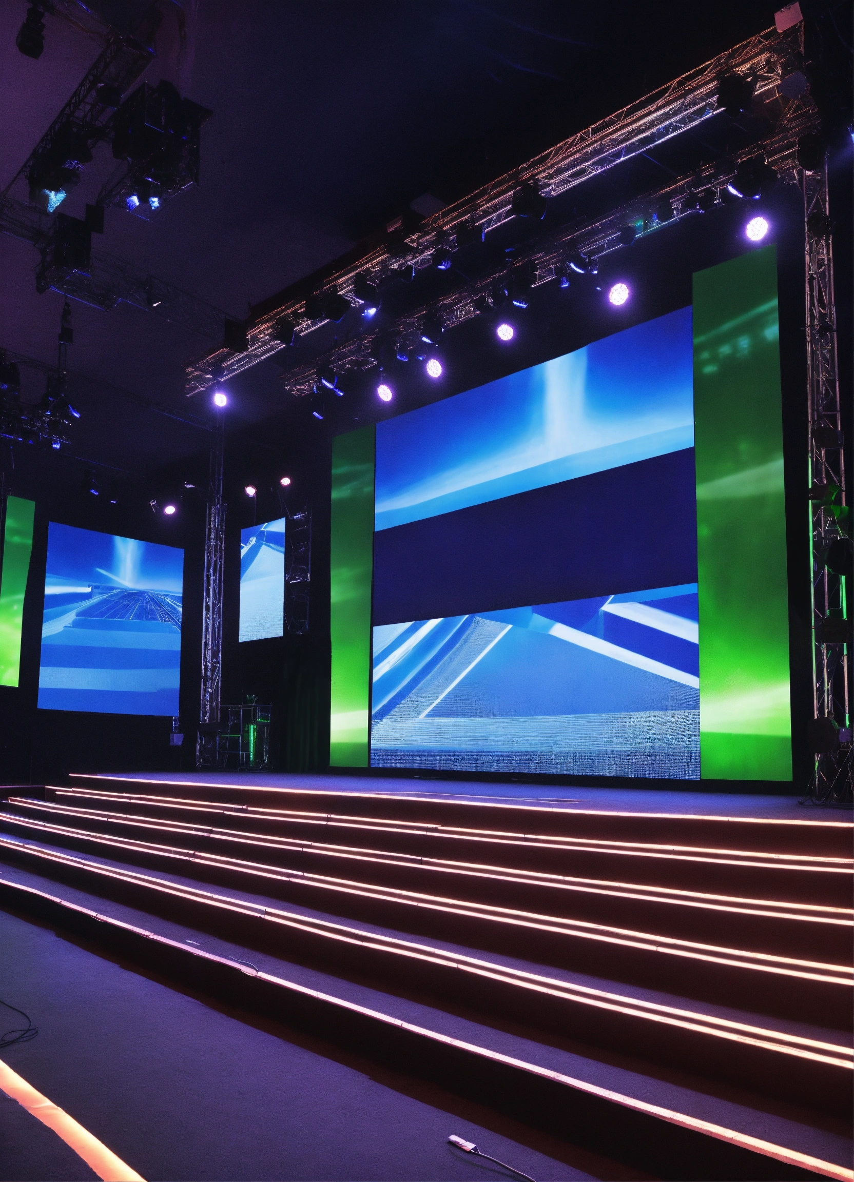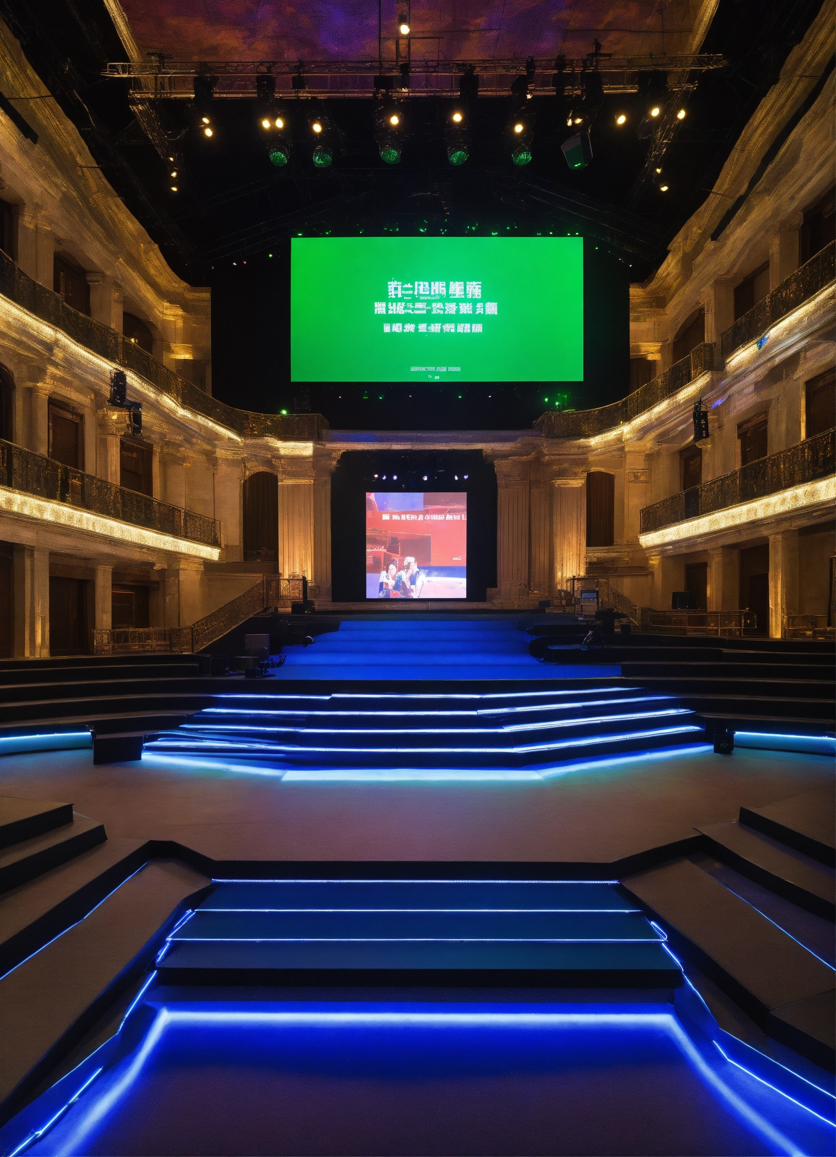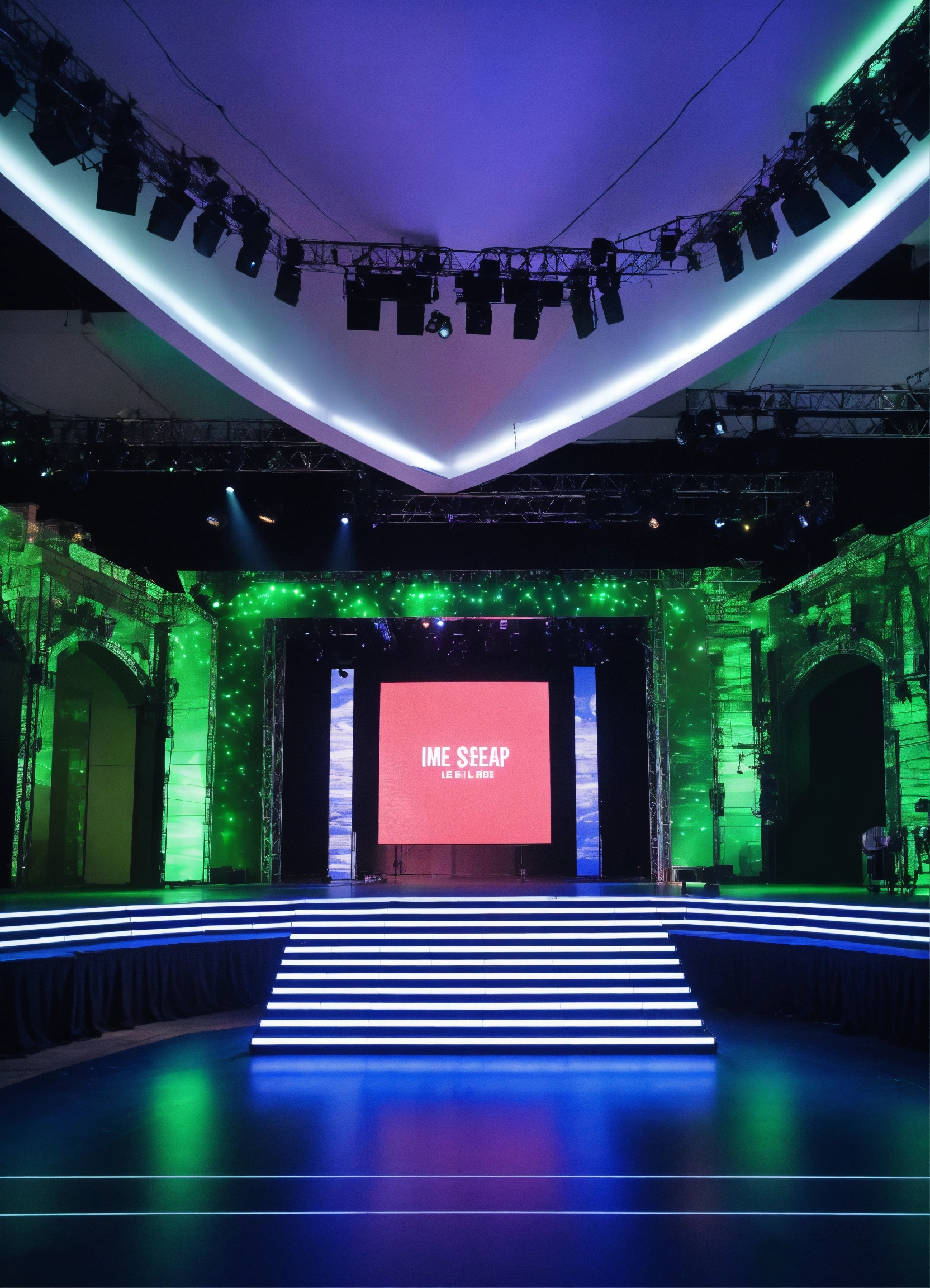 Design a medium size stage with led screen main screen with 2 side vertical led screen for display, add nice glamorous steps to the stage, incorporate the theme to be about raising the bar in the business world, use blue white and green colors