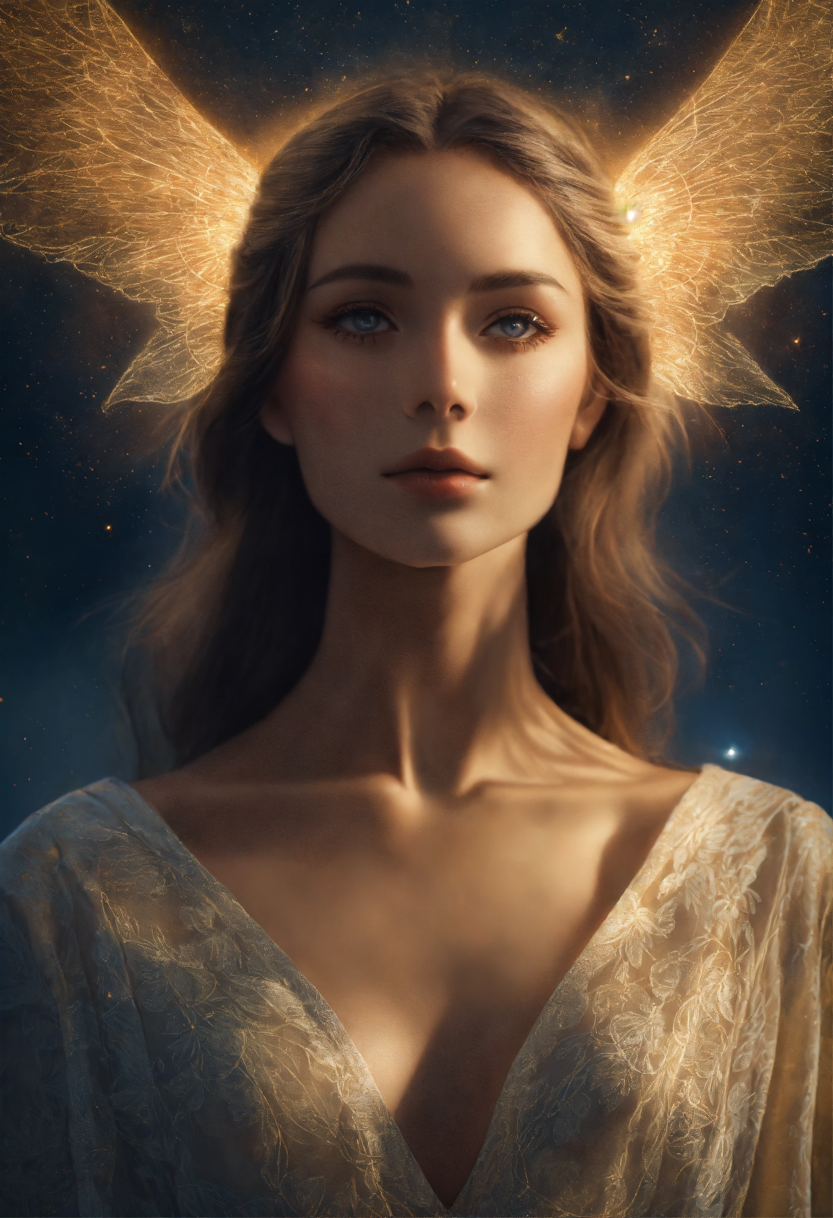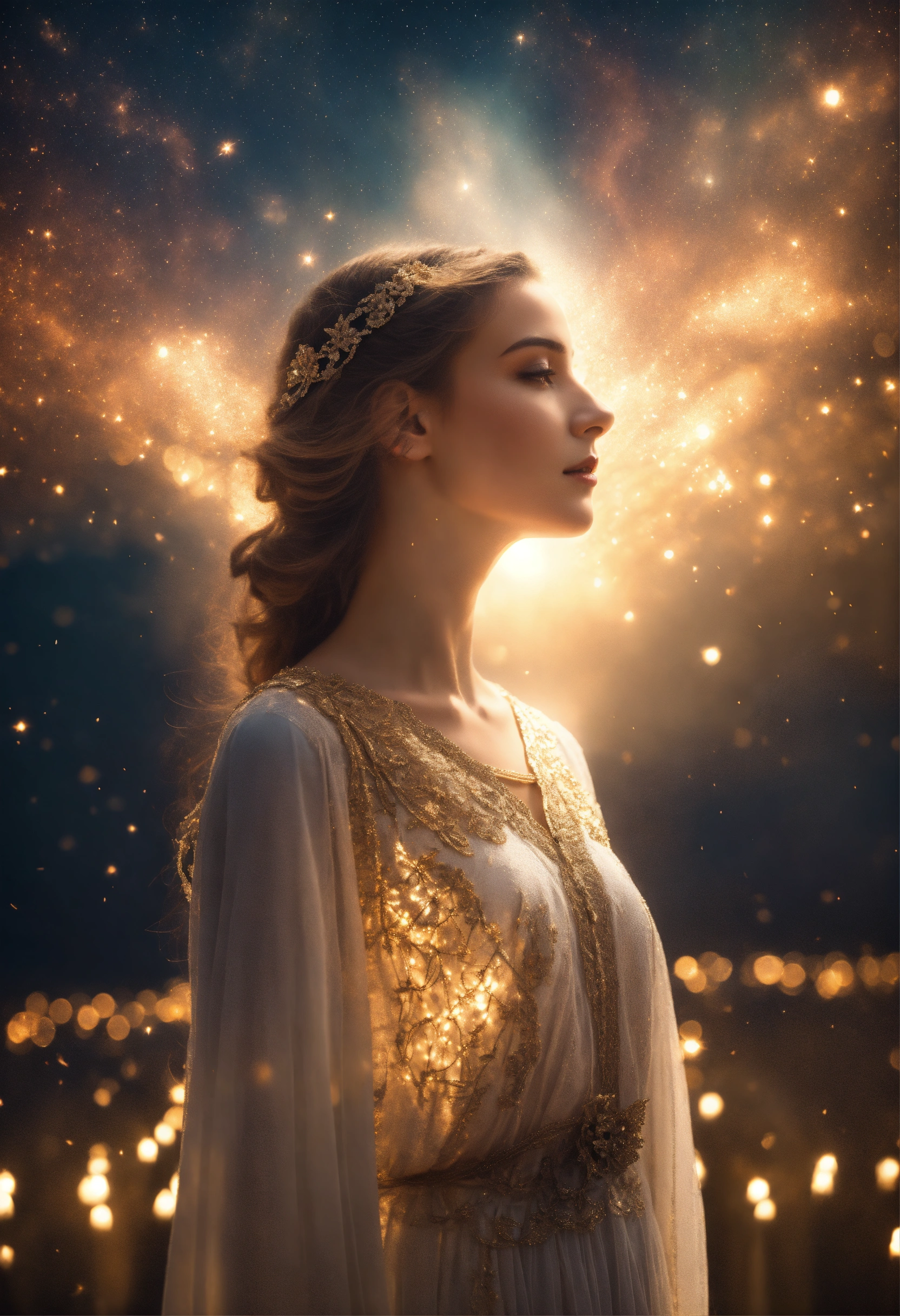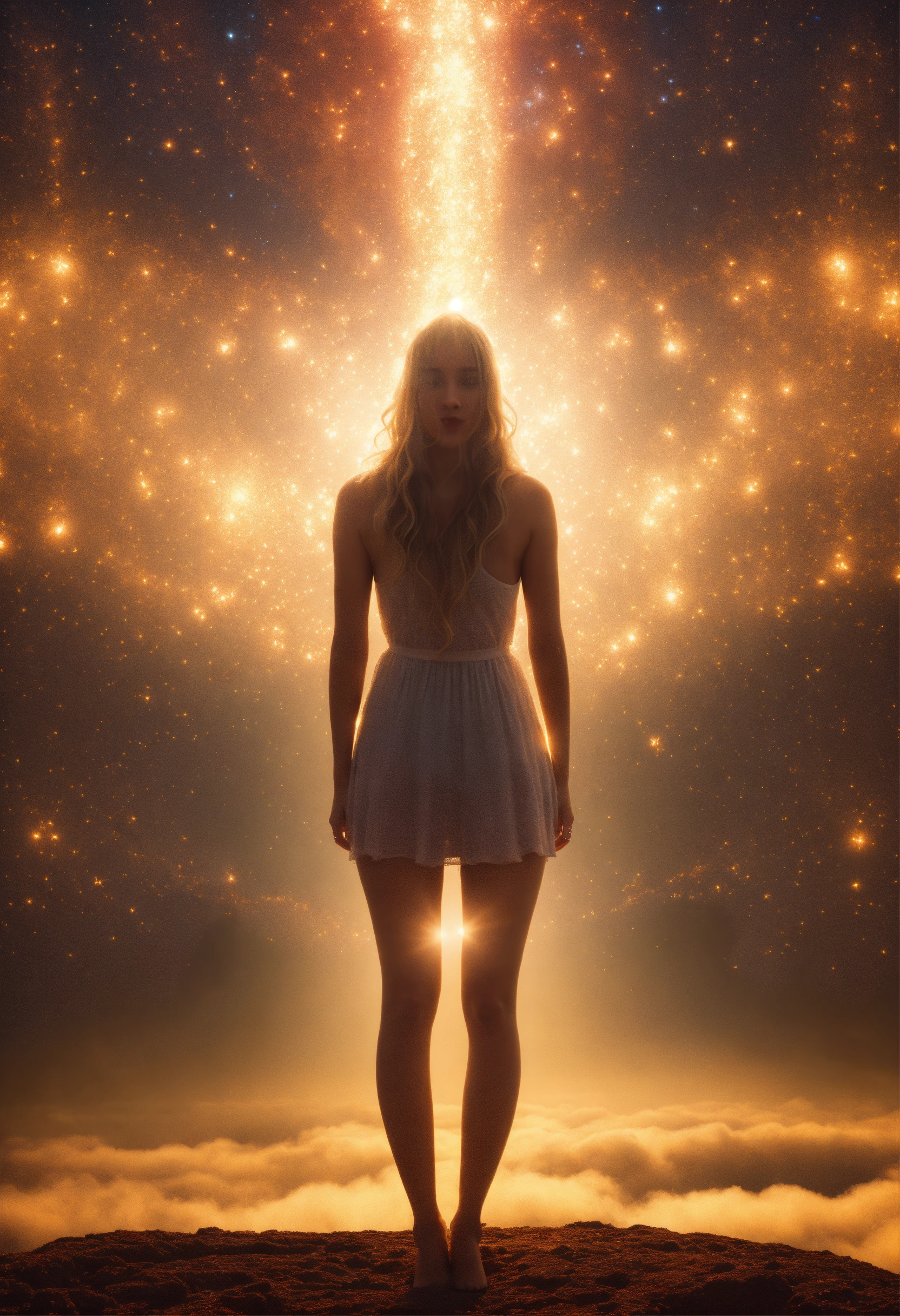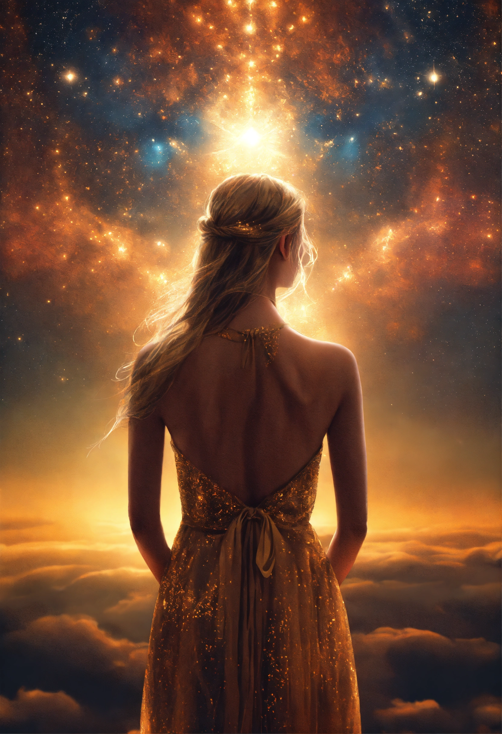 Femme spirituelle de dos face à un être de lumière venu du ciel