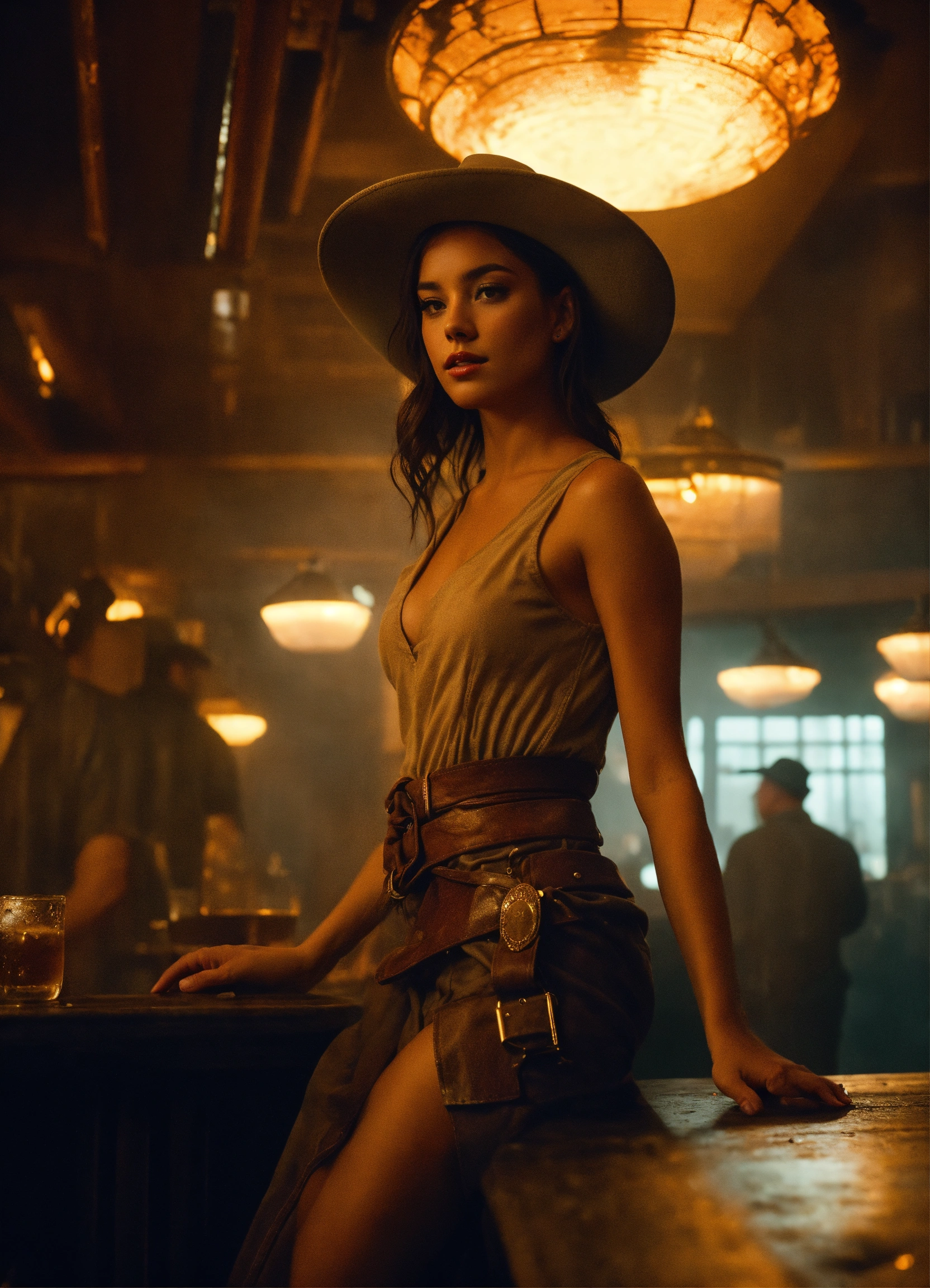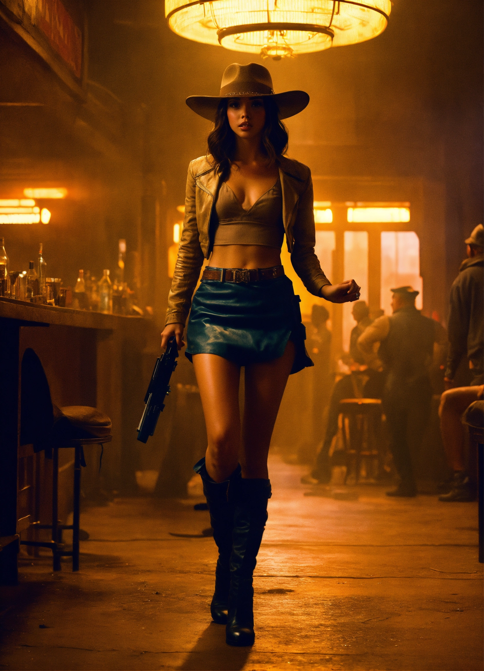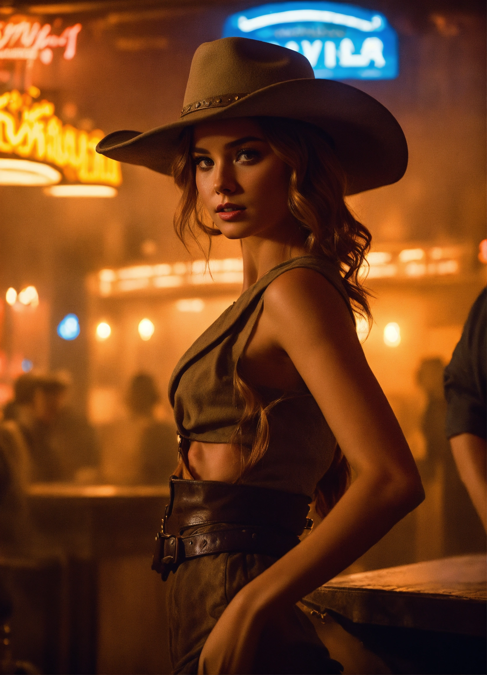 A southern beauty queen dancing in a dimly lit, post-apocalyptic tavern. she wears a beige cowboy hat. blade runner 2049.