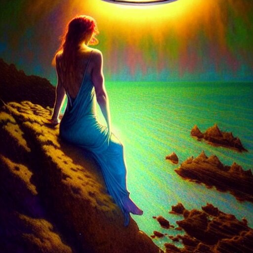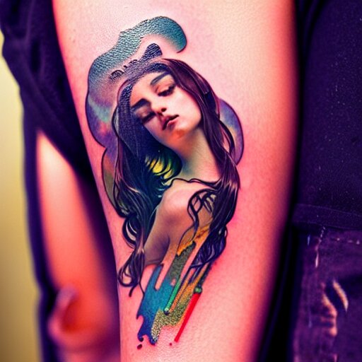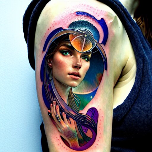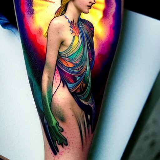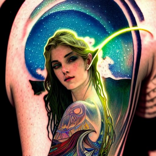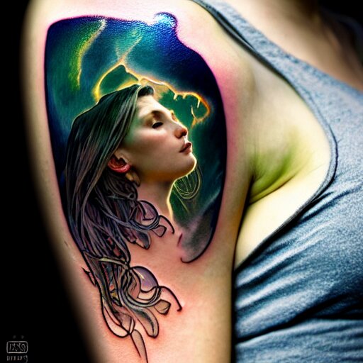 Extremely psychedelic tattoo, glowing halo, cliffside, ocean, orgeon, dramatic lighting, outdoors, elegant, highly detailed, lifelike, photorealistic, digital painting, artstation, illustration, smooth, sharp focus, art by collier, albert aublet, krenz cushart, artem demura, alphonse mucha