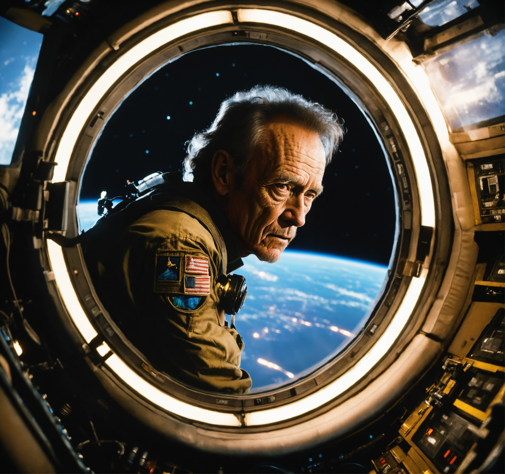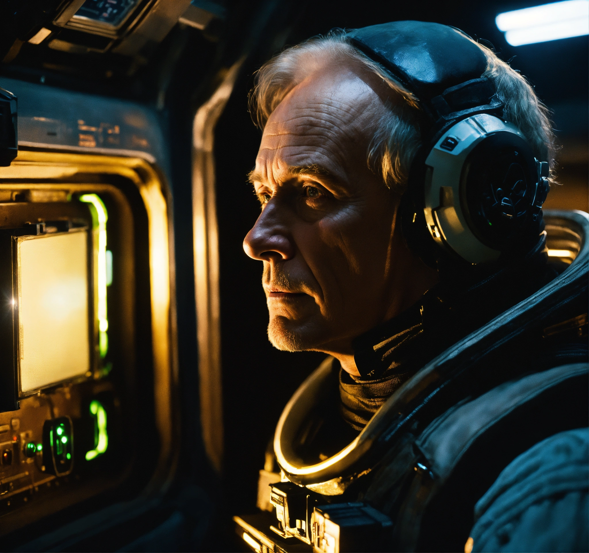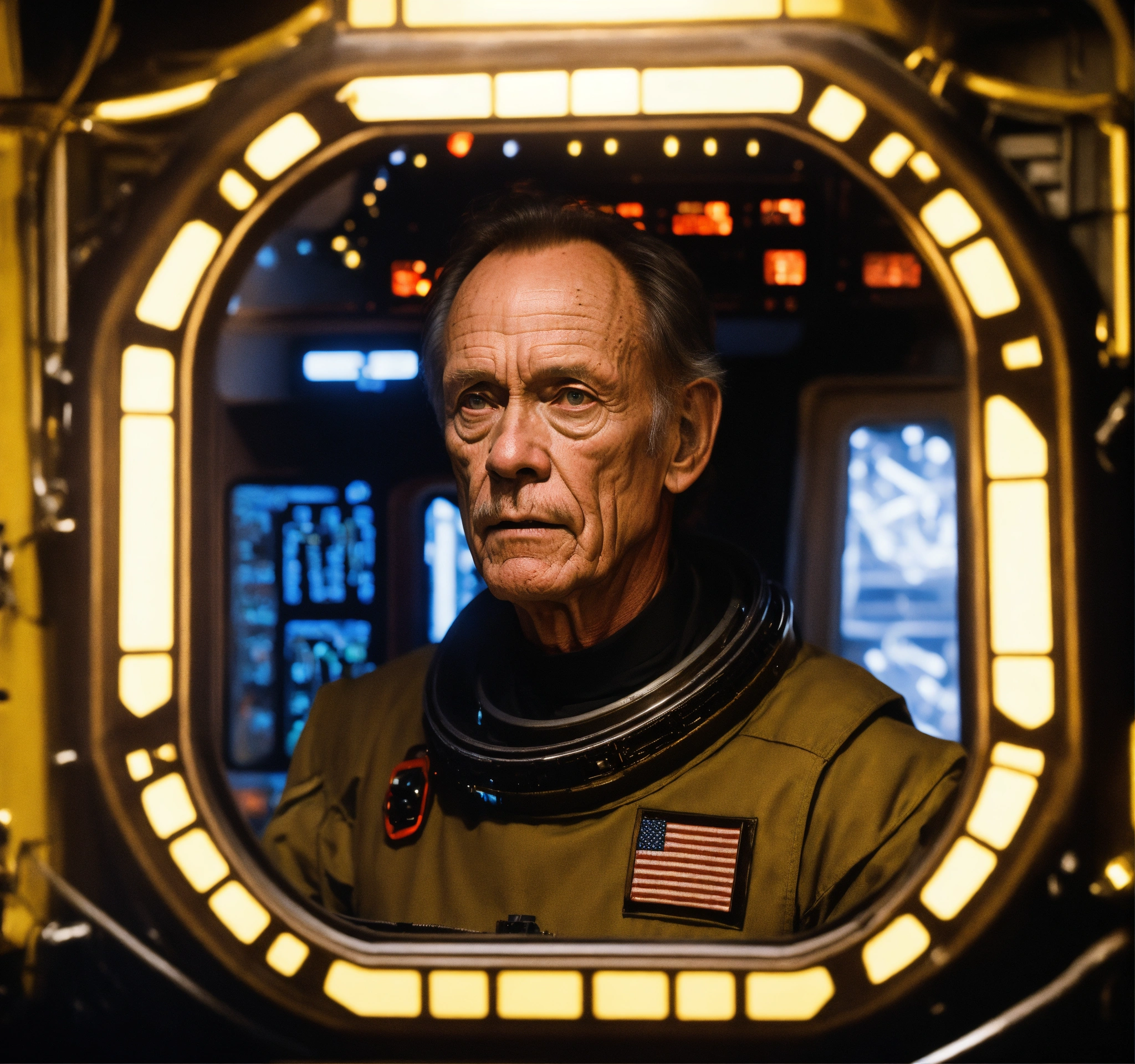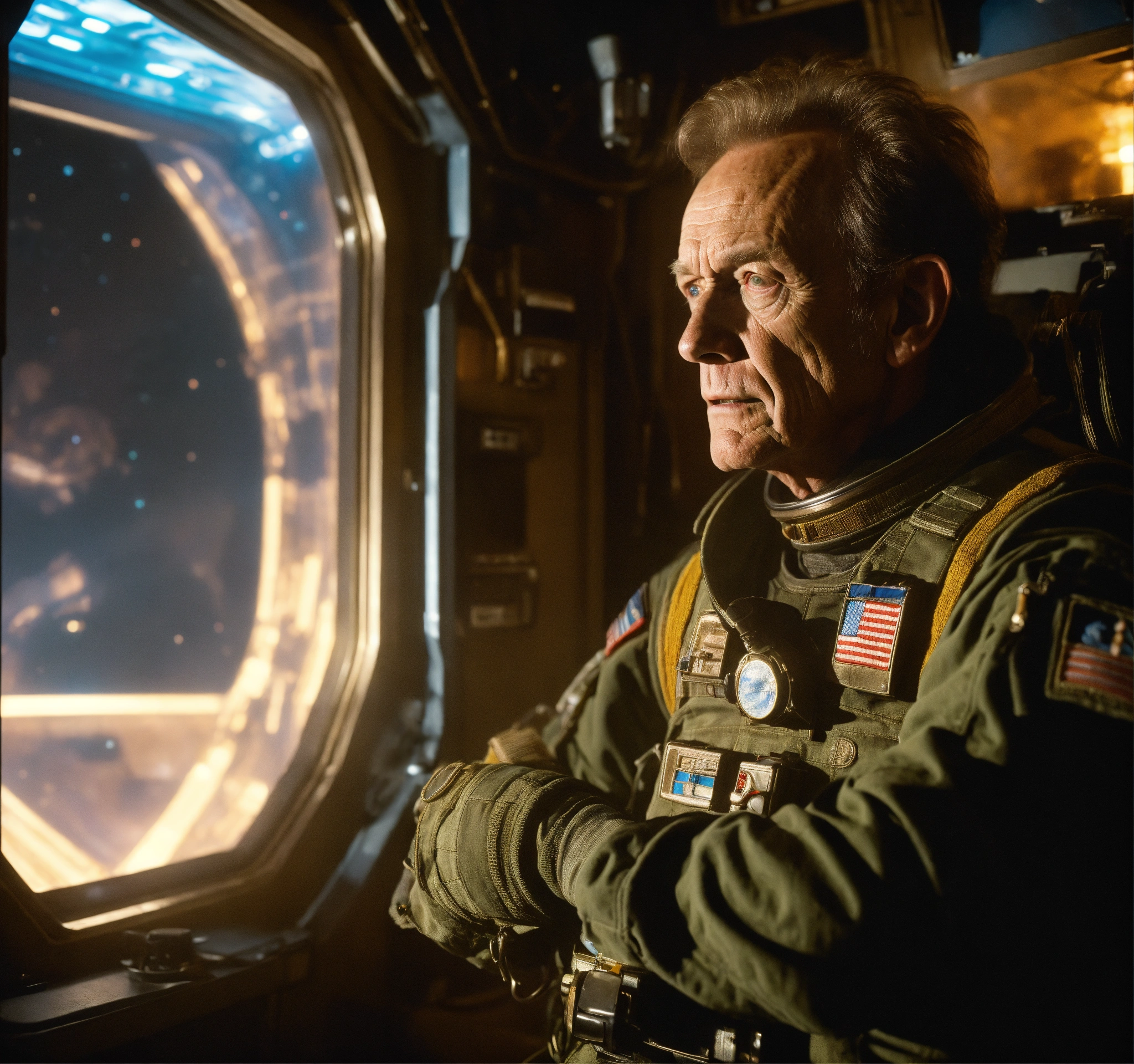 Bishop from the movie aliens, lance henriksen, staring out the window of a space station, photorealistic picture, warm lighting