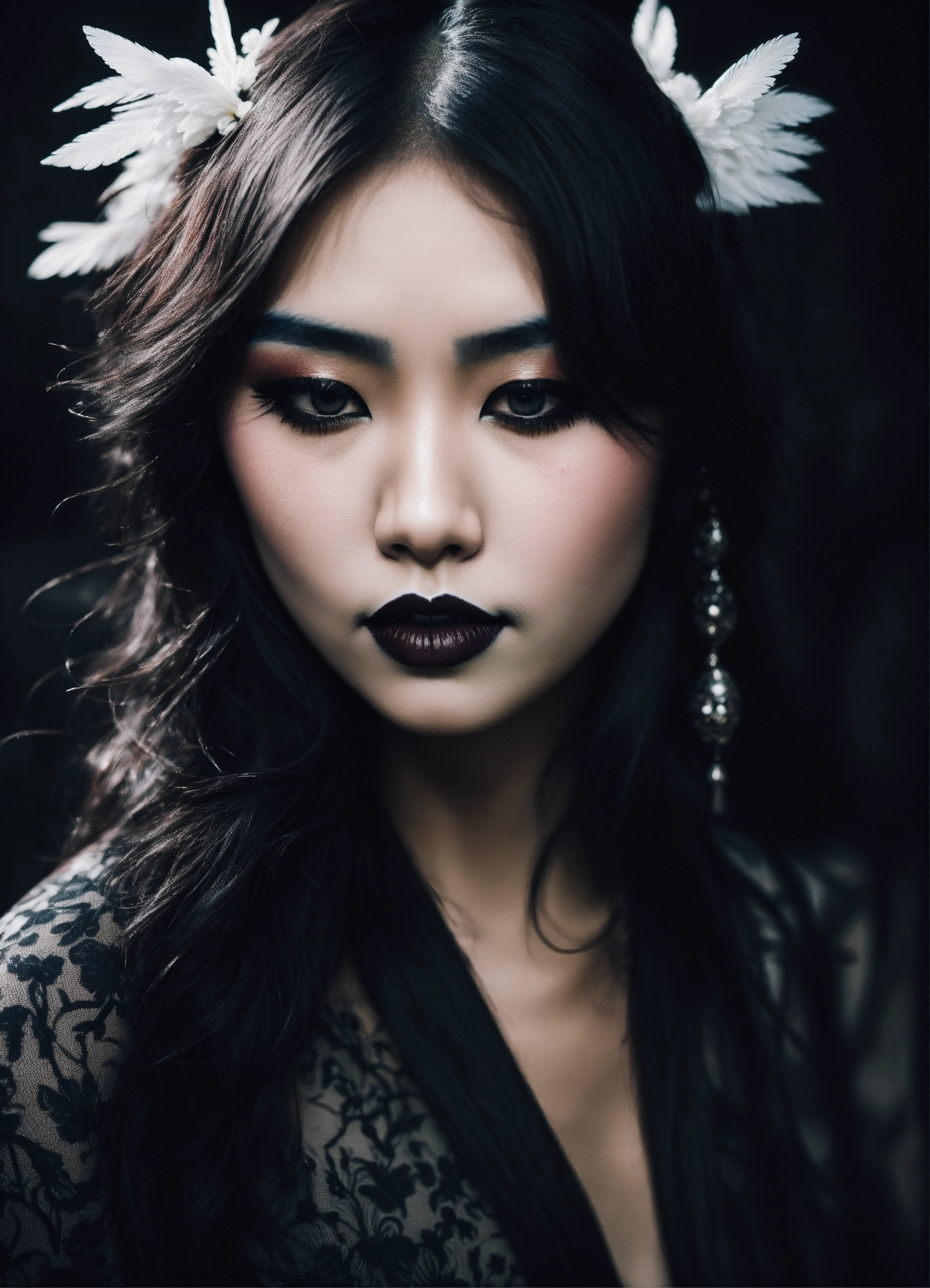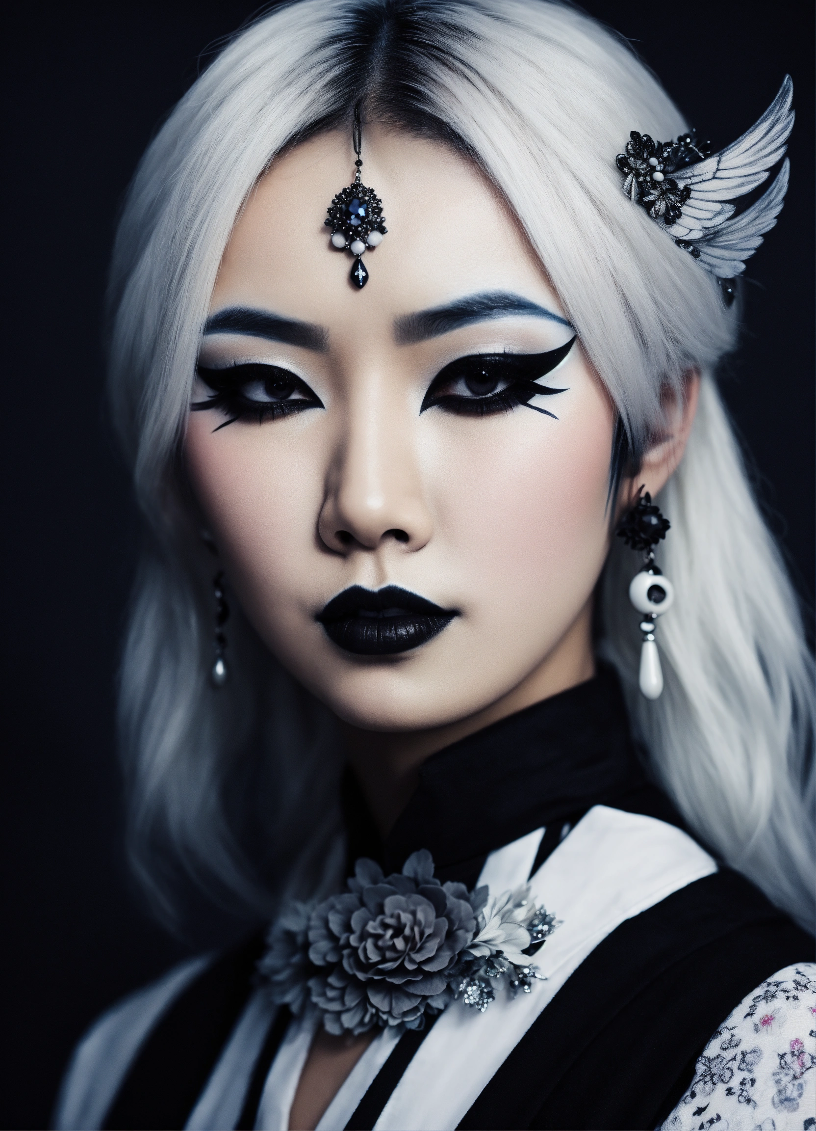 High contrast portrait of a japanese woman, gothic beauty, face painted white, dark lips, dramatic winged eyeliner