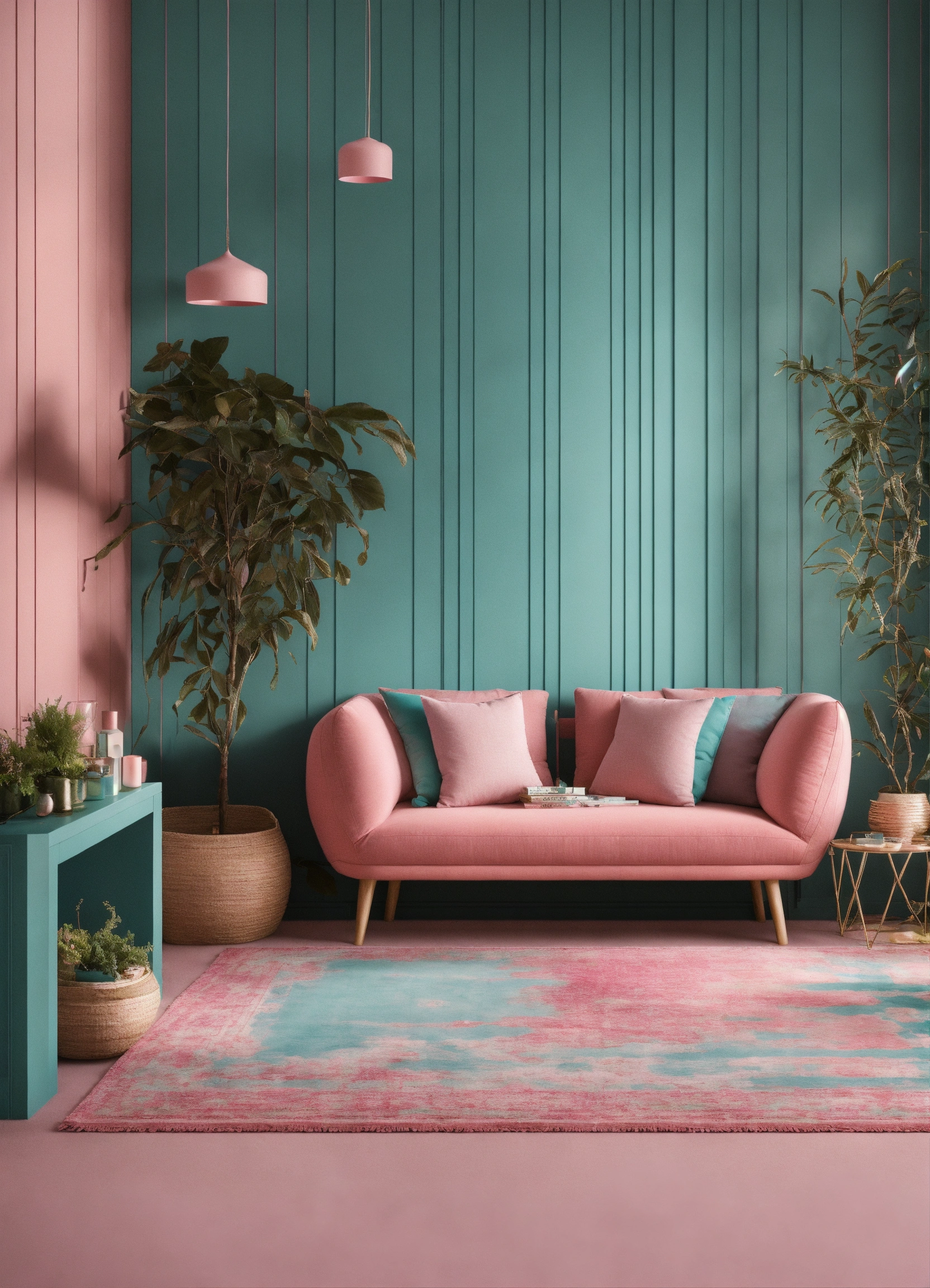 Create some interior design using turquise and pink colours with modern, elegant vibes in japandi style