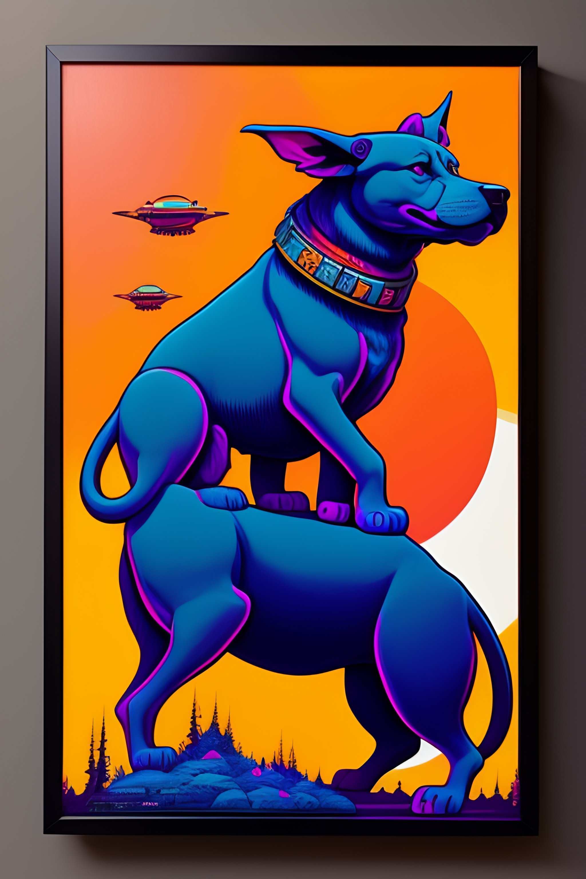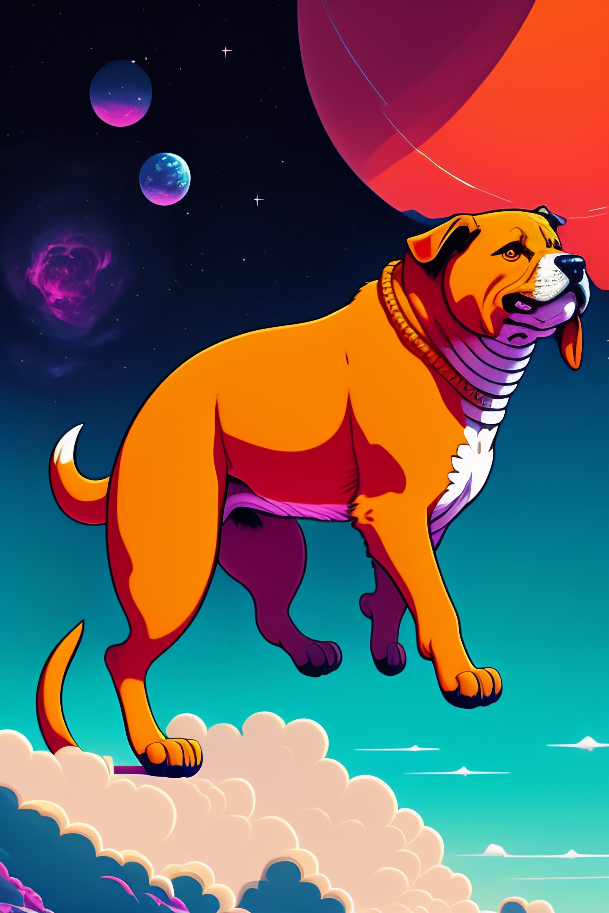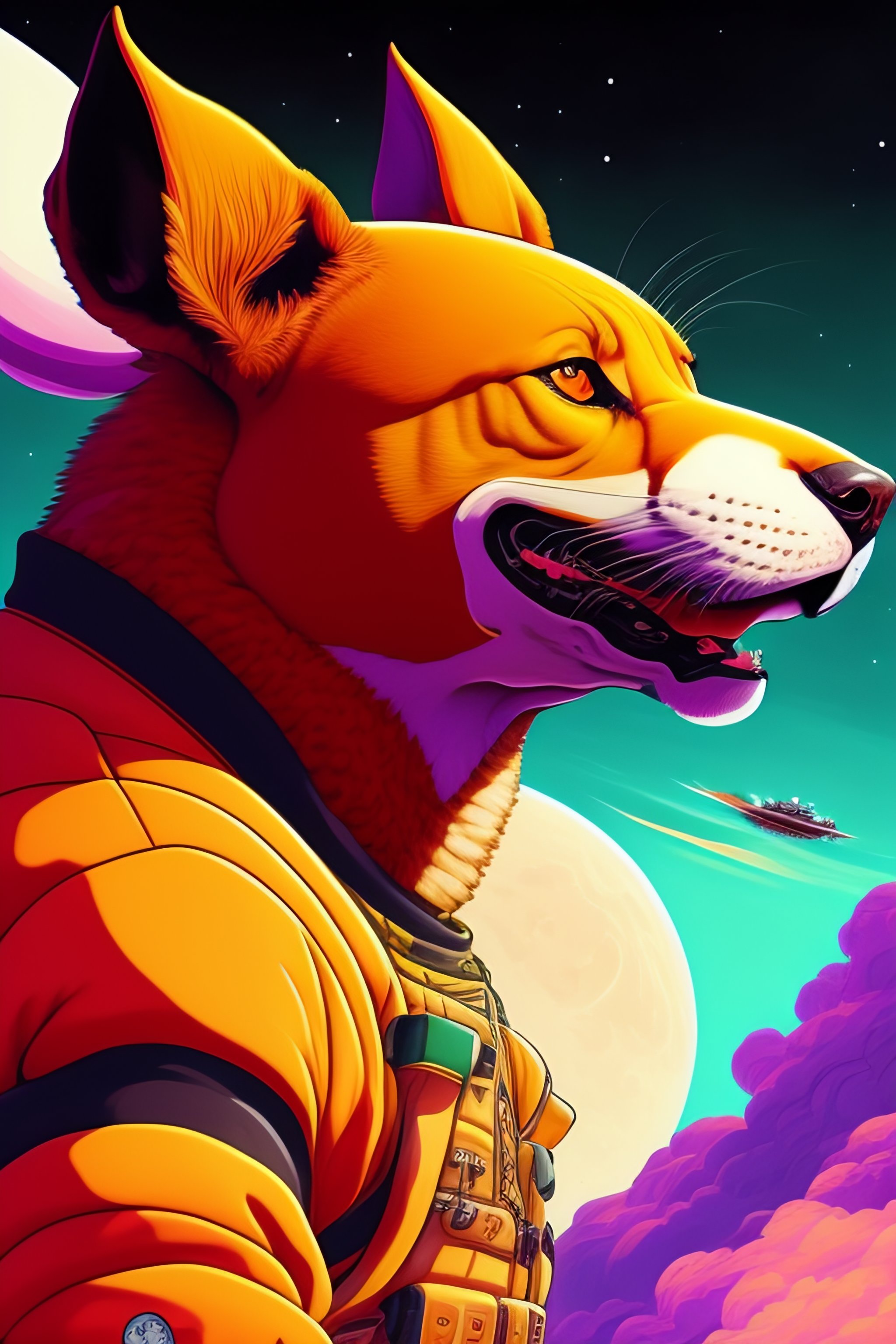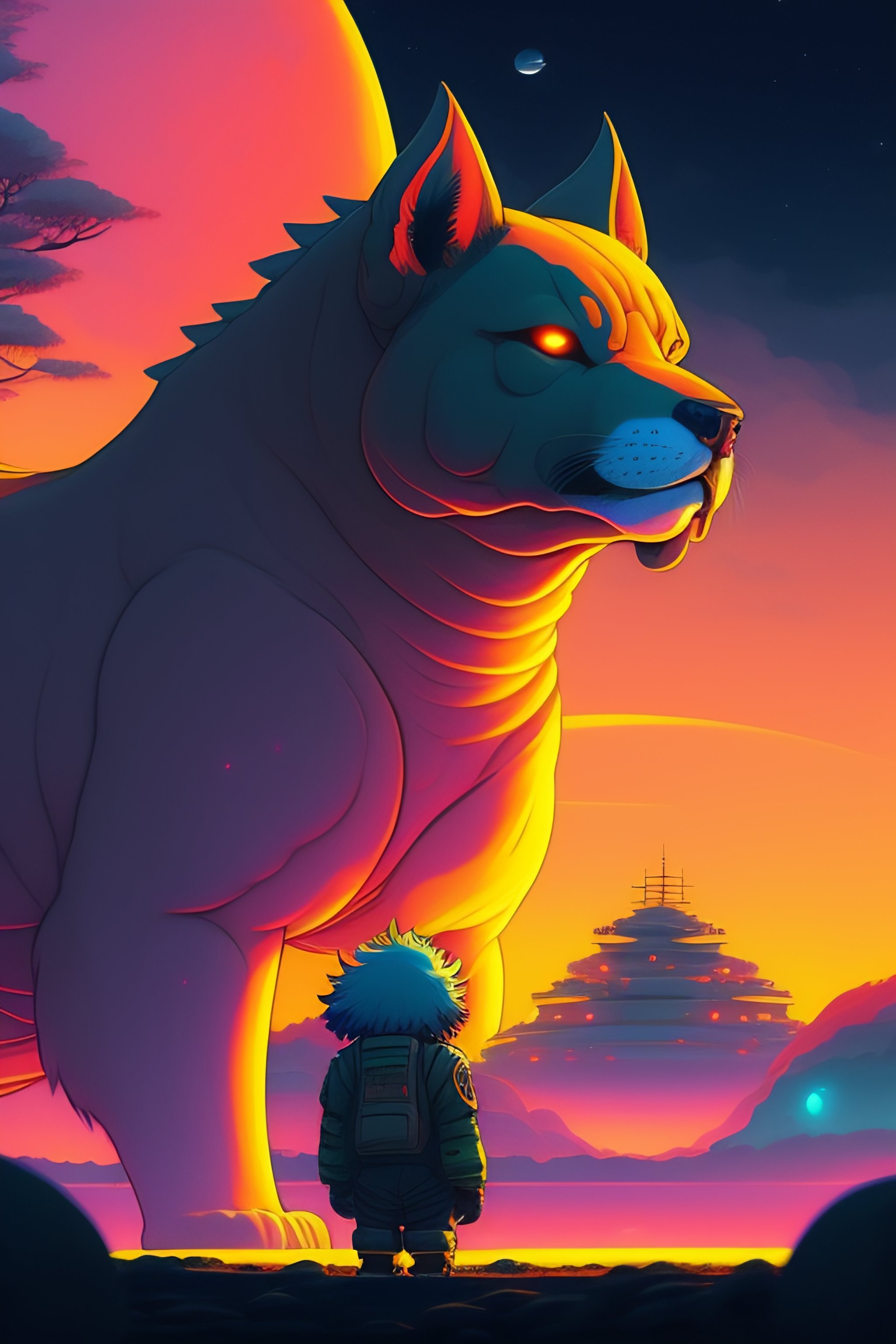 Photo of fusion of a huge savage dog monster with an alien in the space, style of laurie greasley, studio ghibli, akira toriyama, james gilleard, genshin impact, trending pixiv fanbox, acrylic palette knife, 4k, vibrant colors, devinart, trending on artstation, low details