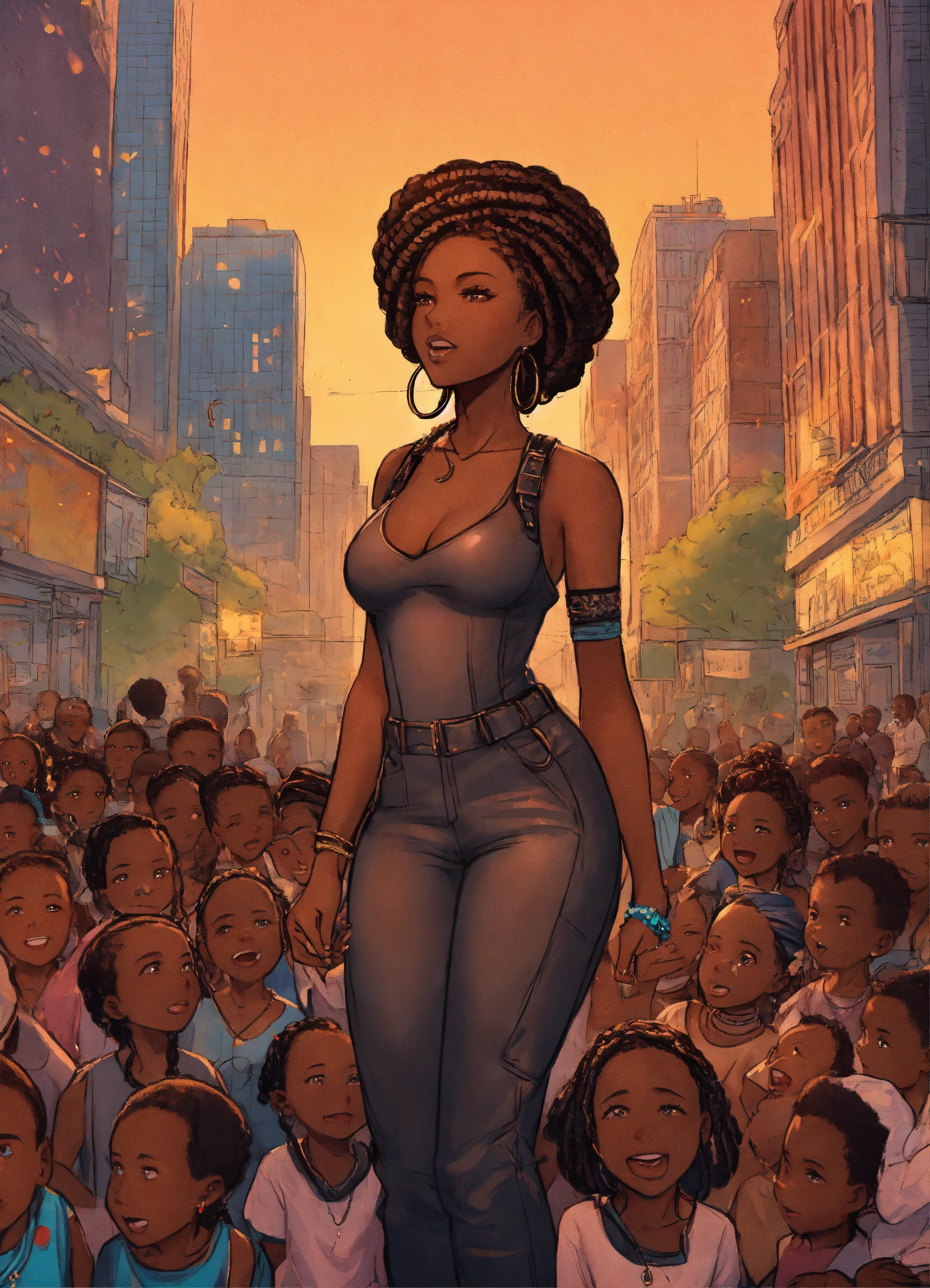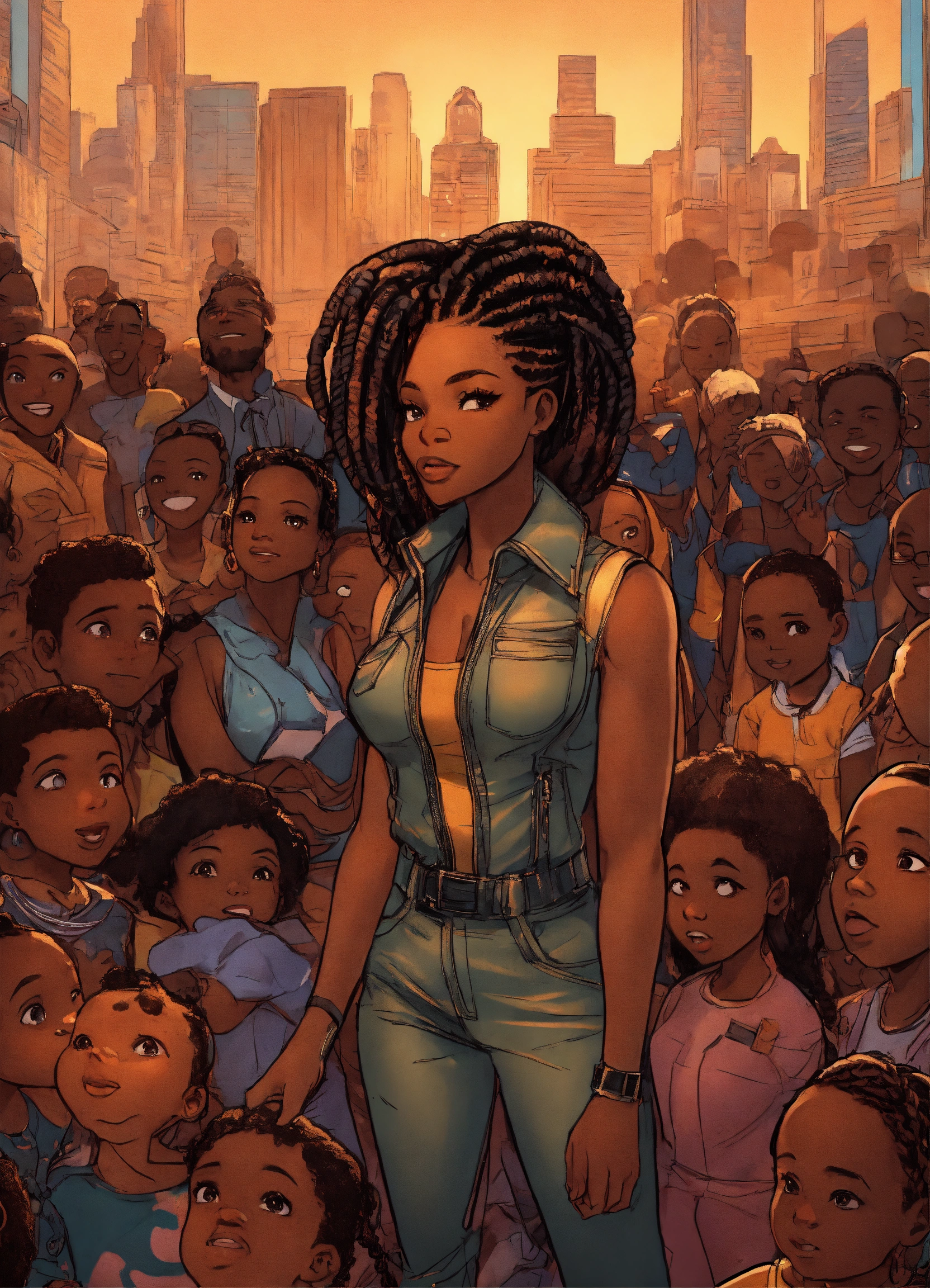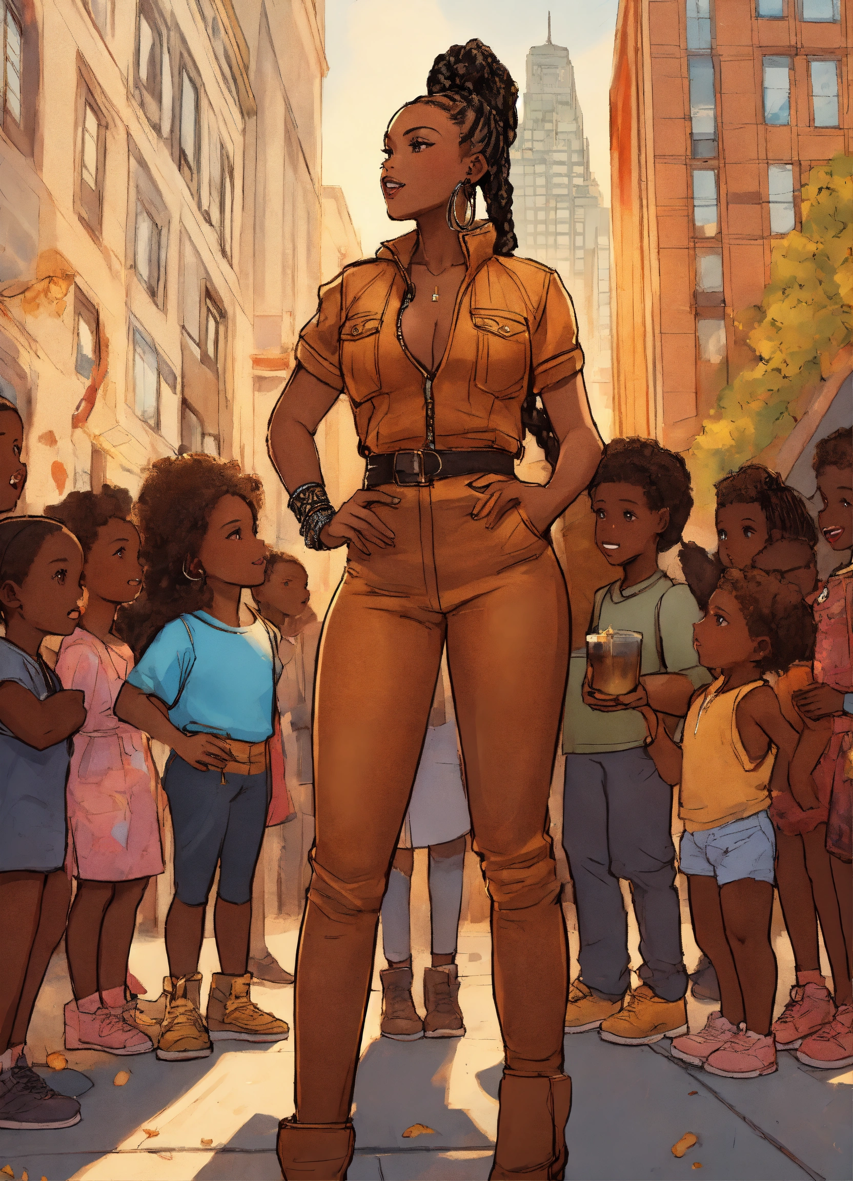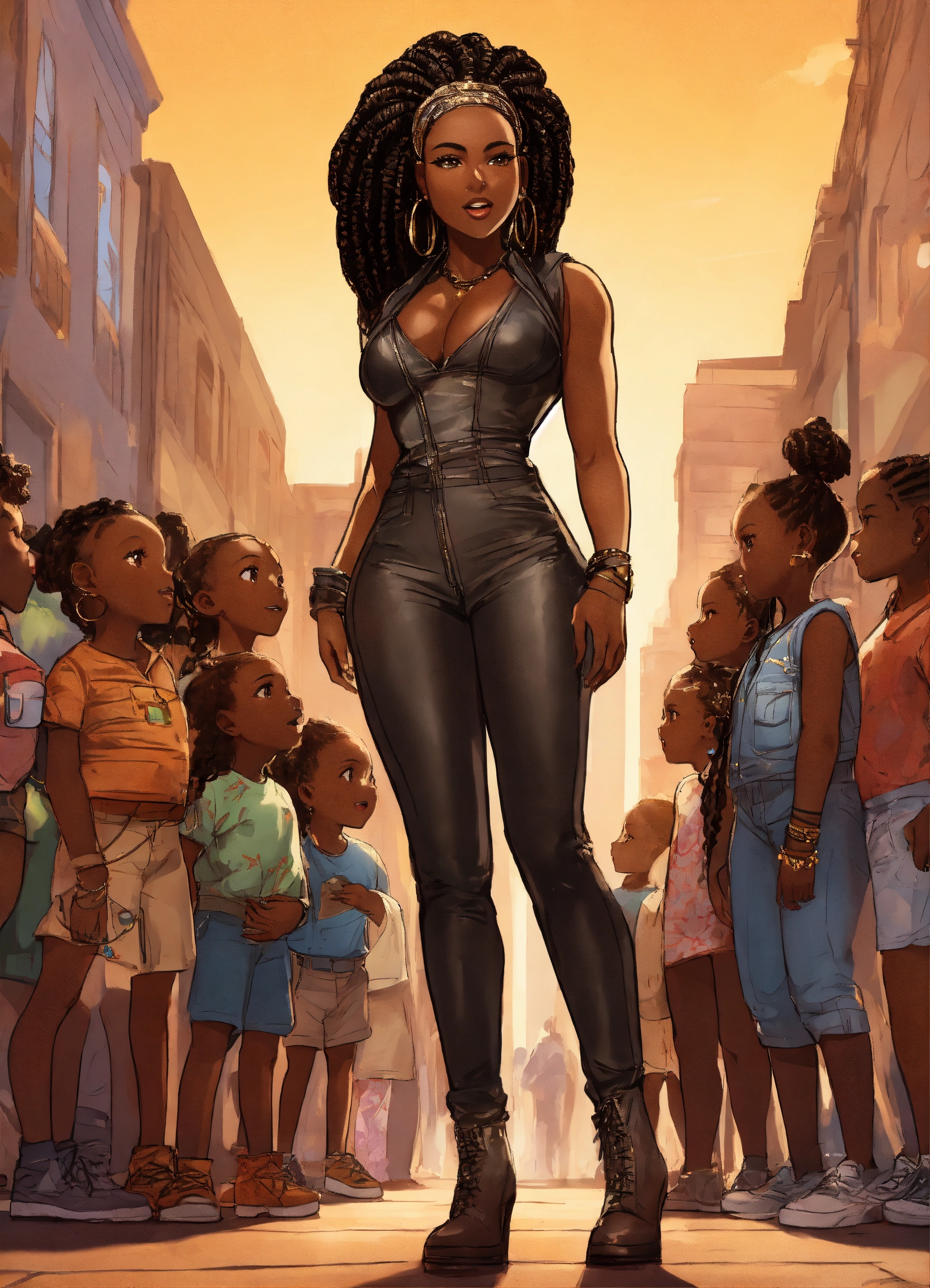 Full body incredibly insanely stunningly beautiful 35 year old cartoon dark skinned african american woman with intricate cornrow braids in her hair dressed in leather jumpsuit gloriously standing in the big city during a celebration looking powerful with ten little african children looking up to her for guidance