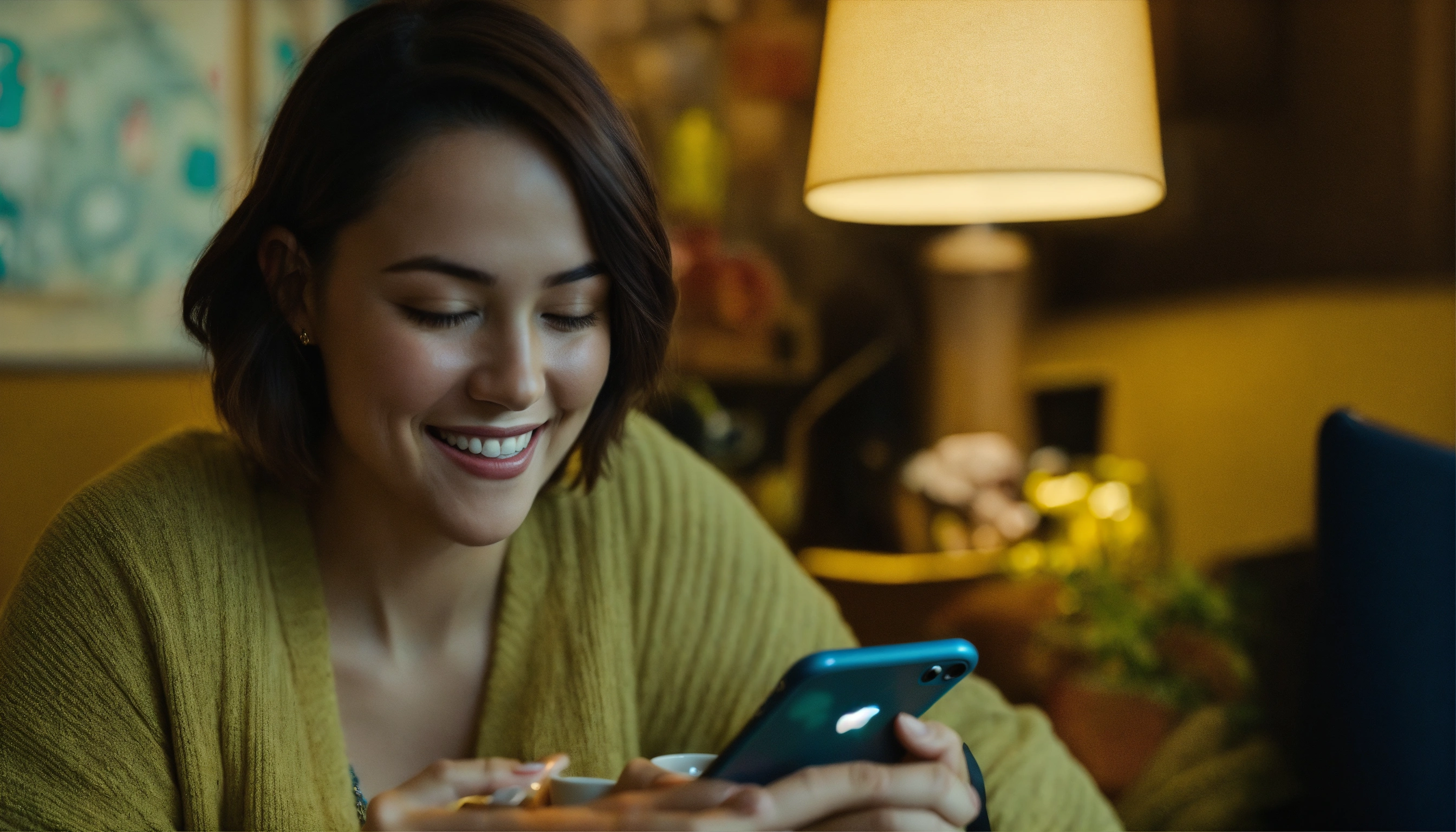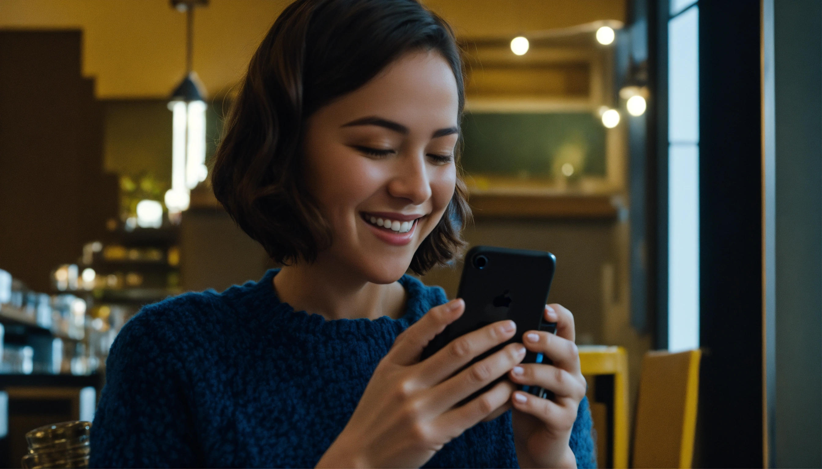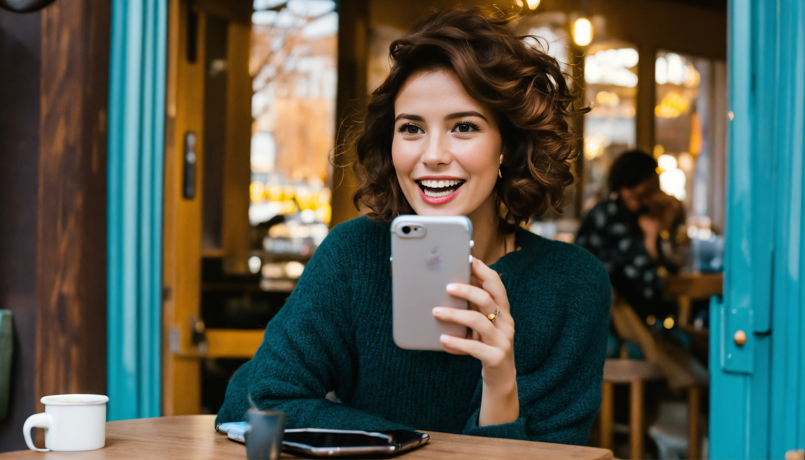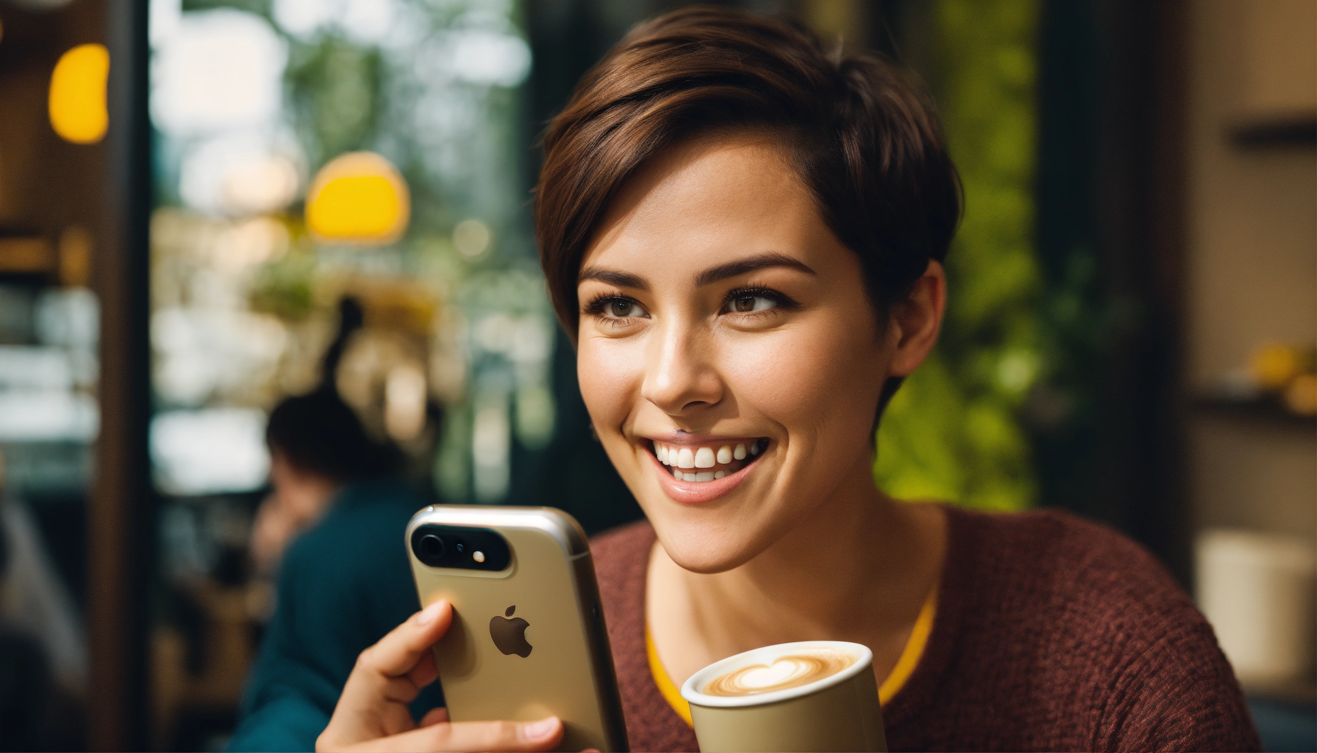 A surprised woman with short brown hair drinking coffee, smiling, and looking intently at her iphone.