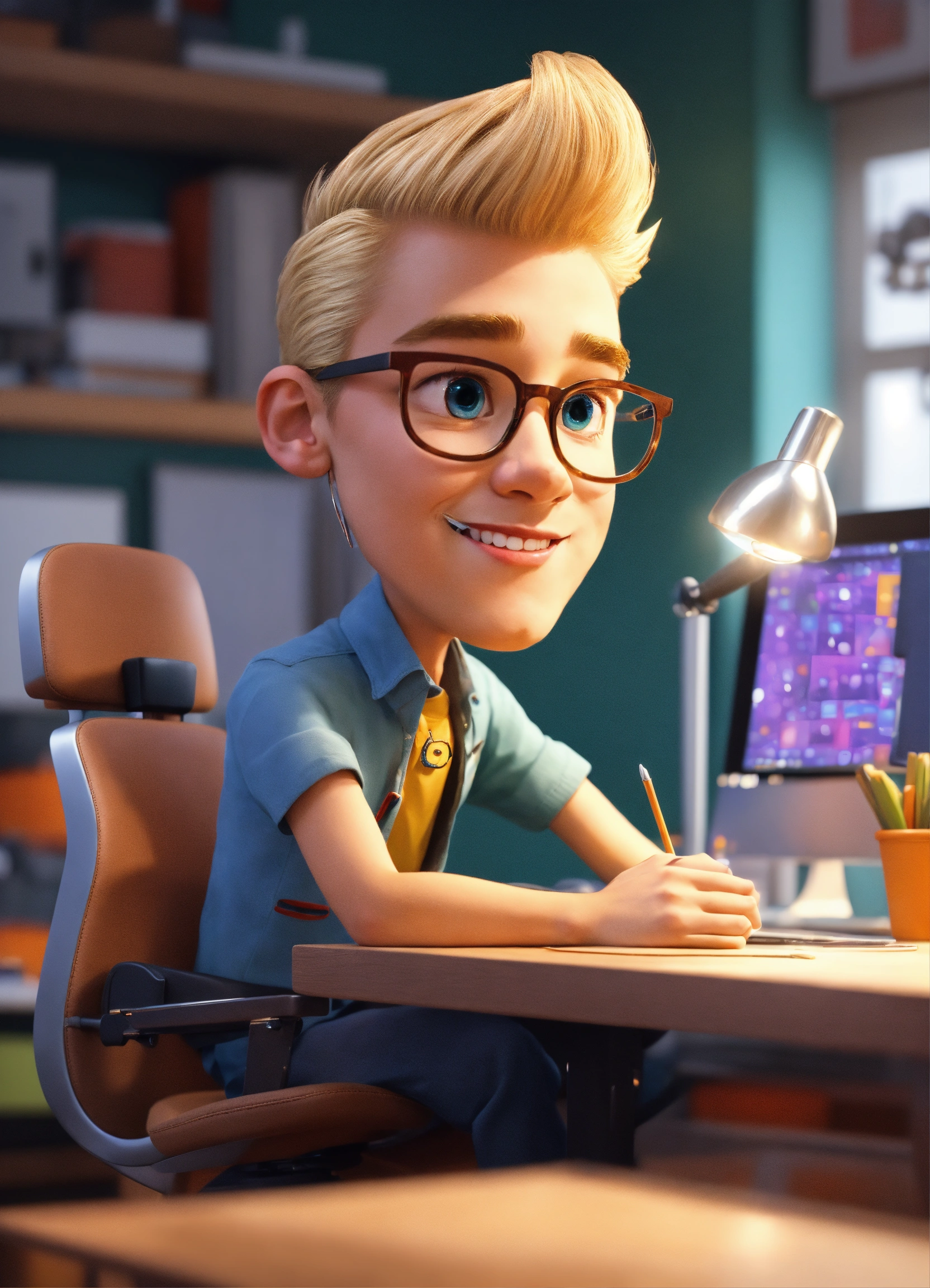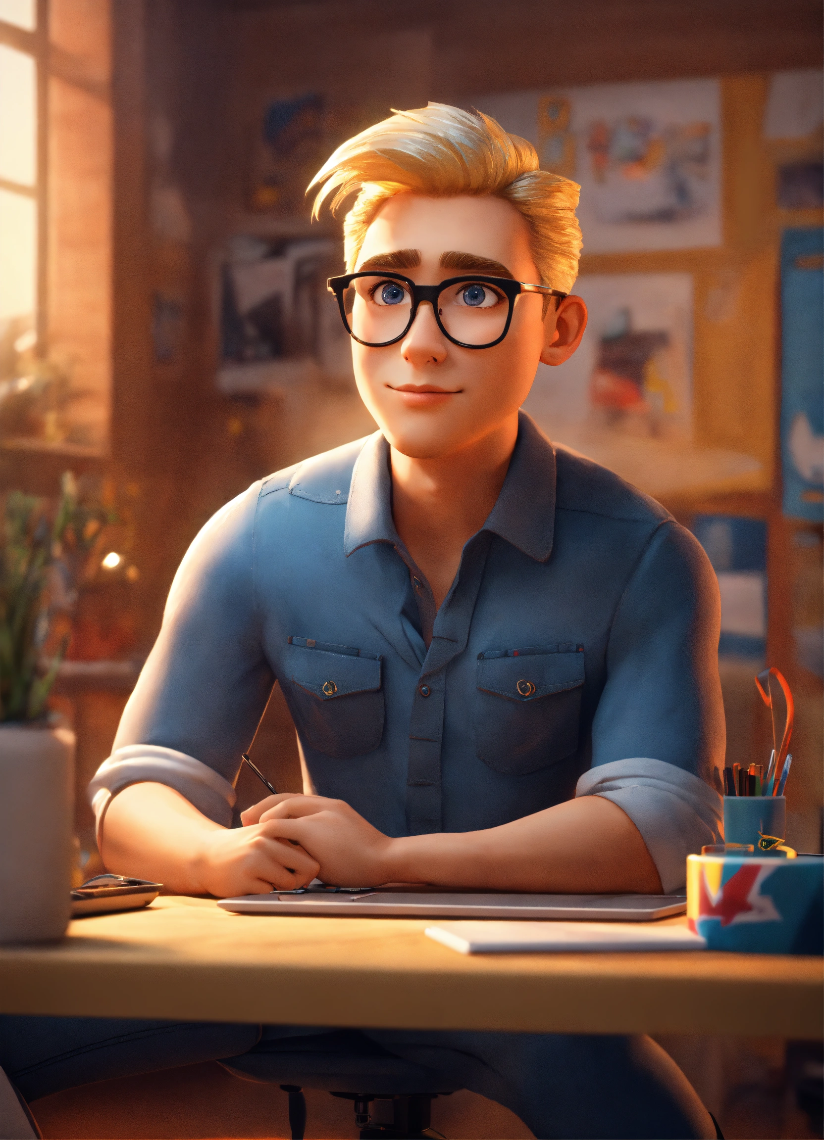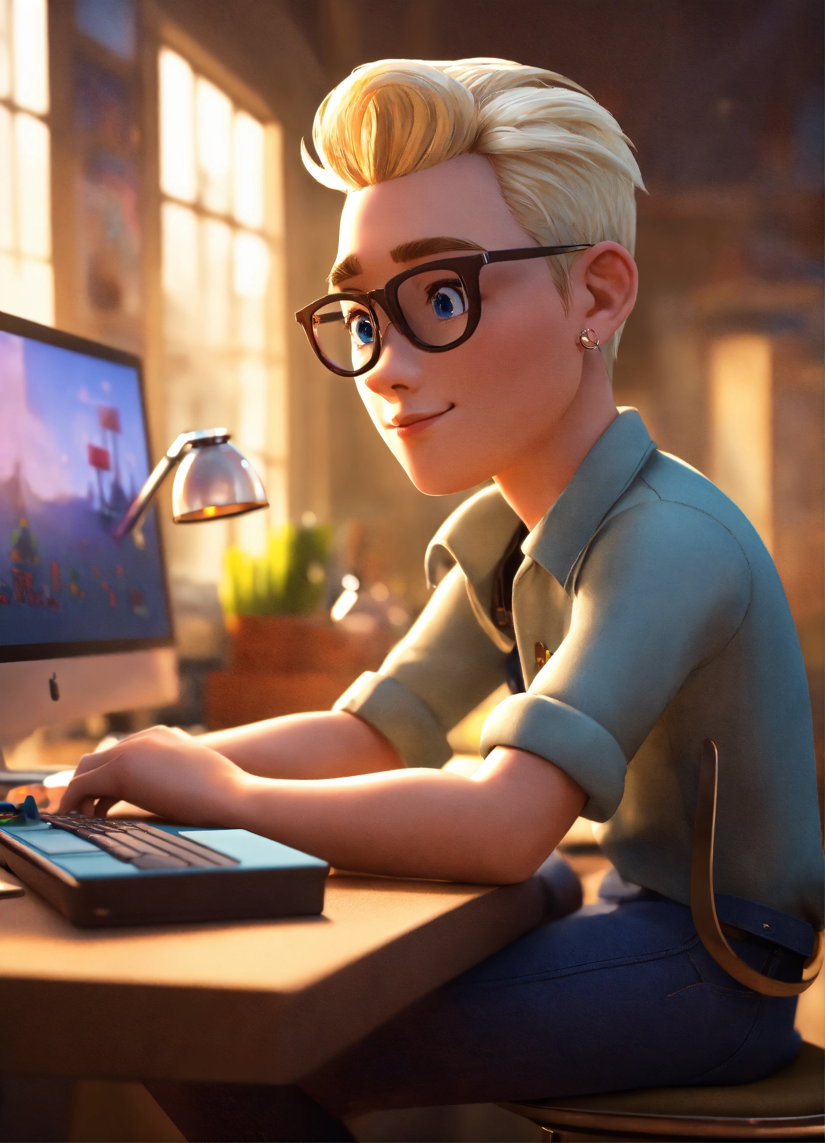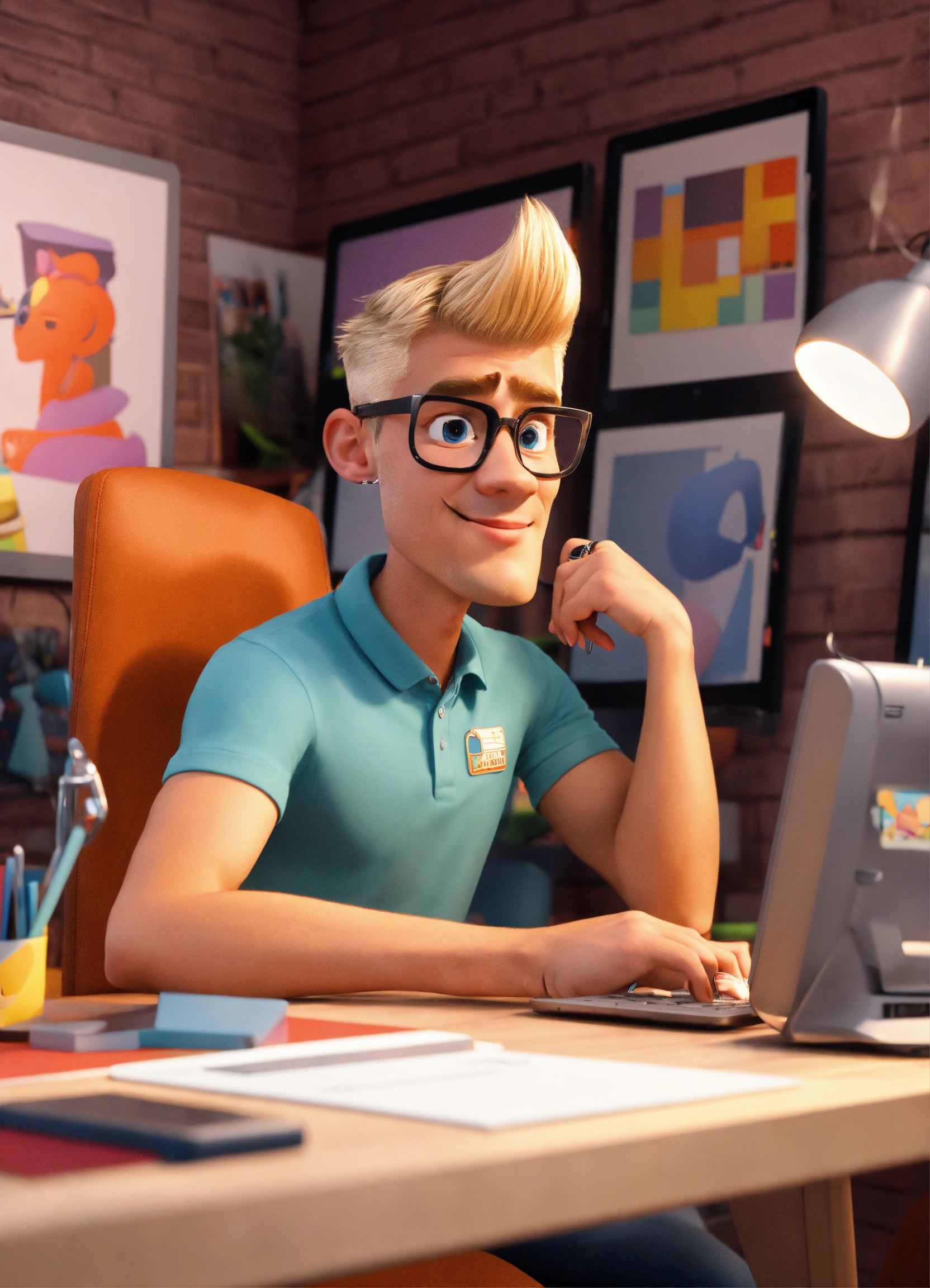 A 3d pixar disney style pôster, with a cute blond man, high gelled hair, shaved on the side, thin beard, silver hoop earrings, sitting at the table, computer, the man is a graphic designer, workplace