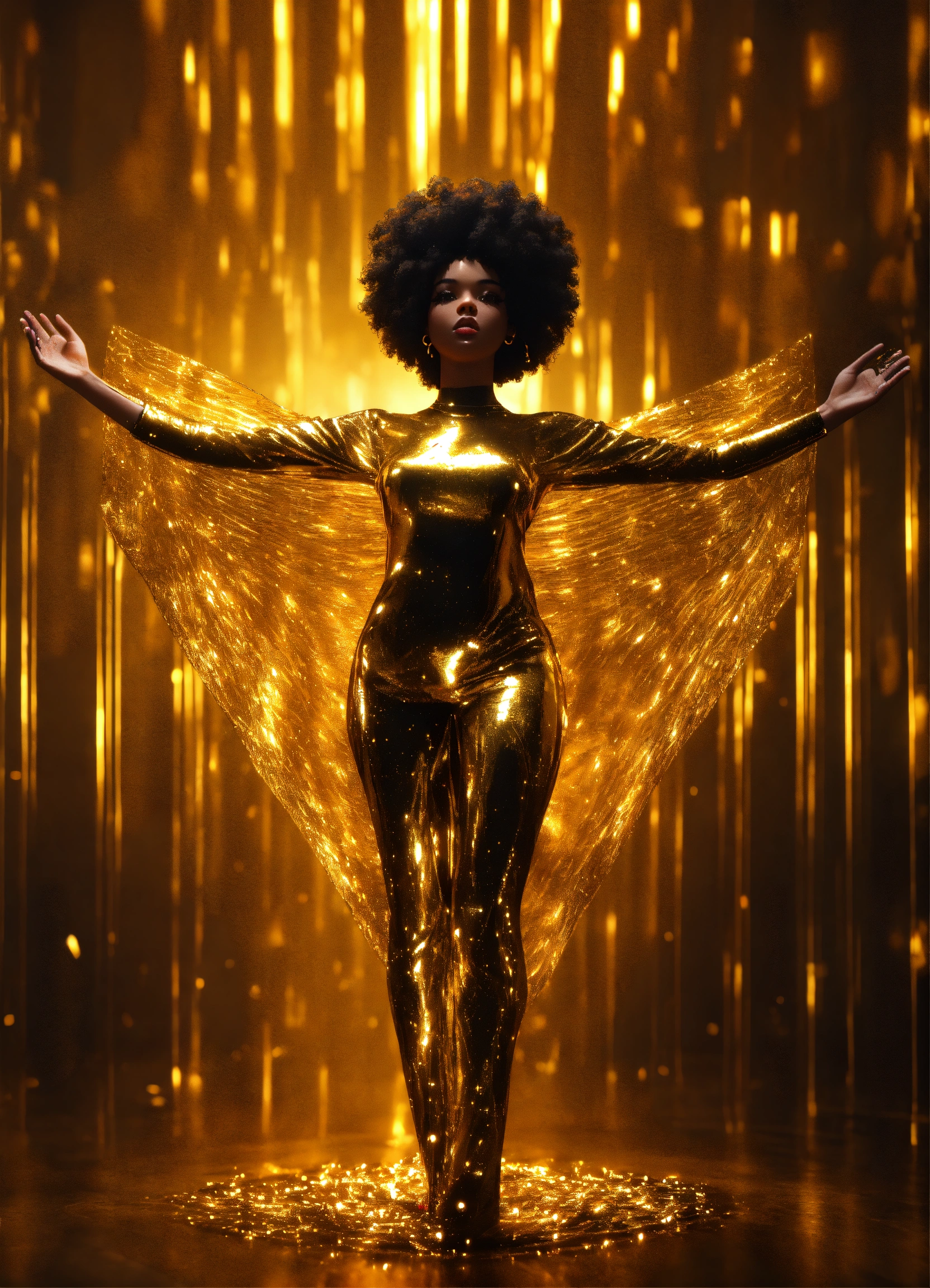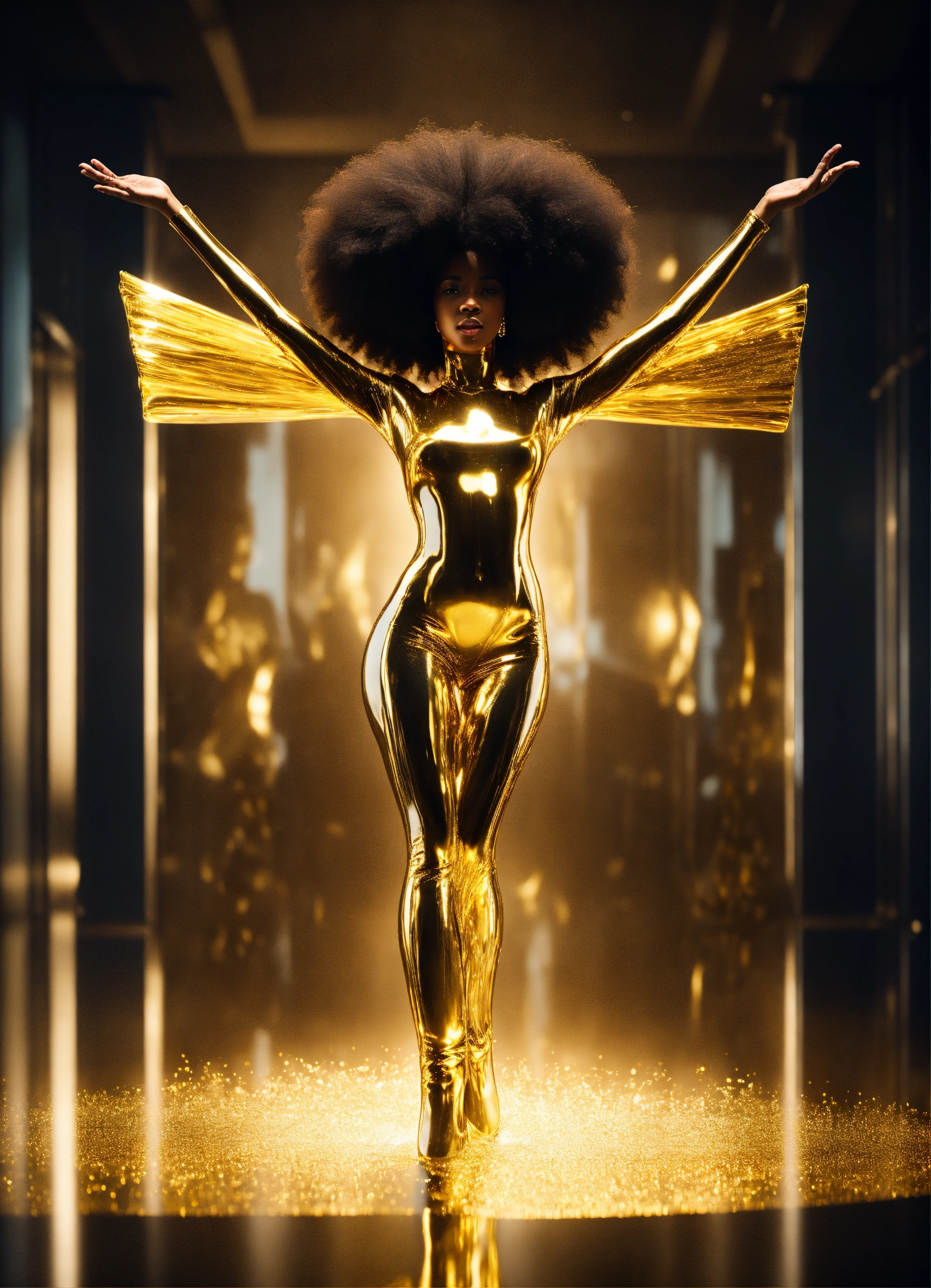 3d render of black woman with afro made entirely of glass, full body, standing, arms outstretched in welcoming, liquid gold flows through her, illuminating her form from within. taken on medium format camera, ambient lighting, zeiss distagon t* 50mm lens.