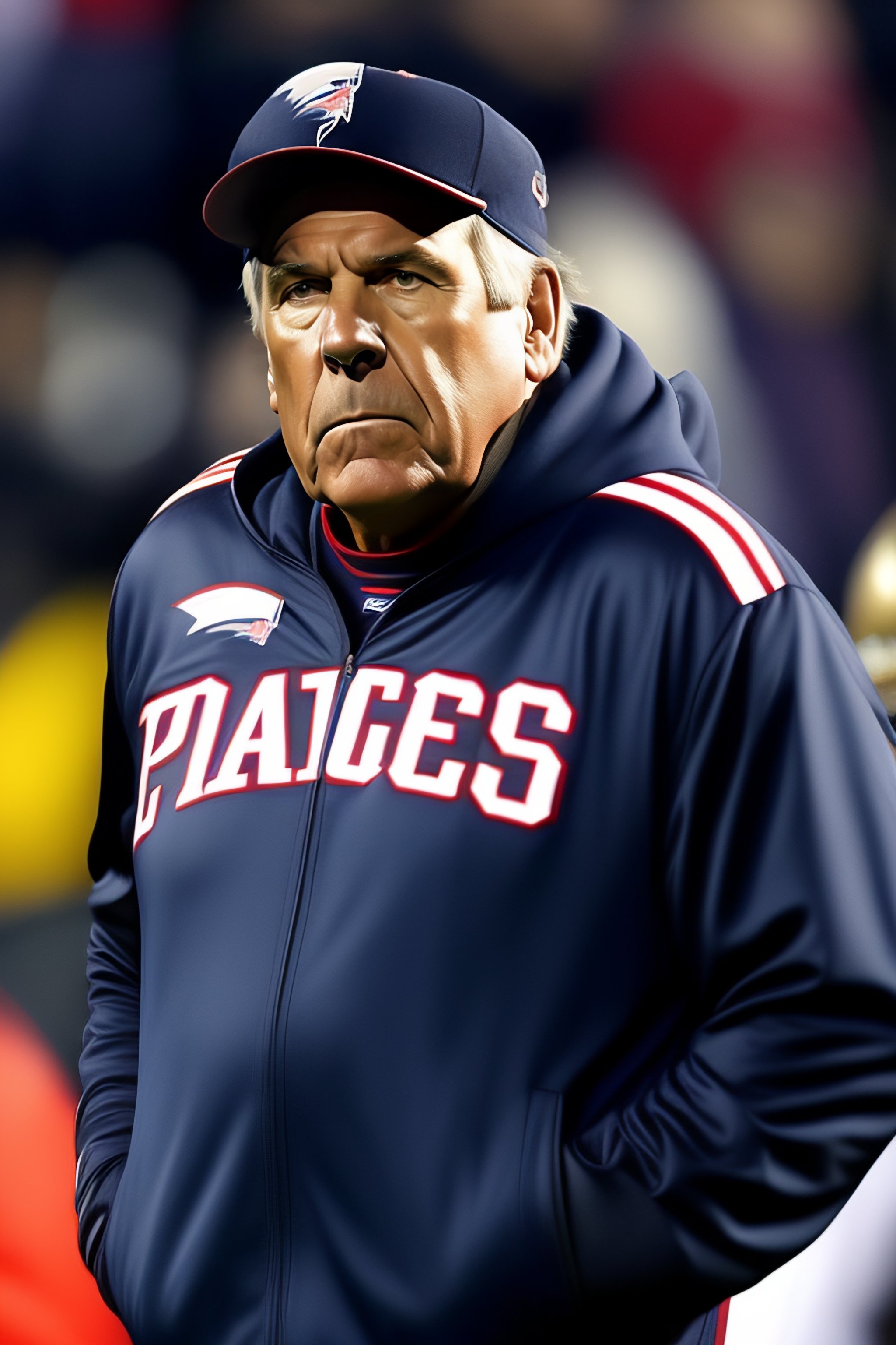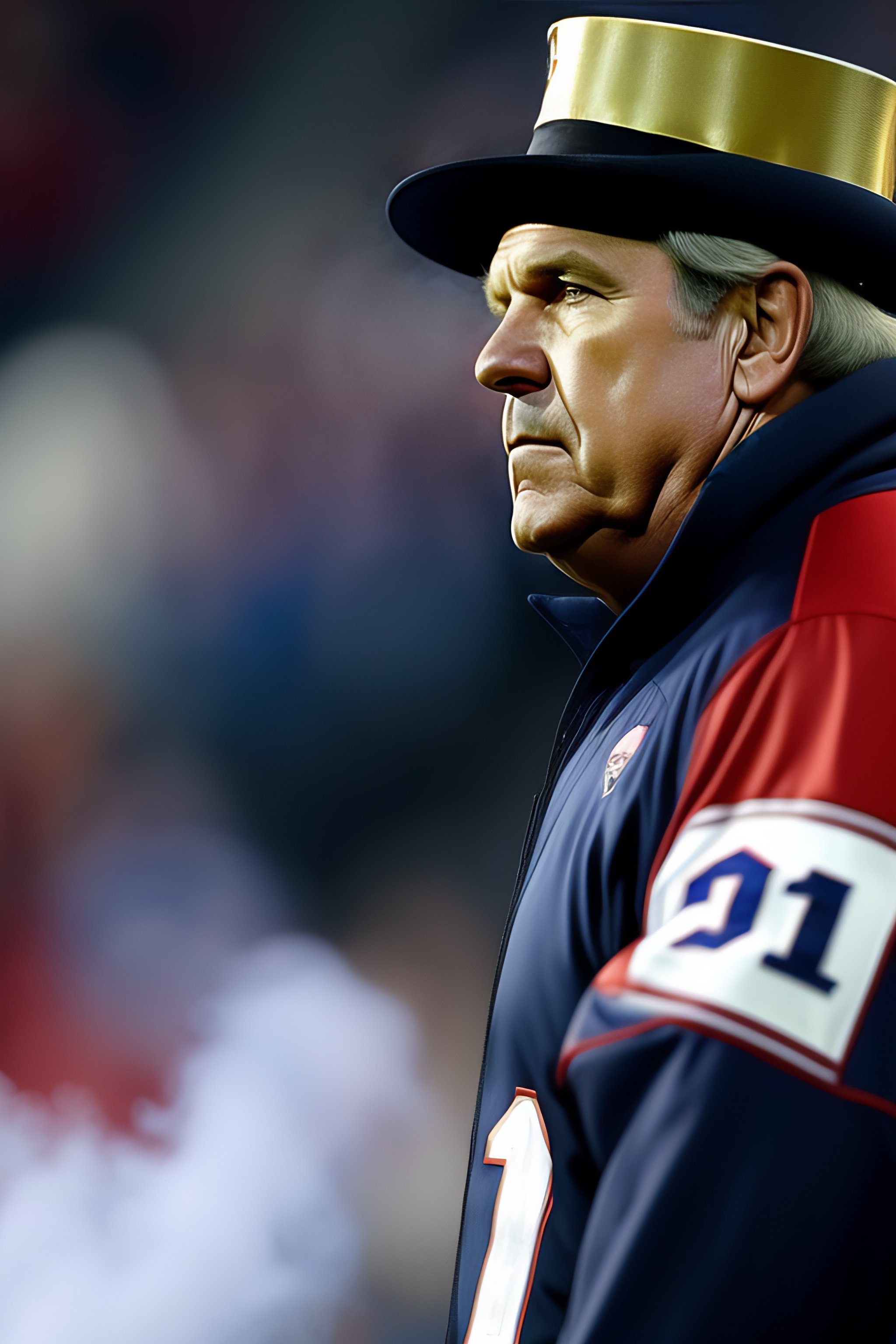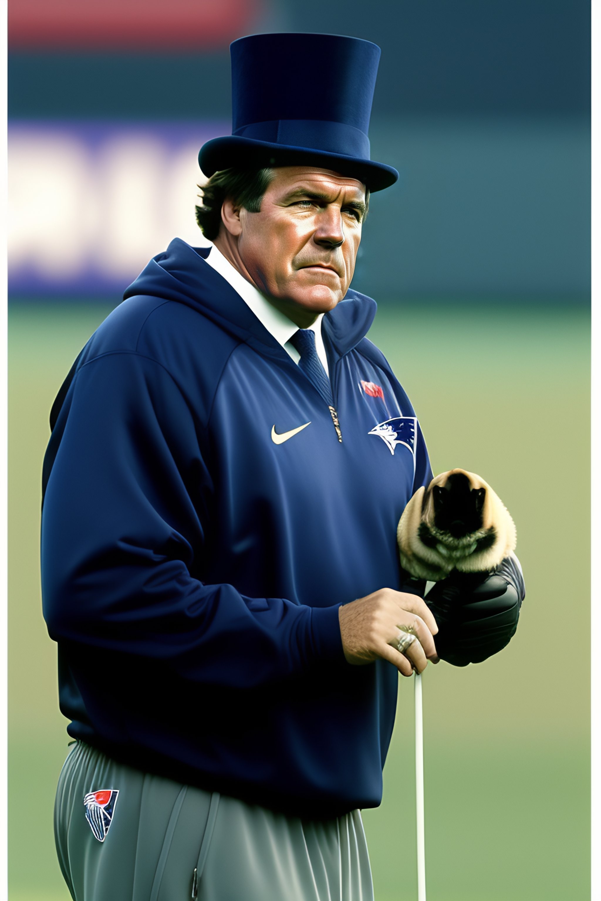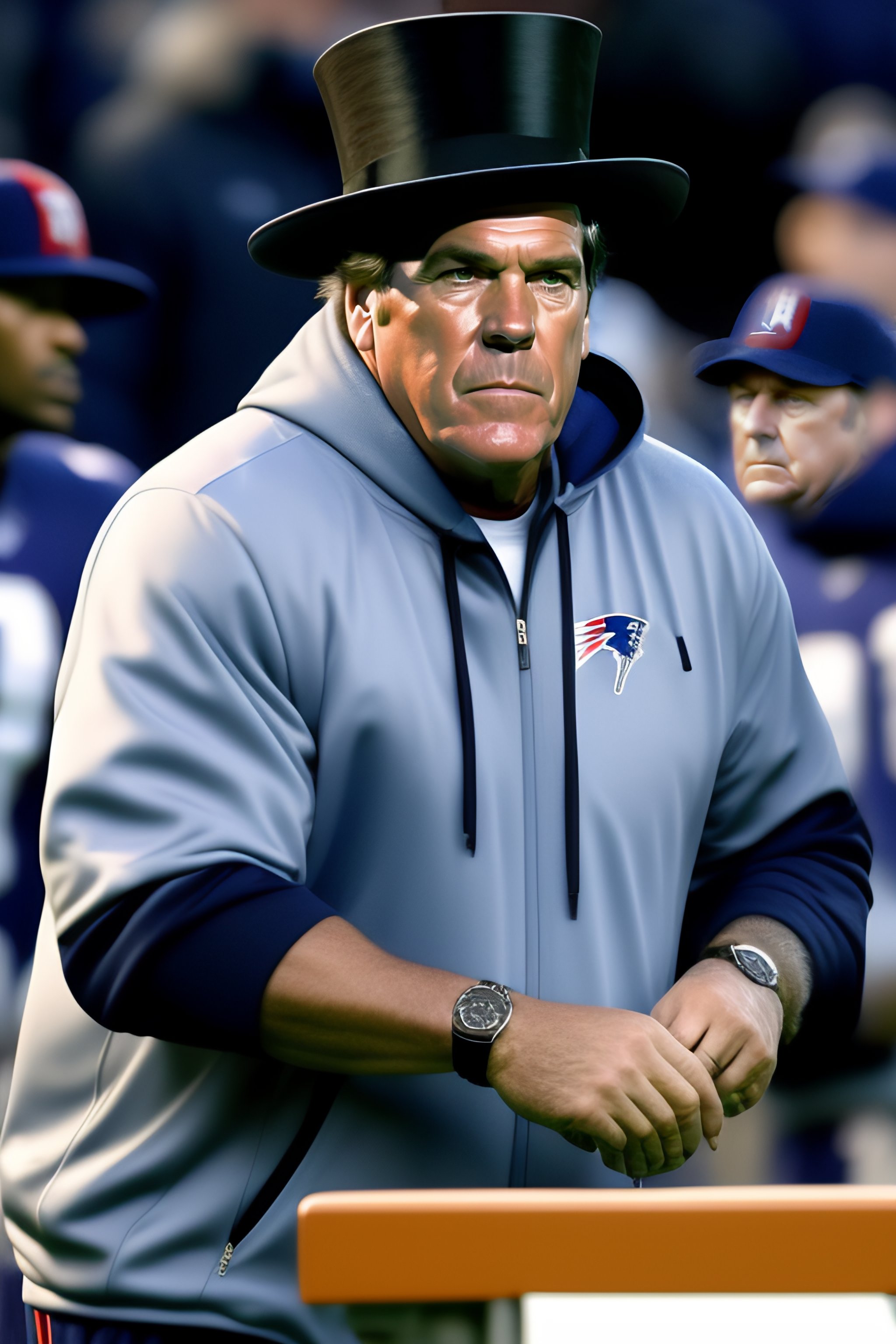 Bill belichick coach of new england patriots. bill belichick wearing a hooded sweatshirt with sleeves cutoff, wearing a top hat, smoking a cigar, in rage holding a tommy gun