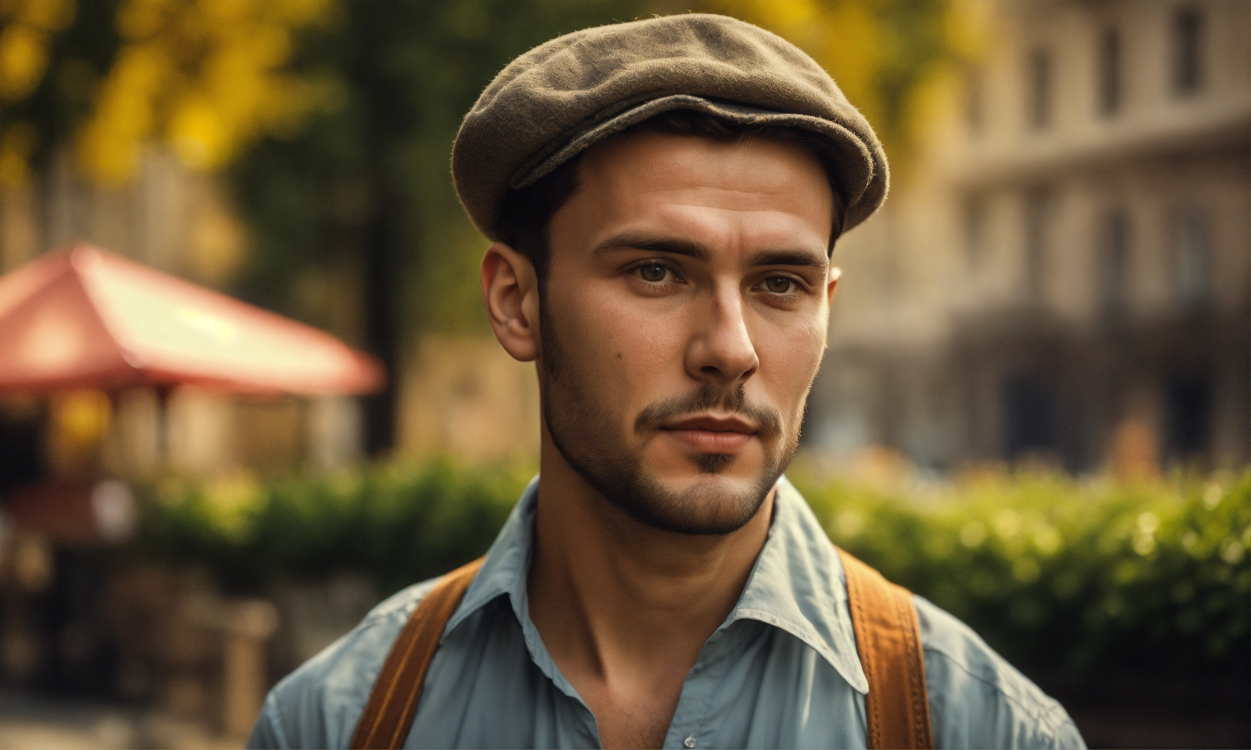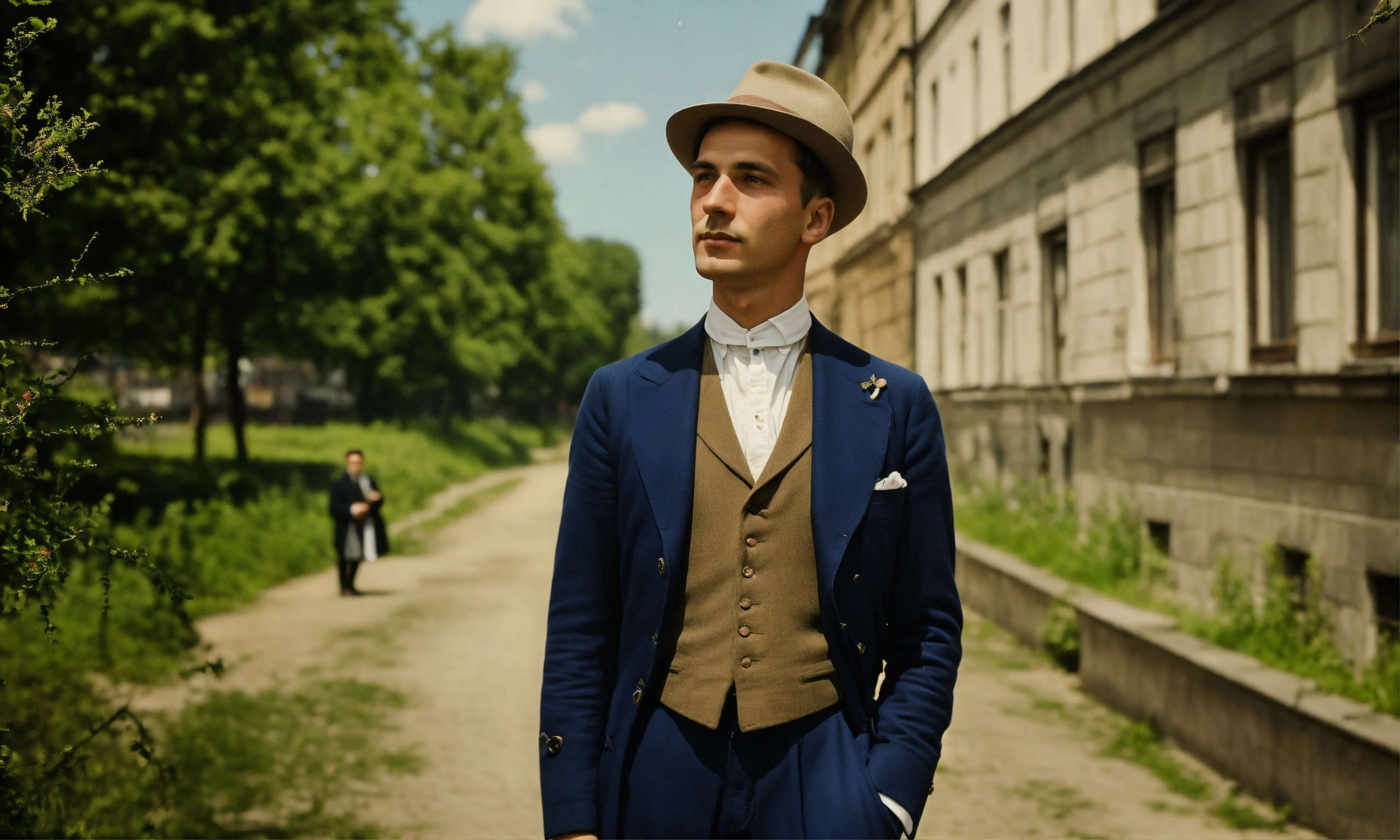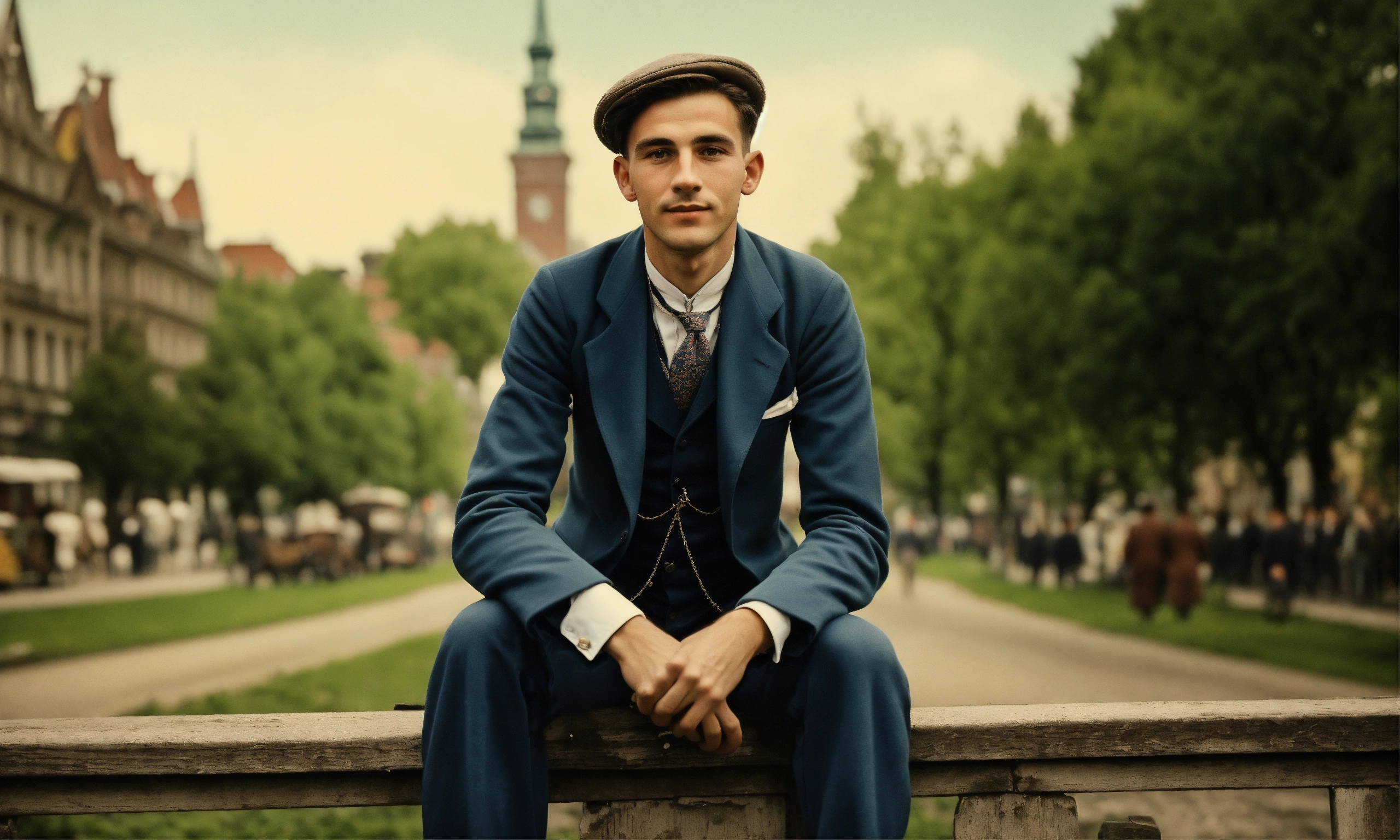 Warszawa 1920-1930, europian cute brunette poor fit man age 25, looks at the camera at full height, old-fashioned, the man exudes kindness, calmness and ambition.. warszawa 1920-1930, summer . retro style full haight.