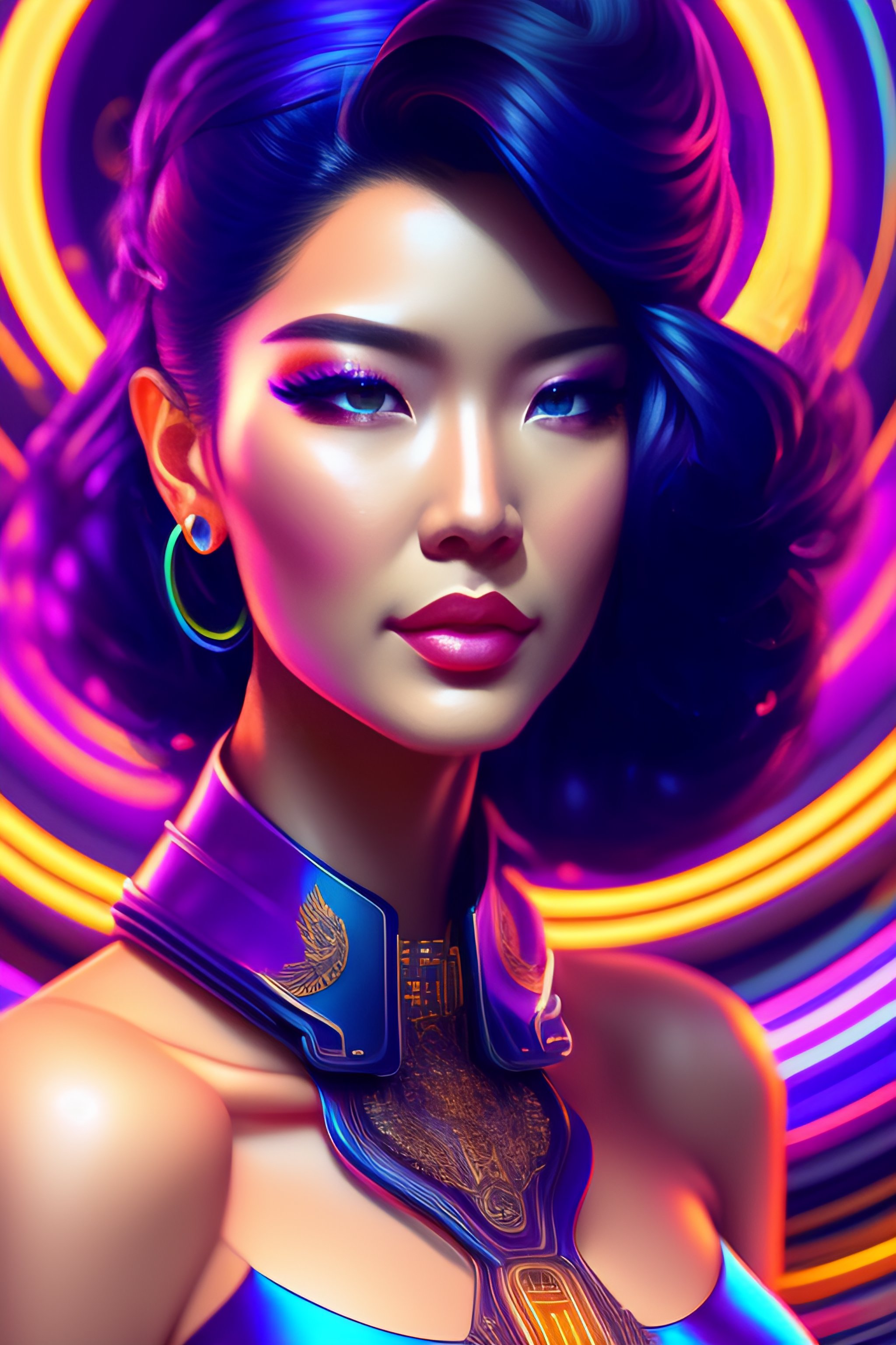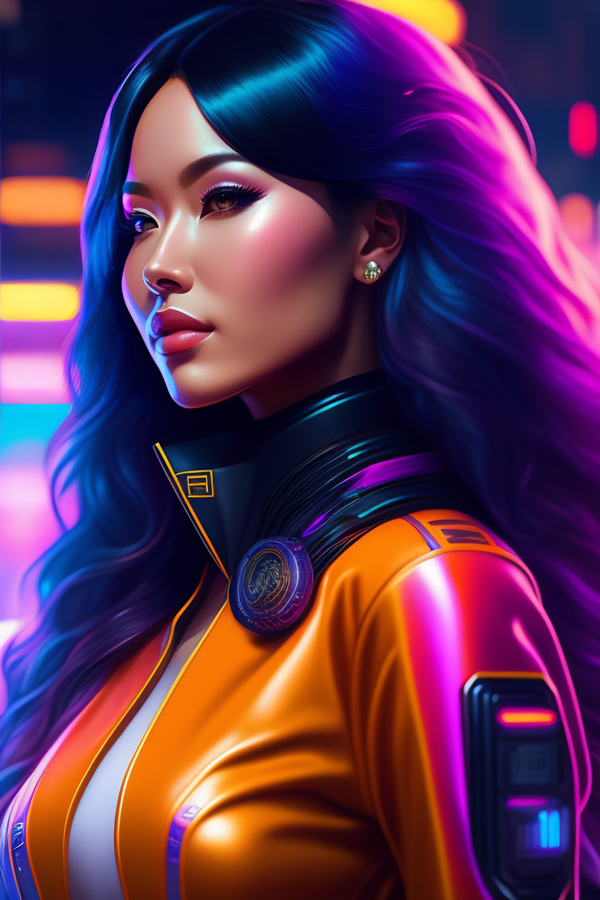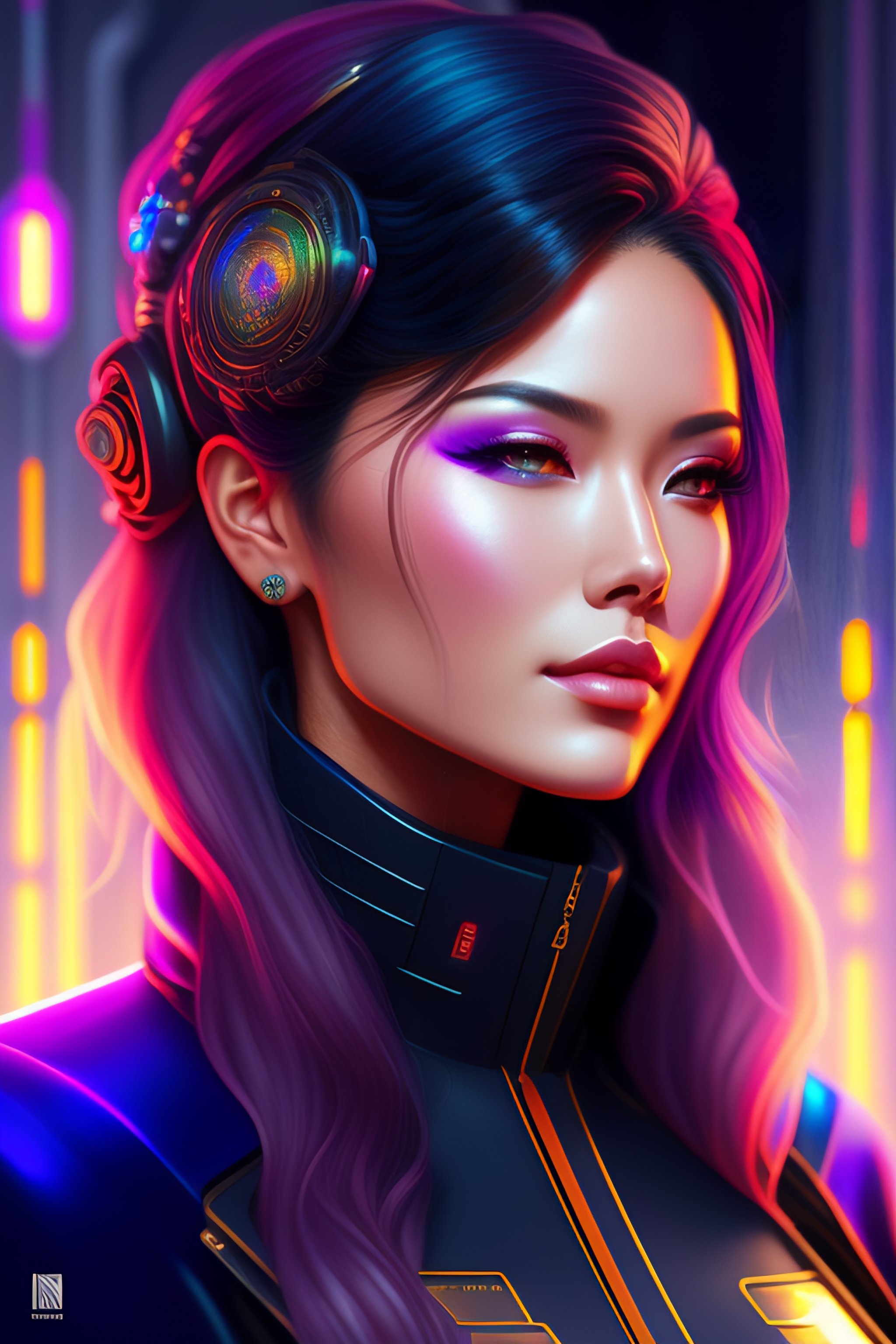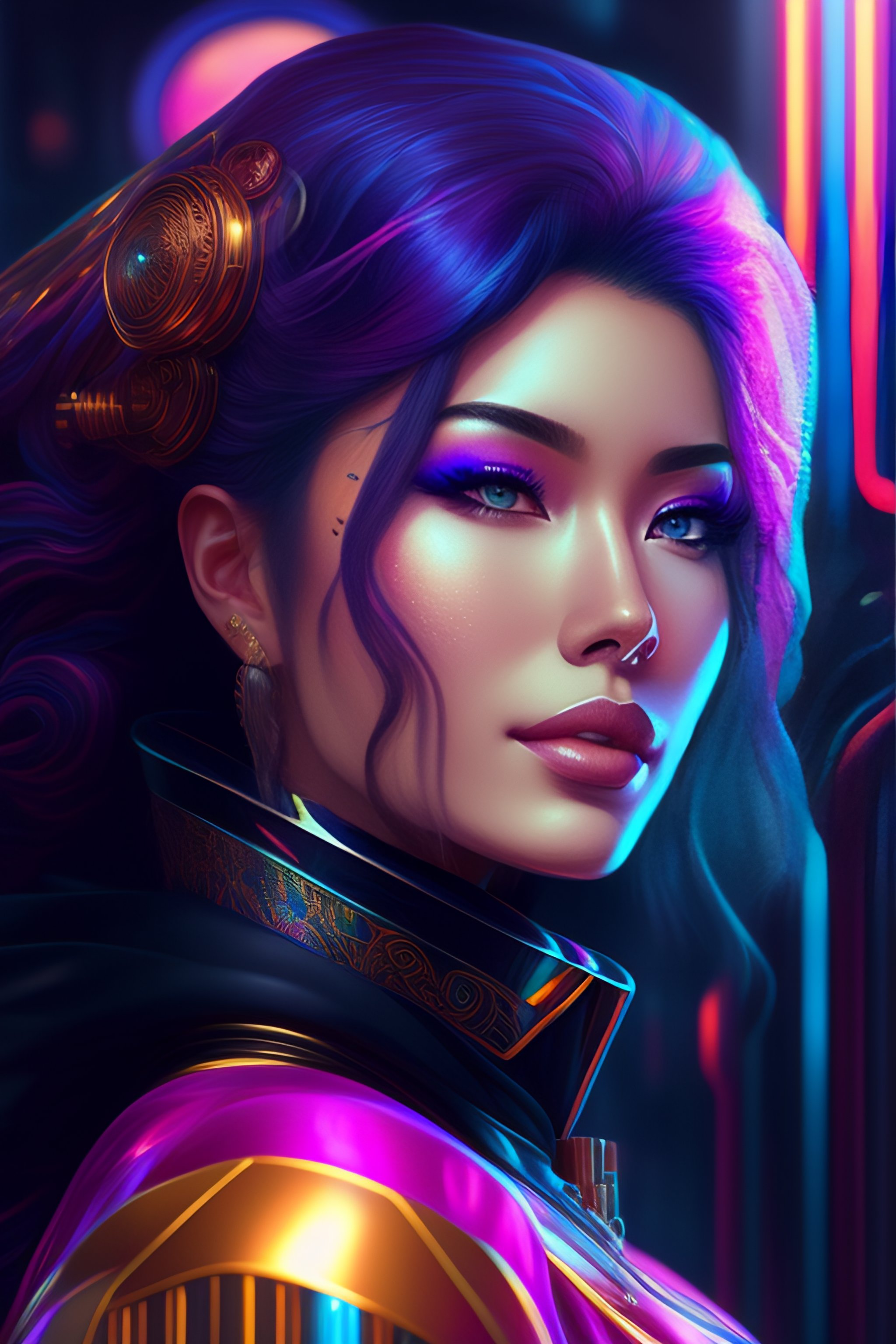 Beautiful android adult woman wearing netrunner clothing, extremely detailed face, cyberpunk, cybernetic, cyborg, vaporwave aesthetic, synthwave, flowing hair, colorful, psychedelic, intricate, elegant, highly detailed, digital painting, artstation, concept art, smooth, sharp focus, illustration, art by artgerm and greg rutkowski and alphonse mucha