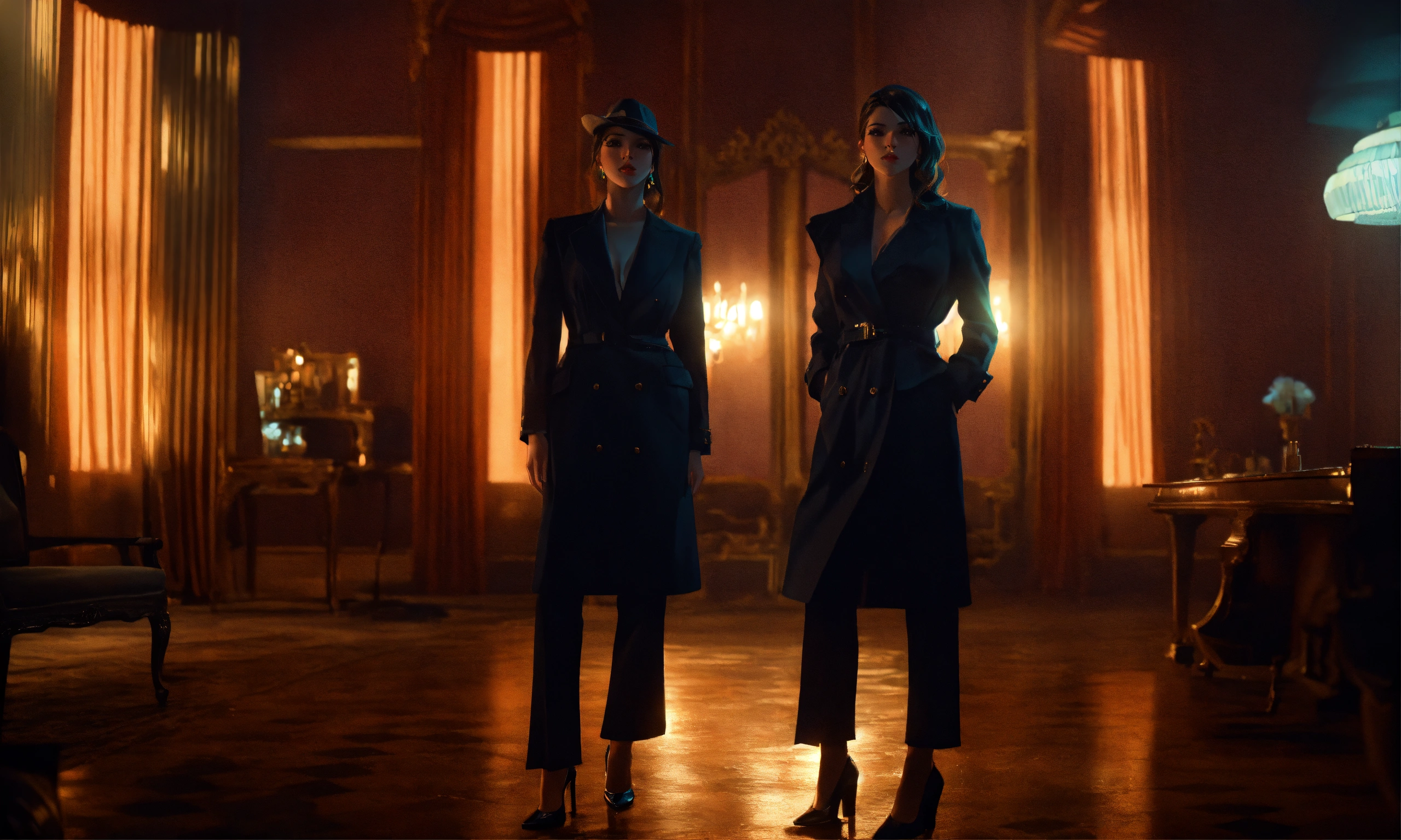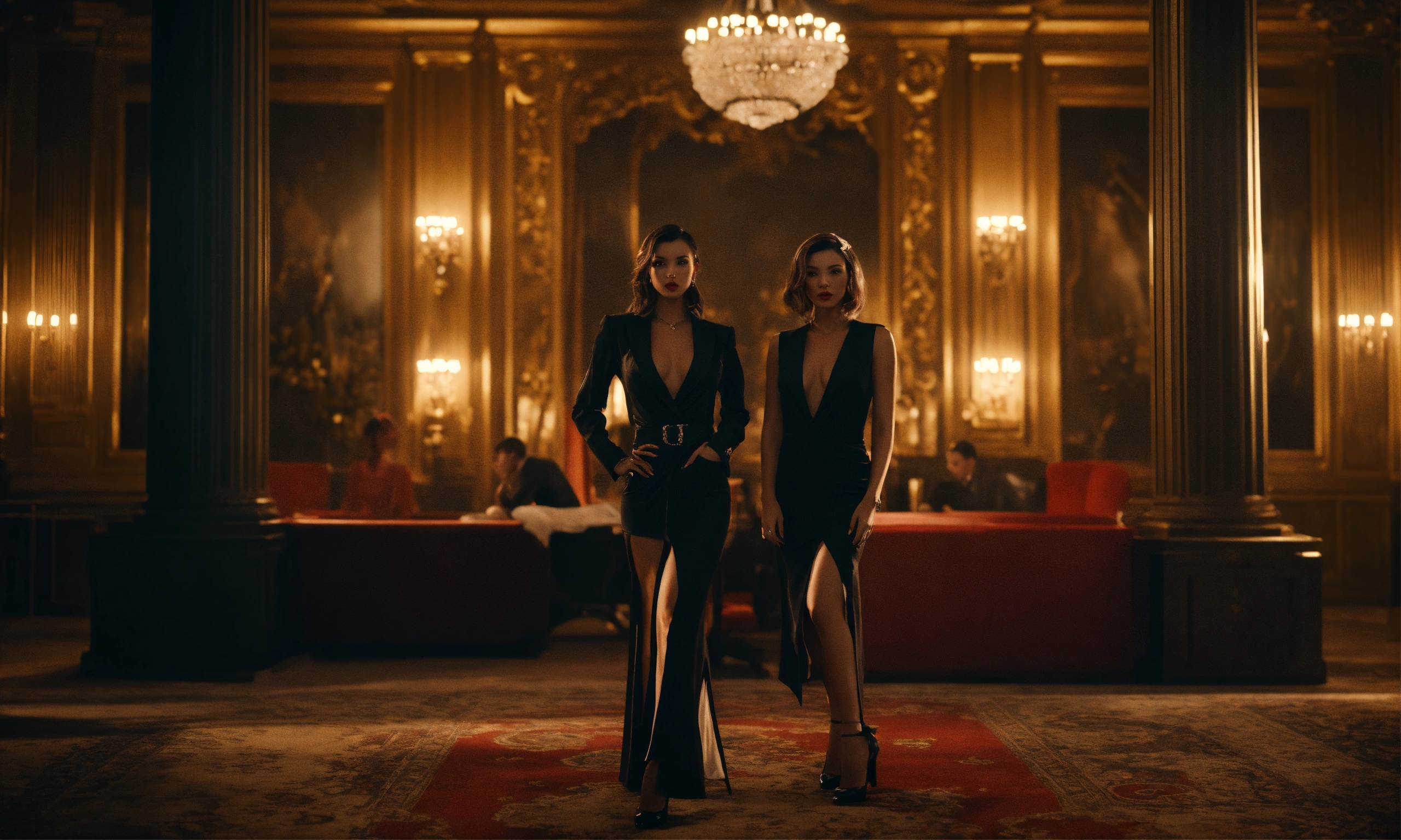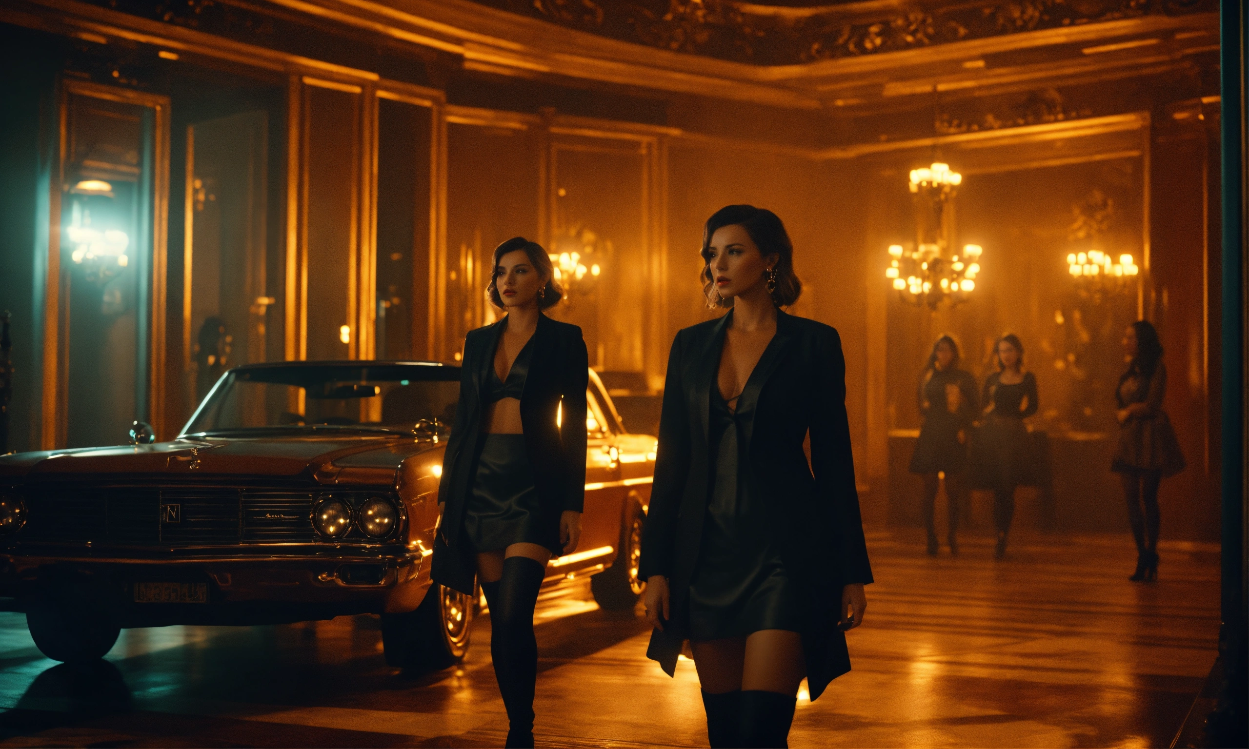 Mafia girls standing in artistic set of music video, night interior, mood lighting, wide front shot, 8k, luxcorerender, earthly colour, cinematic photography, real humans, real images, matte finish, shot on arri anamorphic, extreme wide shot, smooth, sharp focus, ornate, highly dynamic, particulate, hyperreal, wide shot