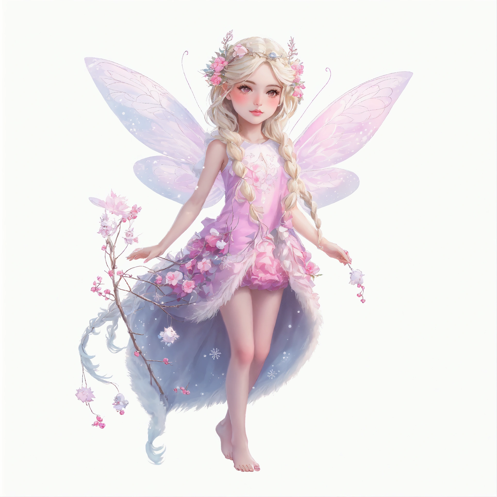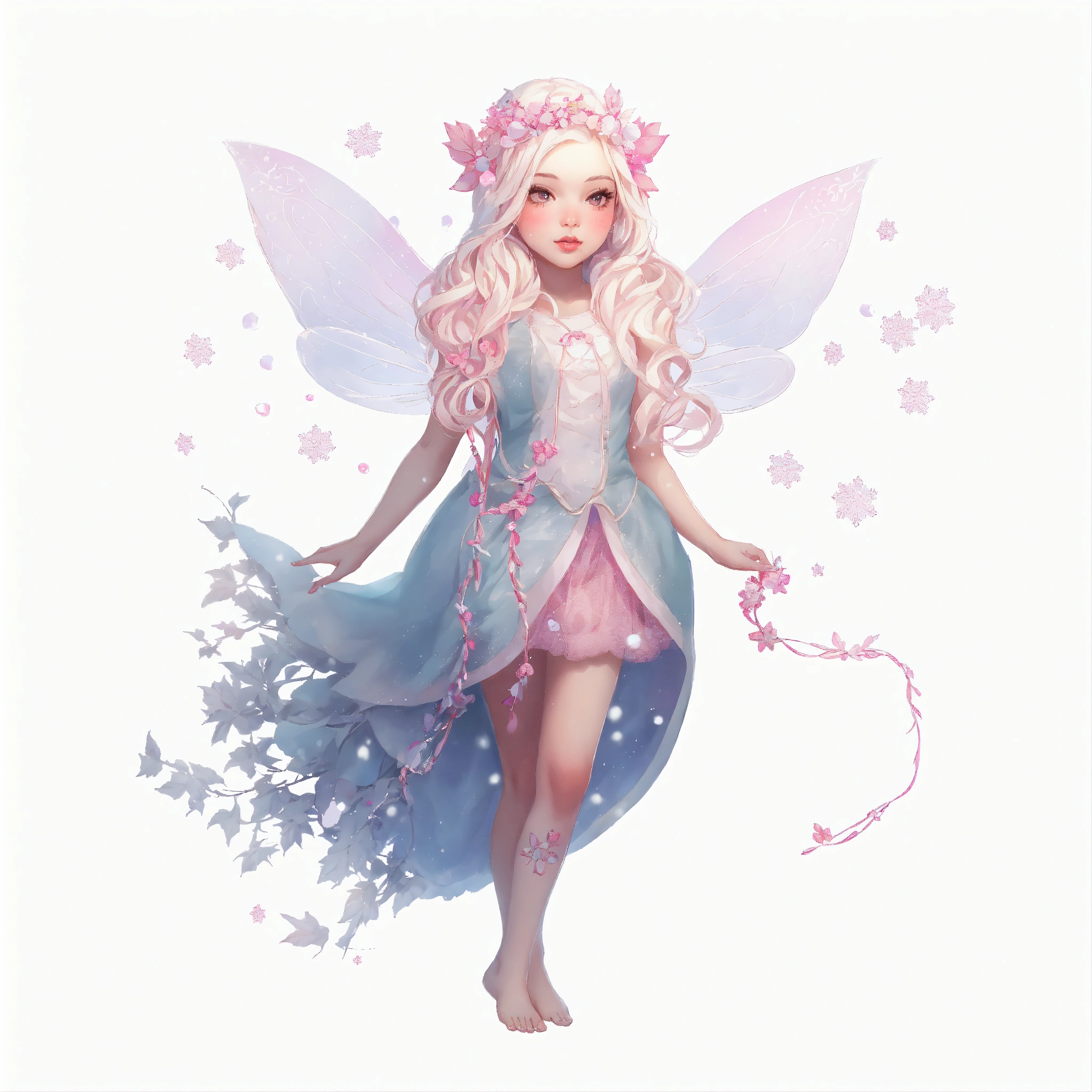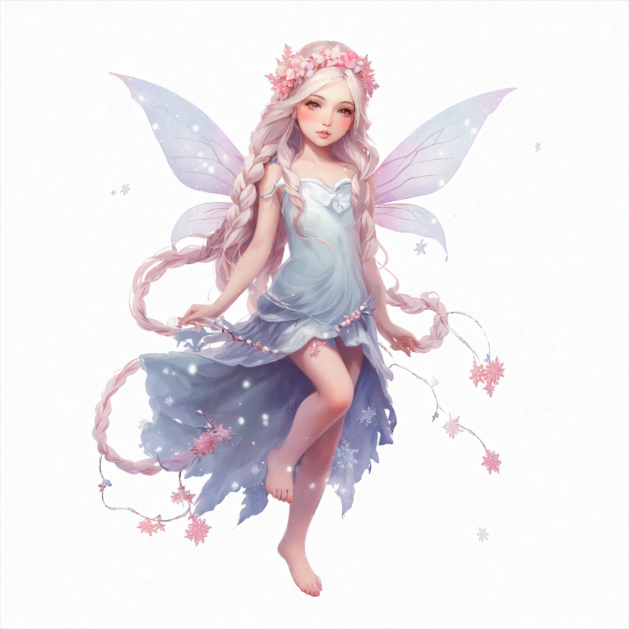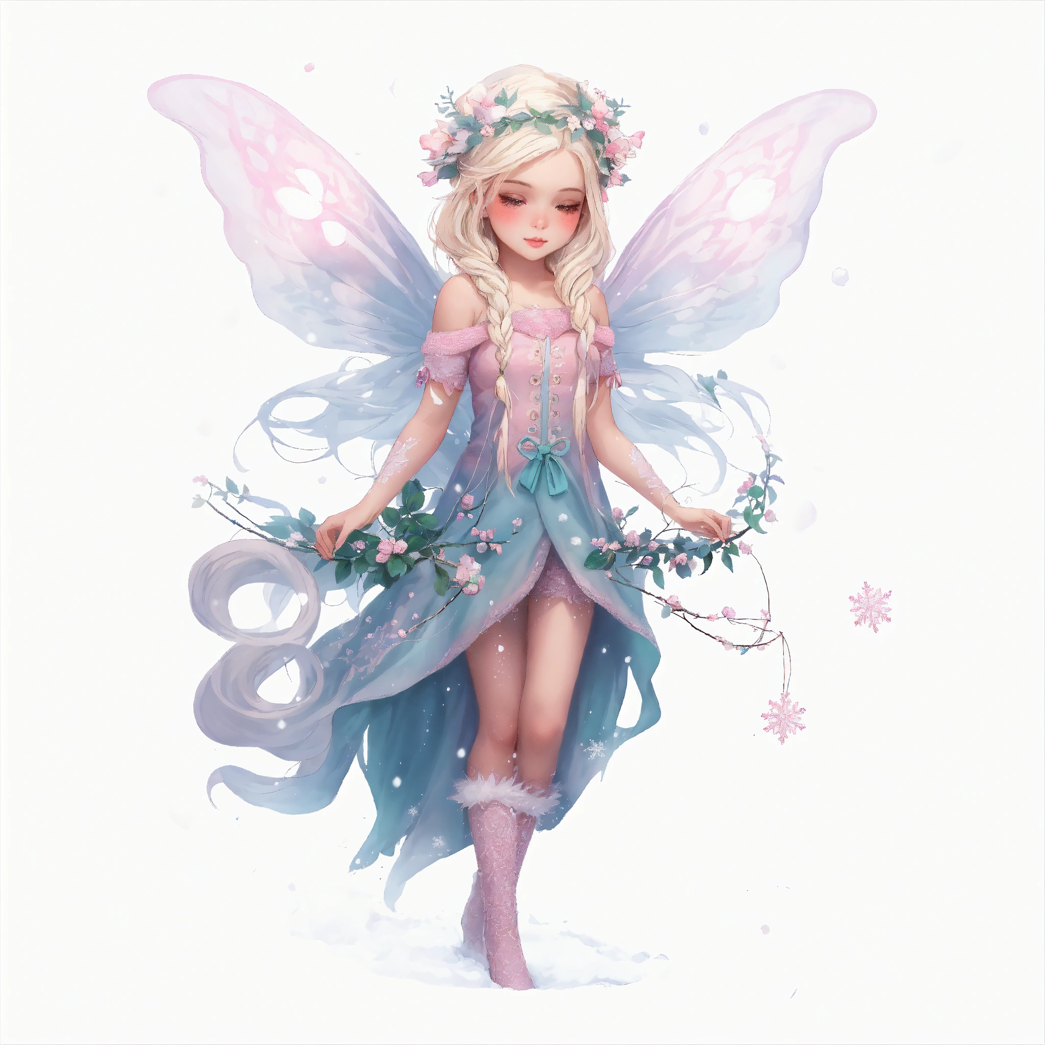 Full body of a realistic sweetness baby chibi snow fairy girl winter freckled two braids in her long white blonde hair she is playing in a enchanted winter magic garden, clipart digital art style, pink colors, very detailed, by stanley artgerm and tom bagshaw, 32k