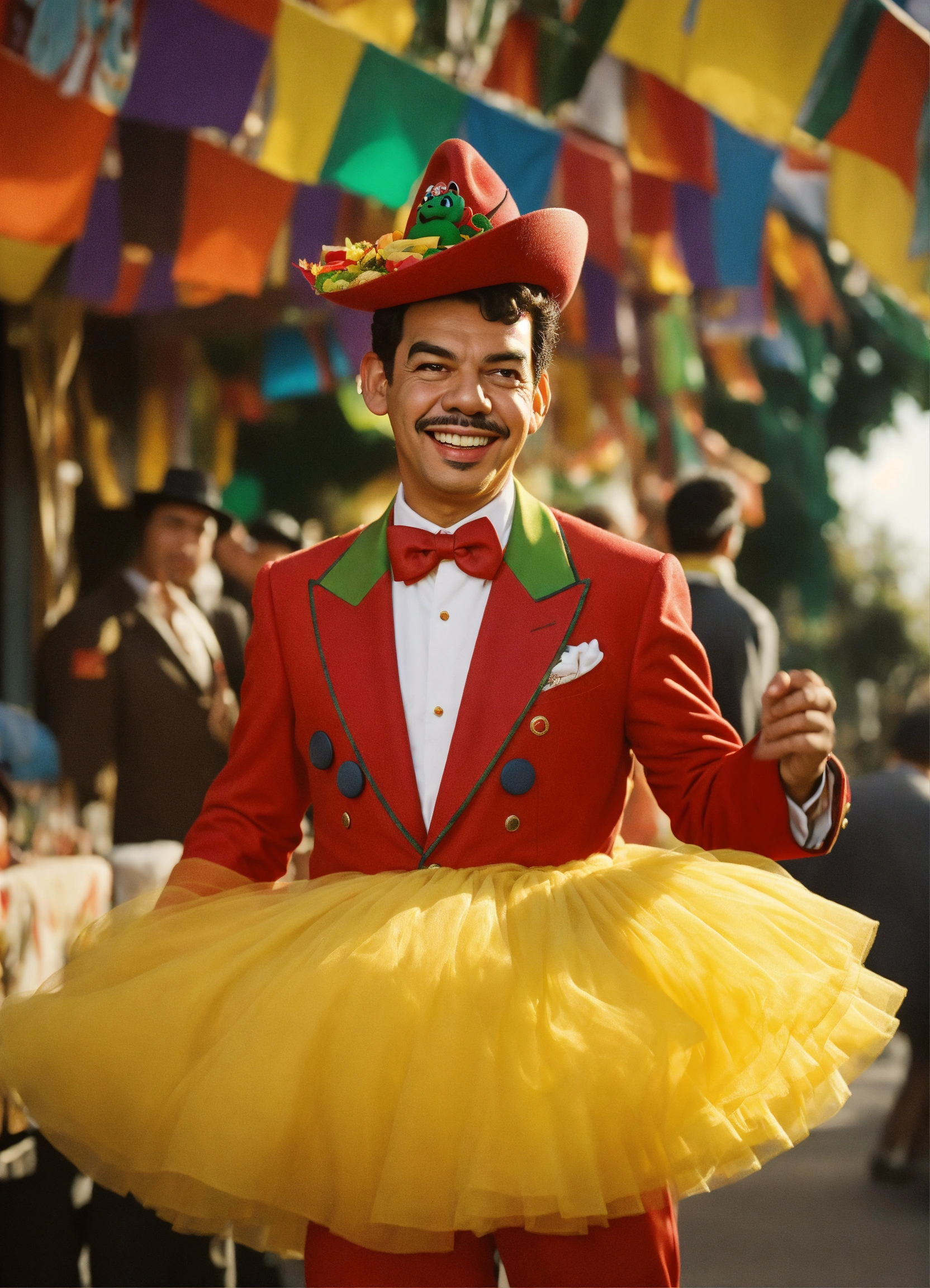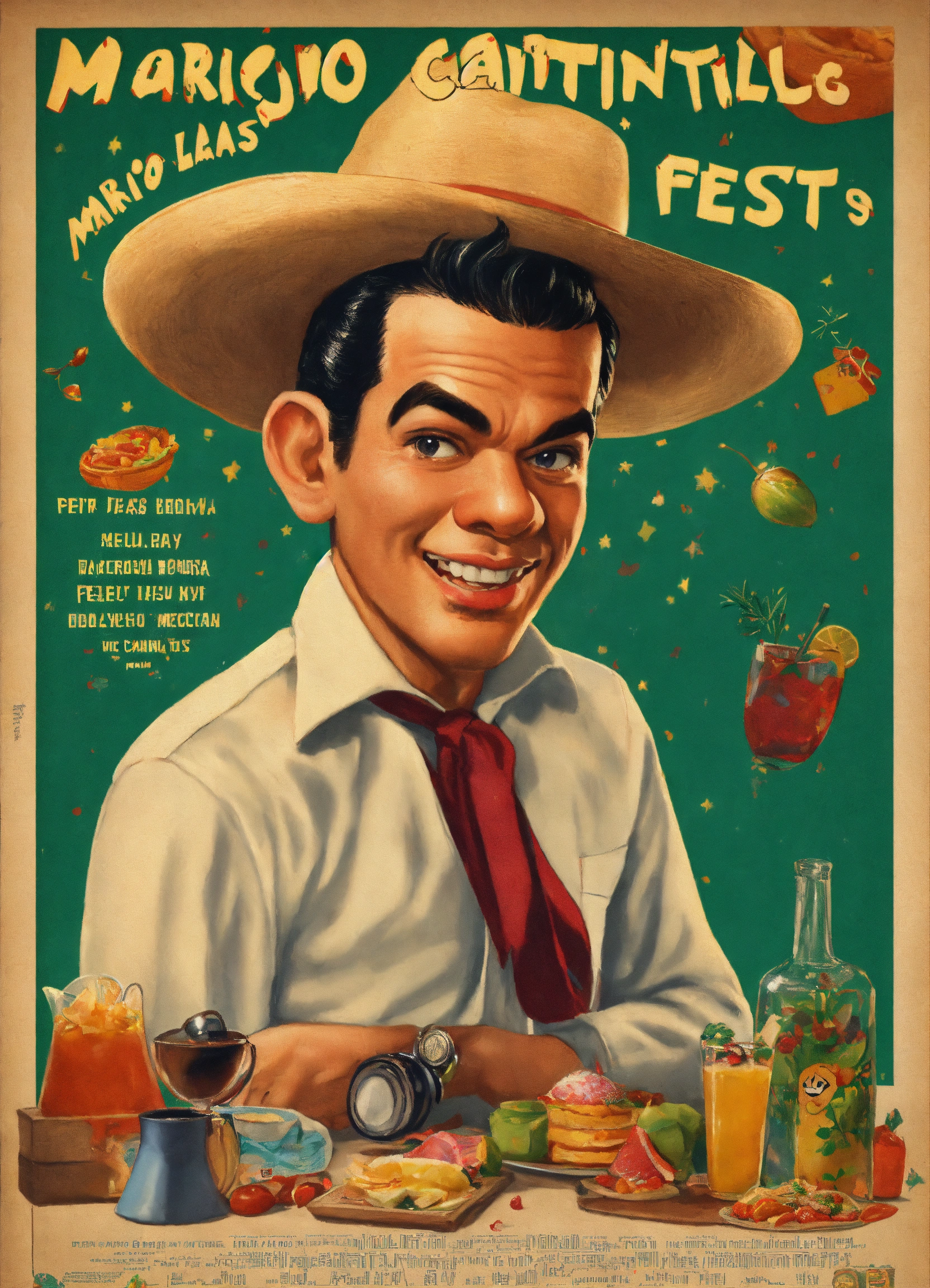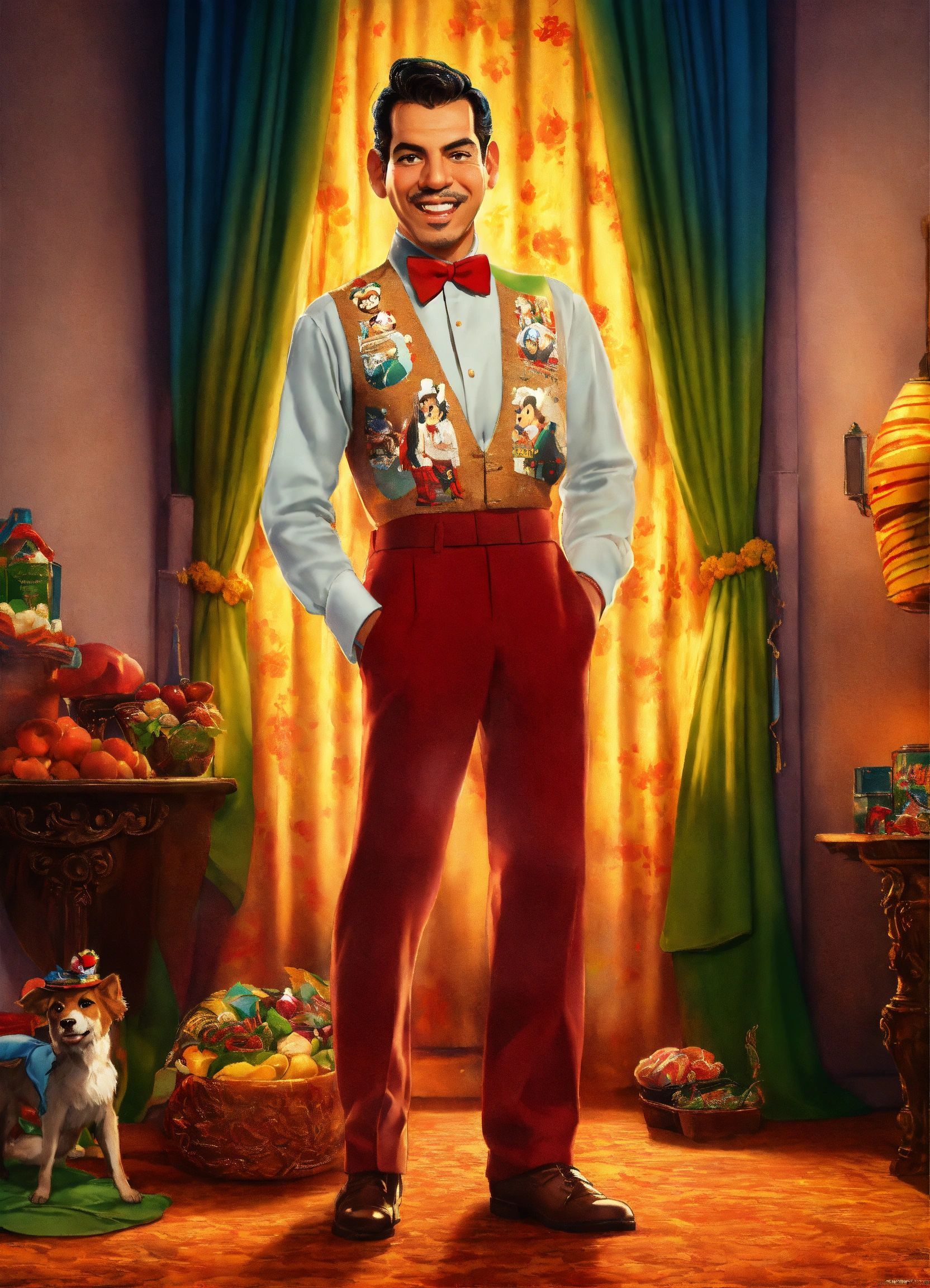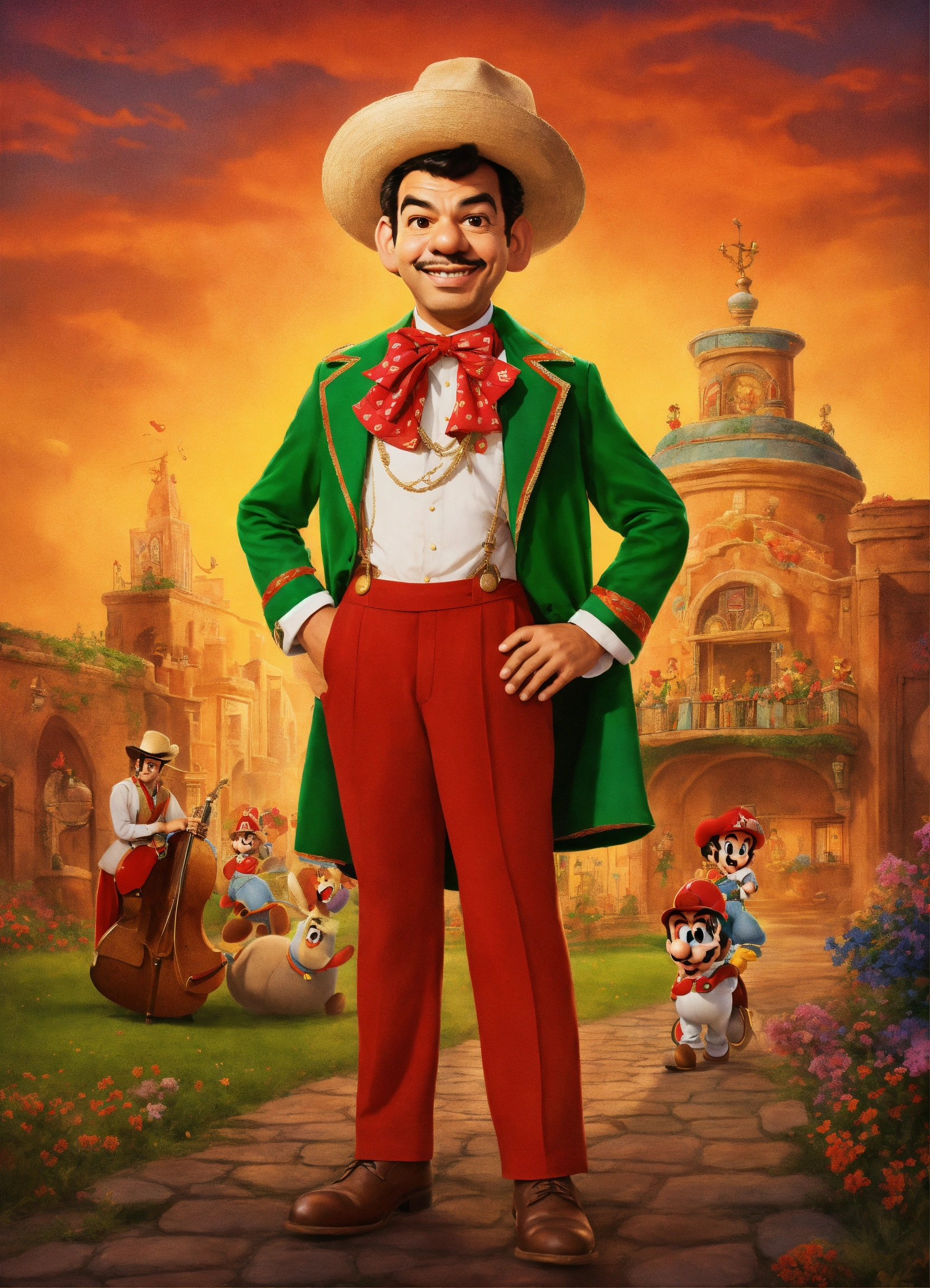 Mario moreno cantinflas con ropa tradicional, caminando hacia una fiesta mexicana, con estilo de poster de película de disney pixar, realista