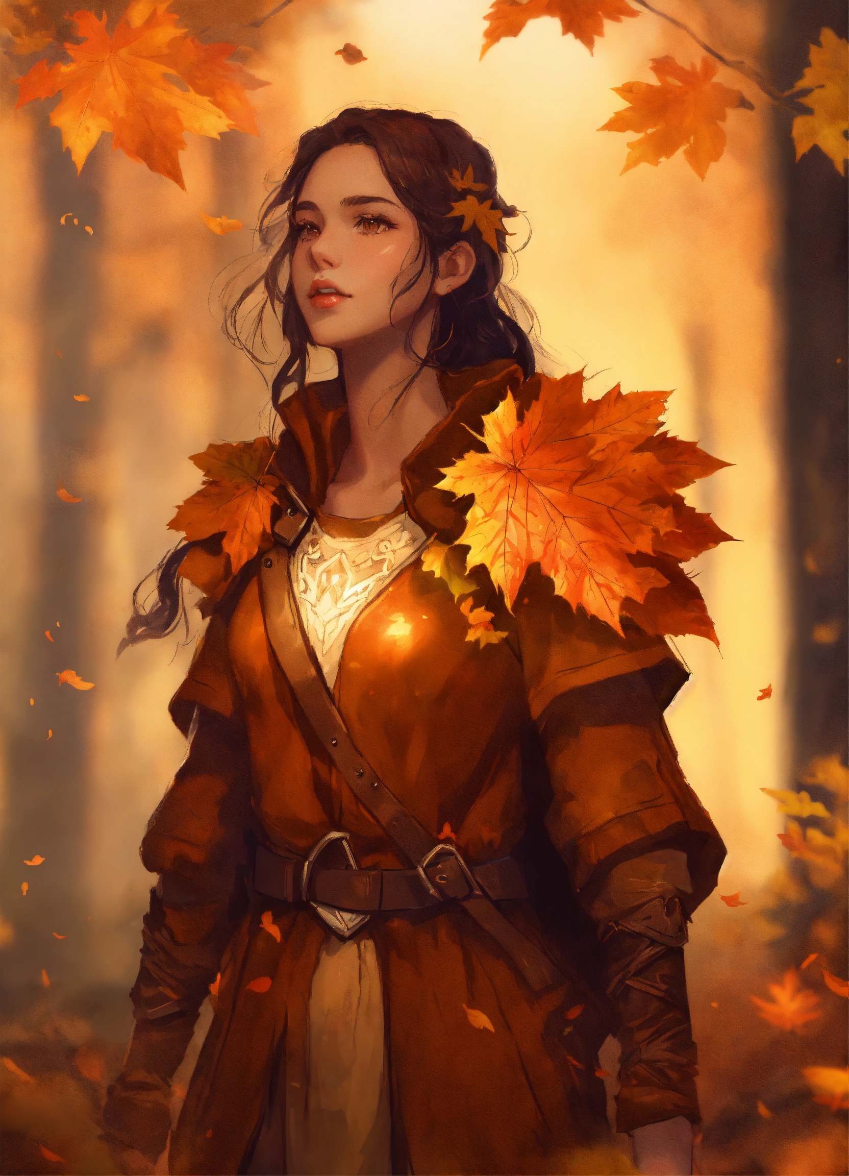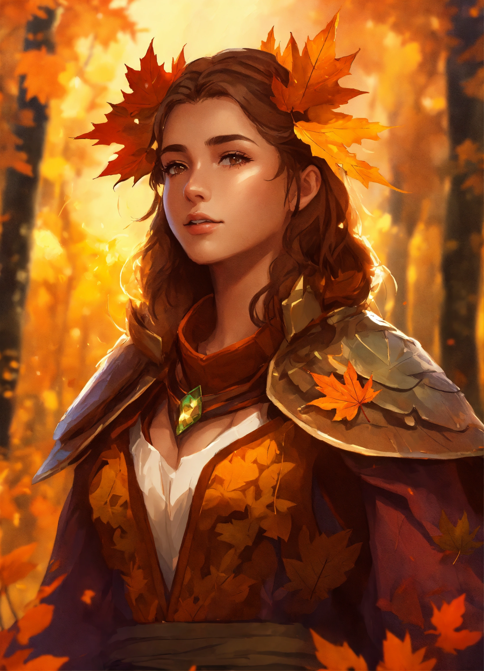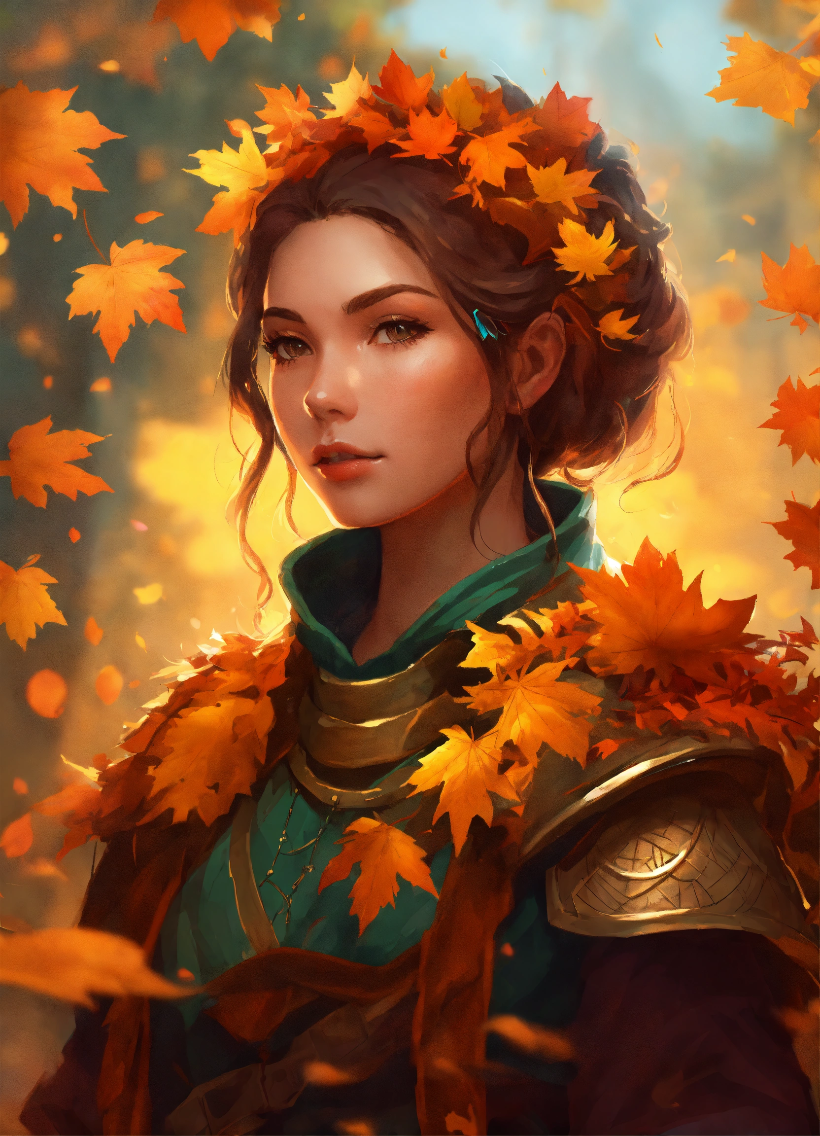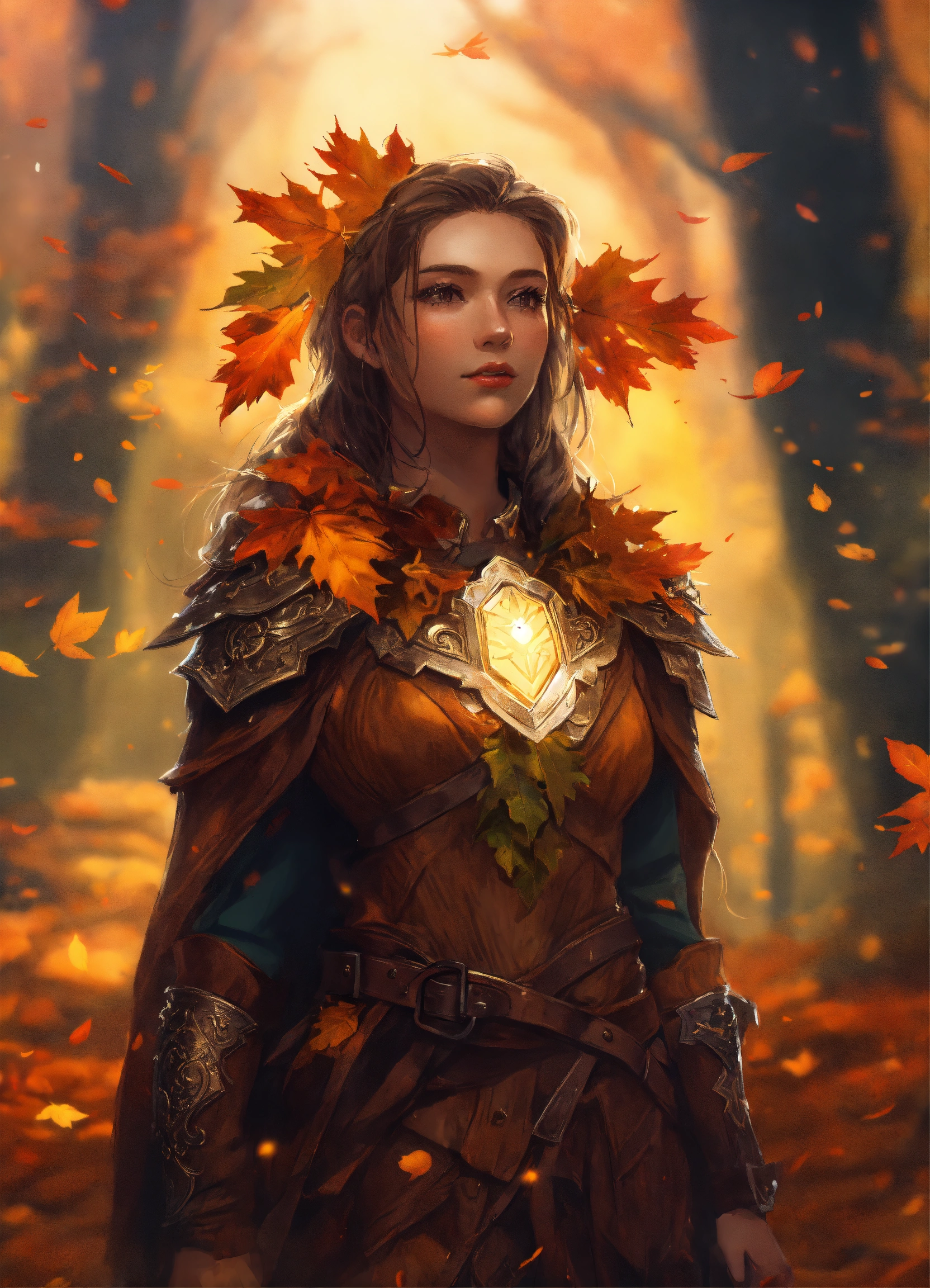 A girl with wooden shoulder pads and magical autumn glowing leaves on her shoulders, druid, concept art style