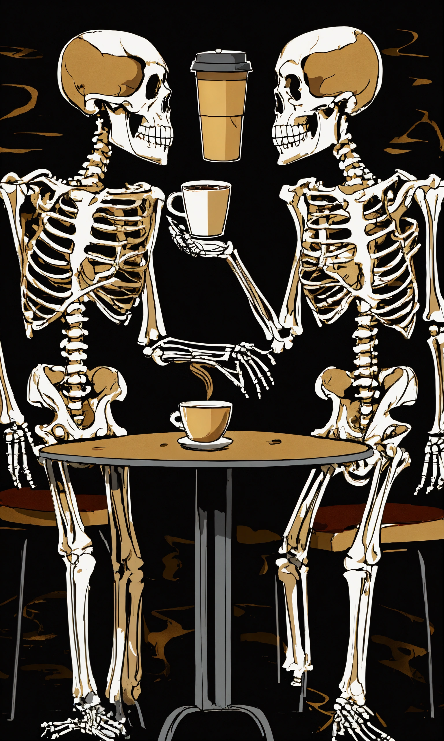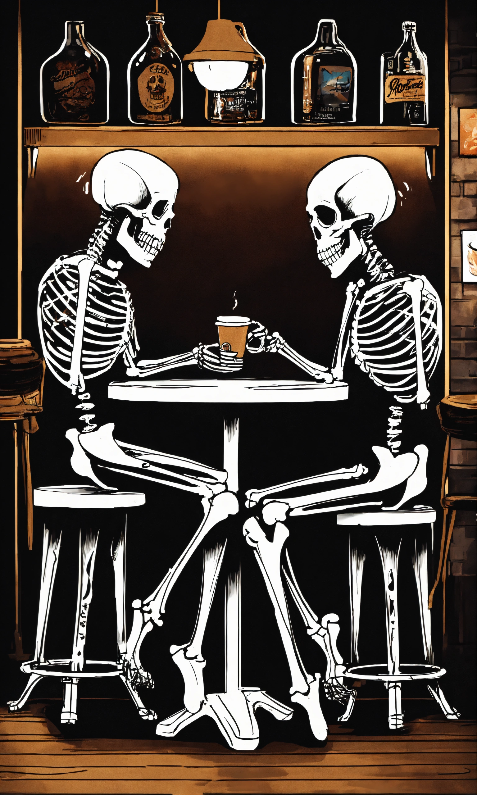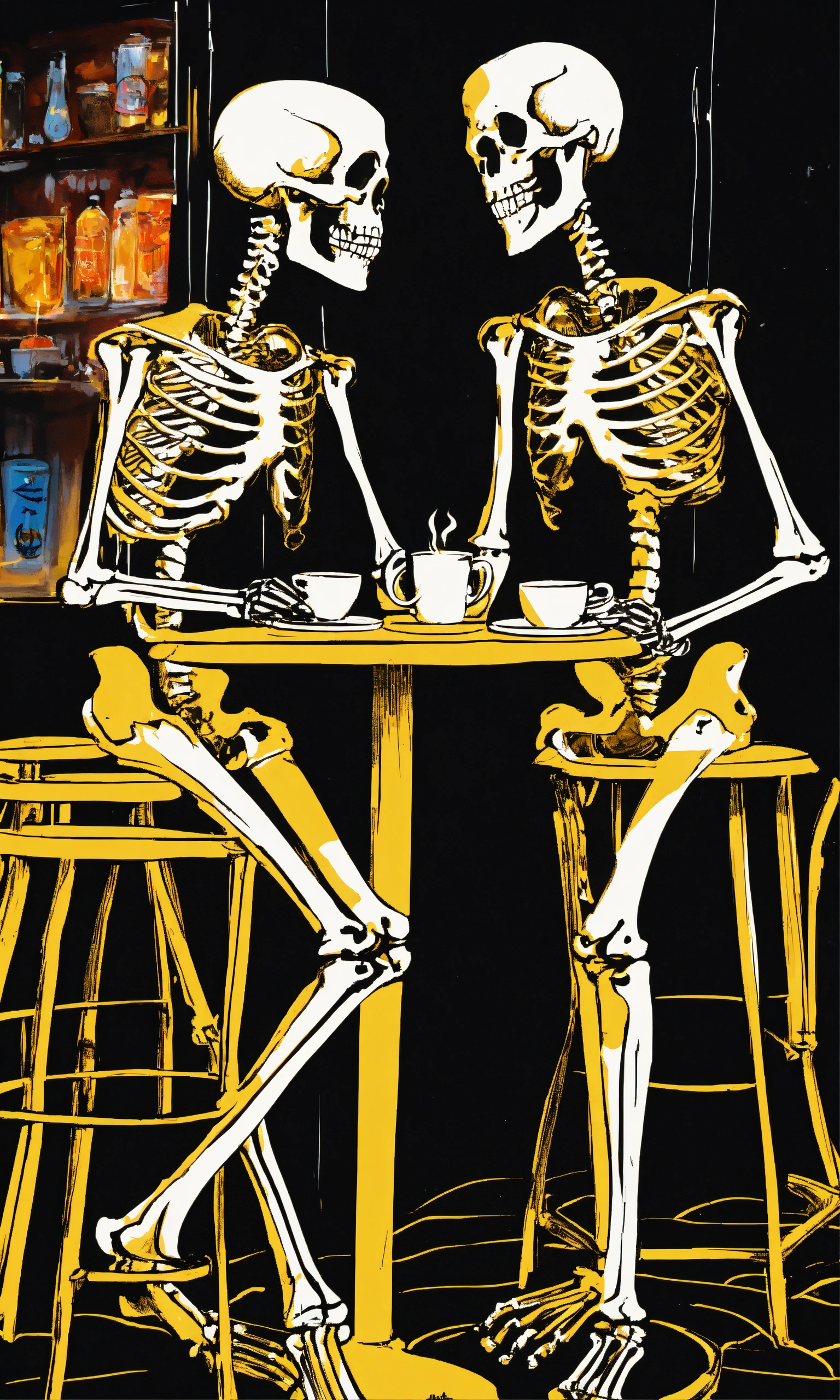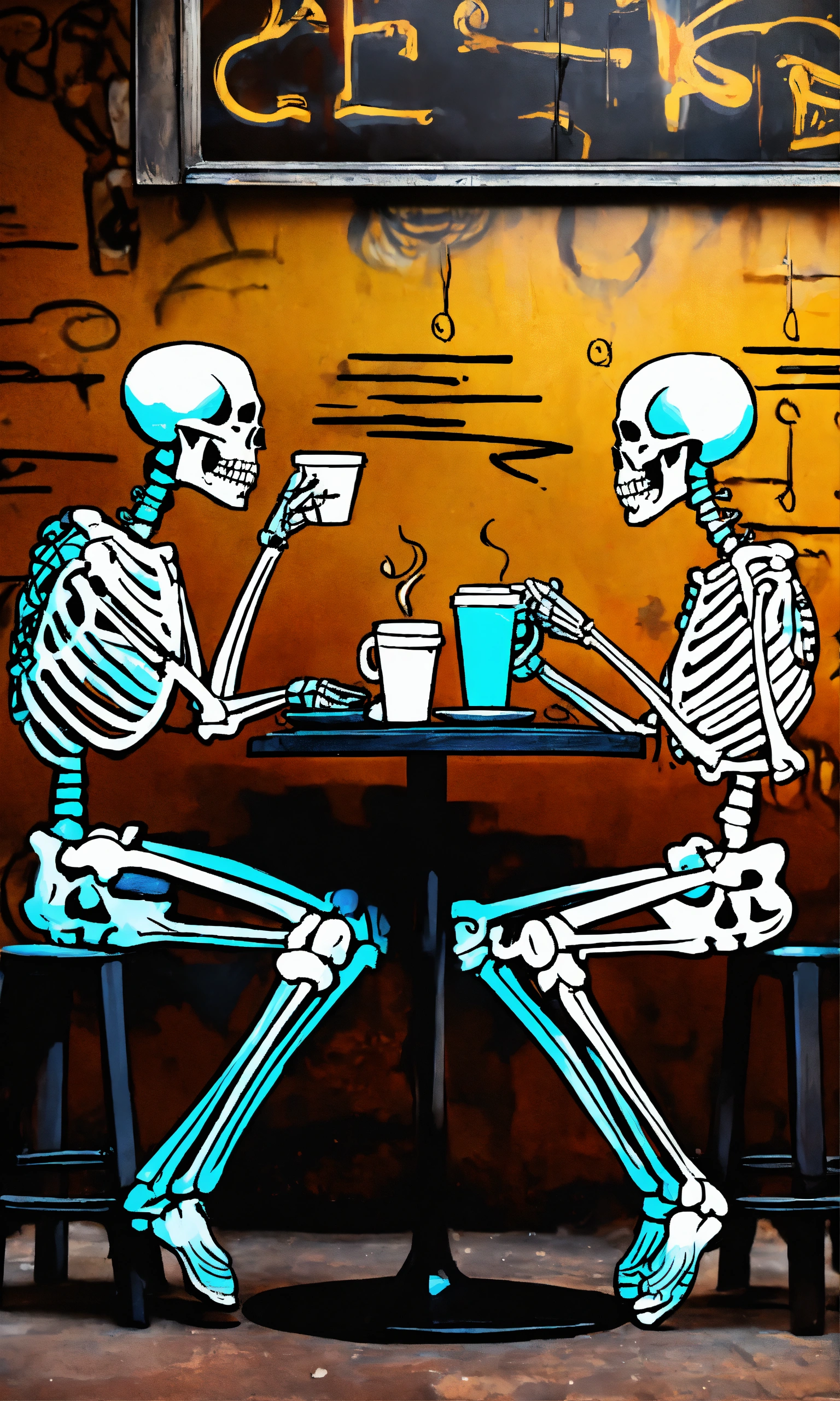 Graffiti template of two body skeletons addicted to coffee. talking at a standing table in a bar, with totally black background