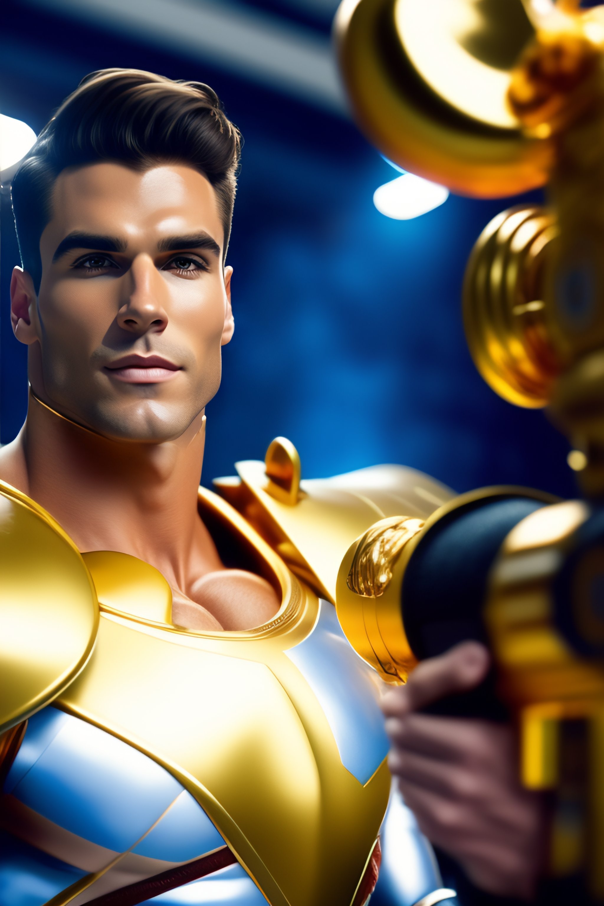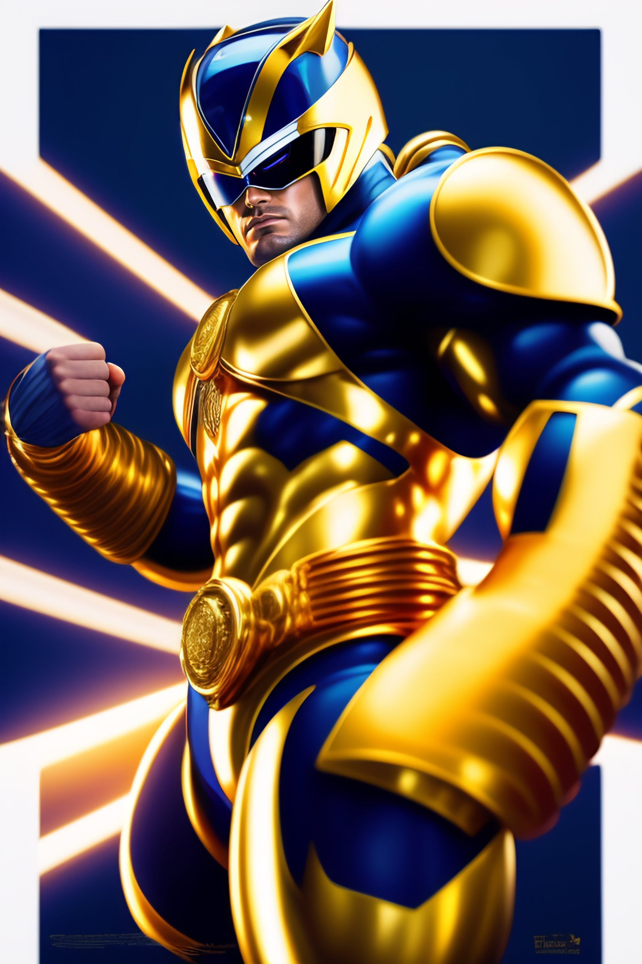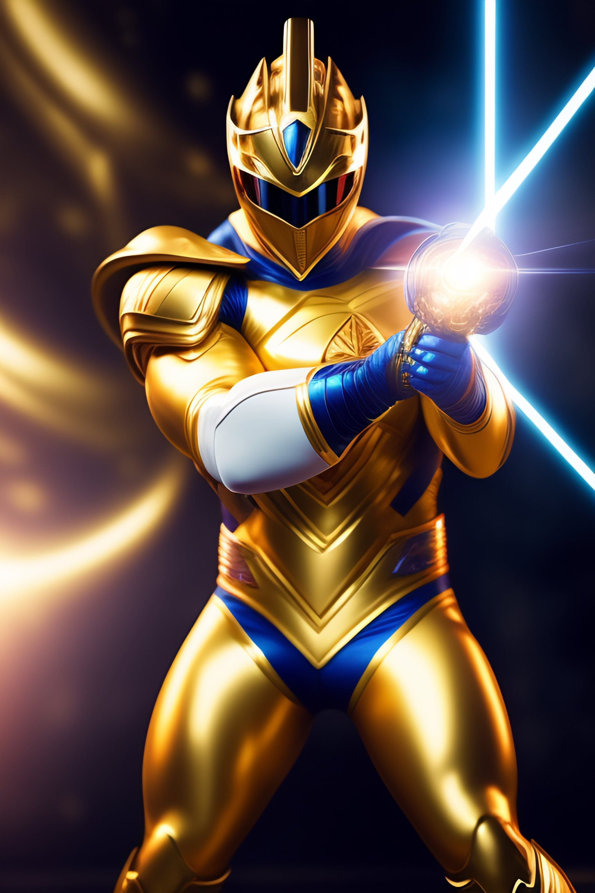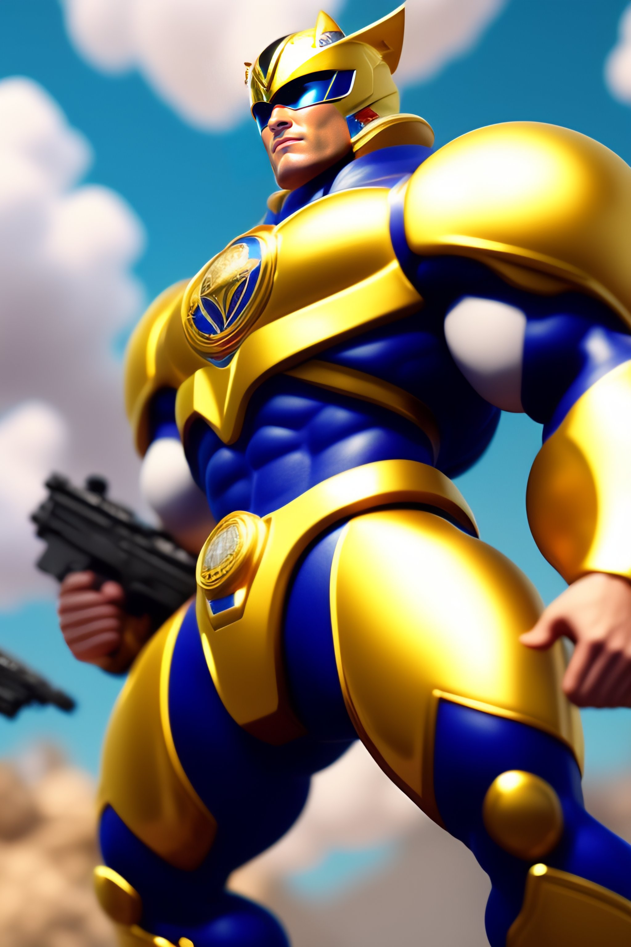 A cartoon buff white male with a gold and blue power ranger suit shooting a minigun