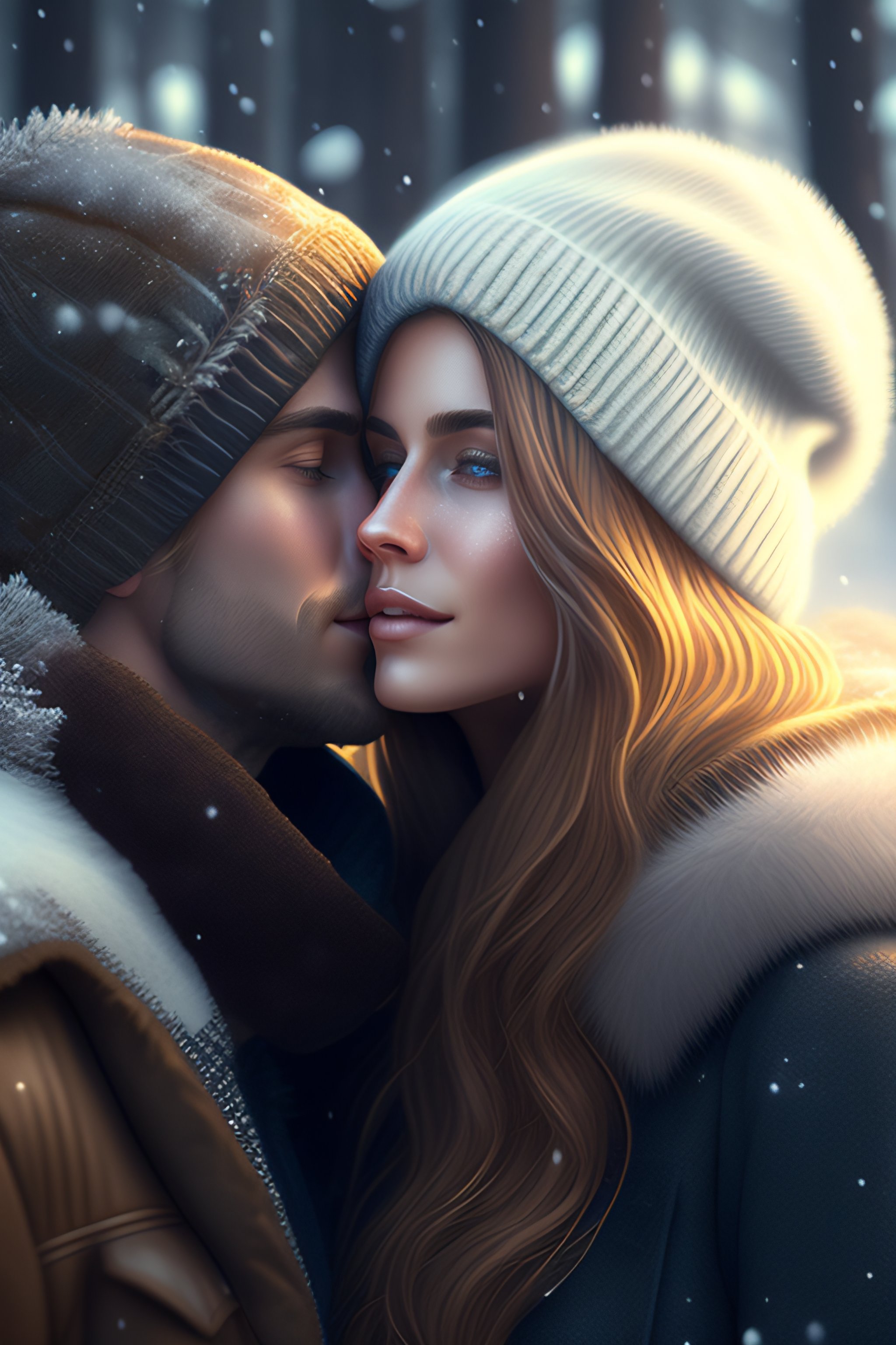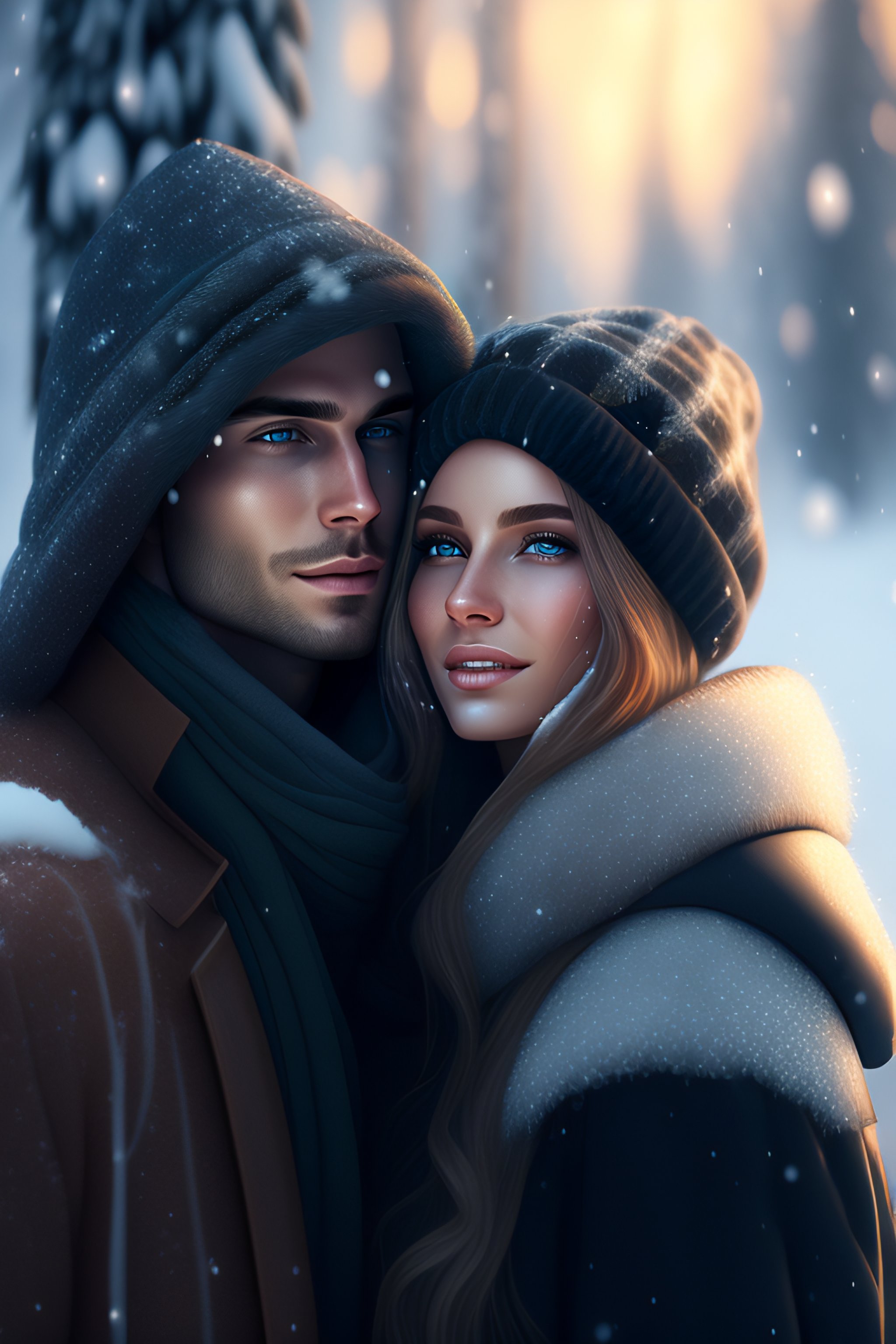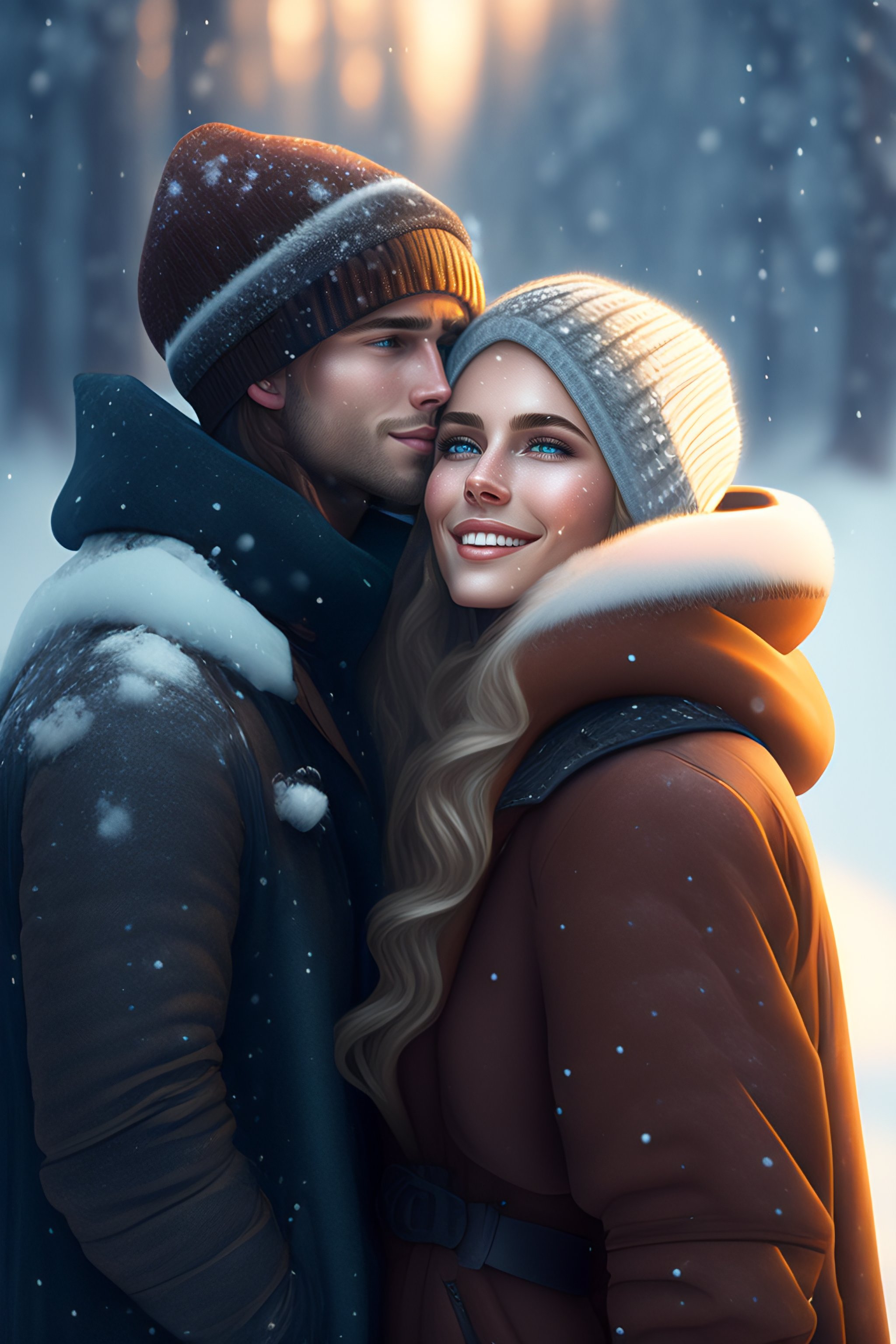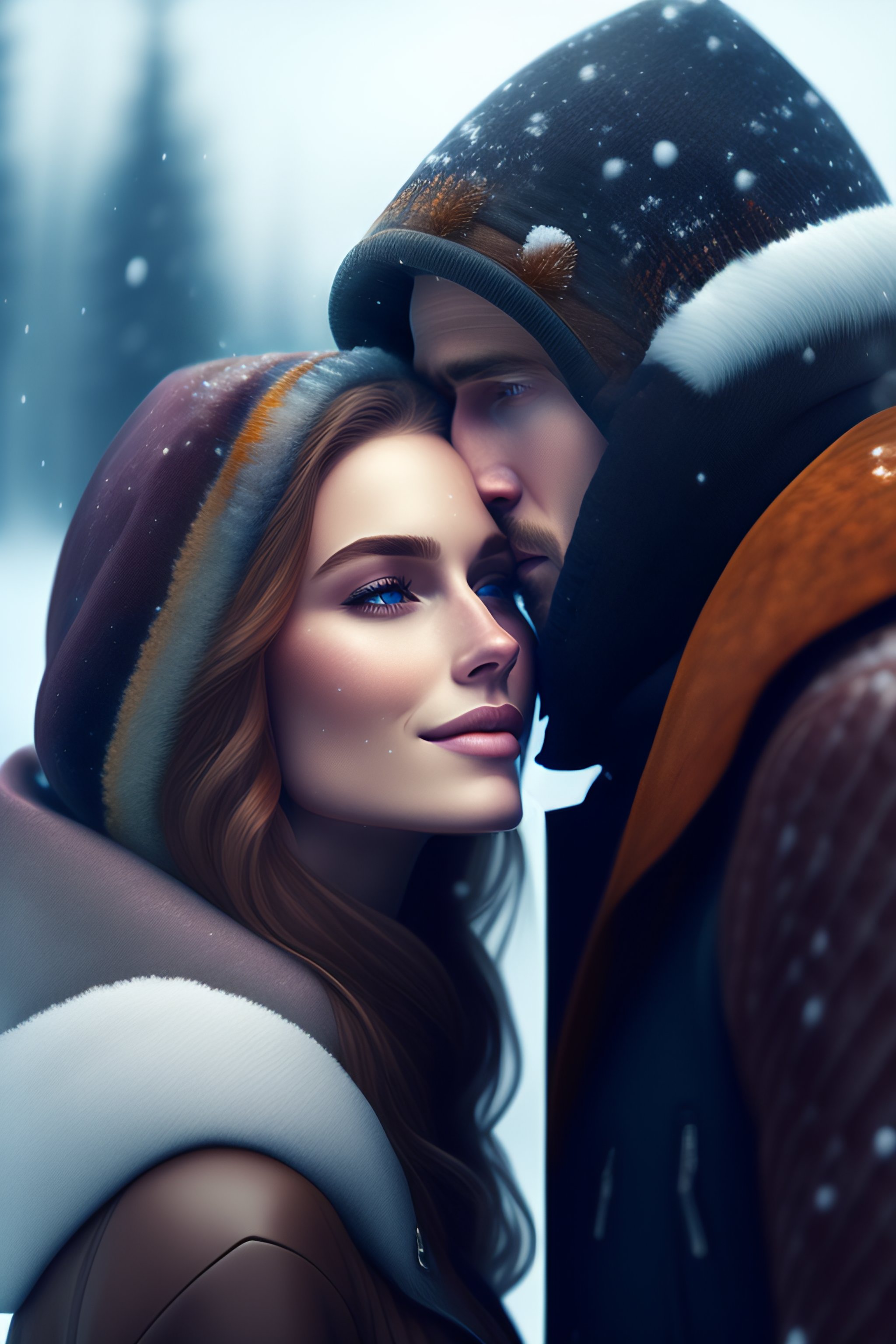 Couple kiss long hair highly detailed, digital painting, atmospheric lighting, octane render, unreal engine, professional forest growth is worth blond young handsome cute winter hood snow smile