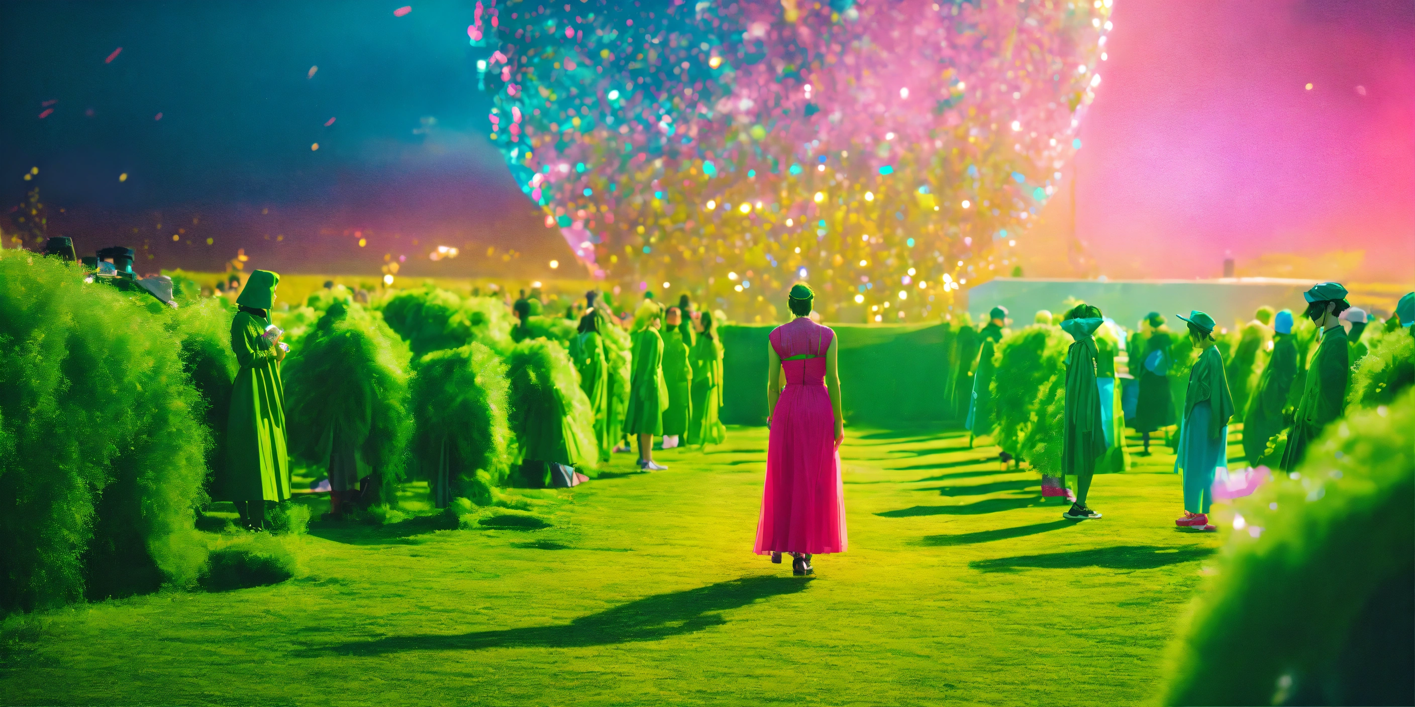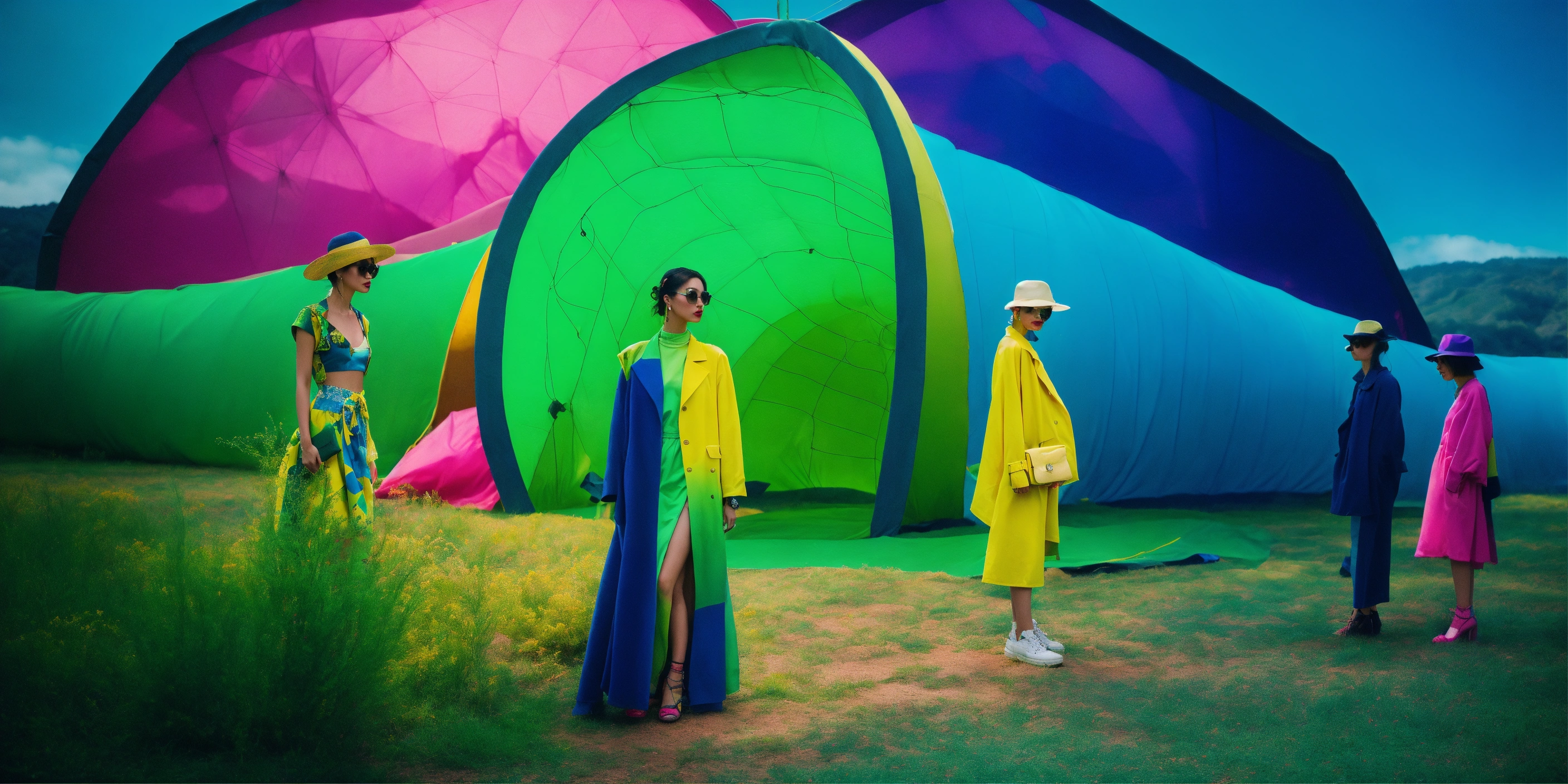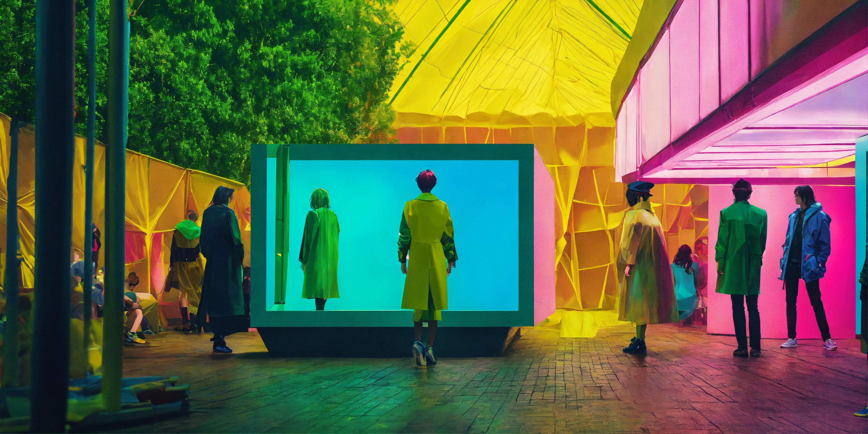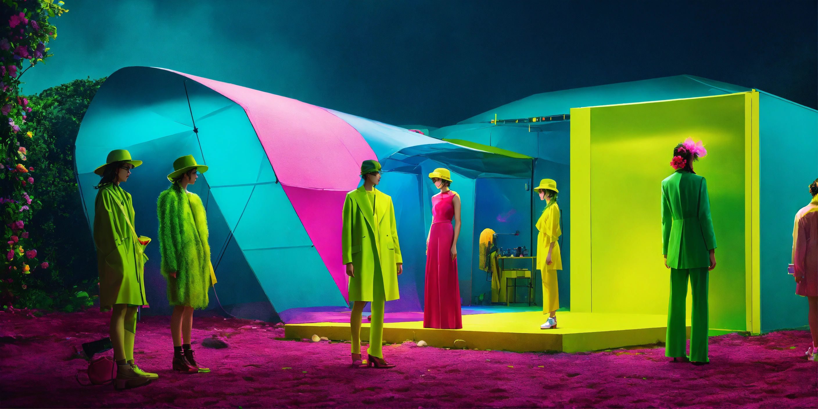 Technology festival. dreamlike. fashion outdoor scene, surreal scene. green, blue, yellow, fucsia tones, minimal and vibrant. fashion style hiper-realistic, high-detailed composition. 35mm. award winning photography.