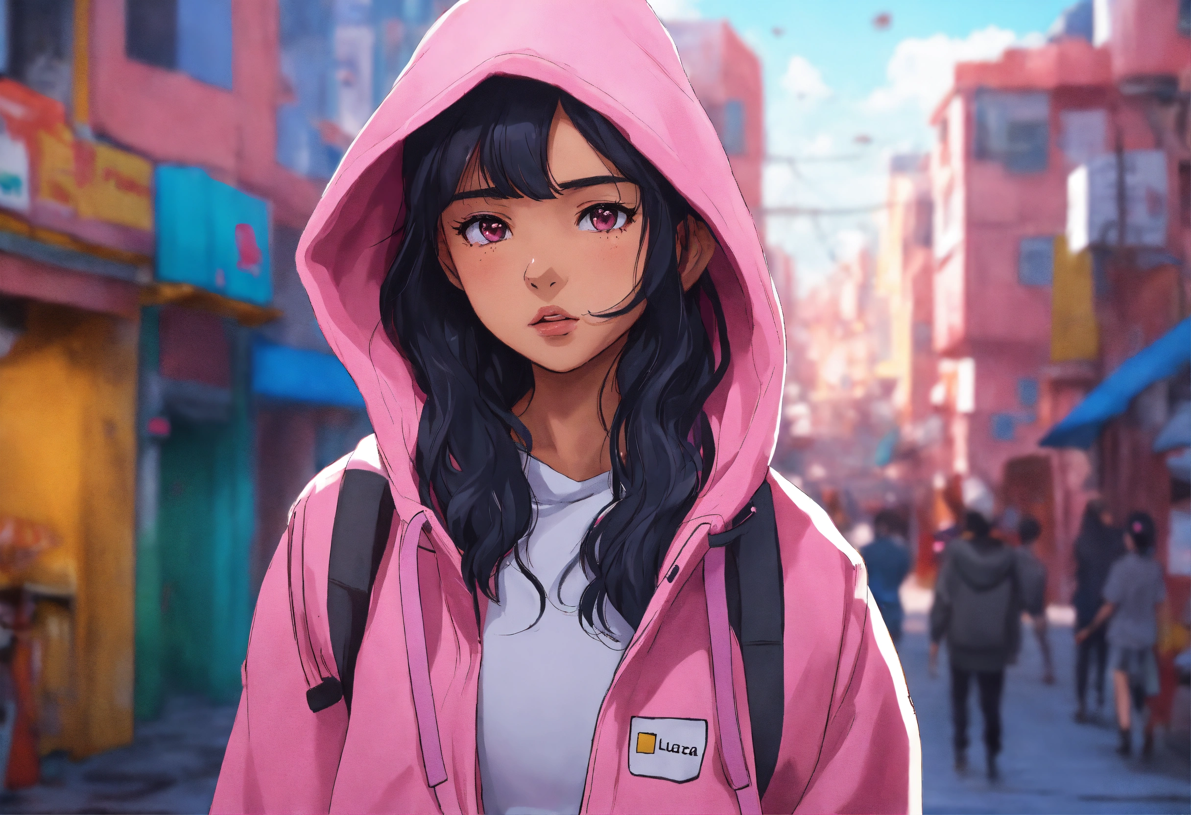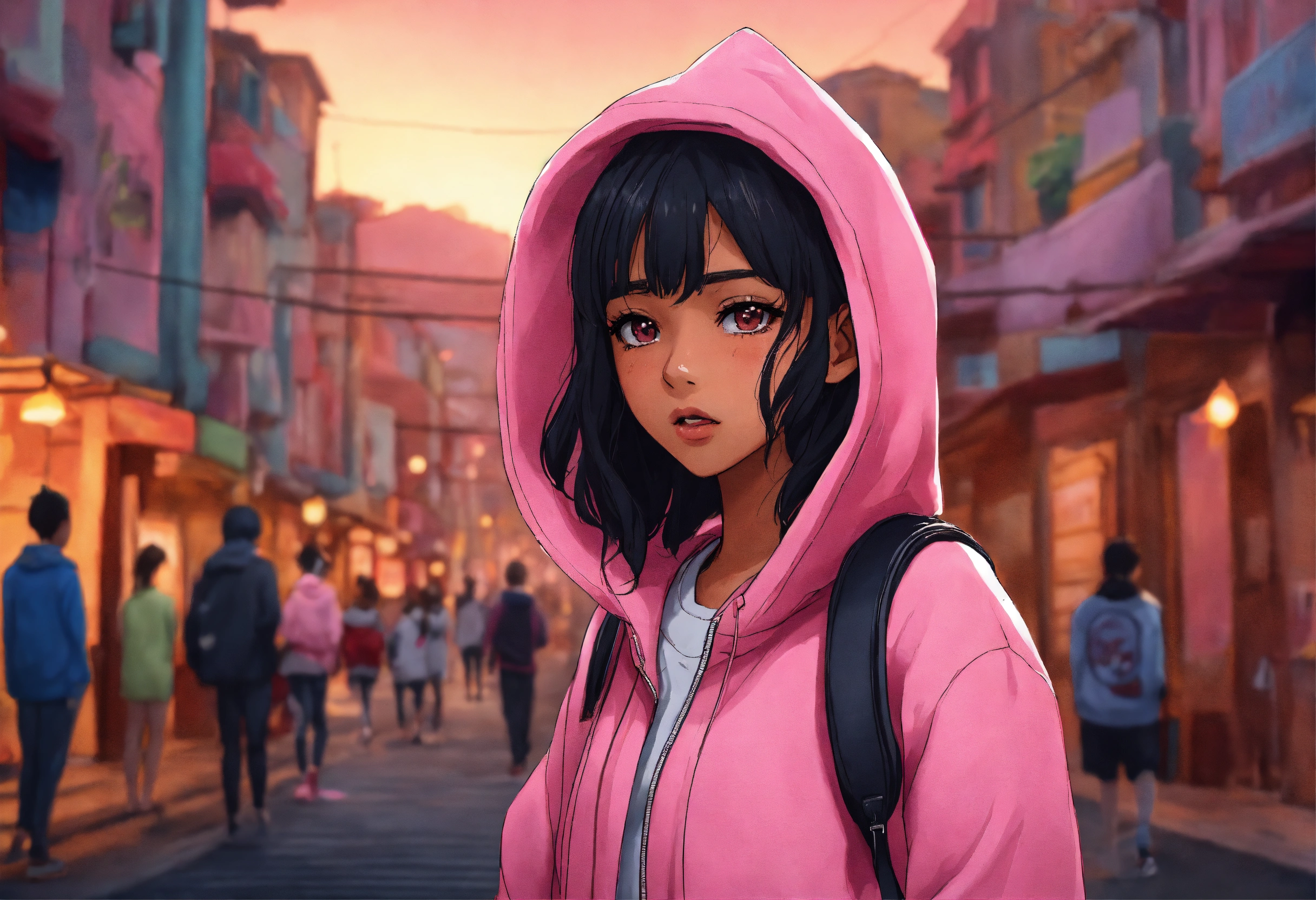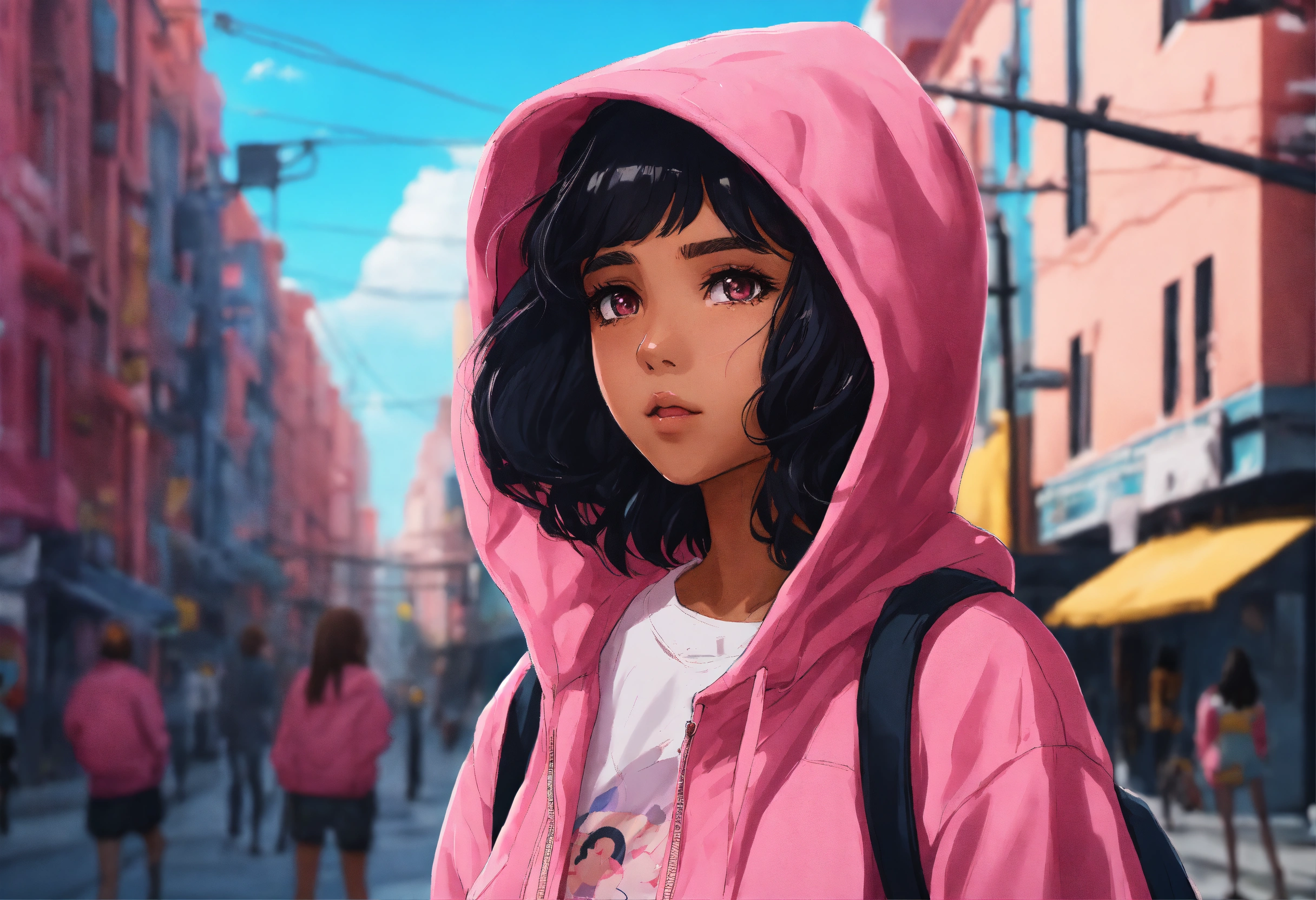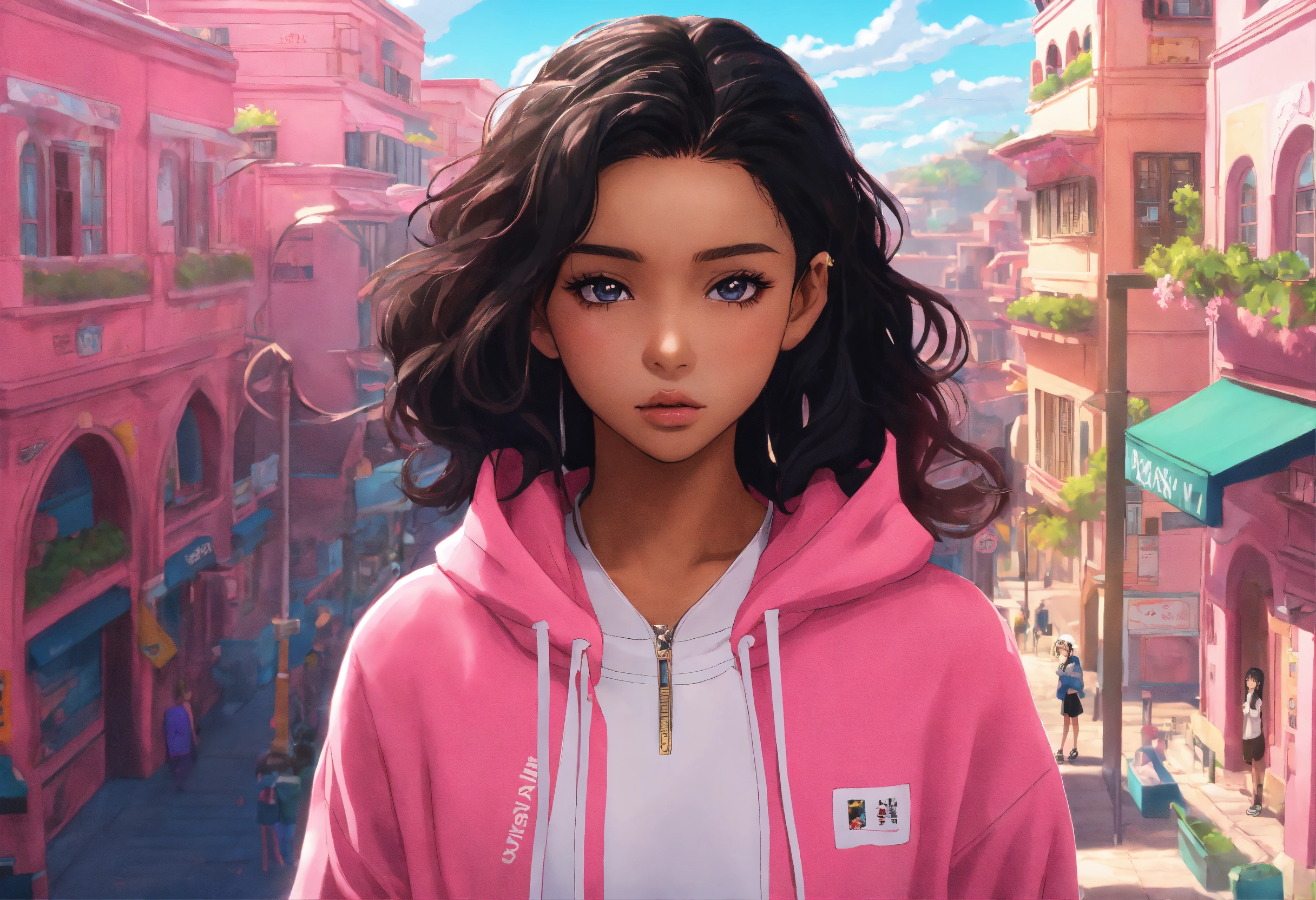 Anime; cartoon; ultra realistic; pink city, young girl mixed race, named laura rijo, wearing pink hoodie, wavy black hair; in a anime city, ultra realistic, toca boca life world perfect, no imperfection, 4k, sad, chocked