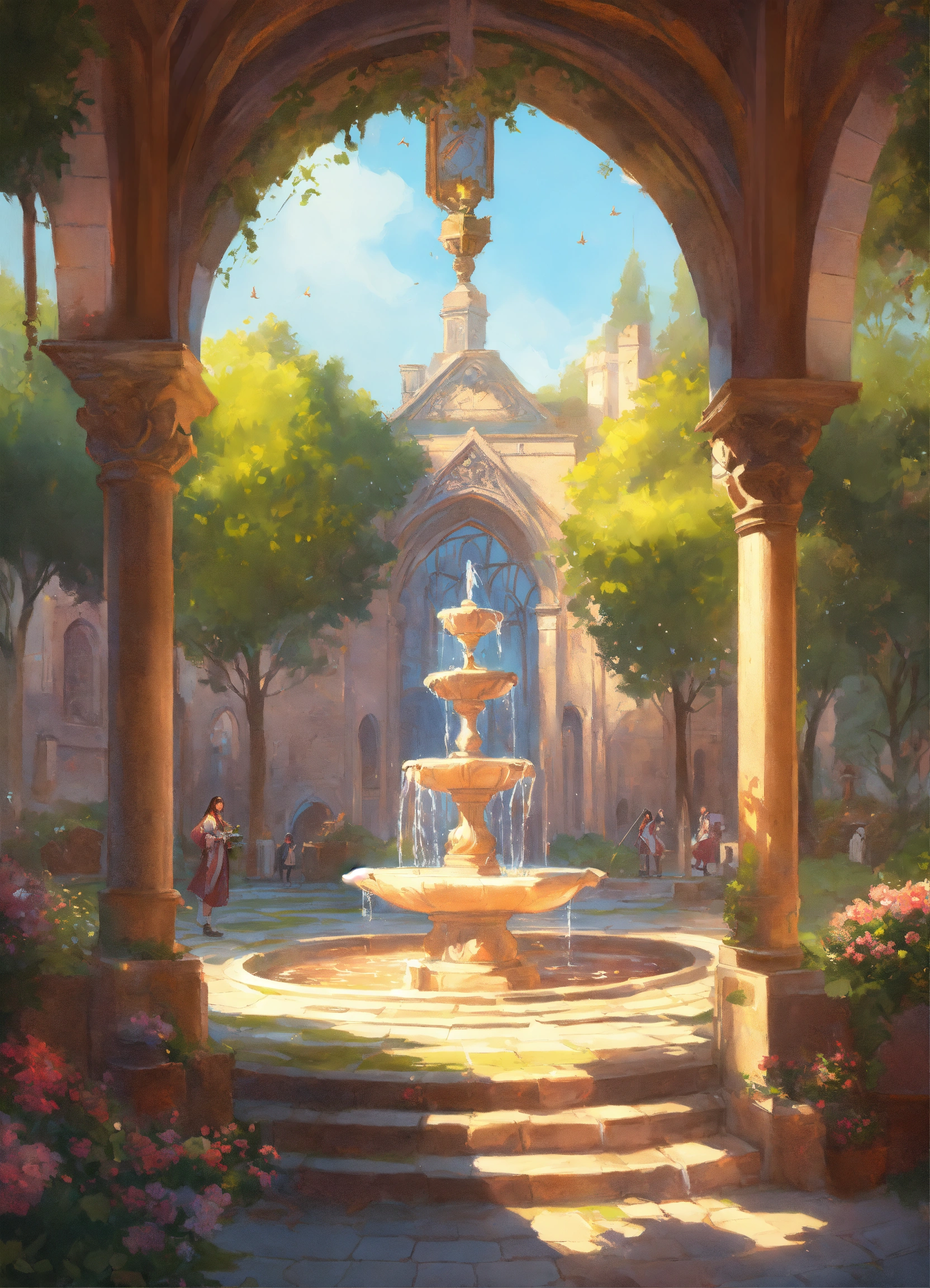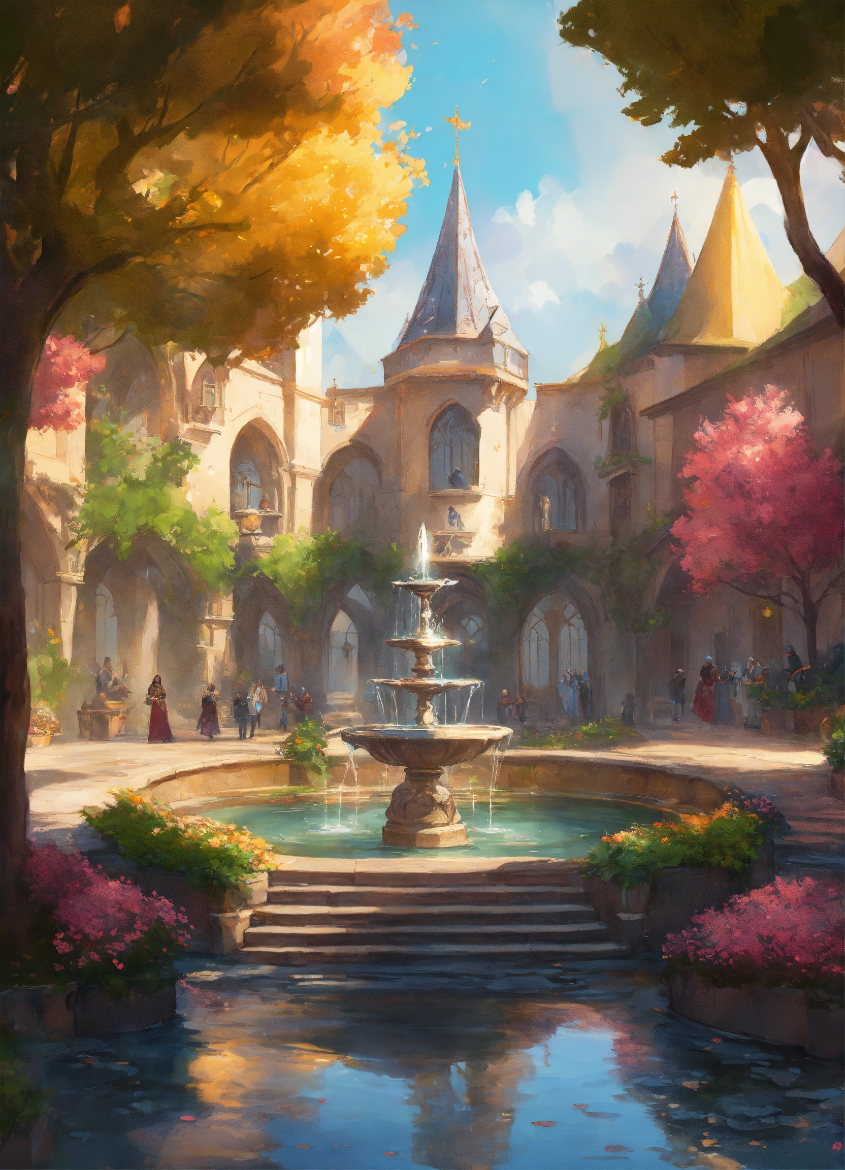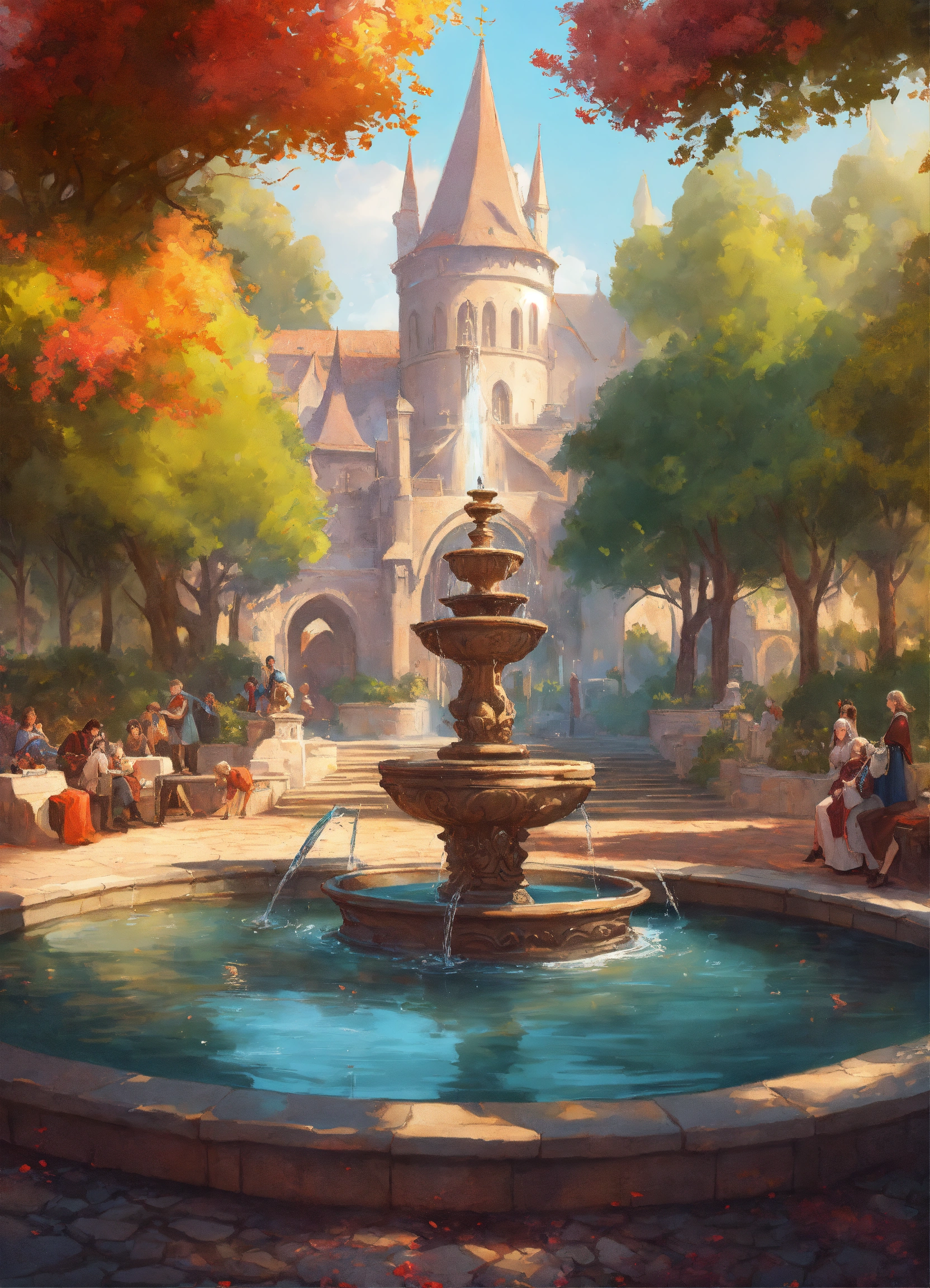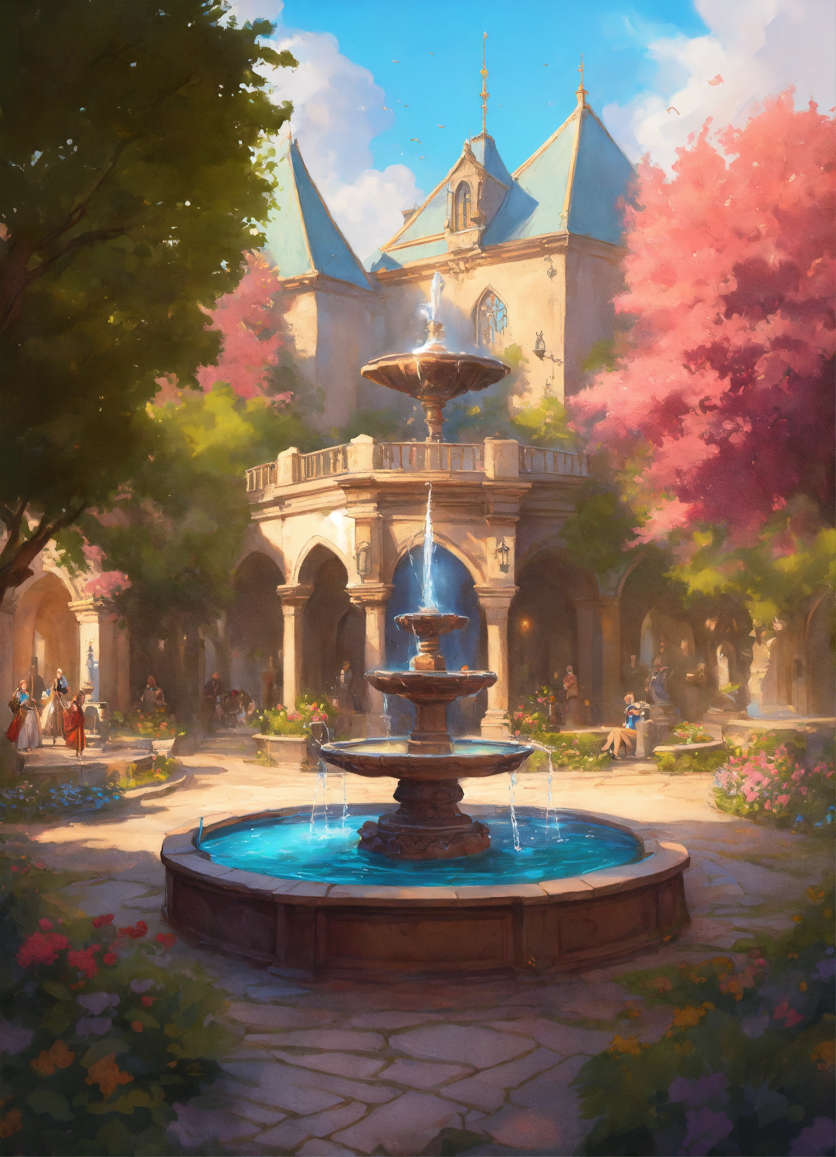 Image of a medieval parc with a fountain in the center of the image, d & d, fantasy, highly detailed, digital painting, trending on artstation, concept art, sharp focus, illustration, art by artgerm and greg rutkowski and magali villeneuve, bright pastel colors